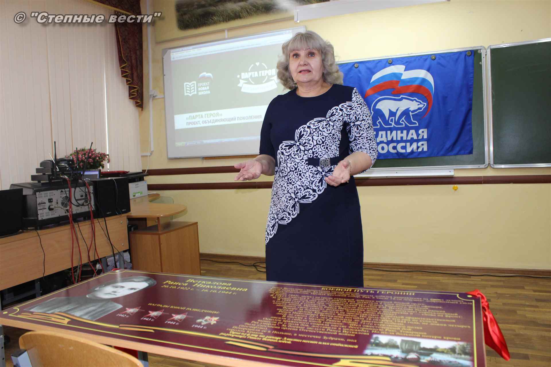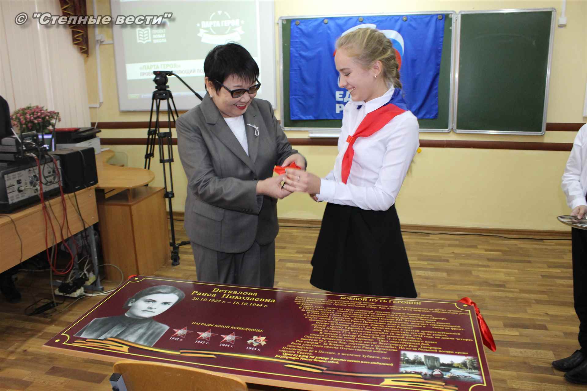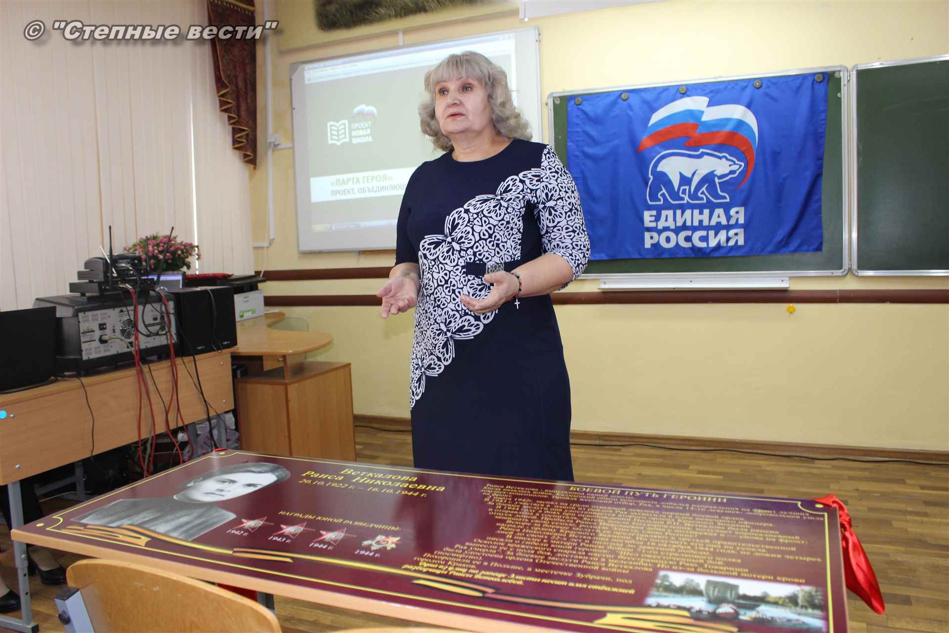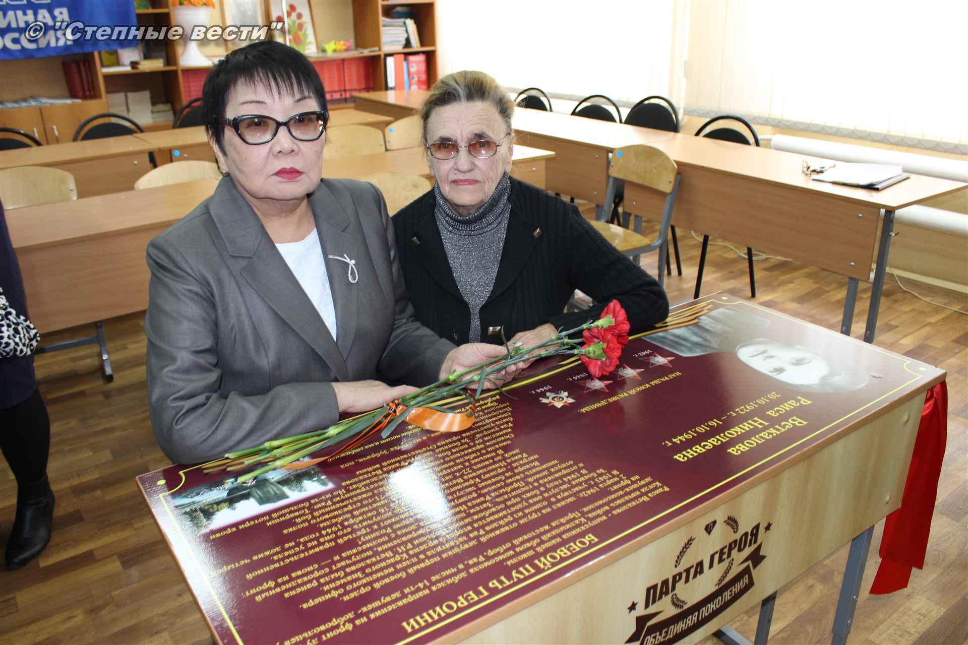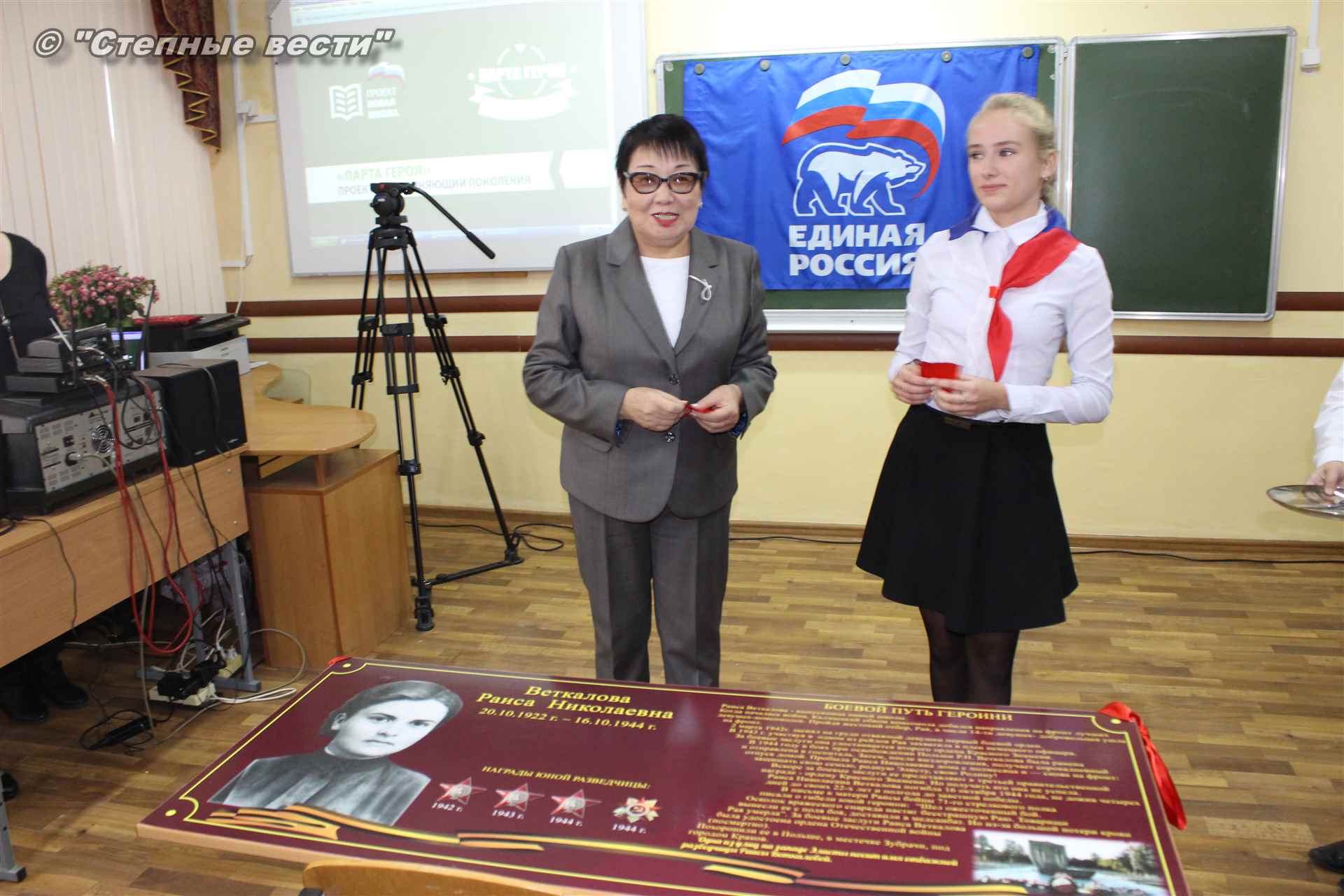 1В рамках партийного проекта «Единой России» «Новая школа» сегодня в элистинской средней школе № 2 состоялось торжественное открытие «Парты Героя», изготовленной в честь Героя Великой Отечественной войны Раисы Веткаловой, родившейся в Элисте, учившейся и работавшей до войны в этой школе.