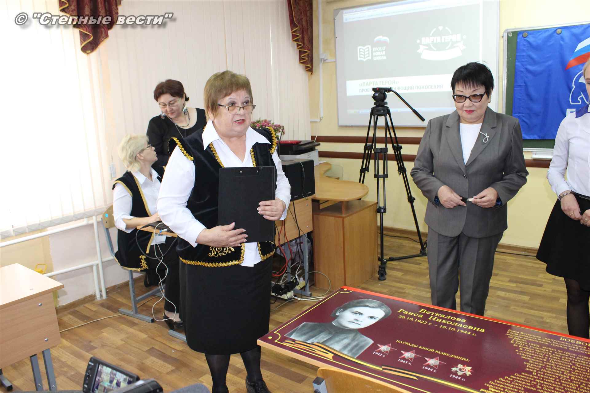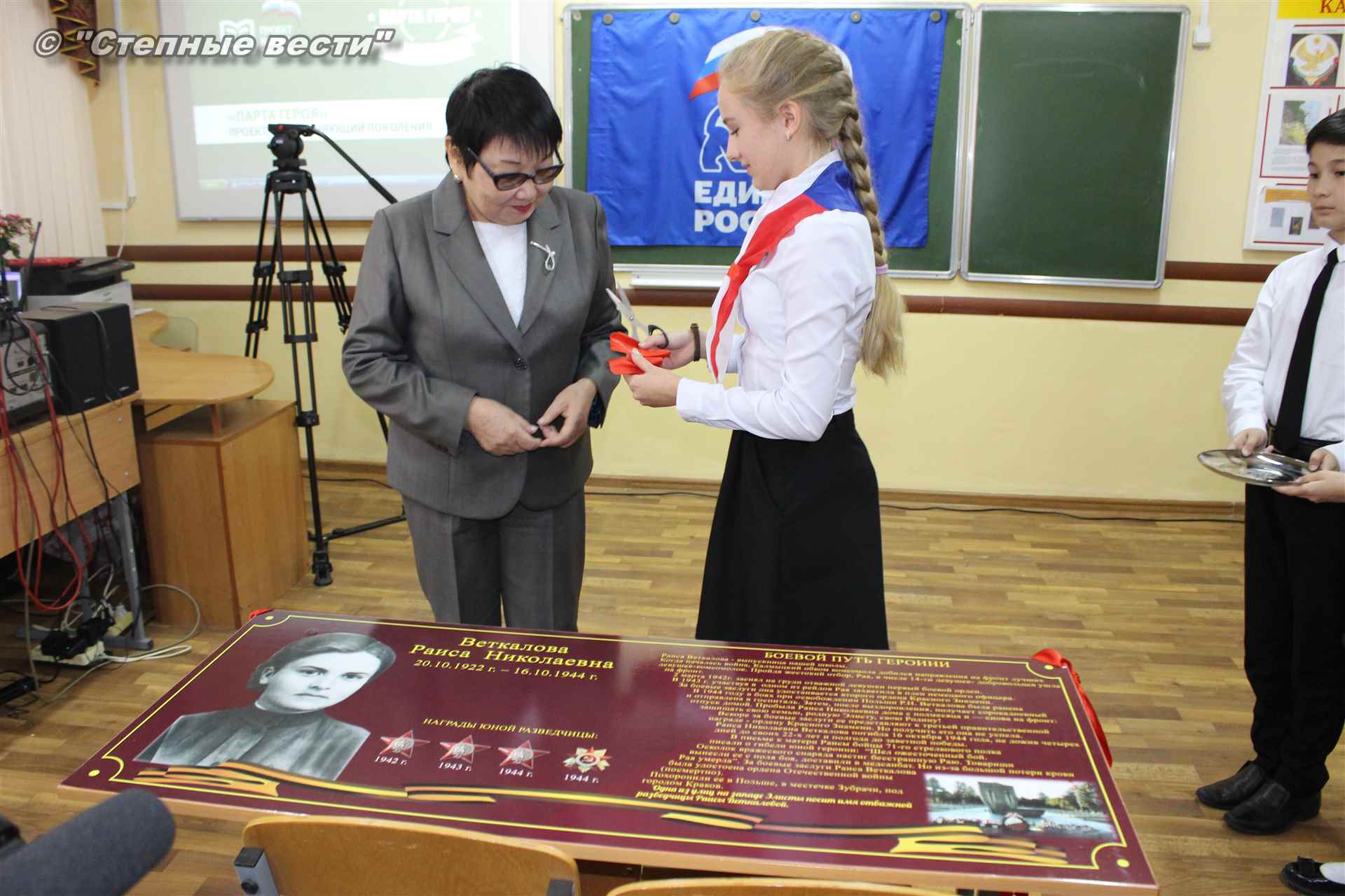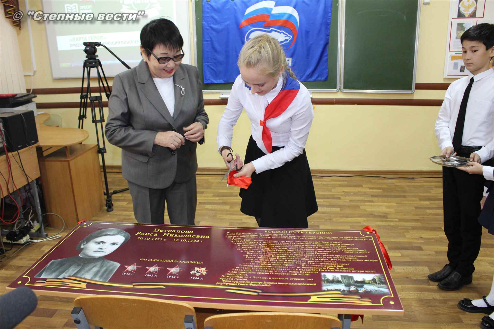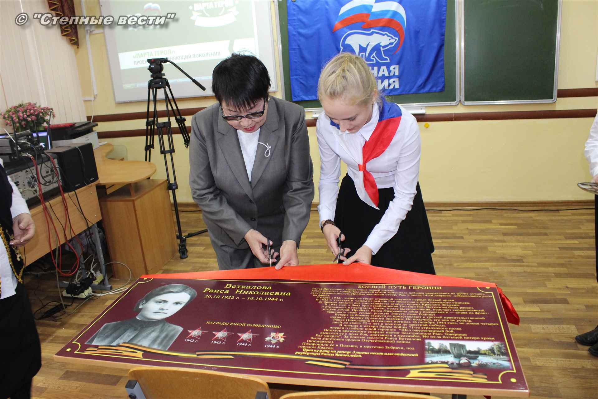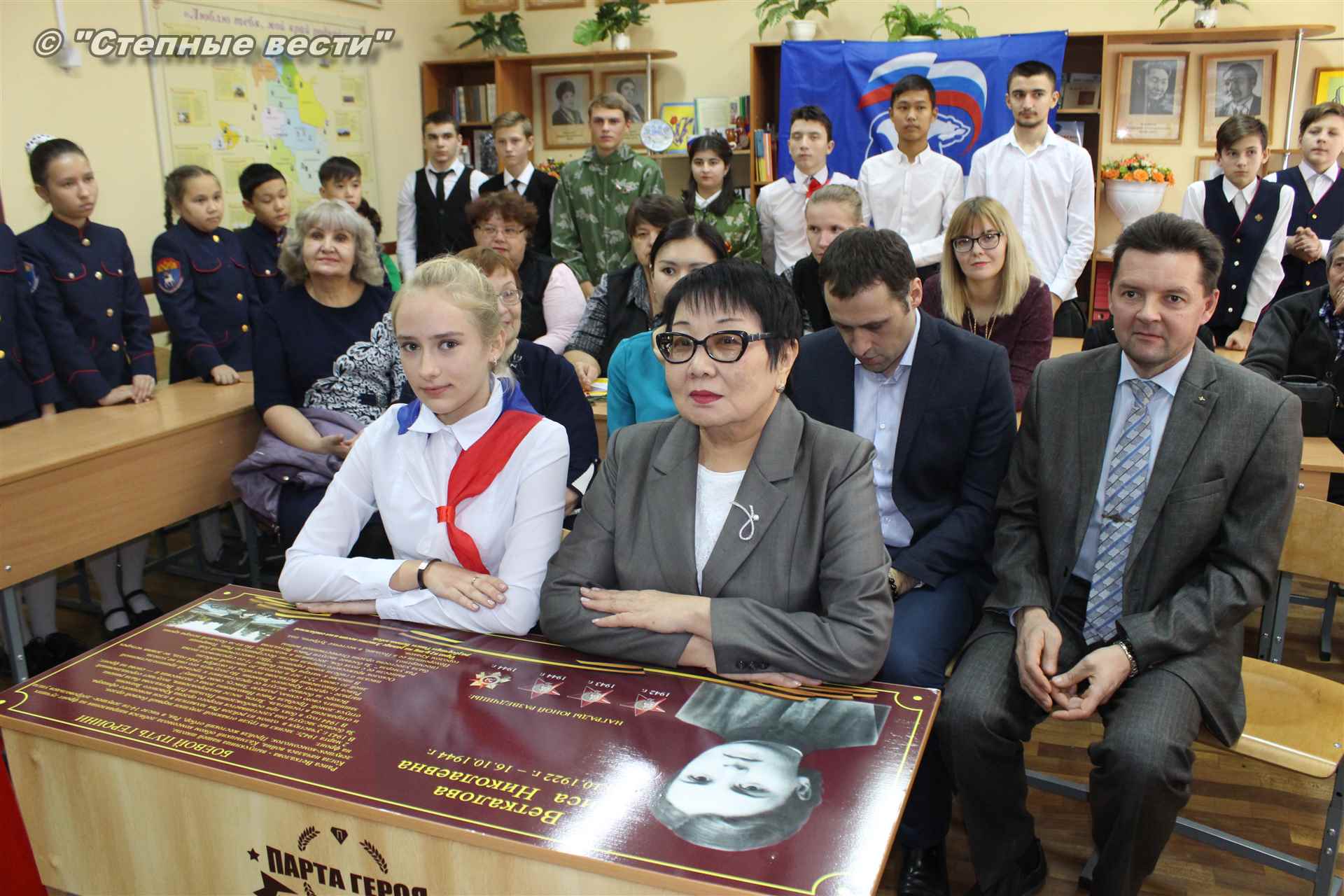 1В рамках партийного проекта «Единой России» «Новая школа» сегодня в элистинской средней школе № 2 состоялось торжественное открытие «Парты Героя», изготовленной в честь Героя Великой Отечественной войны Раисы Веткаловой, родившейся в Элисте, учившейся и работавшей до войны в этой школе.