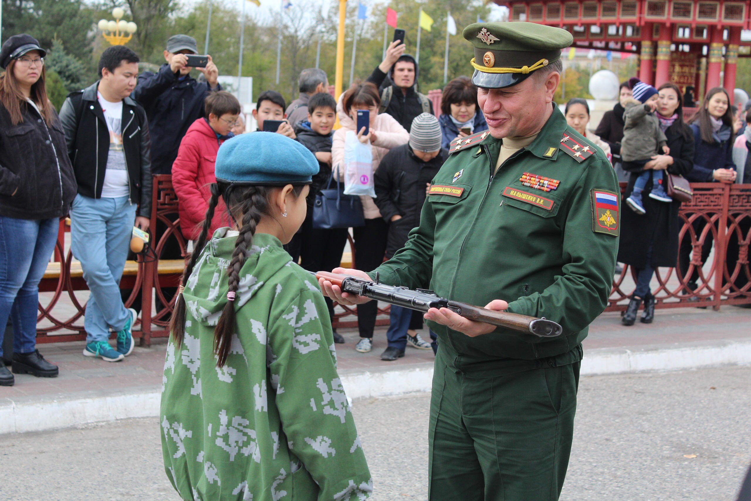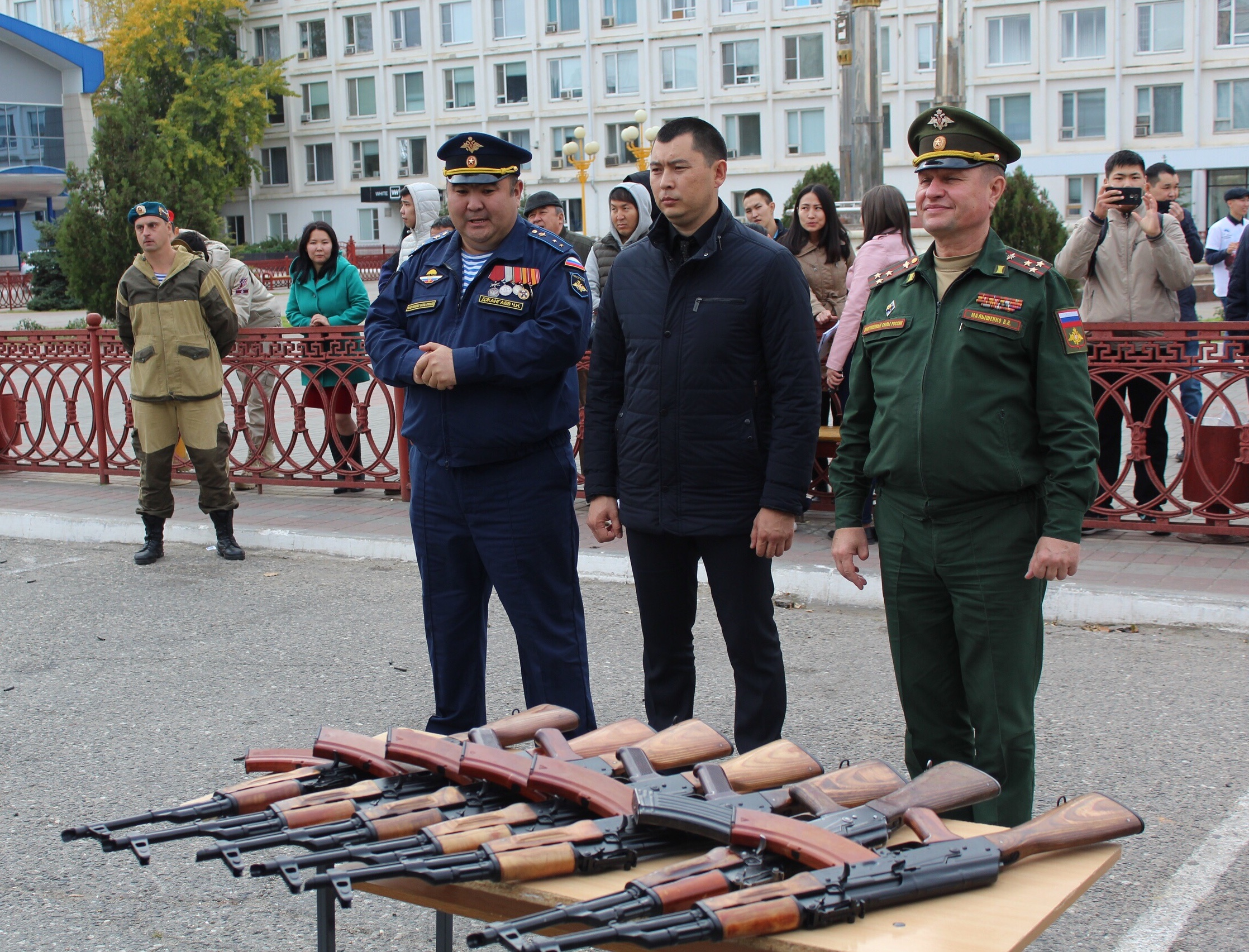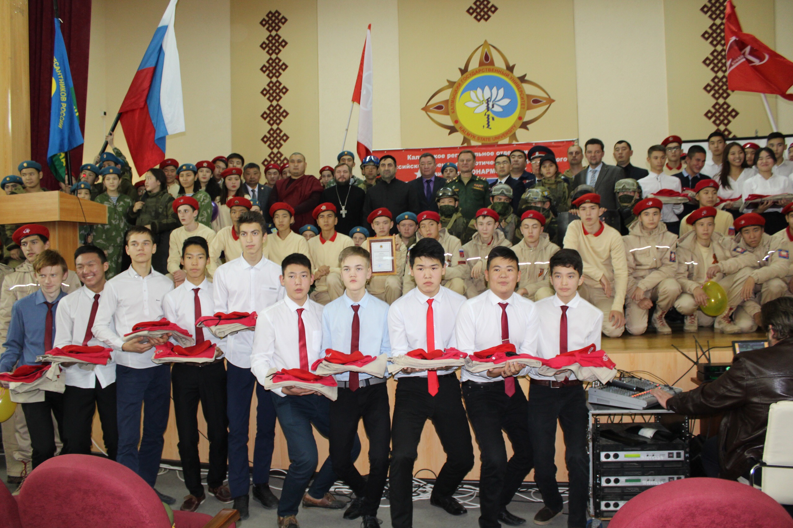 Юных патриотов поздравили многие, в том числе Боова Бадмаев, Виталий Малышенко, вручивший охолощенное оружие для занятий и комплекты юнармейской формы.