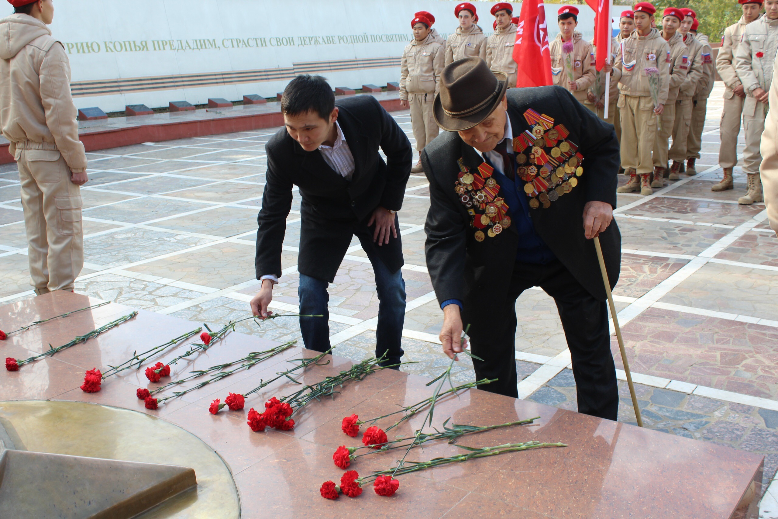 После минуты молчания к собравшимся юнармейцам, несущим вахту памяти на мемориале и участвующим в слете, обратились заместитель министра спорта и молодежной политики РК Камиль Маркеев, председатель Калмыцкой общественной организации ветеранов  Владимир Овечкин, ветеран войны Иван Борисенко и другие.