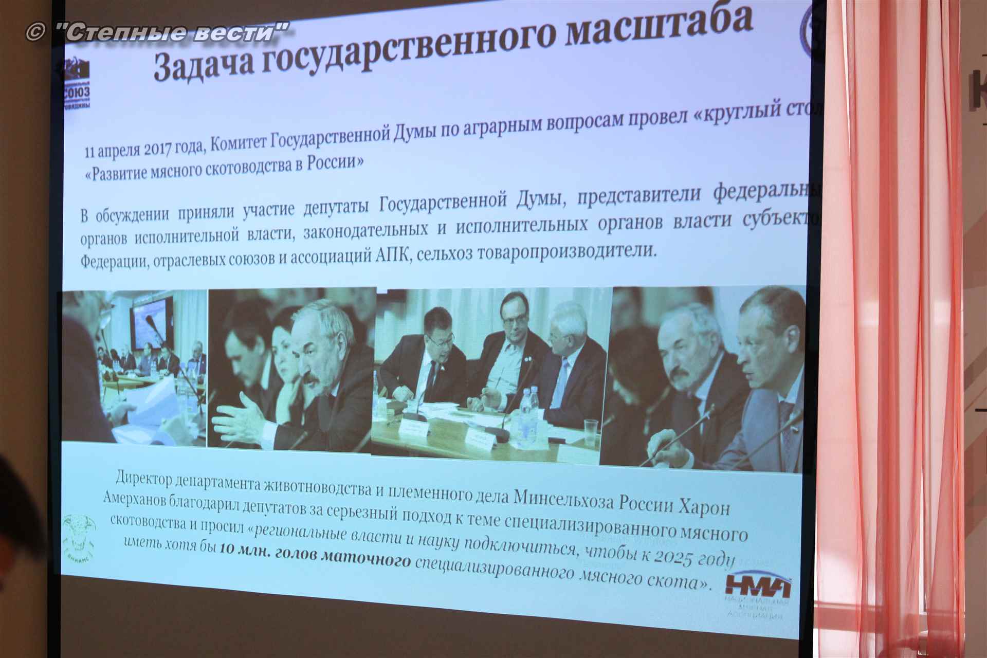 Спикер озвучил три тезиса: Российская Федерация имеет в десять раз меньше скота мясных пород, чем должна иметь; при этом необходимо развиваться через систему кооперации, опираясь на опыт Калмыкии в первую очередь; в настоящее время мы должны смотреть на мясное скотоводство как на инструмент экономического перевооружения всех депрессивных регионов в сфере экспорта.
