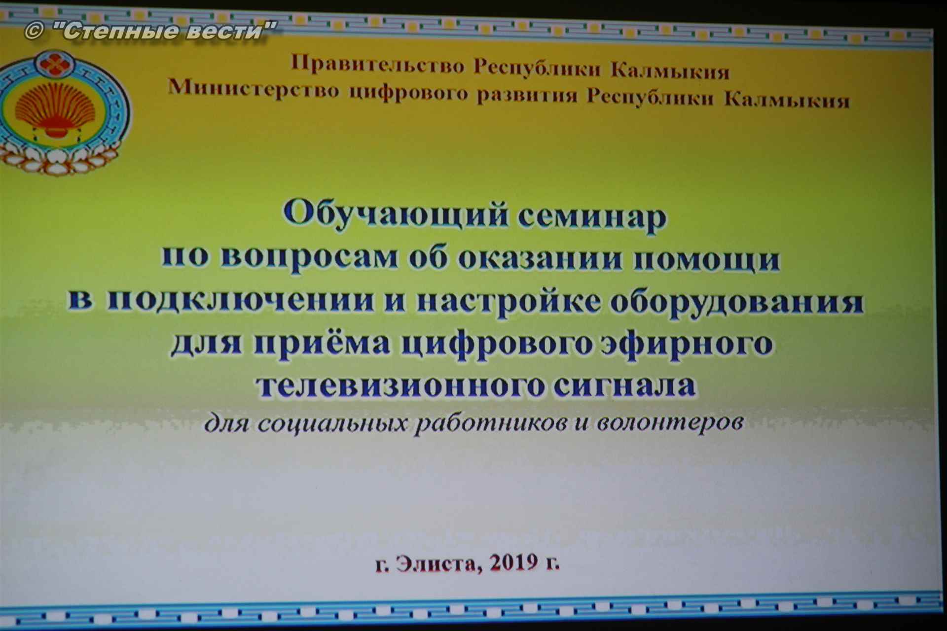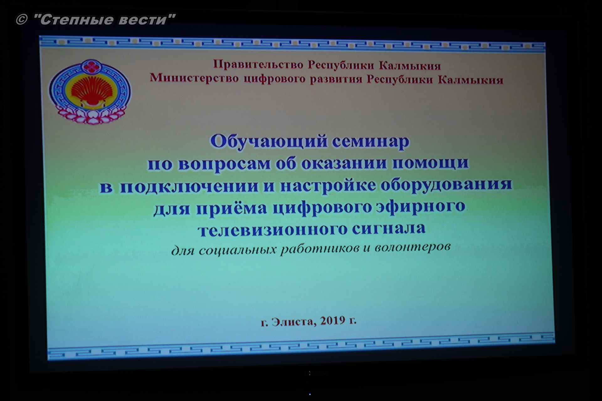 В Доме правительства состоялся обучающий семинар для сотрудников органов социальной защиты населения, социальных работников и волонтеров по вопросам, связанным с переходом абонентов Калмыкии с аналогового ТВ на цифровое телевещание. Особое внимание организаторы мероприятия – сотрудники Министерства цифрового развития РК уделили вопросам оказания помощи в подключении и настройке оборудования для приема цифрового эфирного телевизионного сигнала одиноко проживающим гражданам, находящимся на социальном обслуживании на дому.