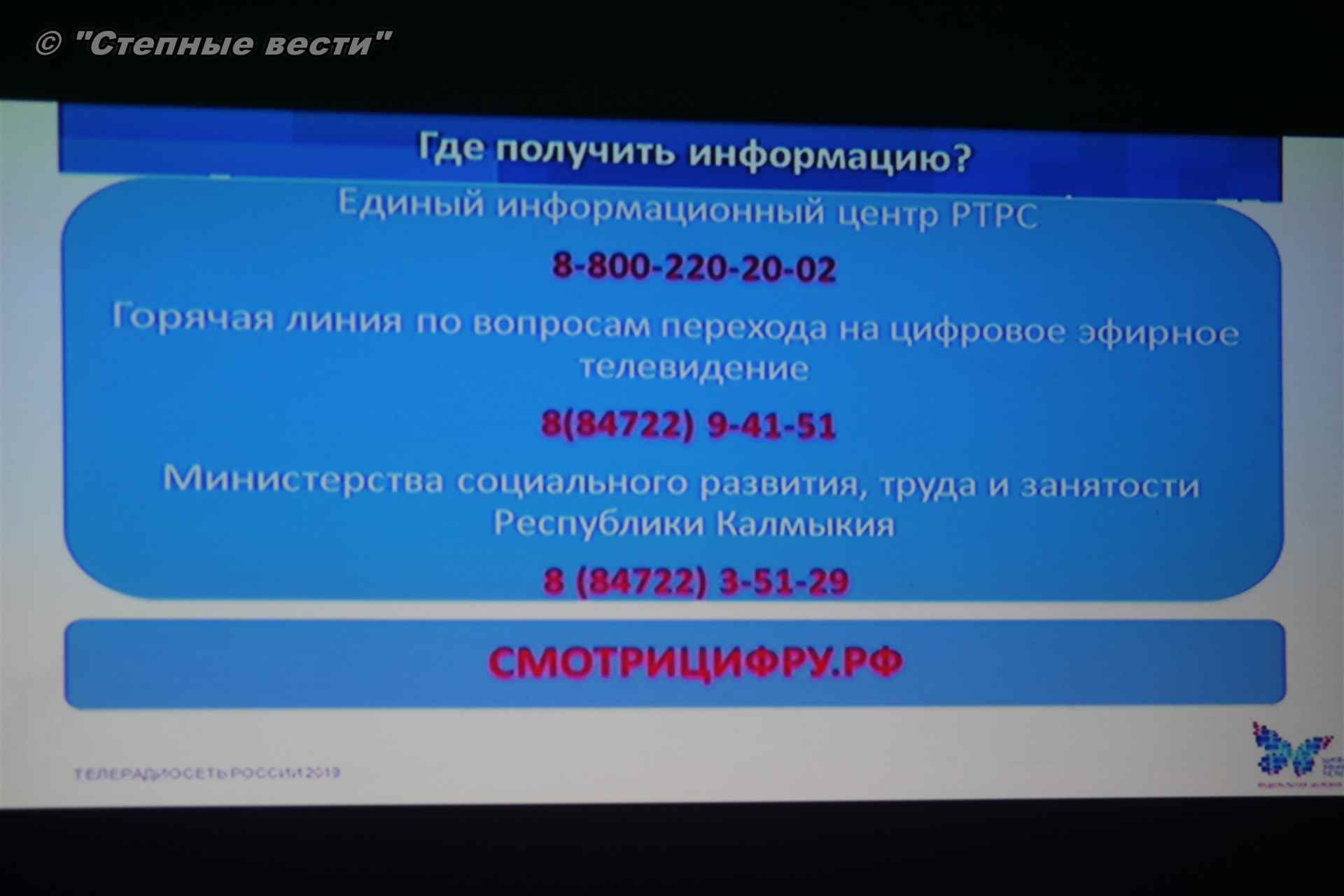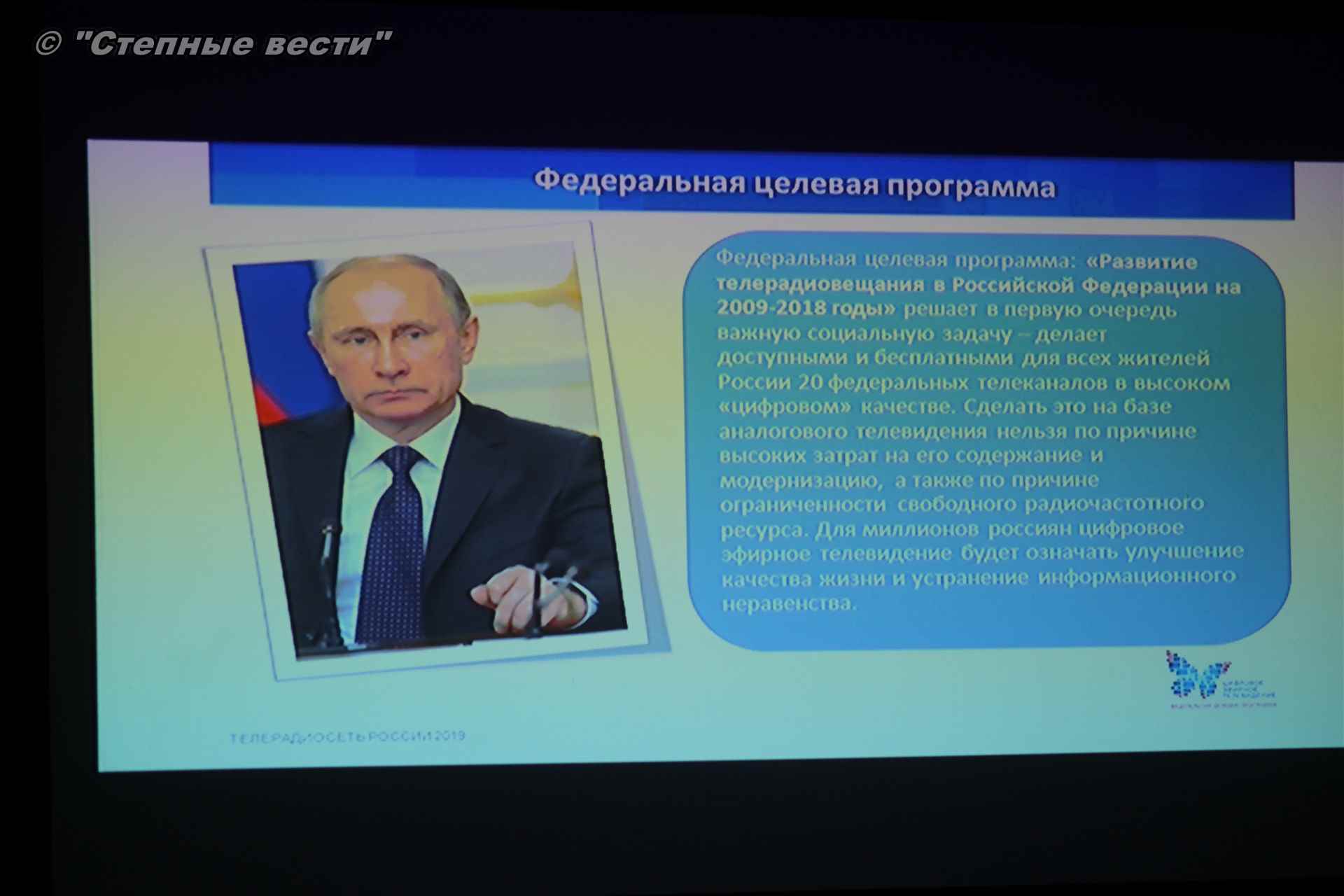 Открывая мероприятие, министр цифрового развития республики Константин Патрушев напомнил о том, что на территории Калмыкии аналоговое телевидение будет отключено 15 апреля 2019 года. Однако уже с ноября прошлого года, когда Калмыцкий РТПЦ завершил мероприятия по расконсервации передающего оборудования второго мультиплекса, жители нашей республики имеют возможность принимать бесплатно 20 эфирных телевизионных каналов в цифровом качестве. Это происходит в том случае, если граждане заблаговременно приобрели и подключили соответствующее оборудование. Всем остальным в самое ближайшее время необходимо подготовиться к предстоящему событию.