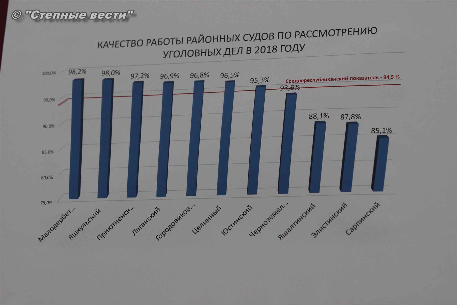 И о кадровом вопросе. «На сегодняшний день в судах республики различного уровня осуществляют правосудие 109 судей, из них 33 судьи Верховного Суда Республики Калмыкия, 58 судей районных судов и 18 мировых судей. Если исходить из гендерного состава судейского сообщества, то численность мужчин преобладает во всех судебных инстанциях. Общее количество мужчин-судей составляет 69 человек или 63% от общего числа судей, женщин-судей – 40 или 37%. По возрастному цензу в категории от 41 до 50 лет – 33 судьи общей юрисдикции, от 31 до 40 лет – 29 судей, от 51 до 55 лет – 25 судей, от 56 до 60 лет – 15 судей, от 61 до 70 лет – 7 судей», — сообщил председатель Верховного Суда РК.