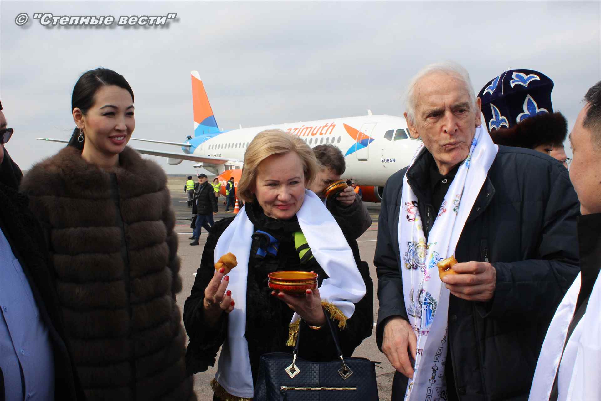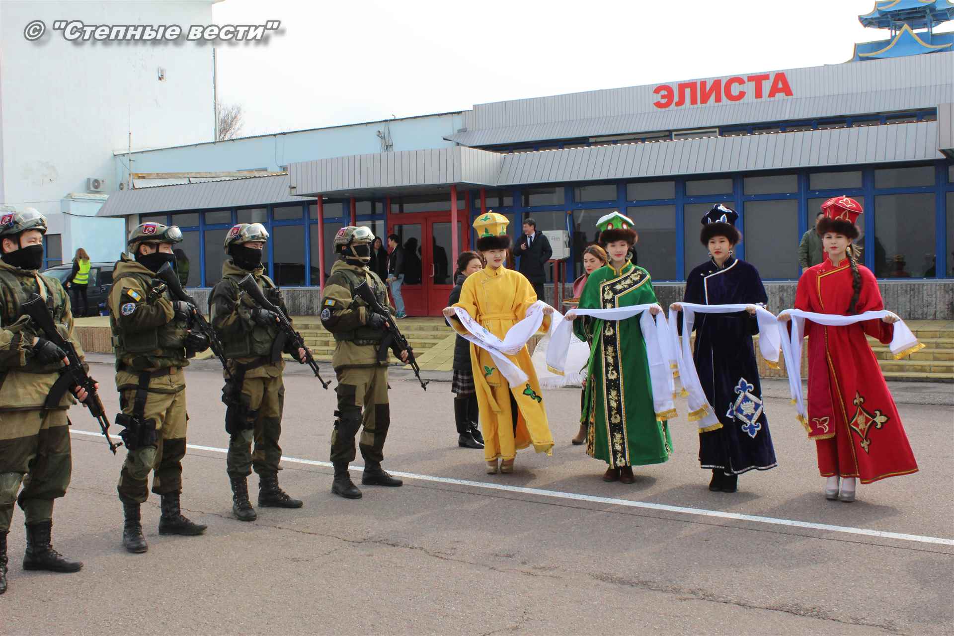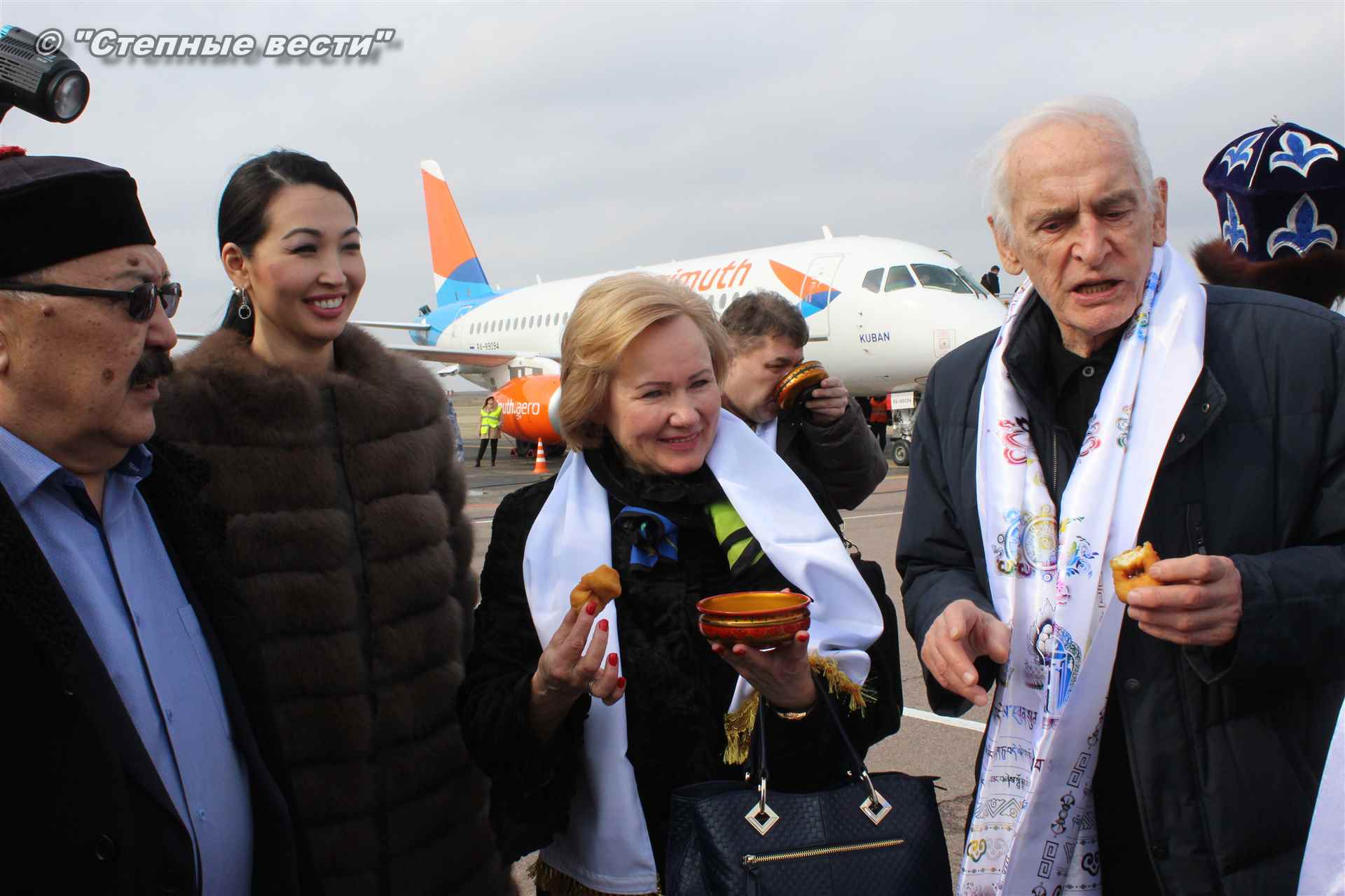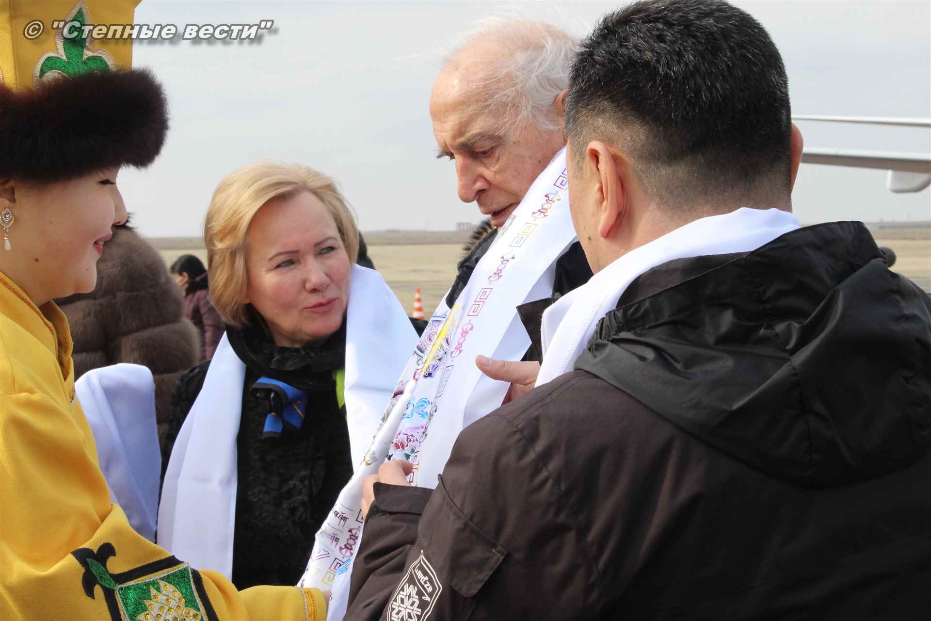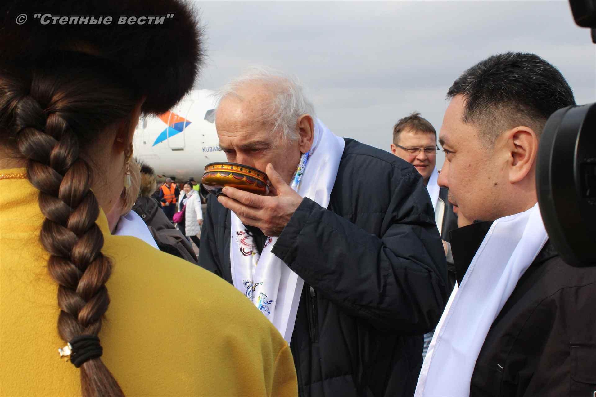 Согласно калмыцким традициям высокому гостю вручили белый хадак;  девушки в национальных костюмах преподнесли пиалы с джомбой и борцоги.