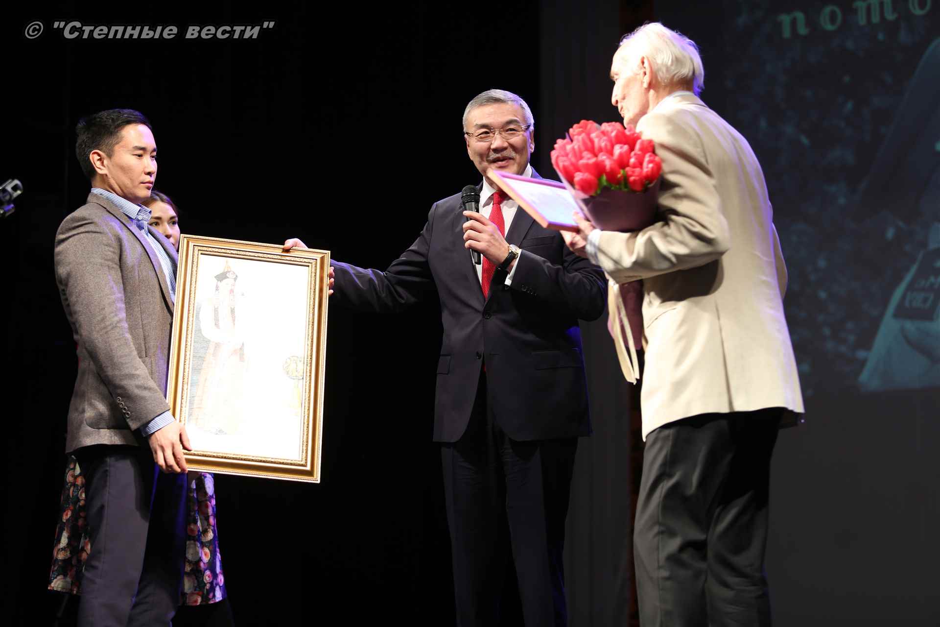 В свою очередь, В. Лановой вручил Алексею Орлову памятные подарки. Памятные подарки народный артист СССР  передал также ветерану Великой Отечественной войны Петру Леонтьеву, министру экономики и торговли РК Зое Санджиевой и   министру культуры и туризма РК Хонгору Эльбикову (вместо  руководителя отрасли на сцену поднялся его заместитель Николай Санджиев).