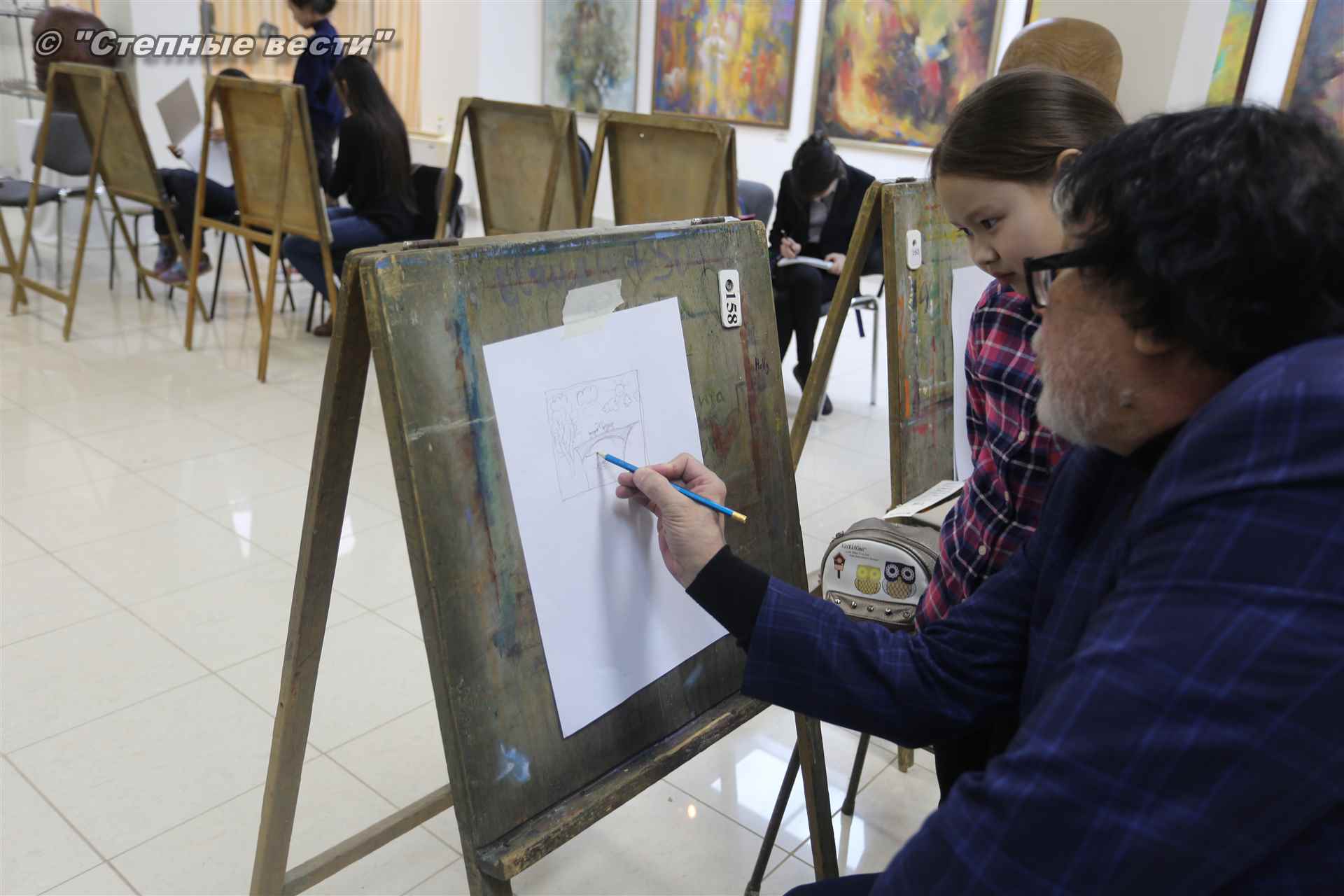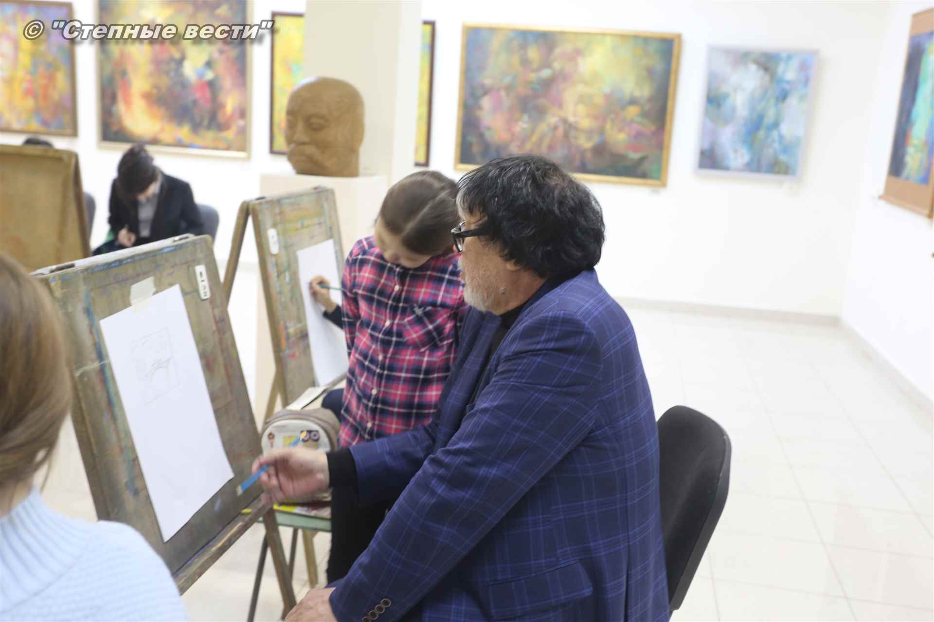 Народный художник РФ показал подросткам свои работы, которые дети внимательно рассматривают и, конечно же, черпают  большое вдохновение.