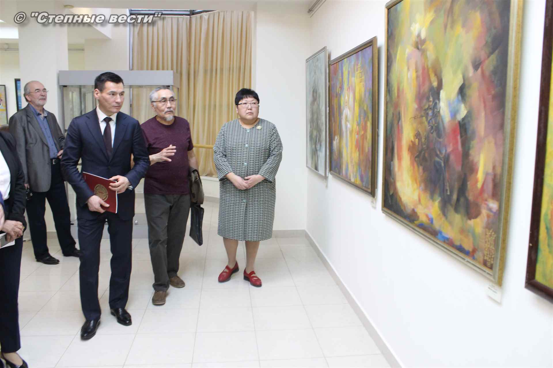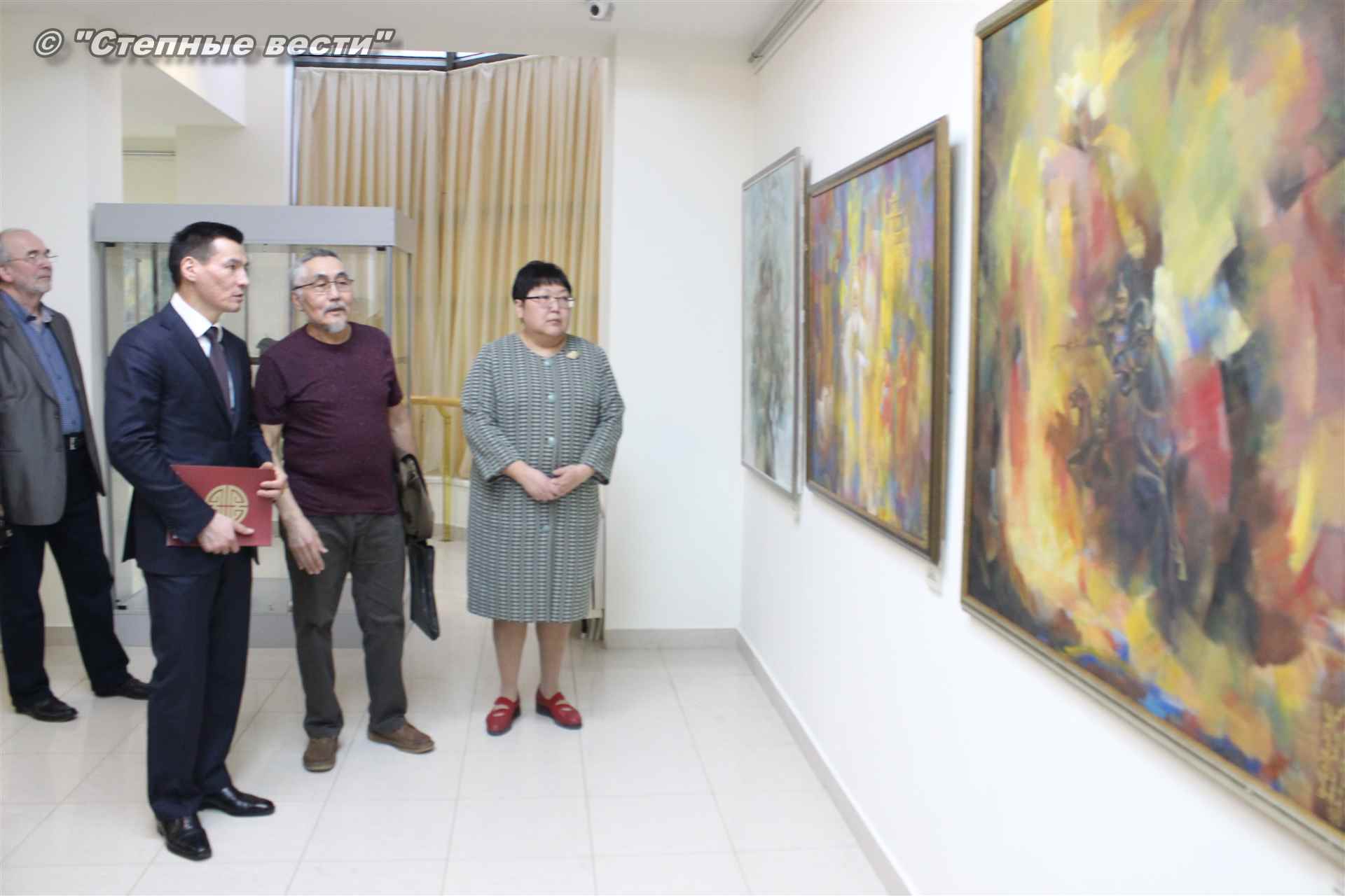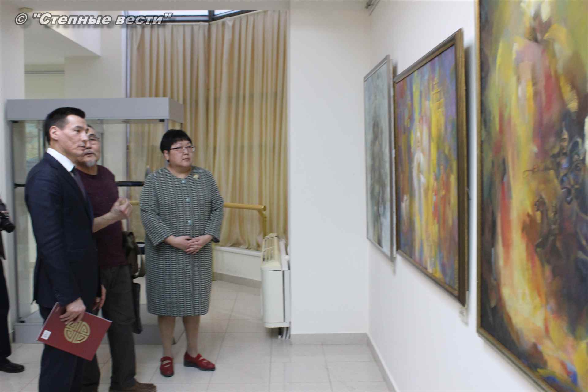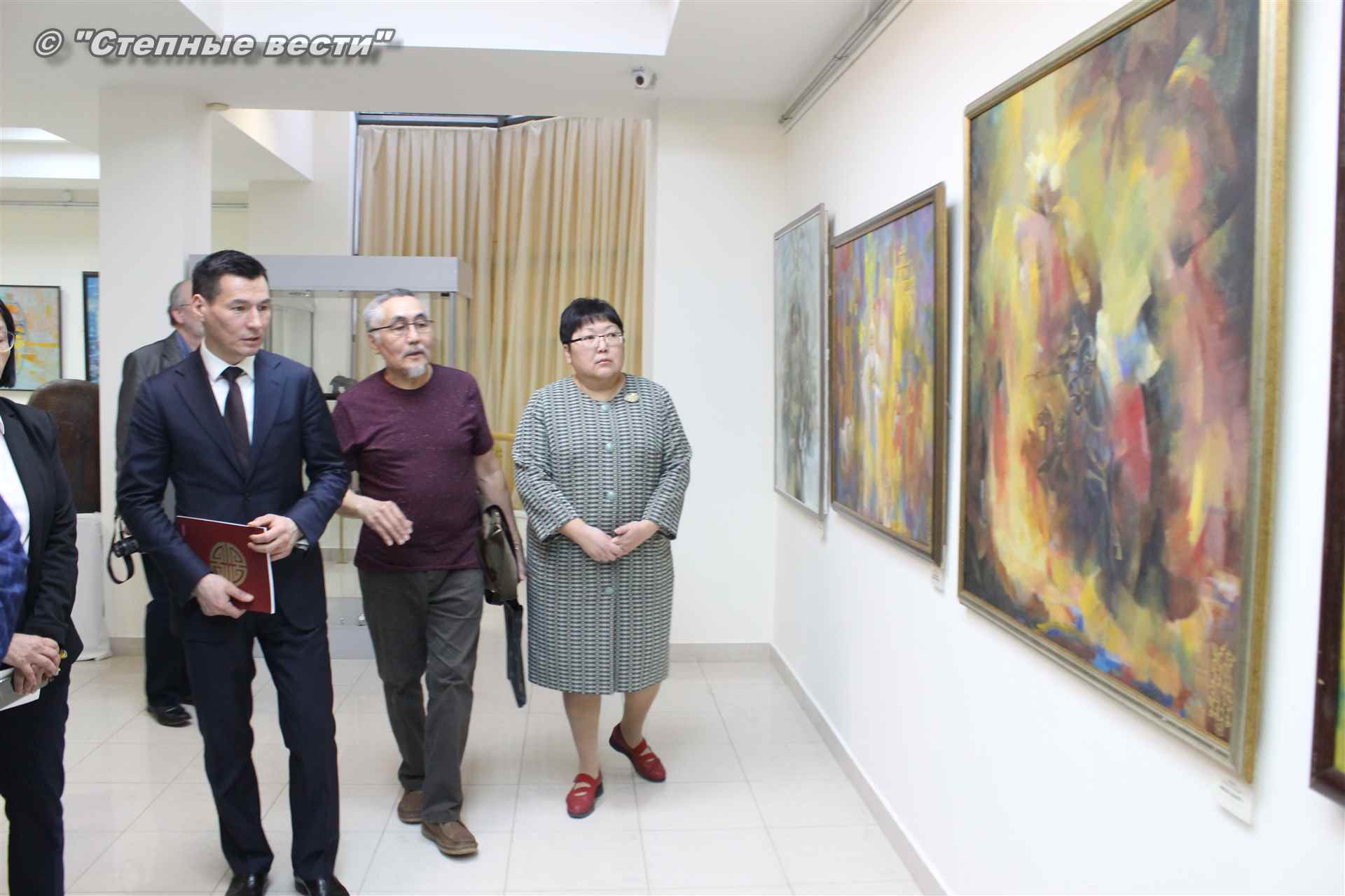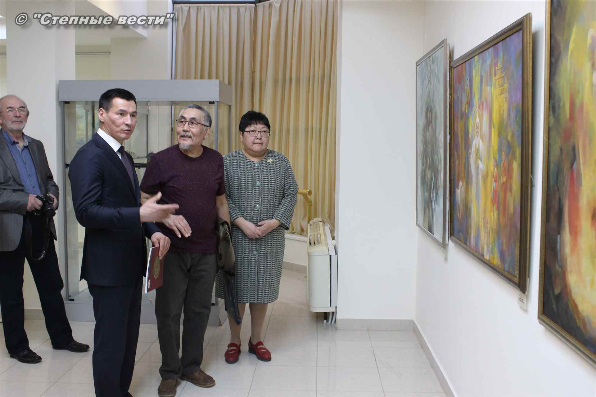 Далее  в сопровождении министра культуры и туризма РК Хонгора Эльбикова, директора музея Ирины Мучаевой и мастеров изобразительного искусства Бату Хасиков ознакомился с выставкой калмыцких художников творческой группы «Кочевники».