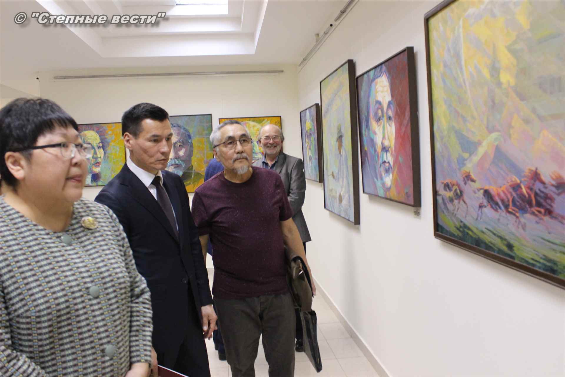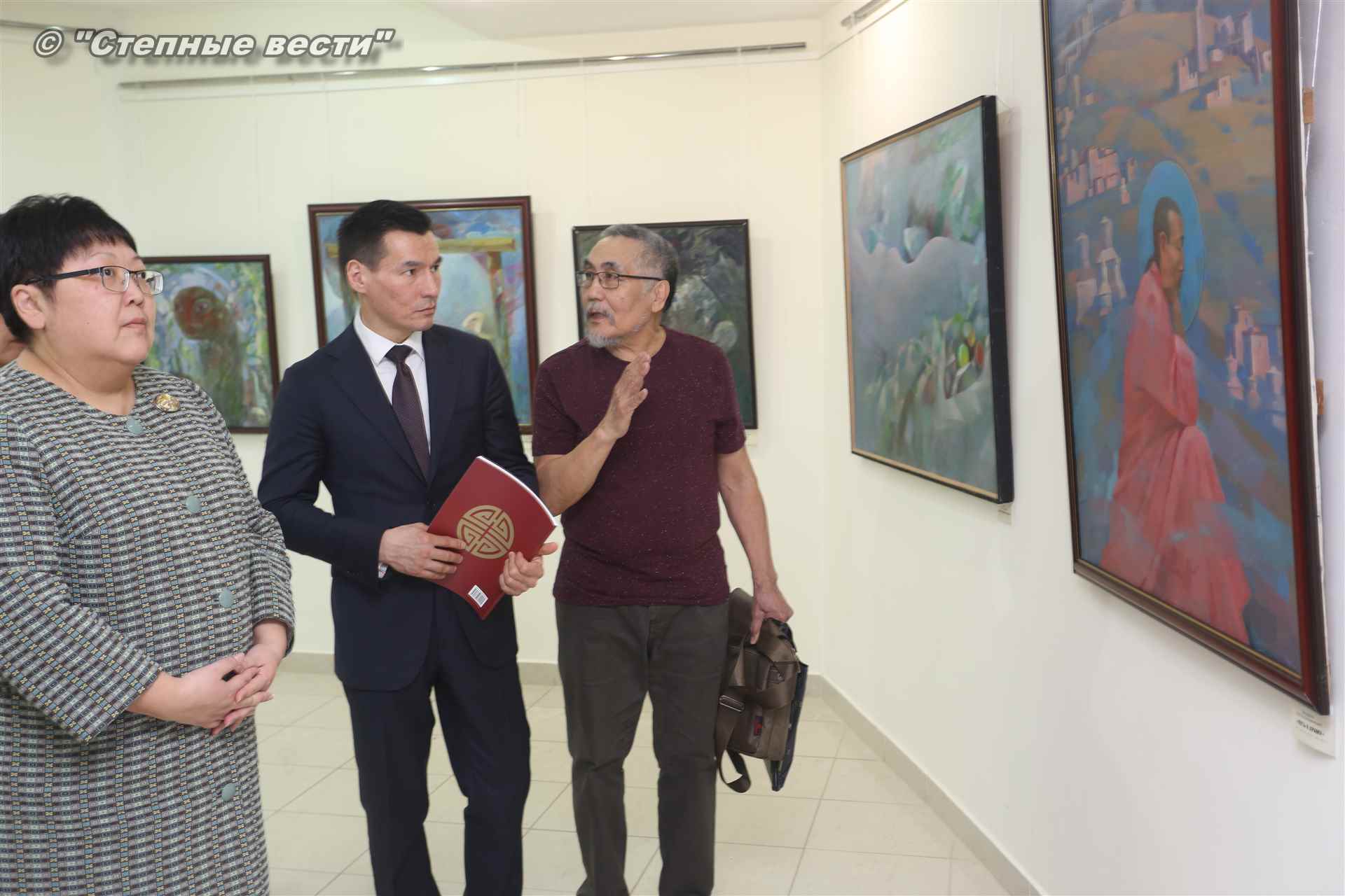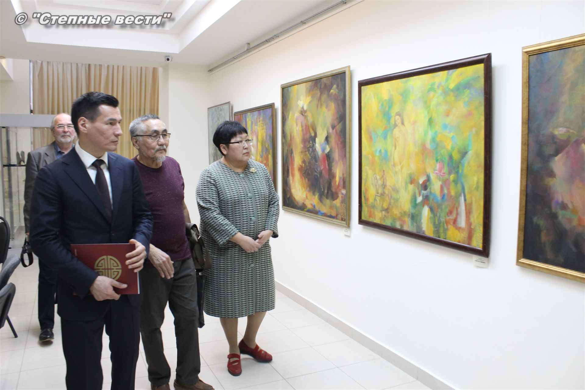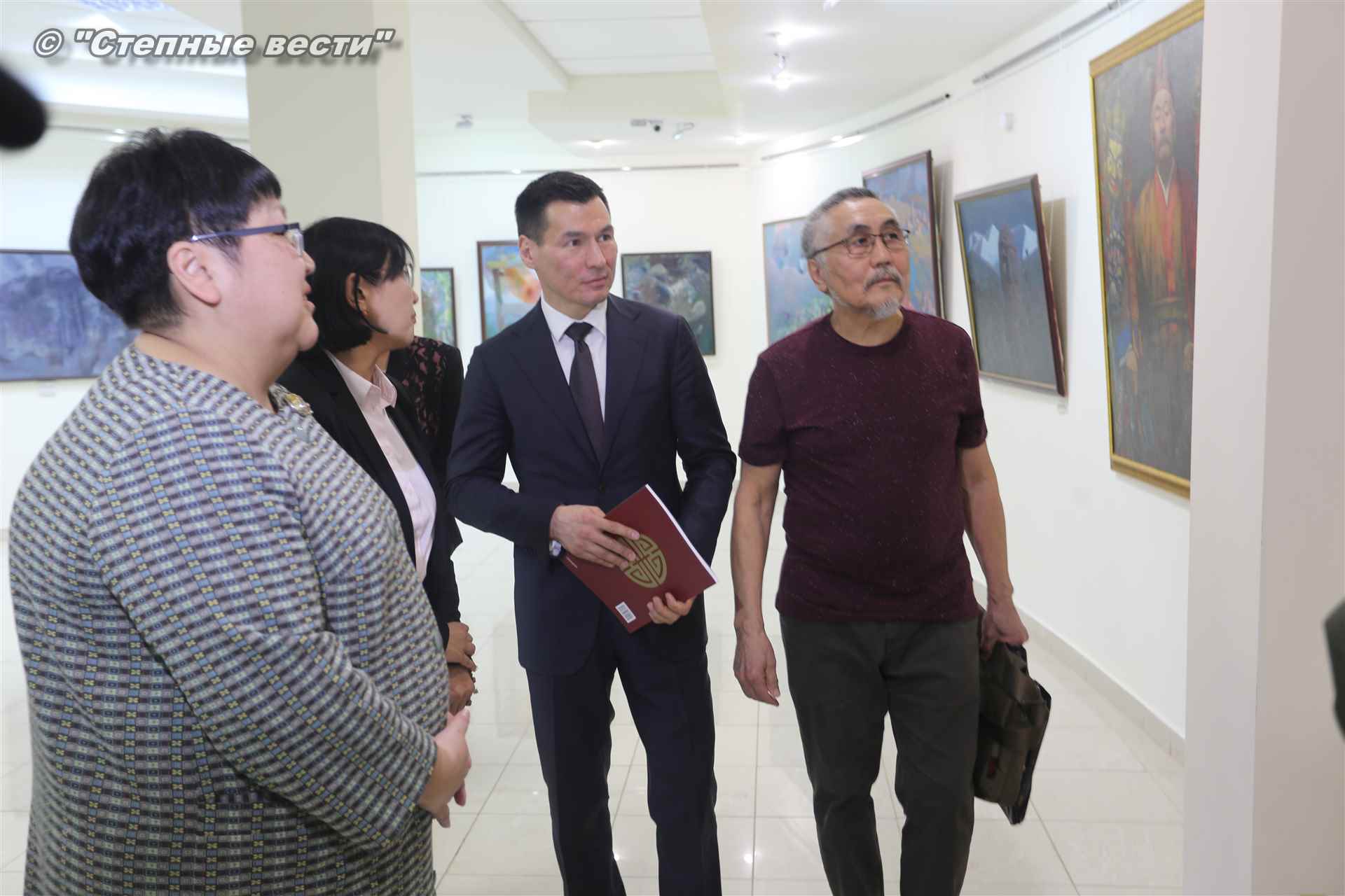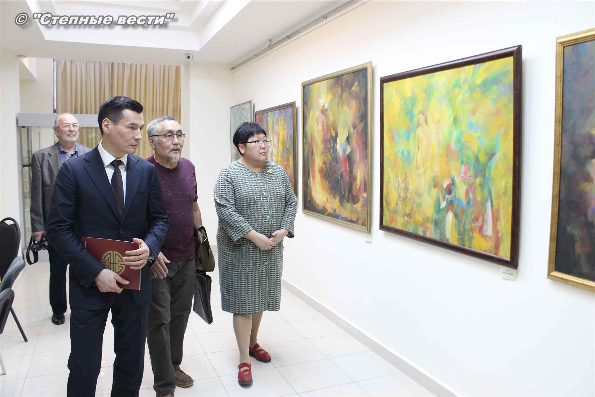 Далее  в сопровождении министра культуры и туризма РК Хонгора Эльбикова, директора музея Ирины Мучаевой и мастеров изобразительного искусства Бату Хасиков ознакомился с выставкой калмыцких художников творческой группы «Кочевники».