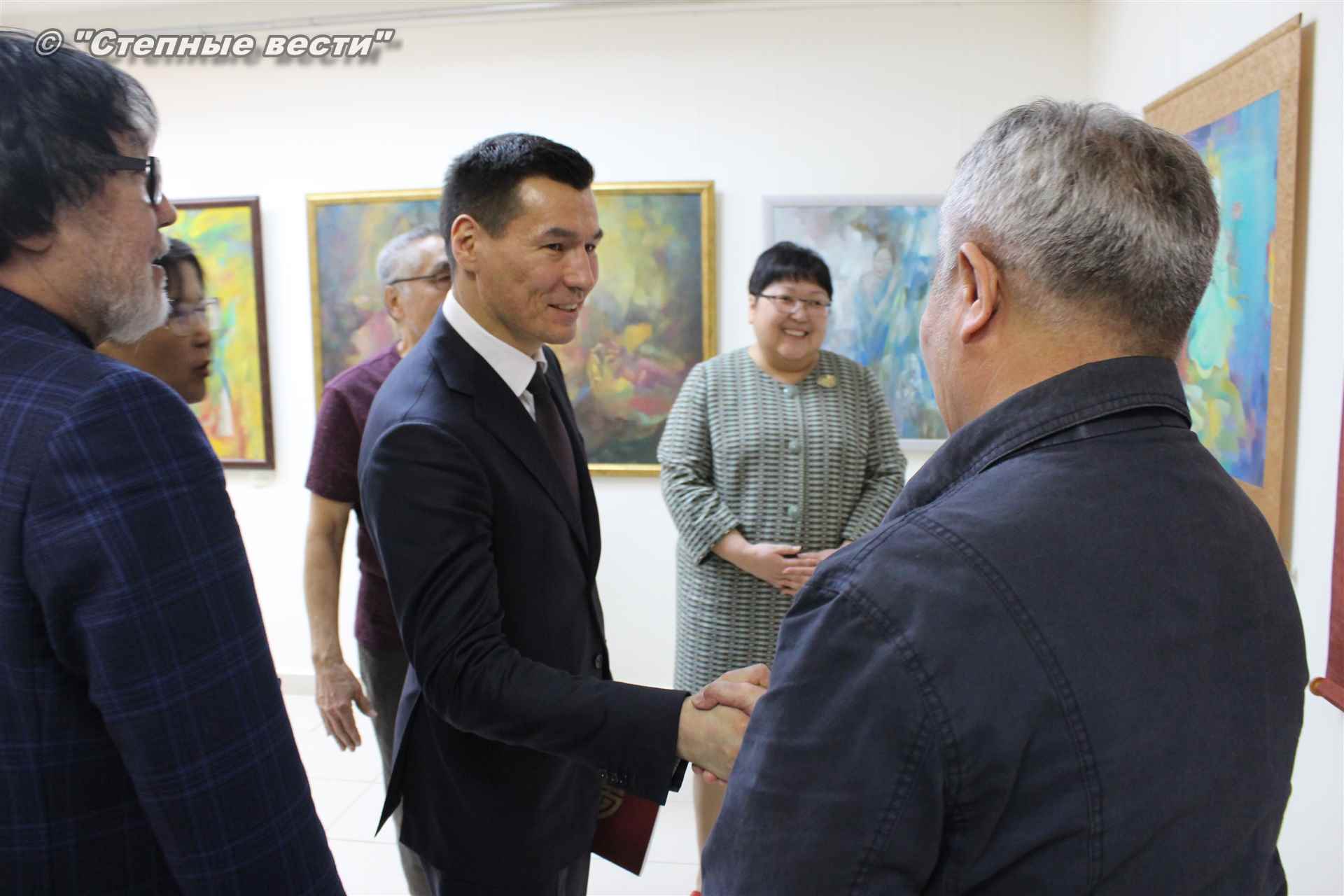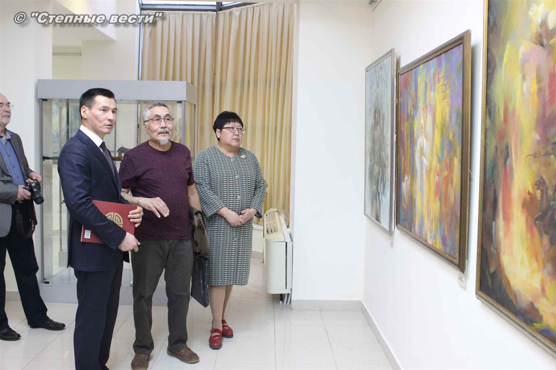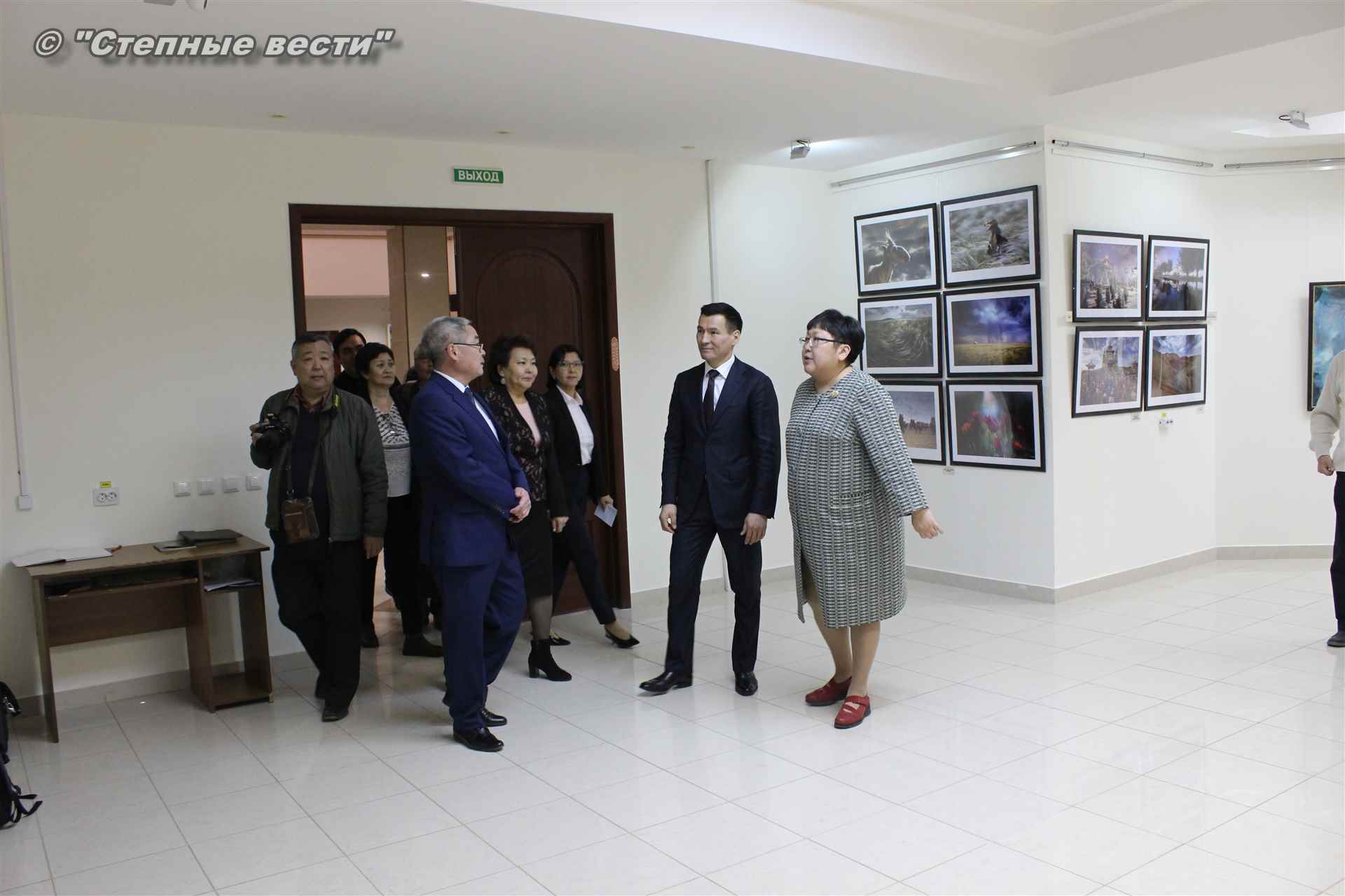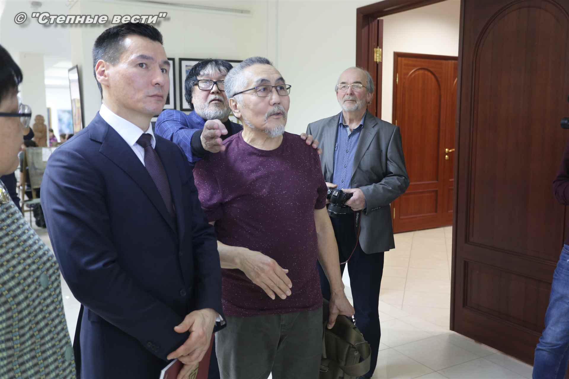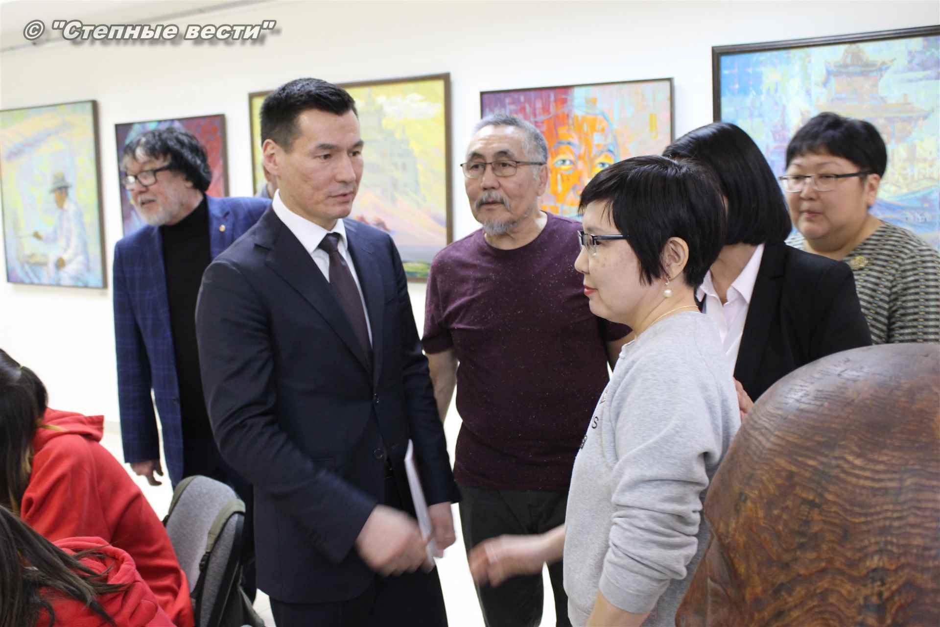 Далее  в сопровождении министра культуры и туризма РК Хонгора Эльбикова, директора музея Ирины Мучаевой и мастеров изобразительного искусства Бату Хасиков ознакомился с выставкой калмыцких художников творческой группы «Кочевники».