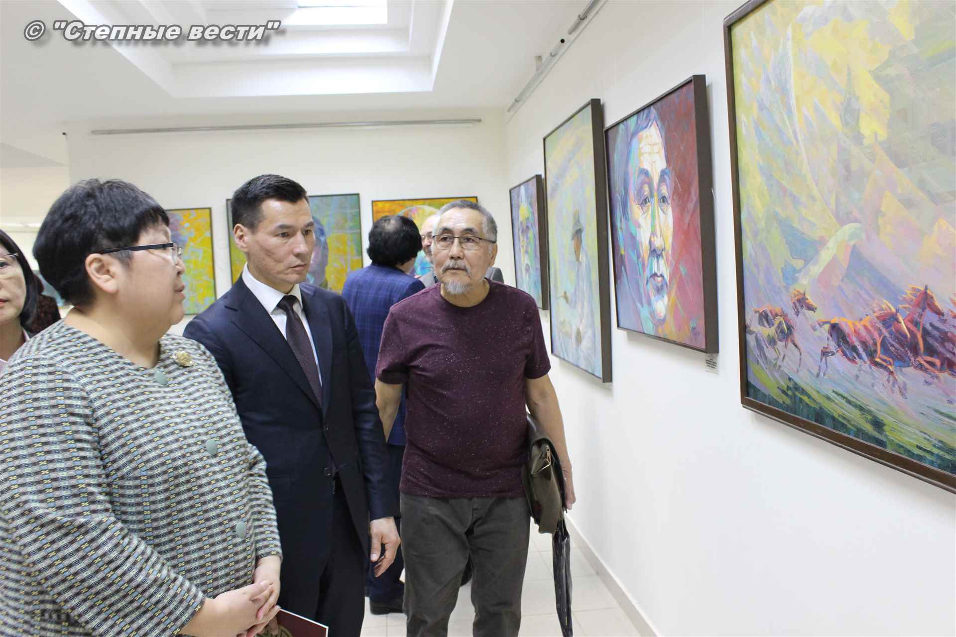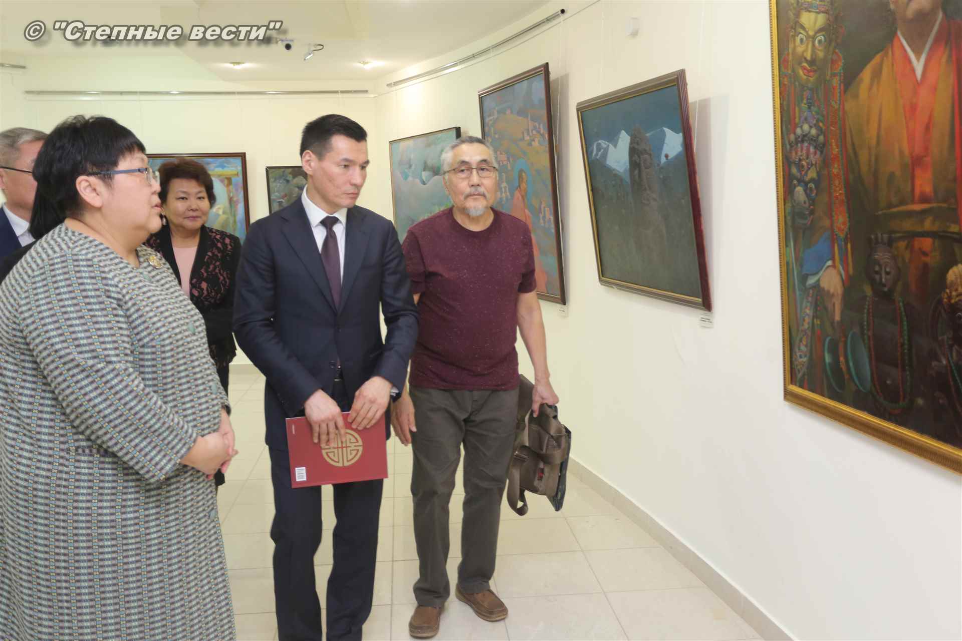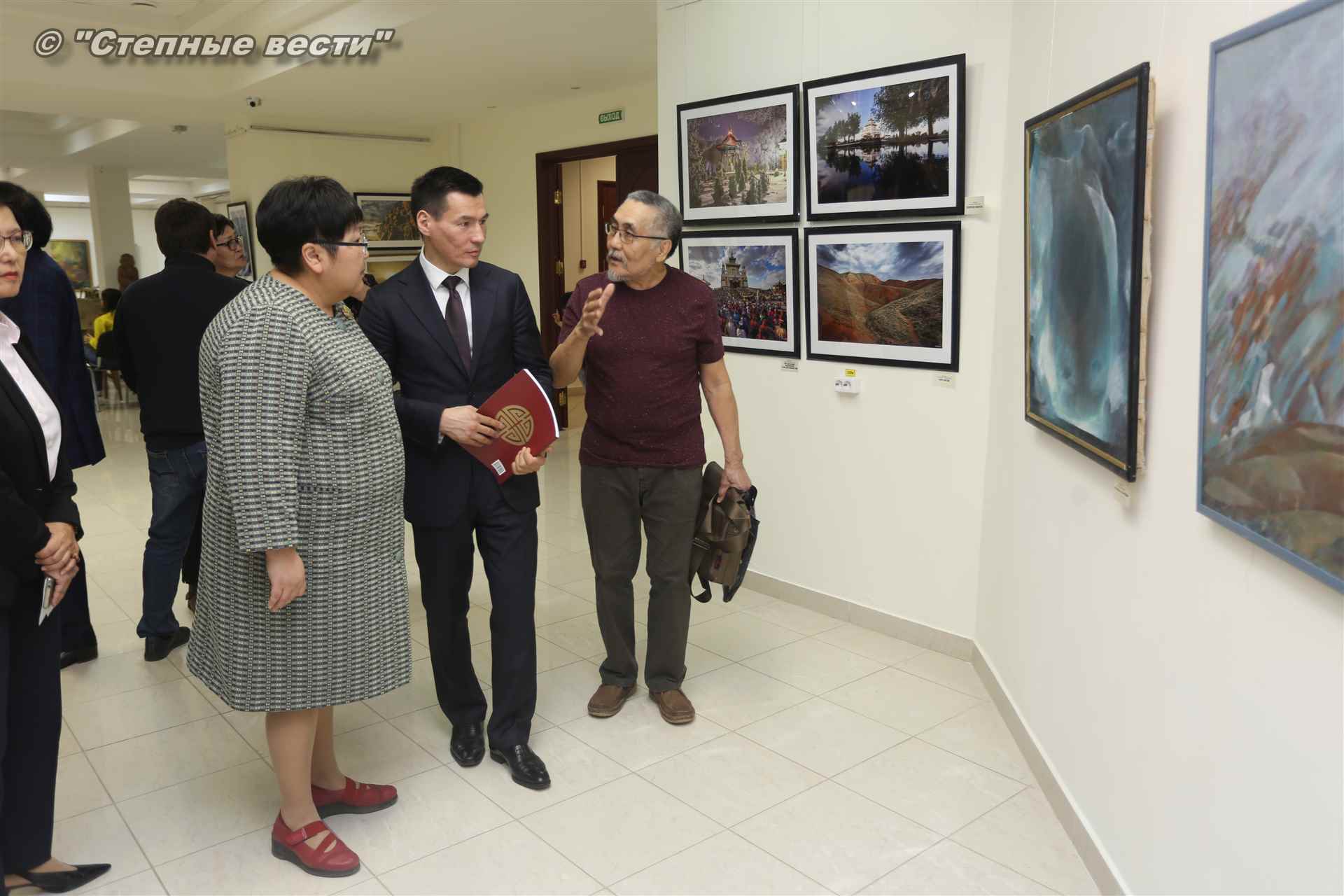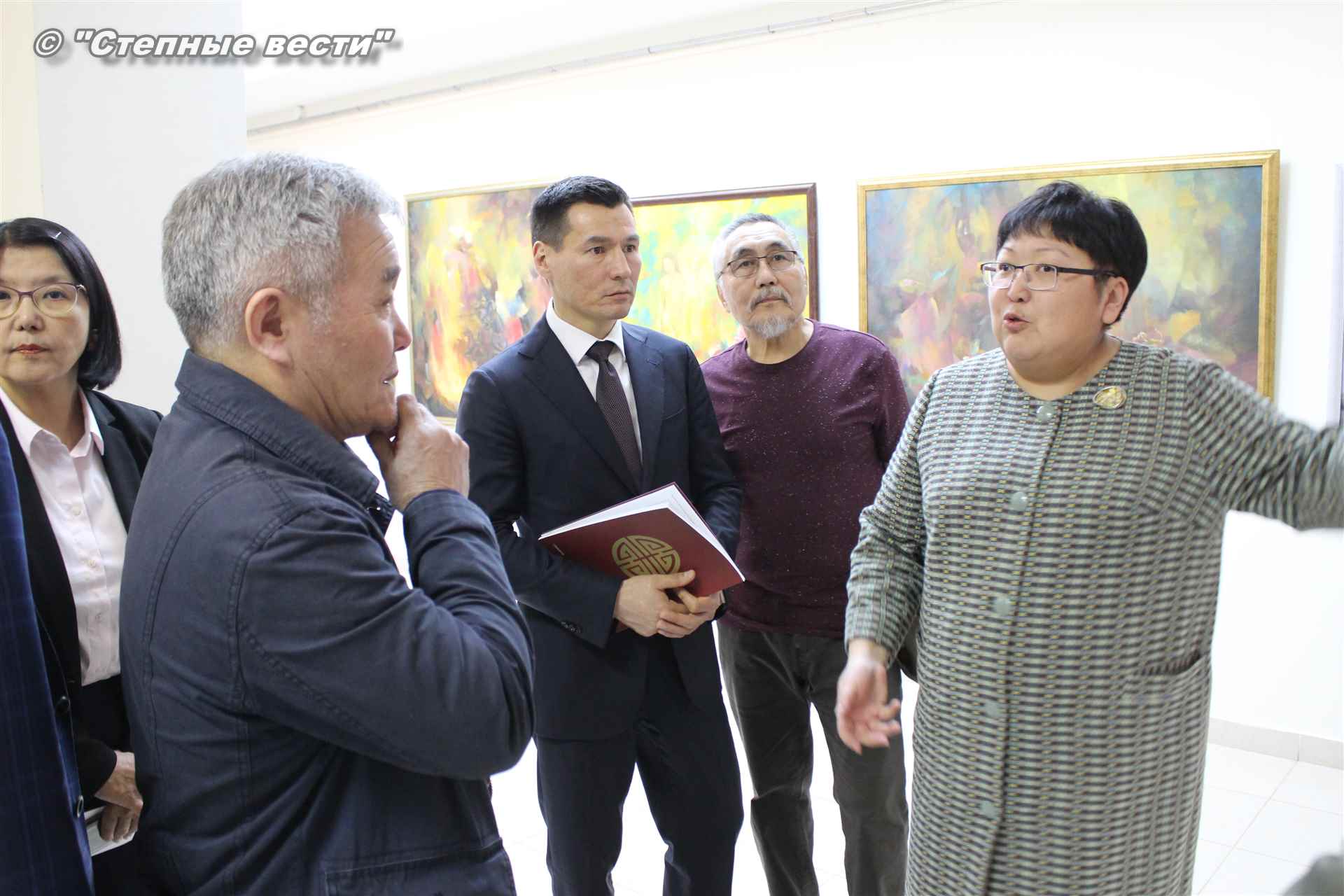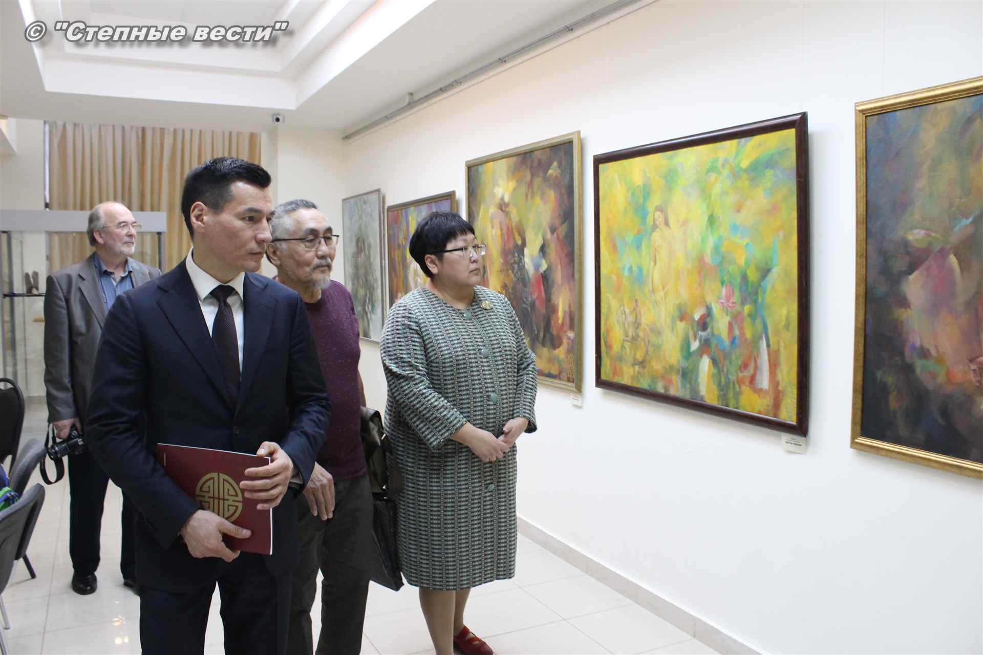 Далее  в сопровождении министра культуры и туризма РК Хонгора Эльбикова, директора музея Ирины Мучаевой и мастеров изобразительного искусства Бату Хасиков ознакомился с выставкой калмыцких художников творческой группы «Кочевники».