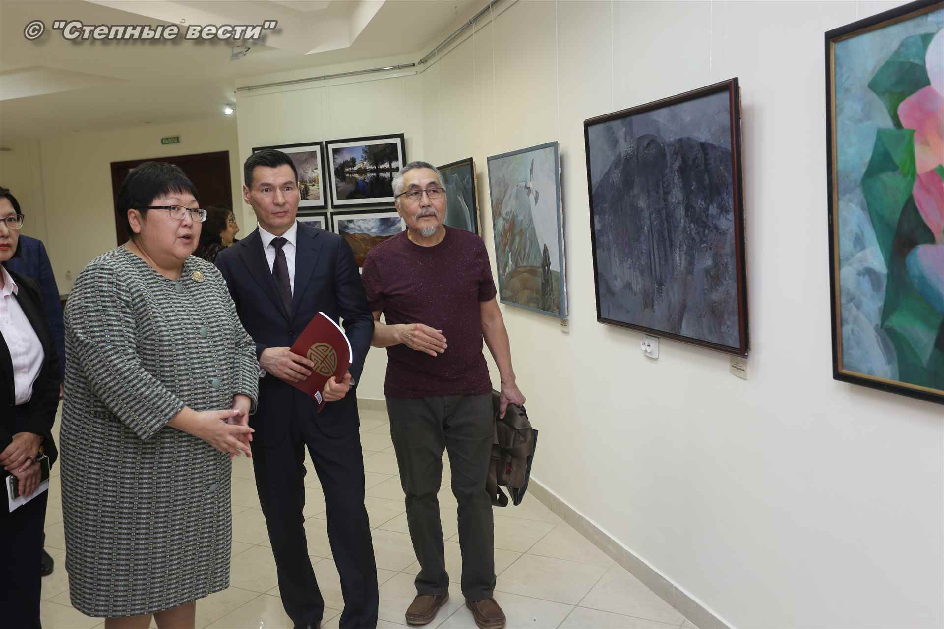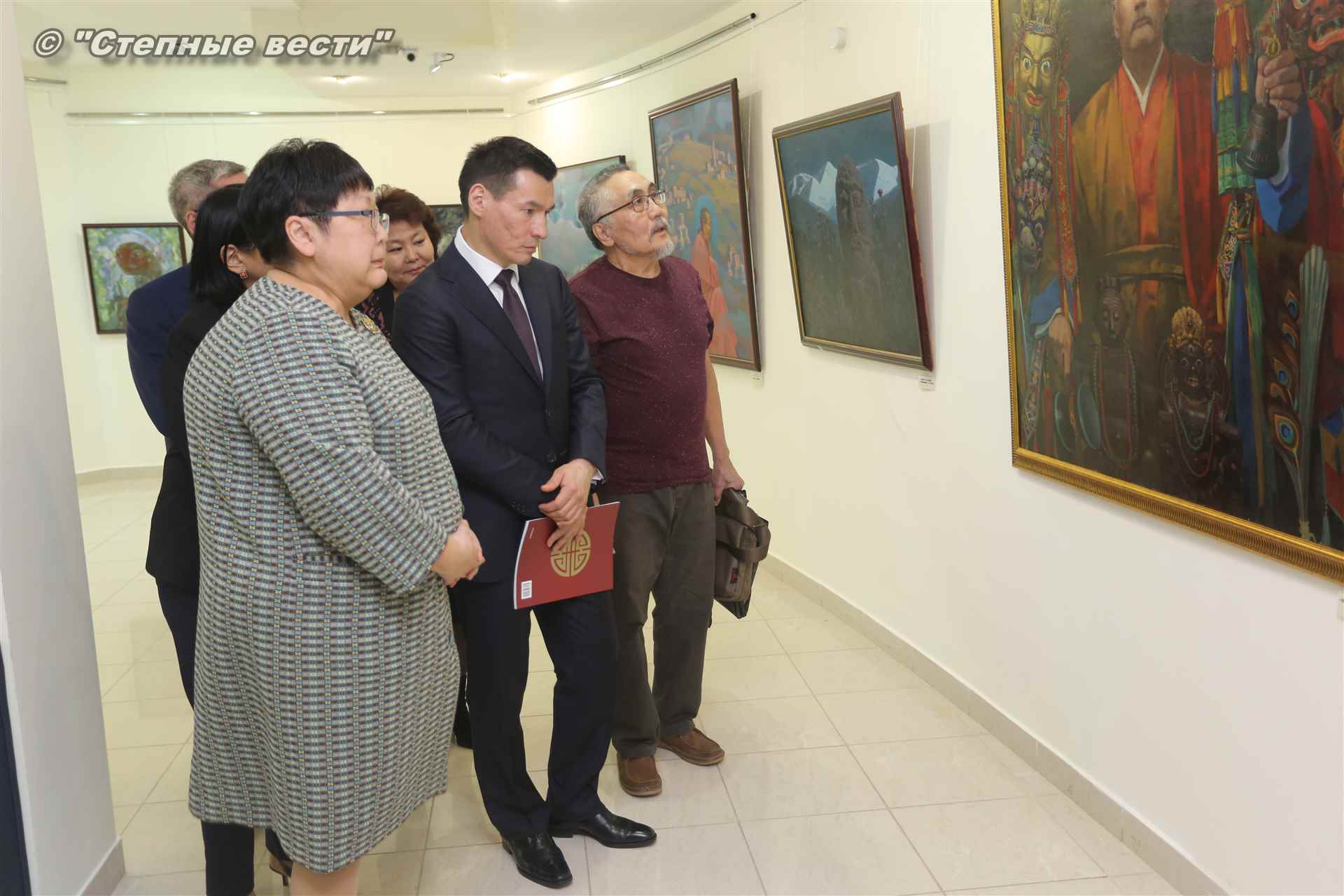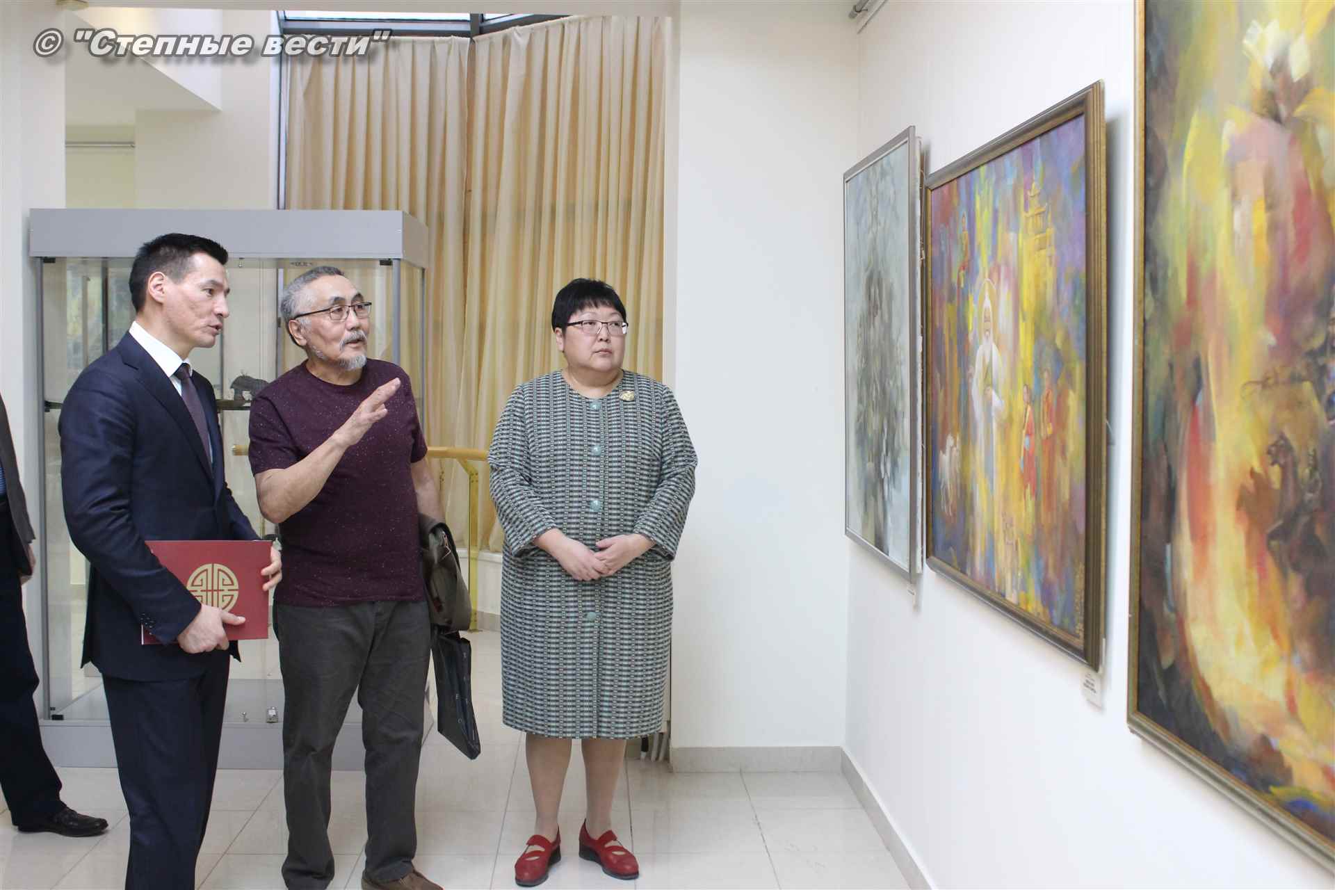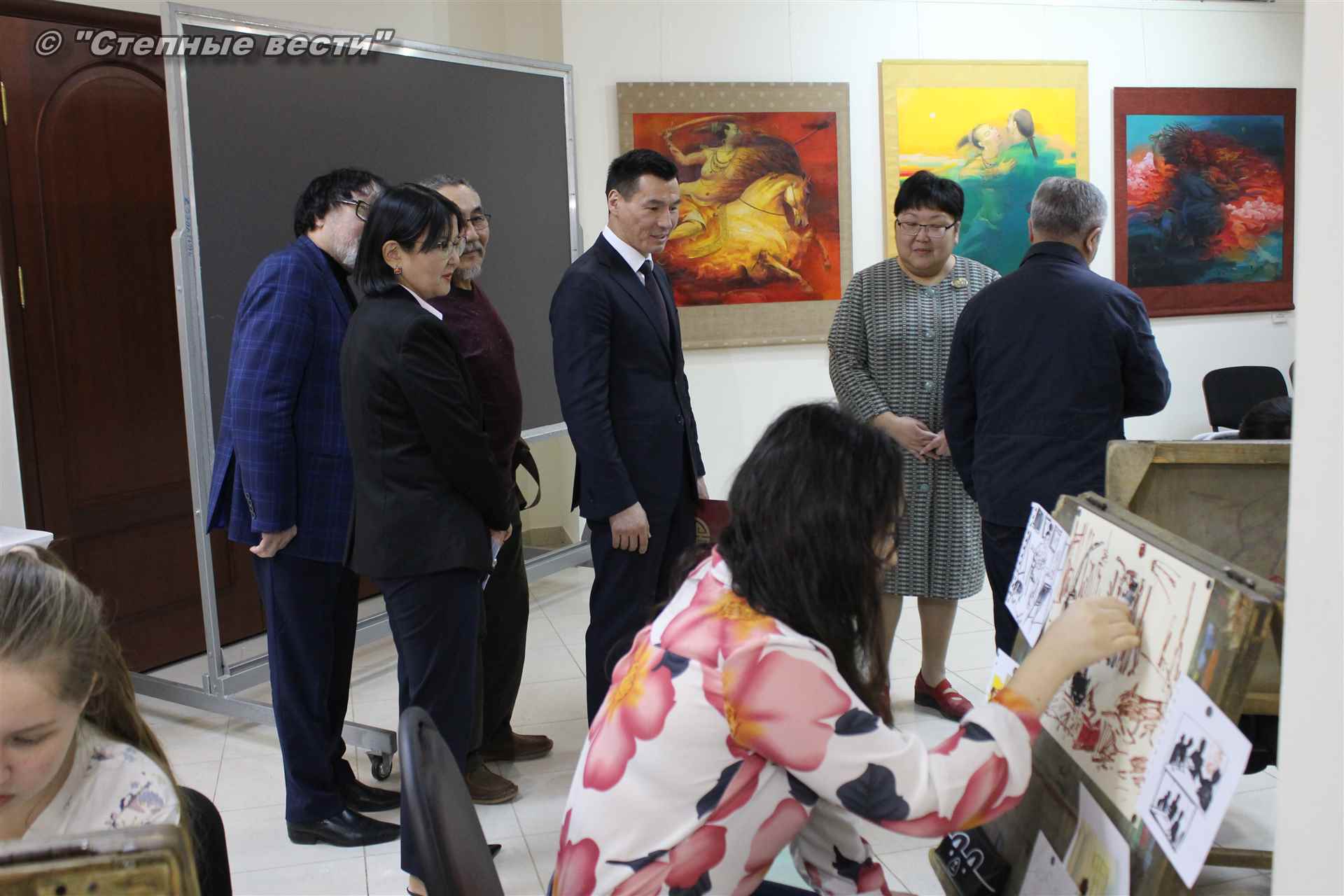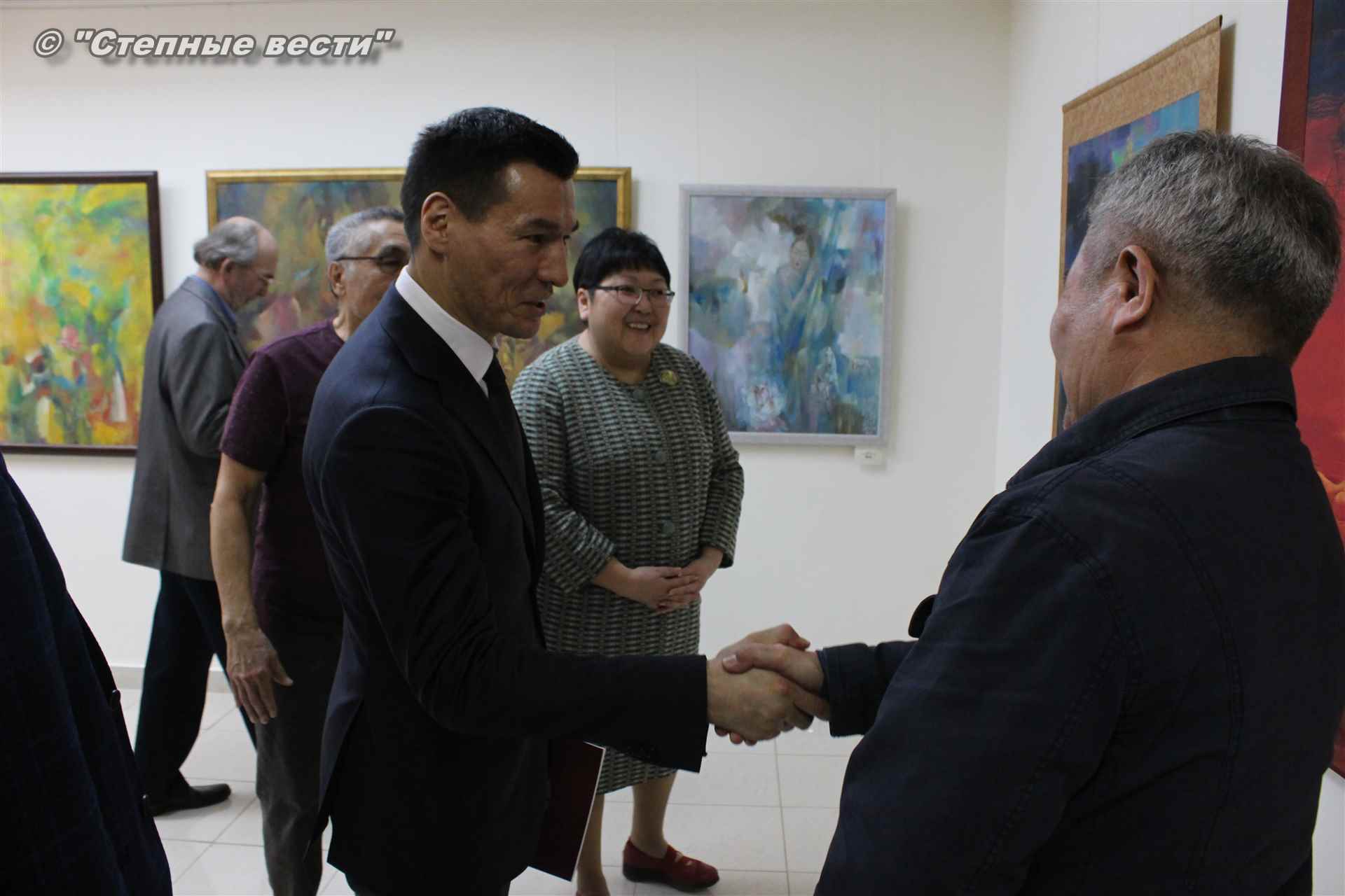 Далее  в сопровождении министра культуры и туризма РК Хонгора Эльбикова, директора музея Ирины Мучаевой и мастеров изобразительного искусства Бату Хасиков ознакомился с выставкой калмыцких художников творческой группы «Кочевники».