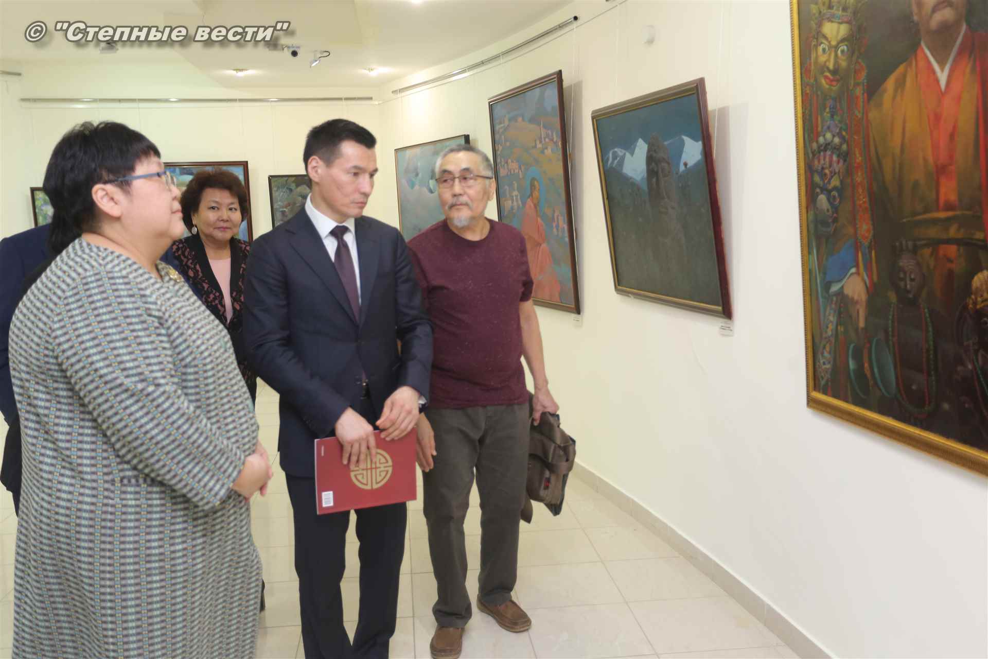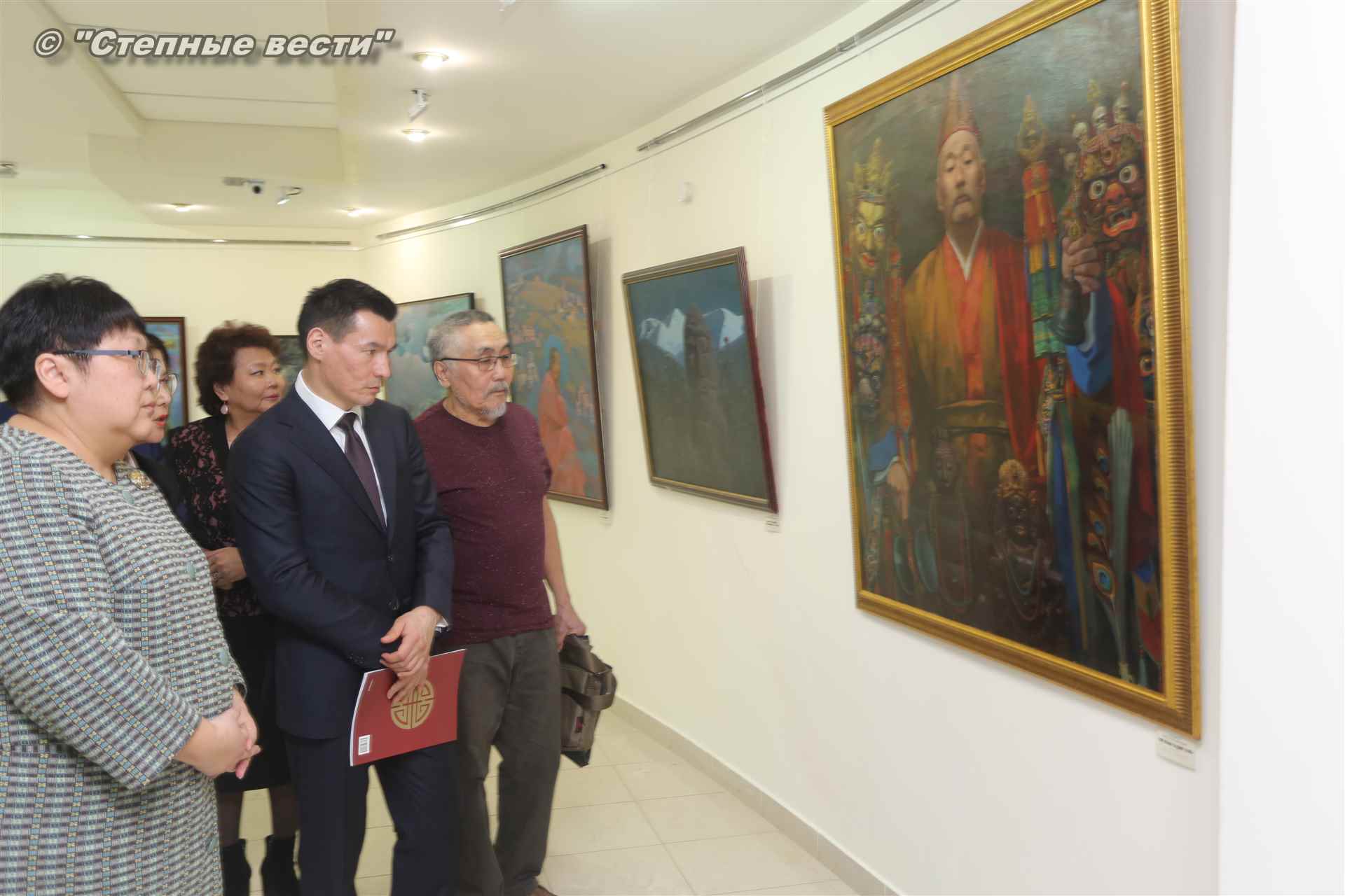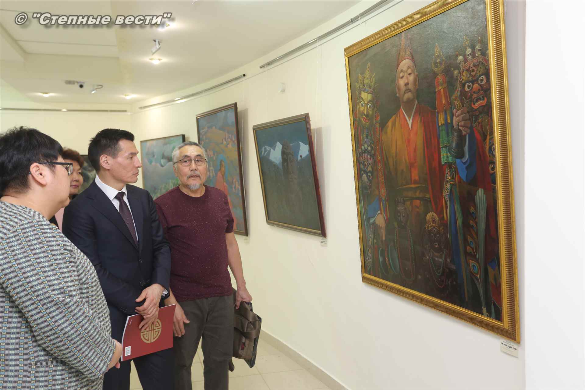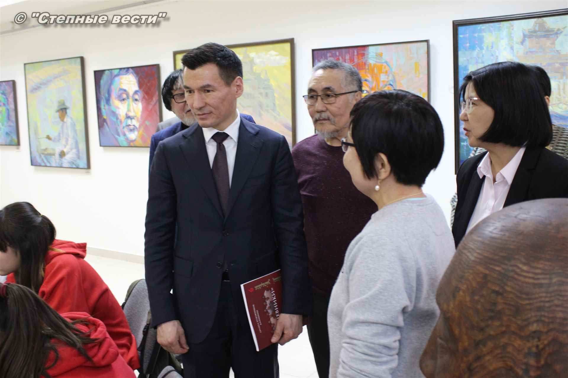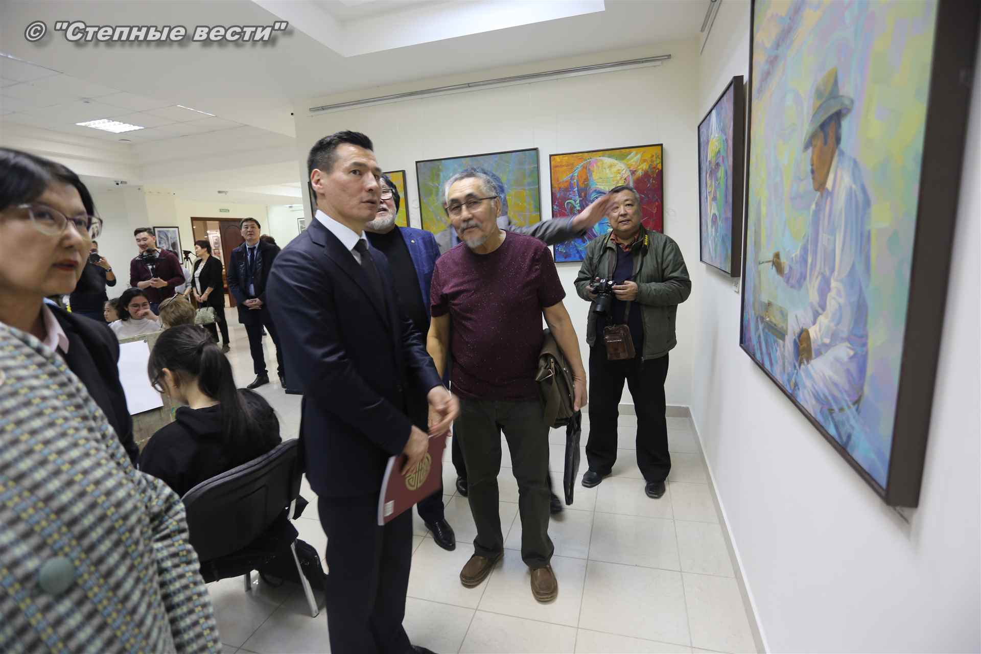 Далее  в сопровождении министра культуры и туризма РК Хонгора Эльбикова, директора музея Ирины Мучаевой и мастеров изобразительного искусства Бату Хасиков ознакомился с выставкой калмыцких художников творческой группы «Кочевники».