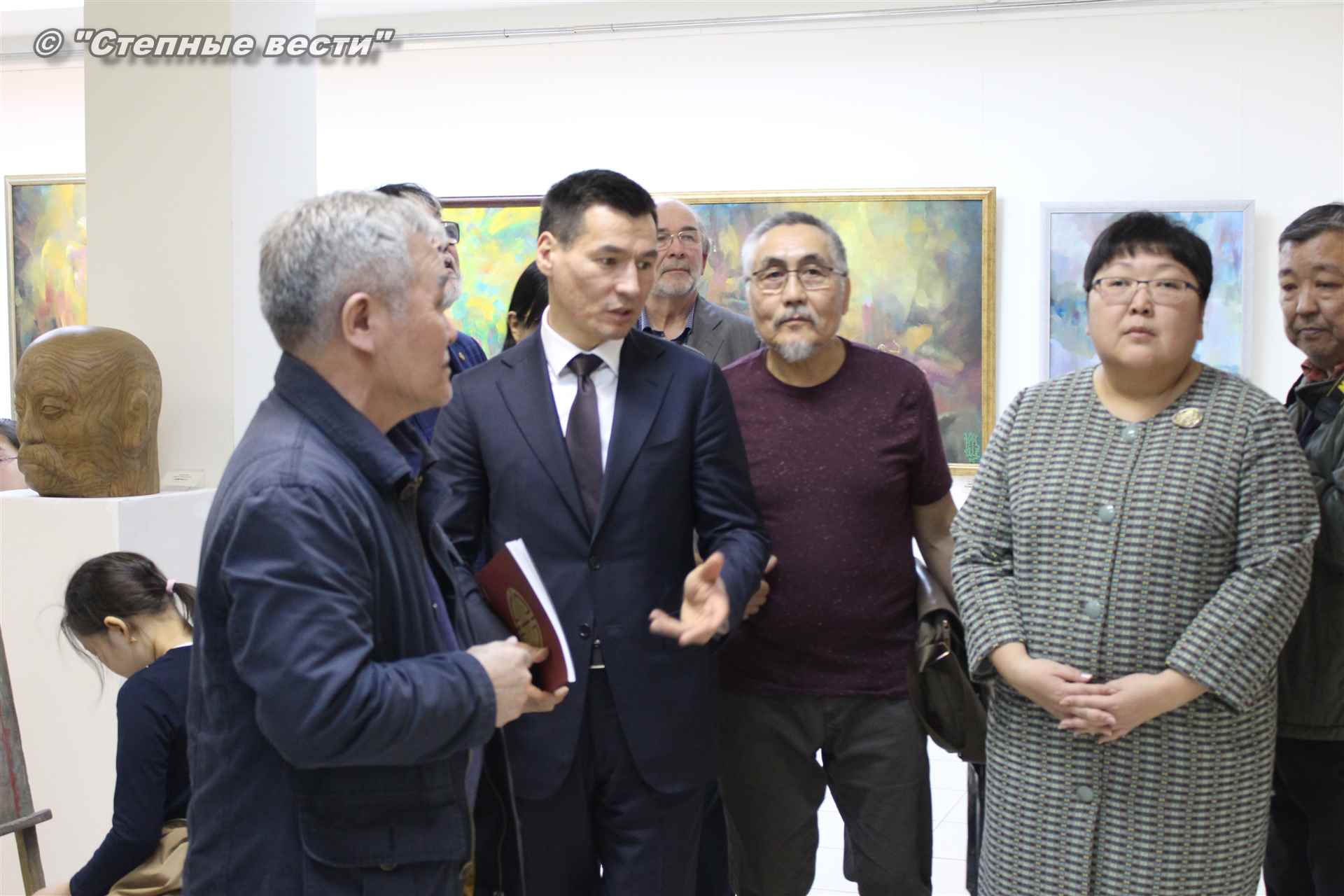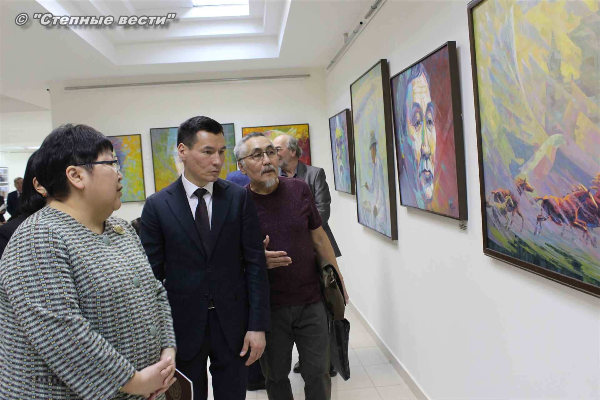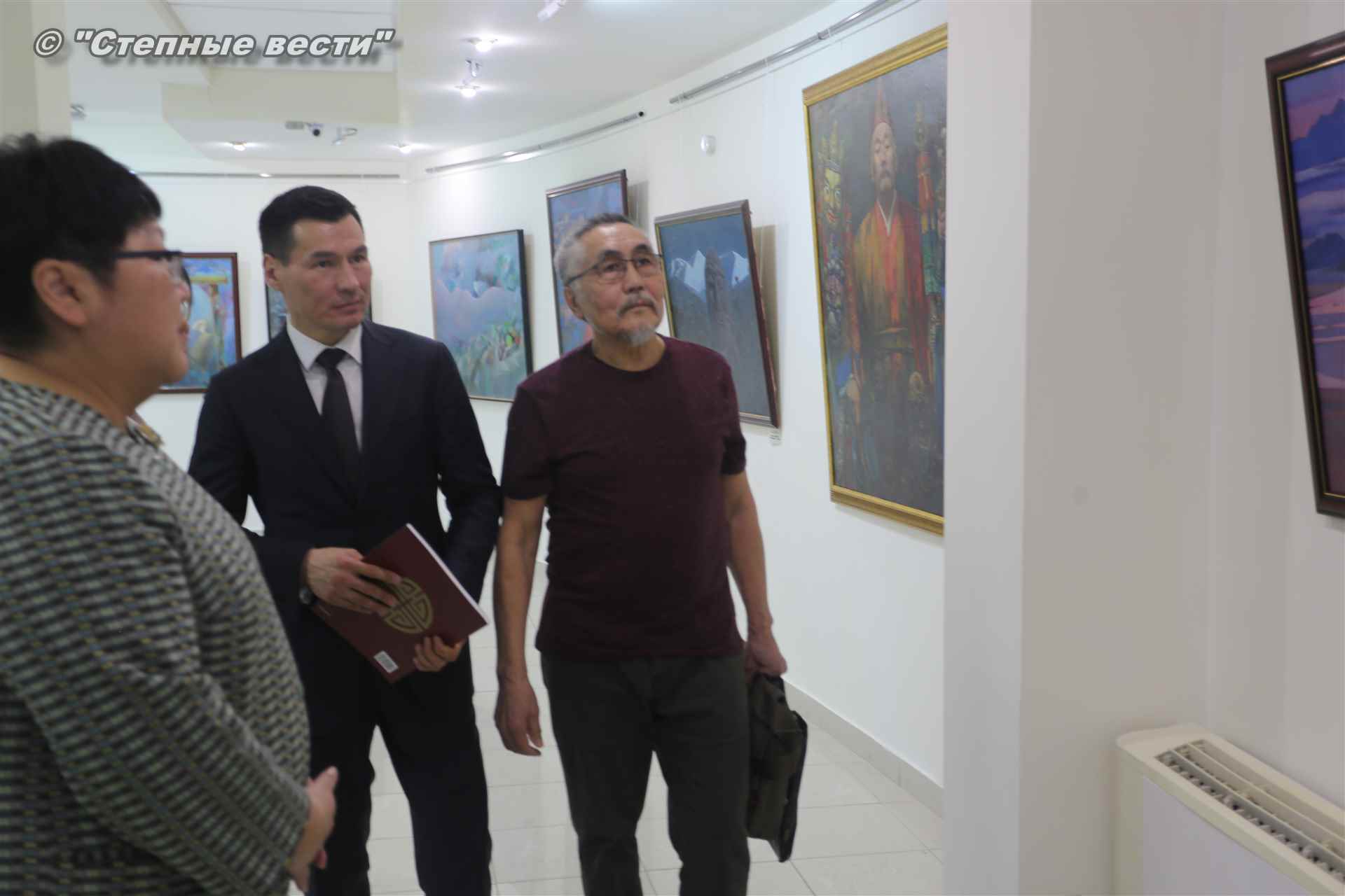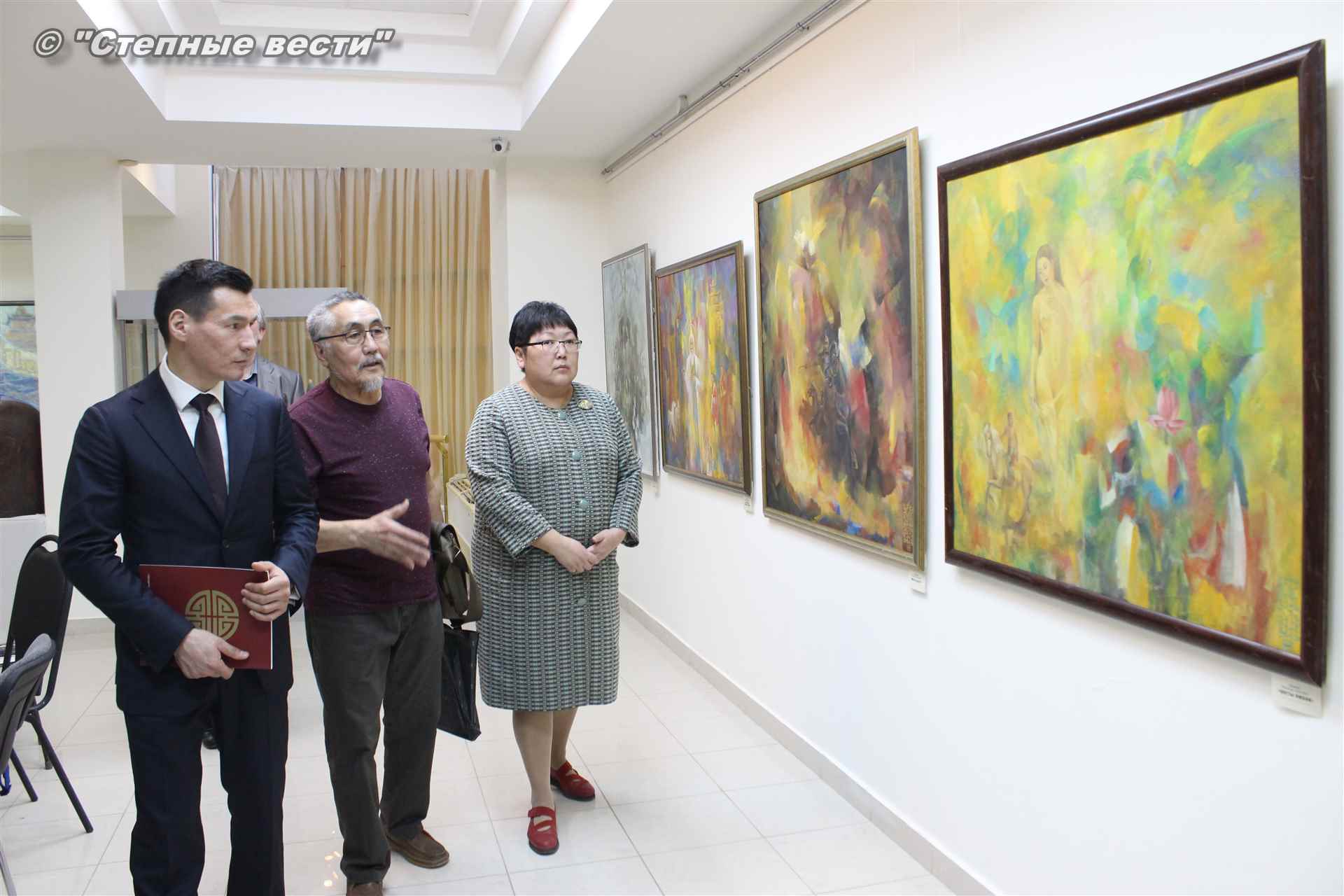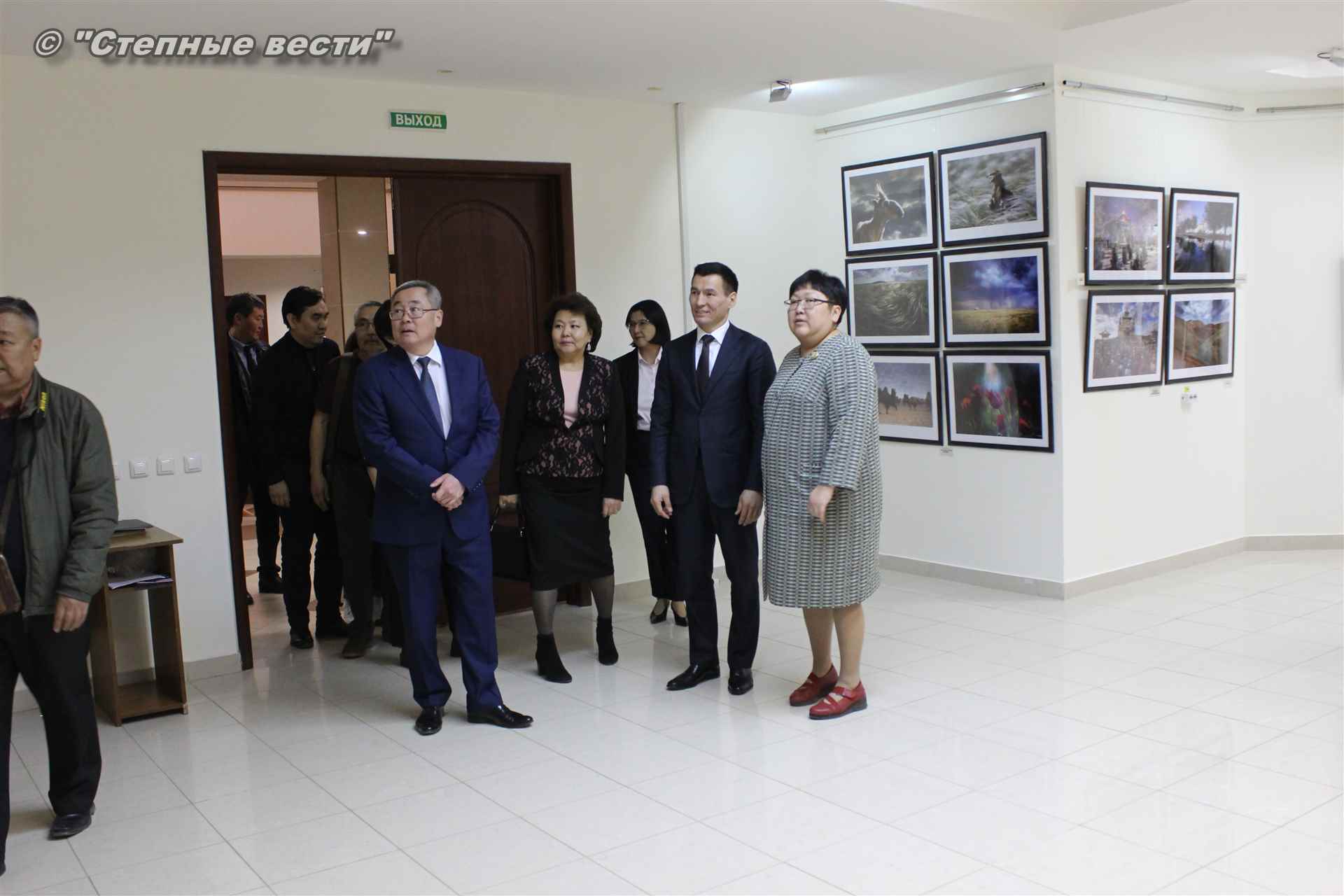Далее  в сопровождении министра культуры и туризма РК Хонгора Эльбикова, директора музея Ирины Мучаевой и мастеров изобразительного искусства Бату Хасиков ознакомился с выставкой калмыцких художников творческой группы «Кочевники».