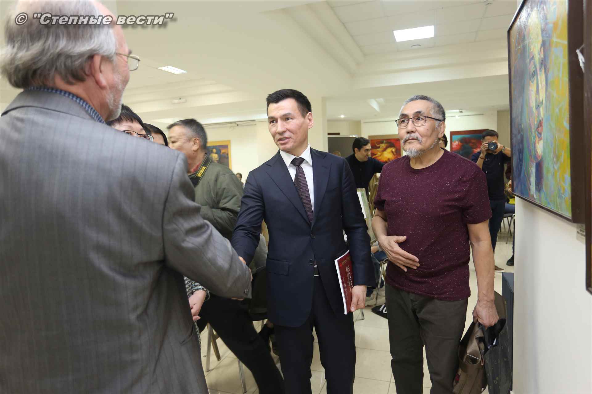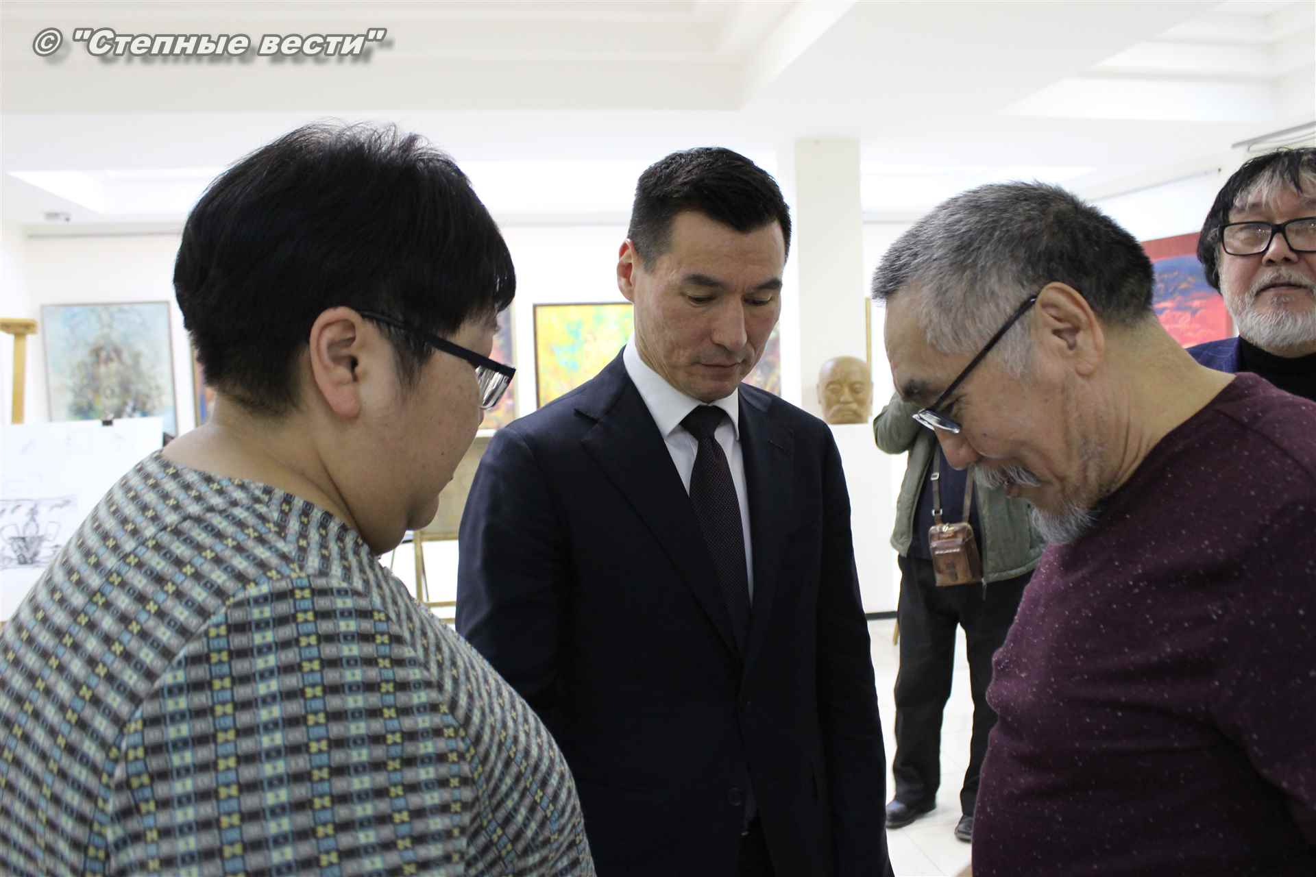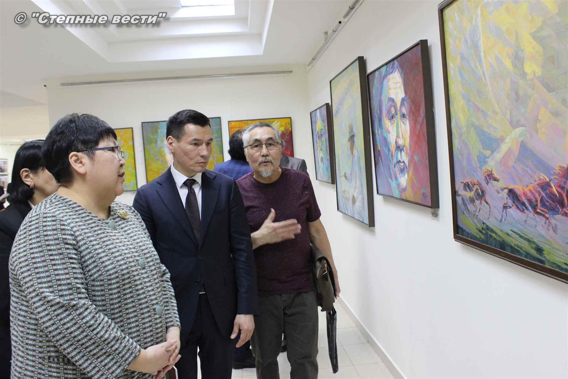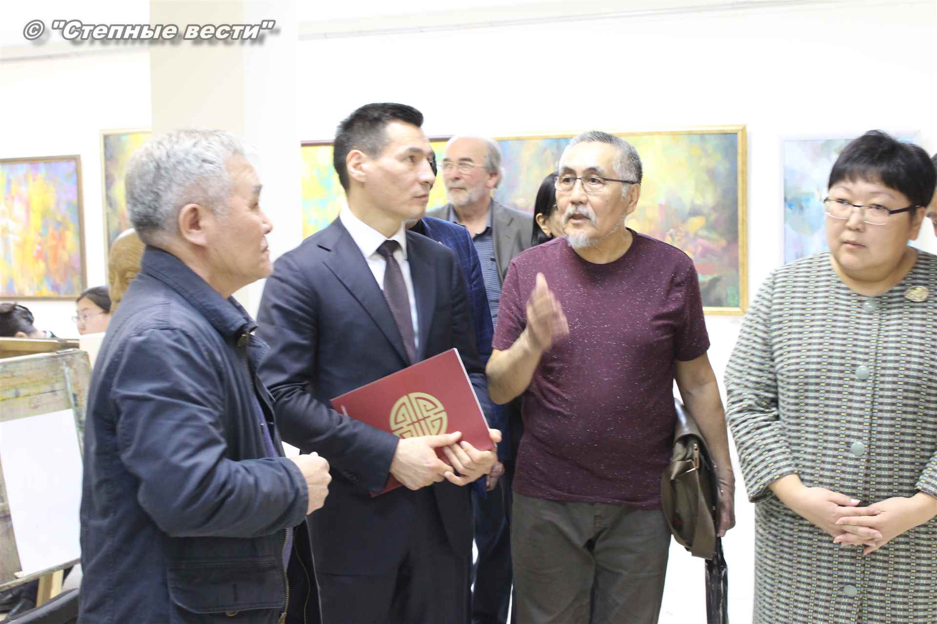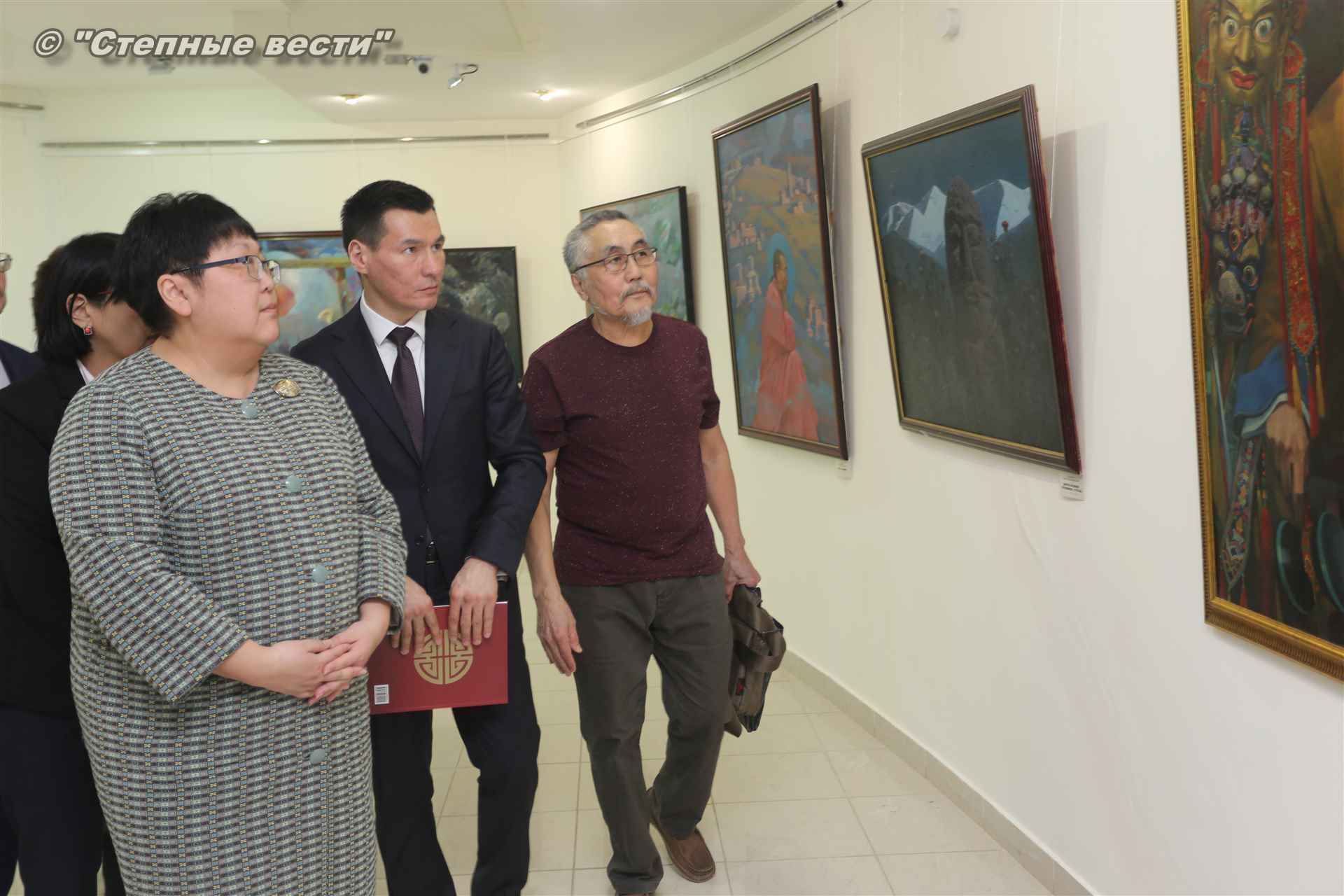 Далее  в сопровождении министра культуры и туризма РК Хонгора Эльбикова, директора музея Ирины Мучаевой и мастеров изобразительного искусства Бату Хасиков ознакомился с выставкой калмыцких художников творческой группы «Кочевники».