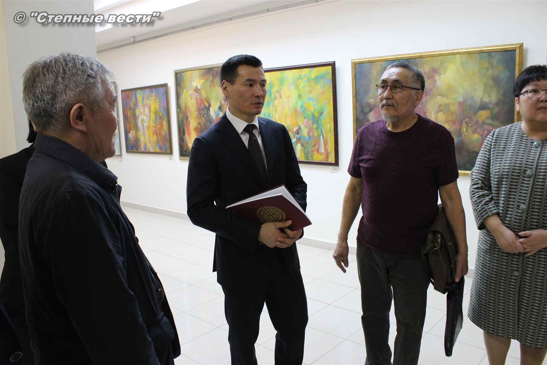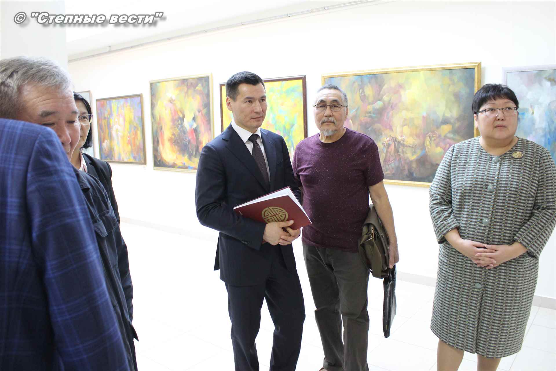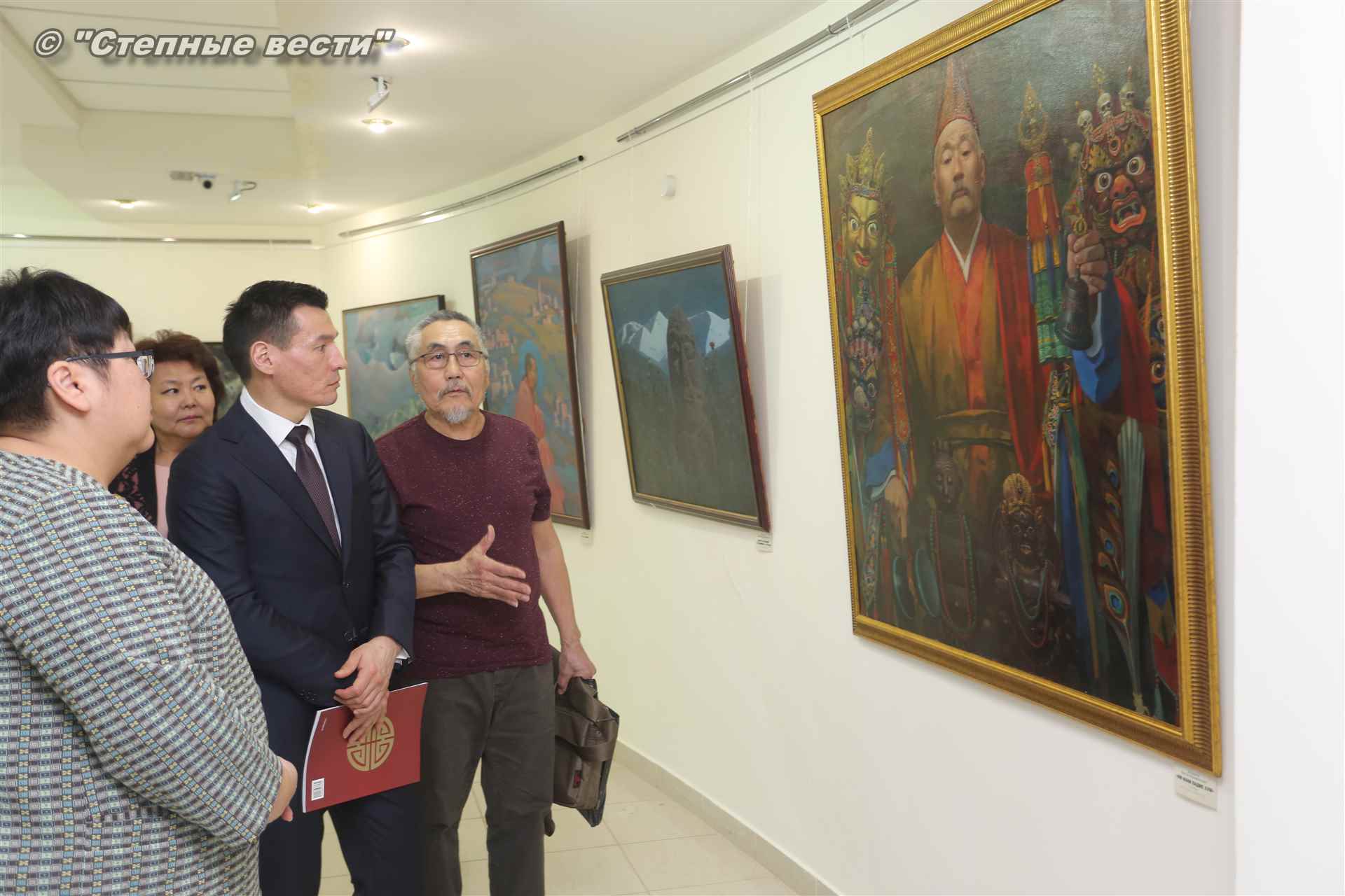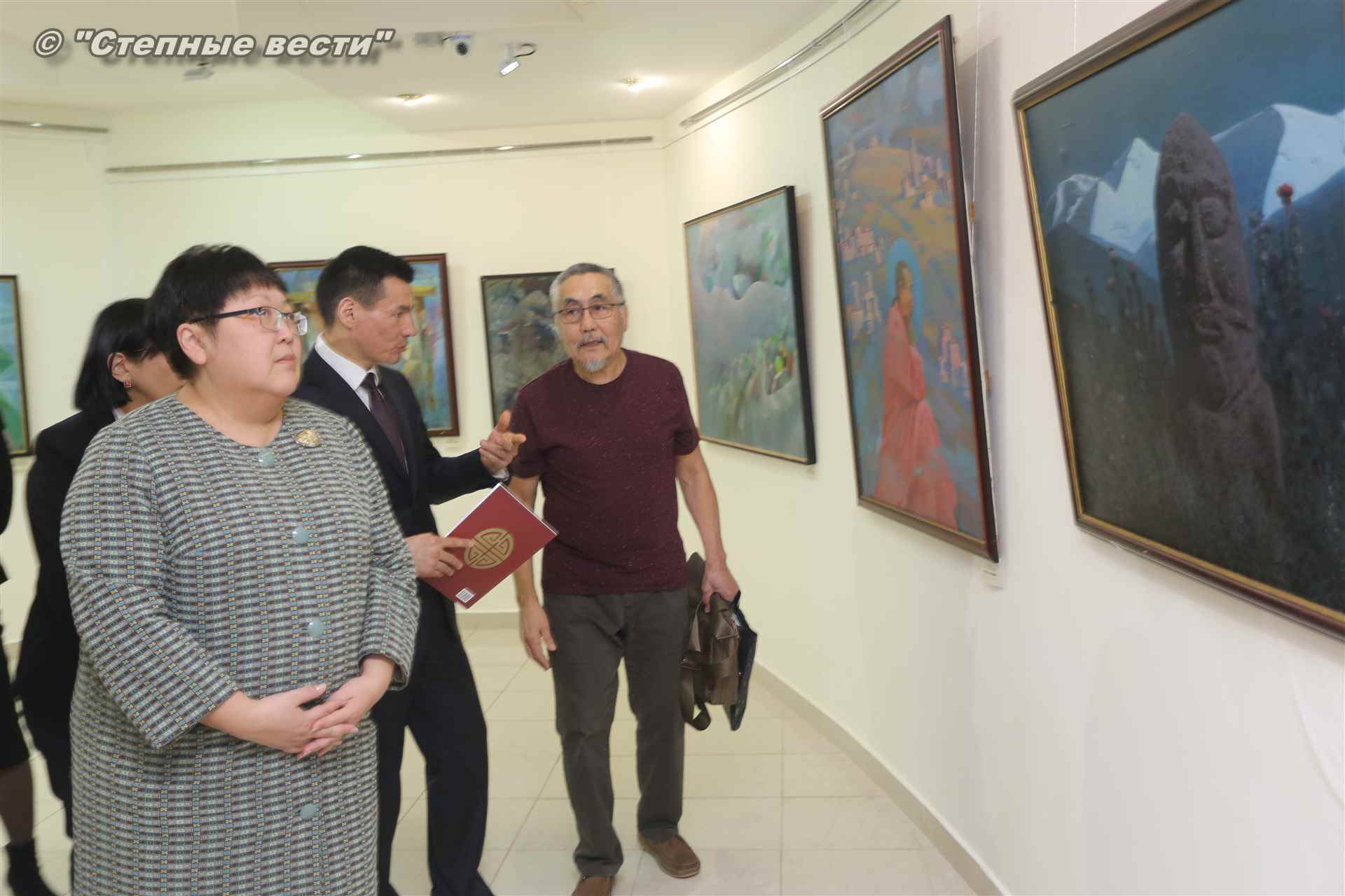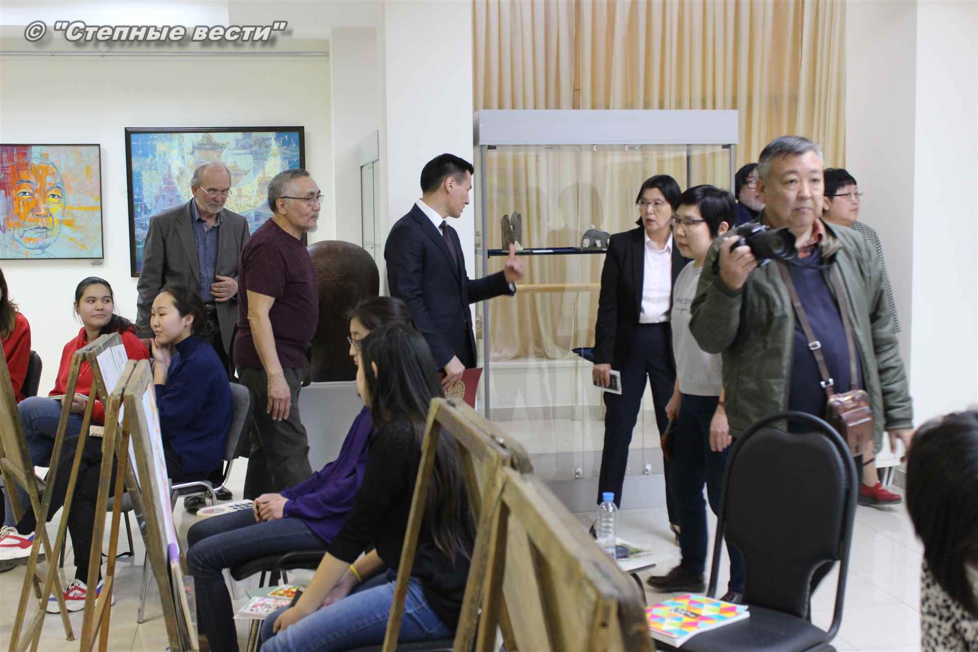Далее  в сопровождении министра культуры и туризма РК Хонгора Эльбикова, директора музея Ирины Мучаевой и мастеров изобразительного искусства Бату Хасиков ознакомился с выставкой калмыцких художников творческой группы «Кочевники».