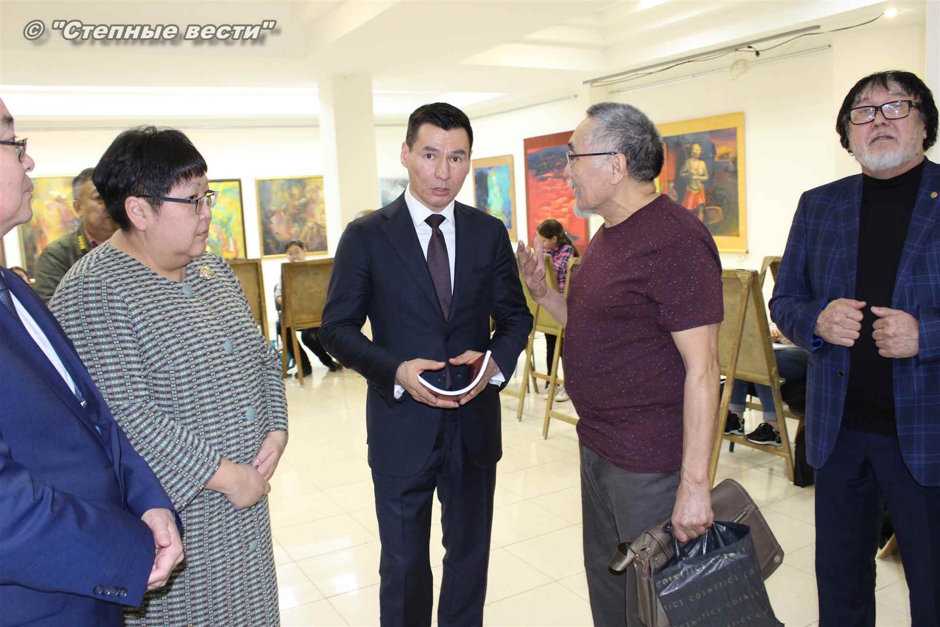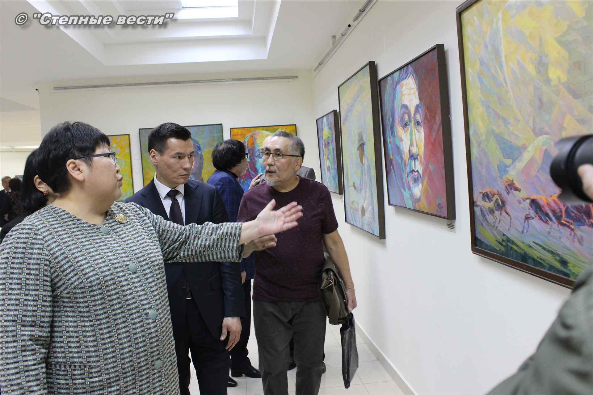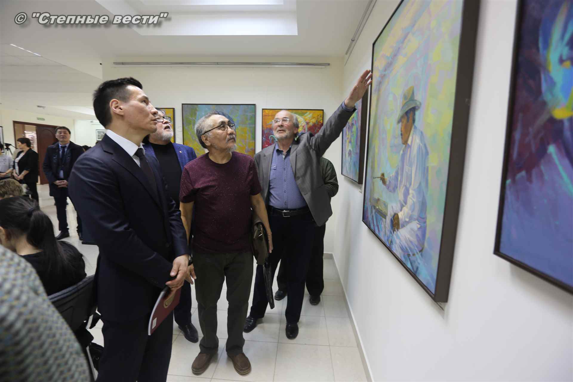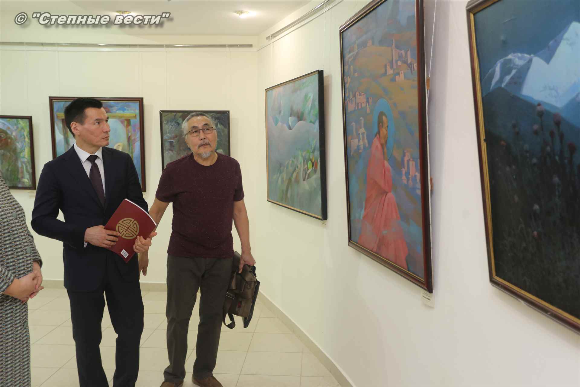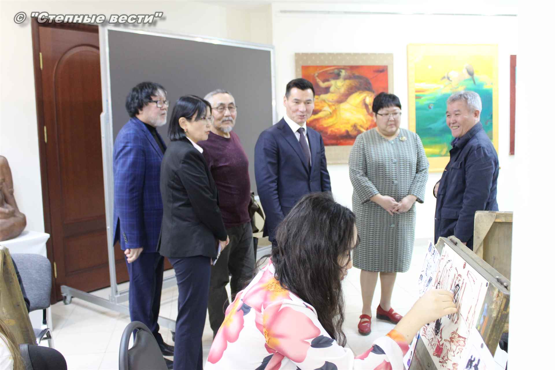 Далее  в сопровождении министра культуры и туризма РК Хонгора Эльбикова, директора музея Ирины Мучаевой и мастеров изобразительного искусства Бату Хасиков ознакомился с выставкой калмыцких художников творческой группы «Кочевники».