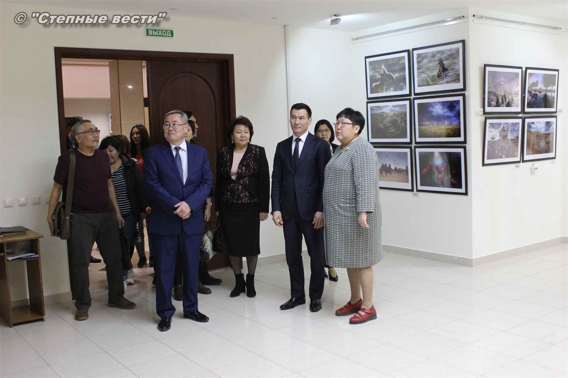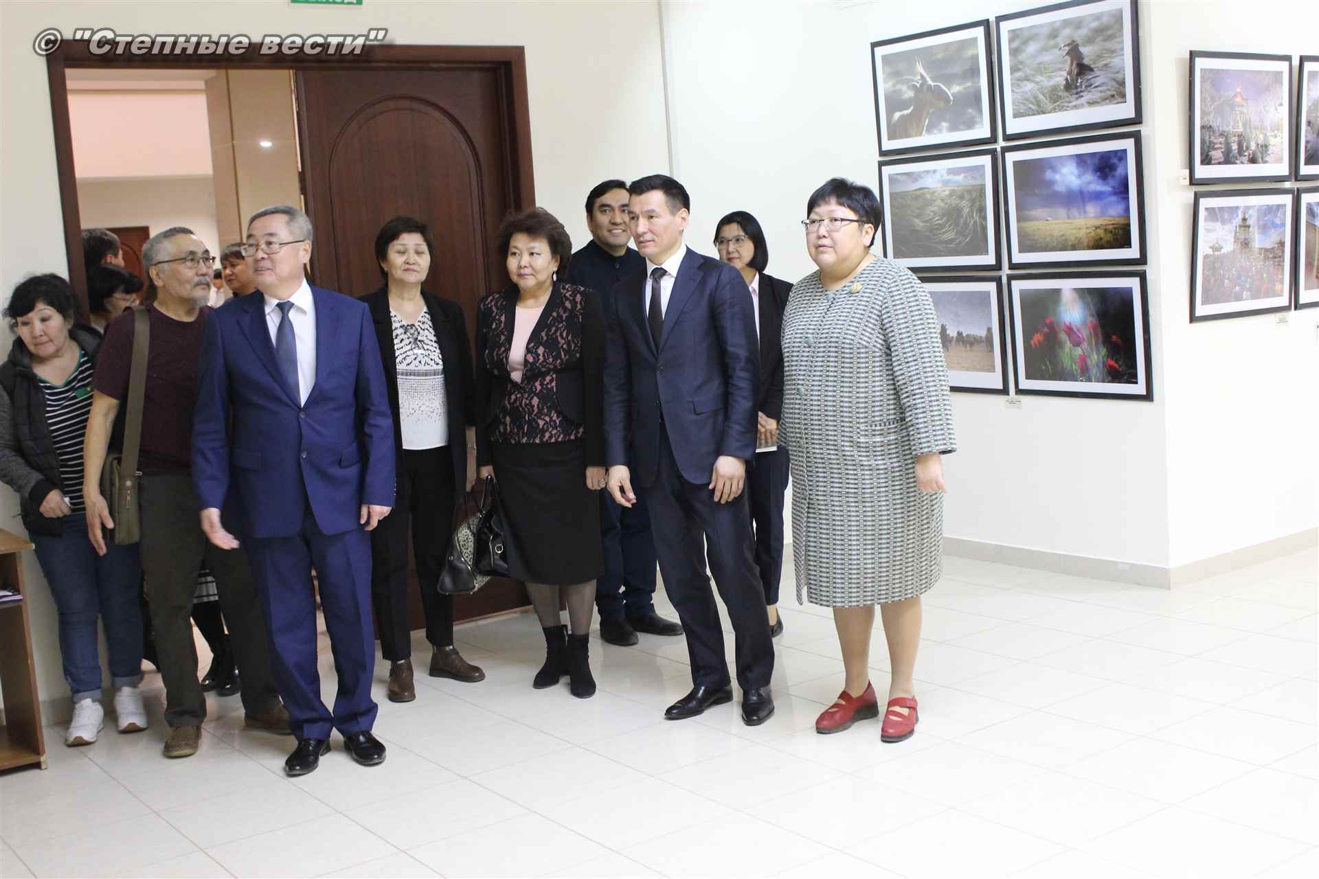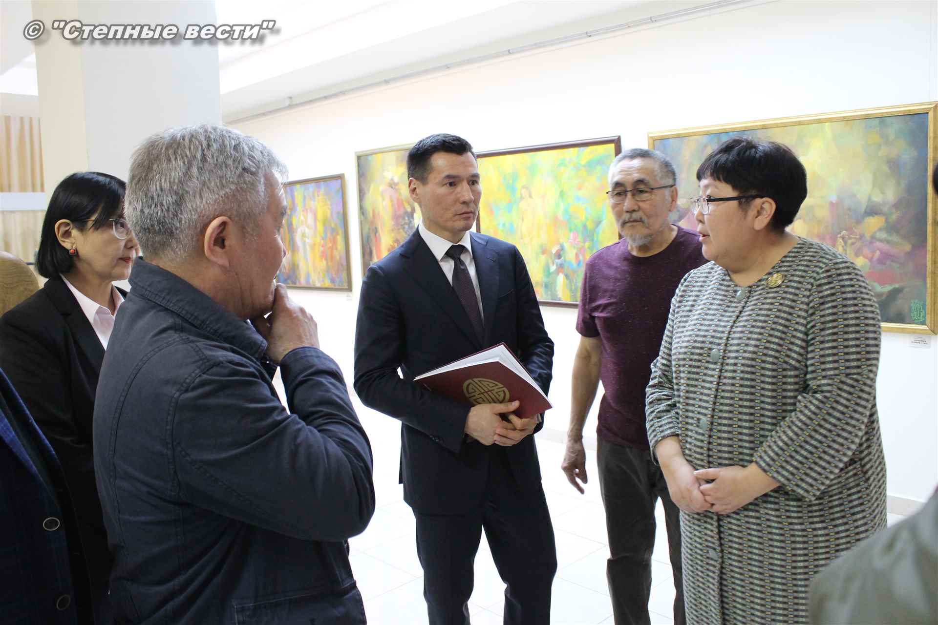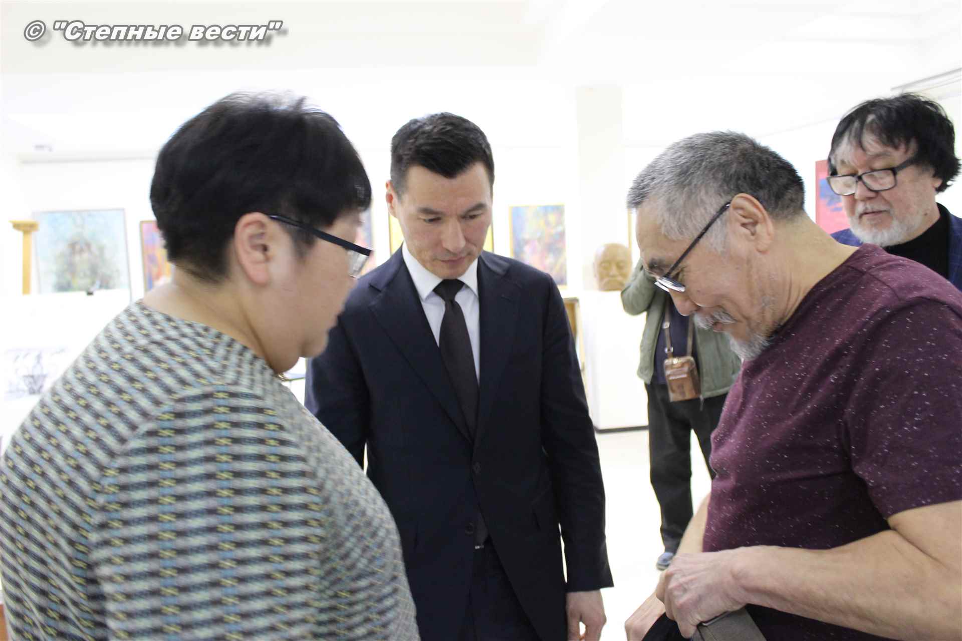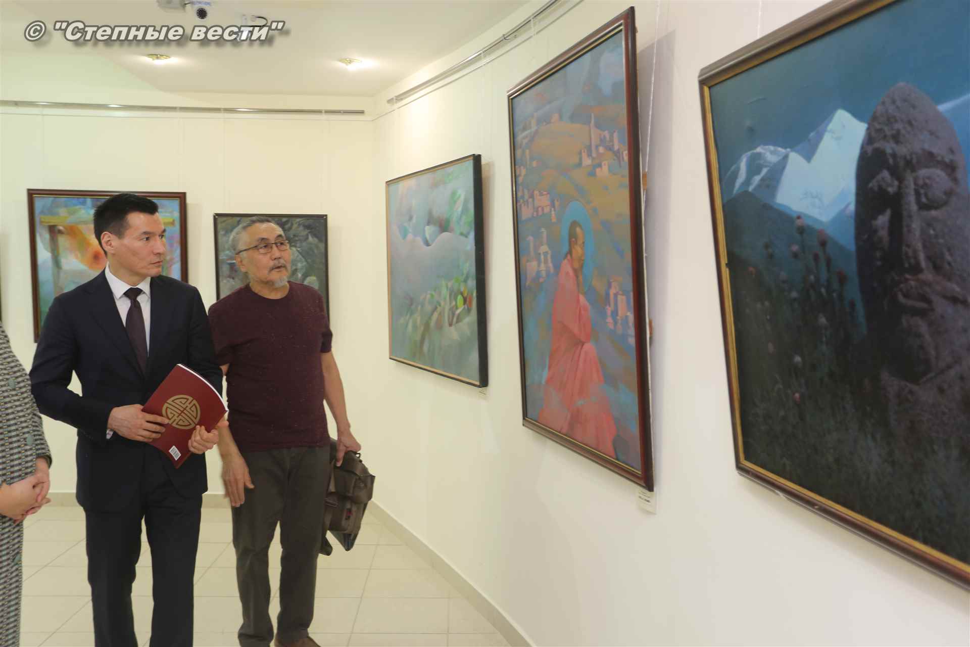 Далее  в сопровождении министра культуры и туризма РК Хонгора Эльбикова, директора музея Ирины Мучаевой и мастеров изобразительного искусства Бату Хасиков ознакомился с выставкой калмыцких художников творческой группы «Кочевники».