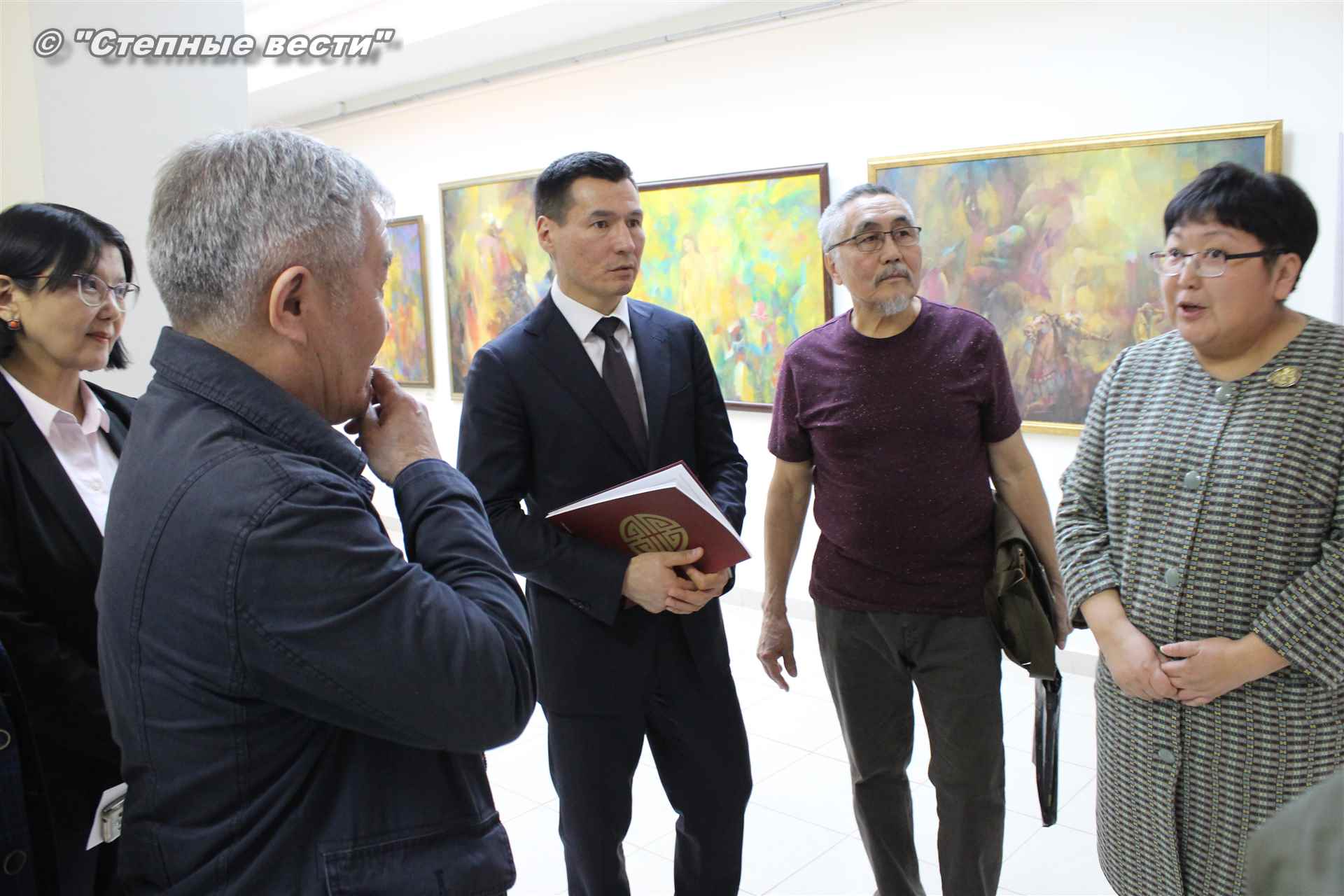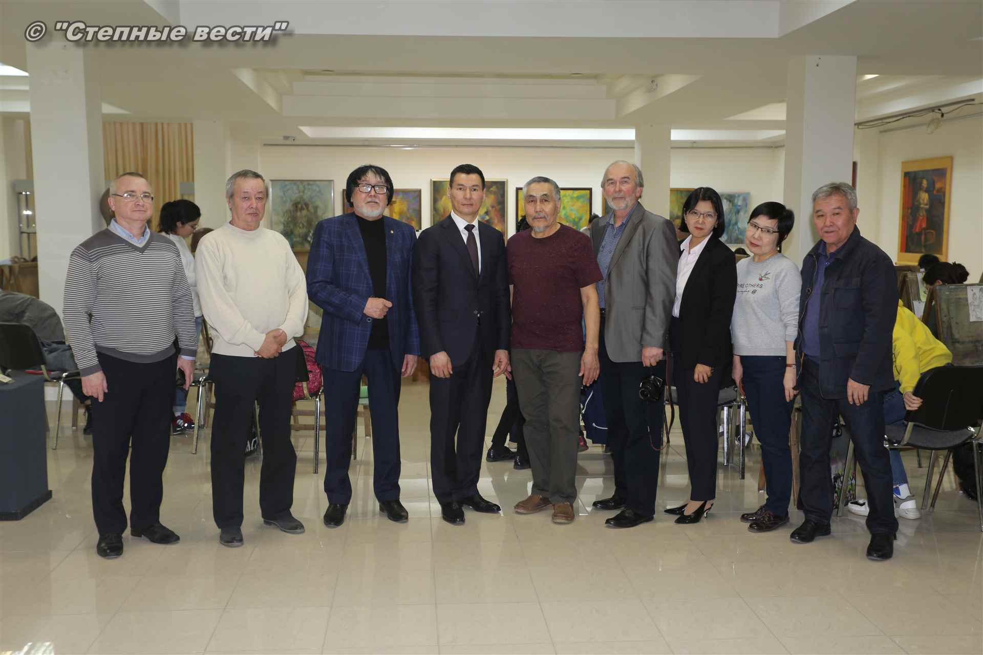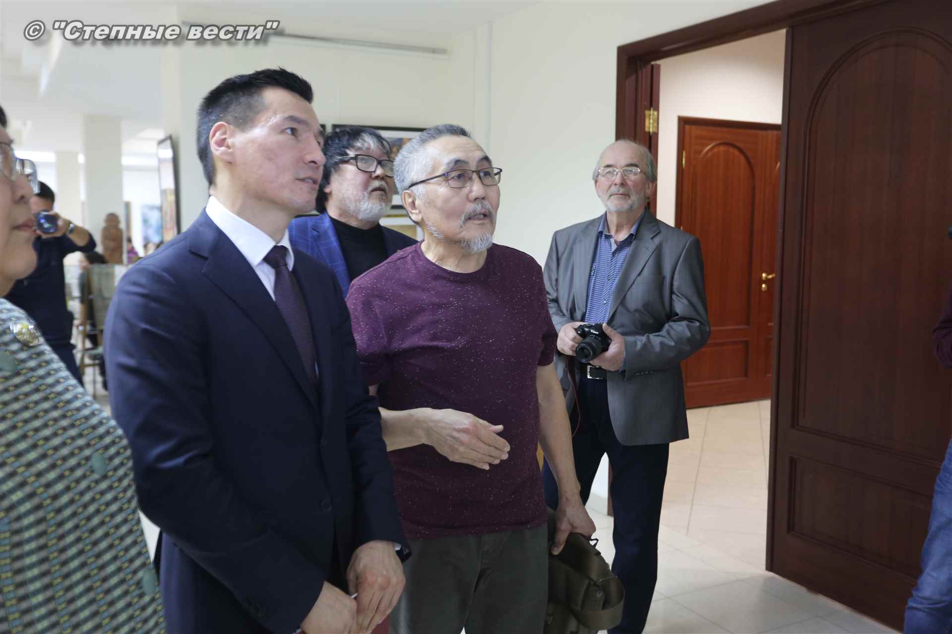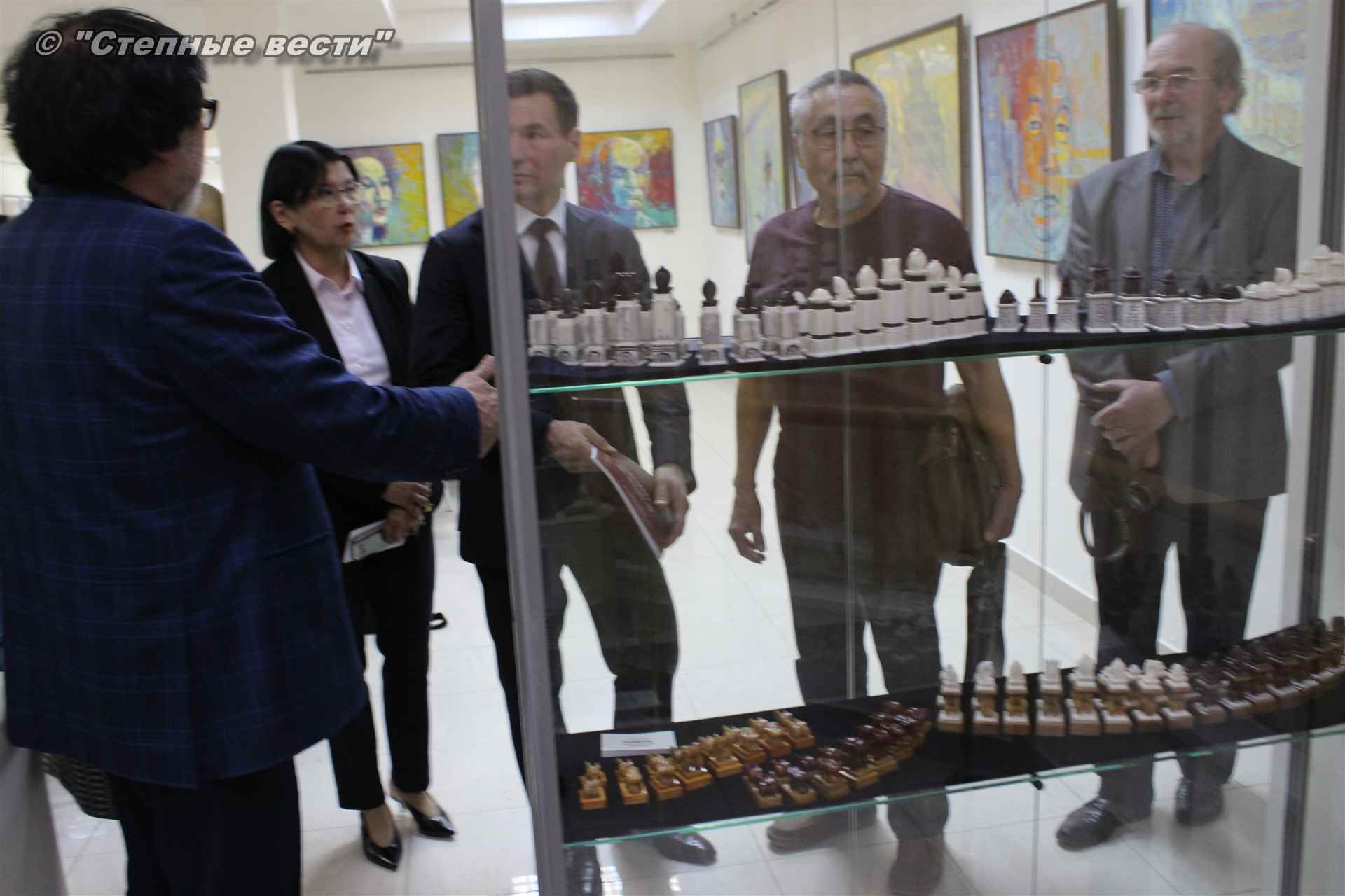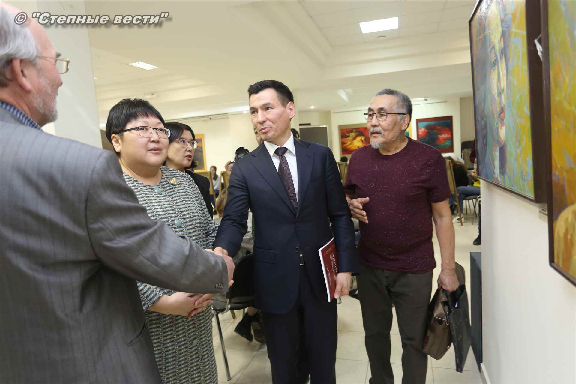 Далее  в сопровождении министра культуры и туризма РК Хонгора Эльбикова, директора музея Ирины Мучаевой и мастеров изобразительного искусства Бату Хасиков ознакомился с выставкой калмыцких художников творческой группы «Кочевники».
