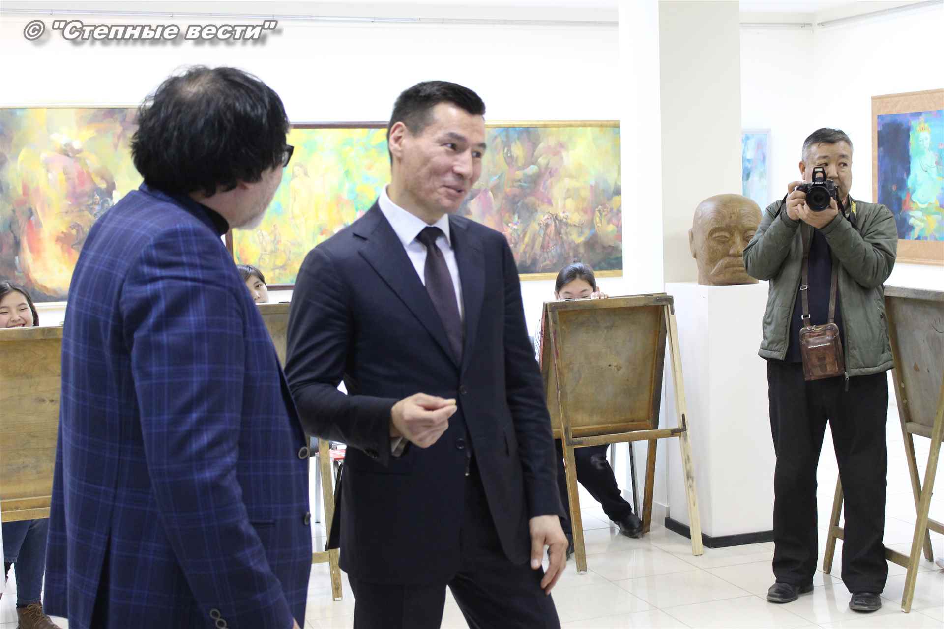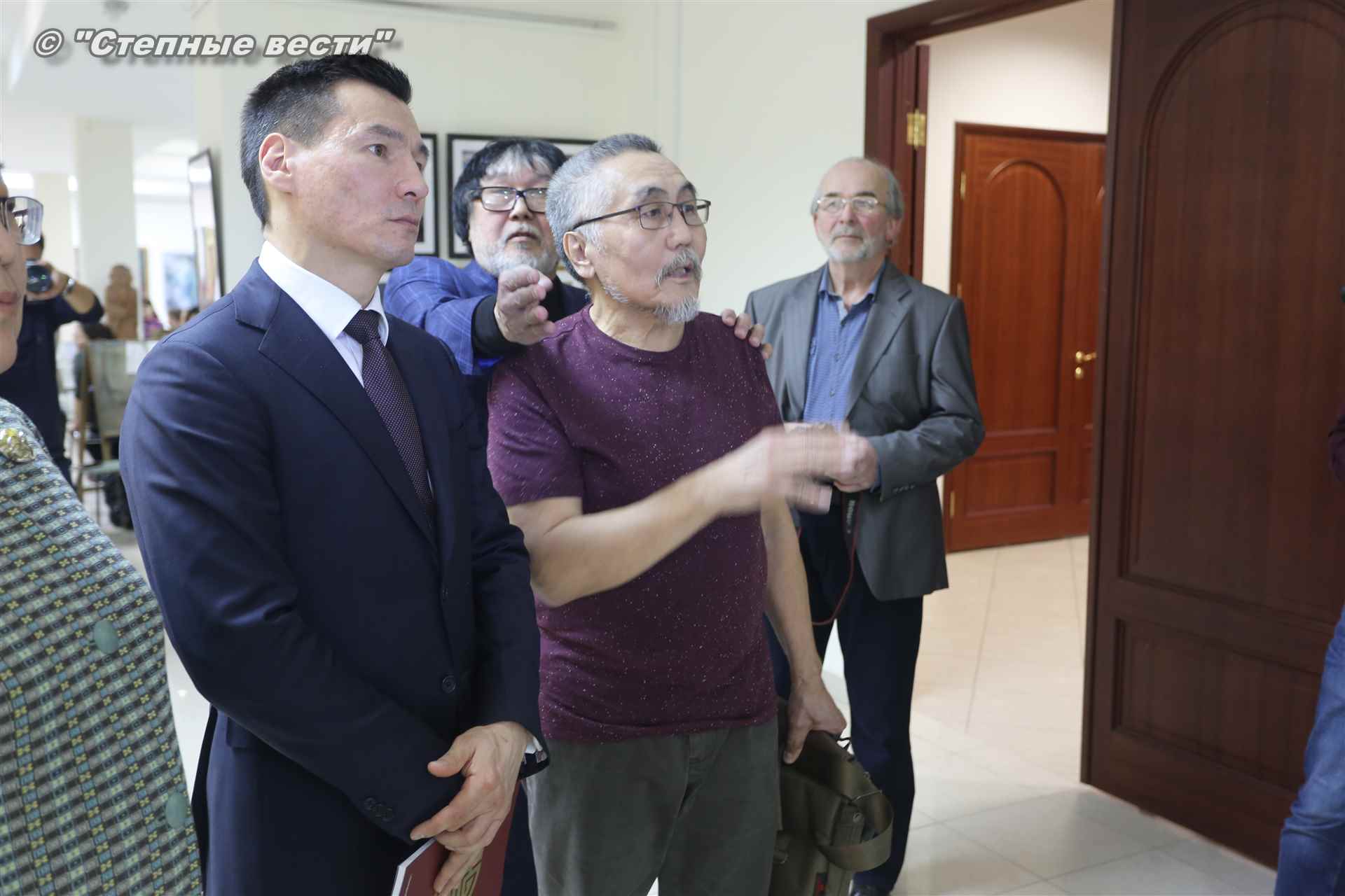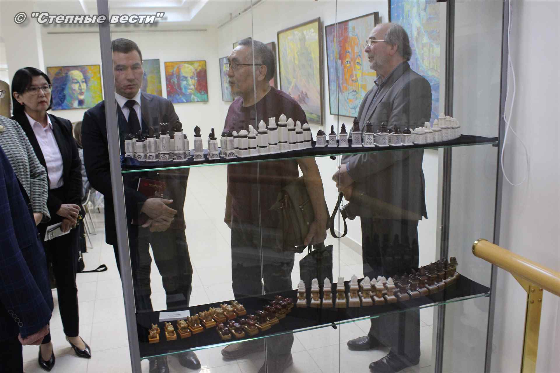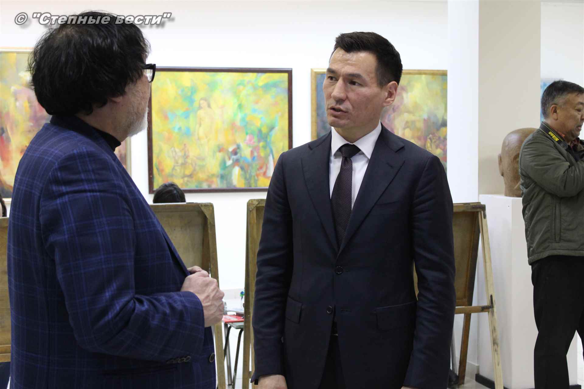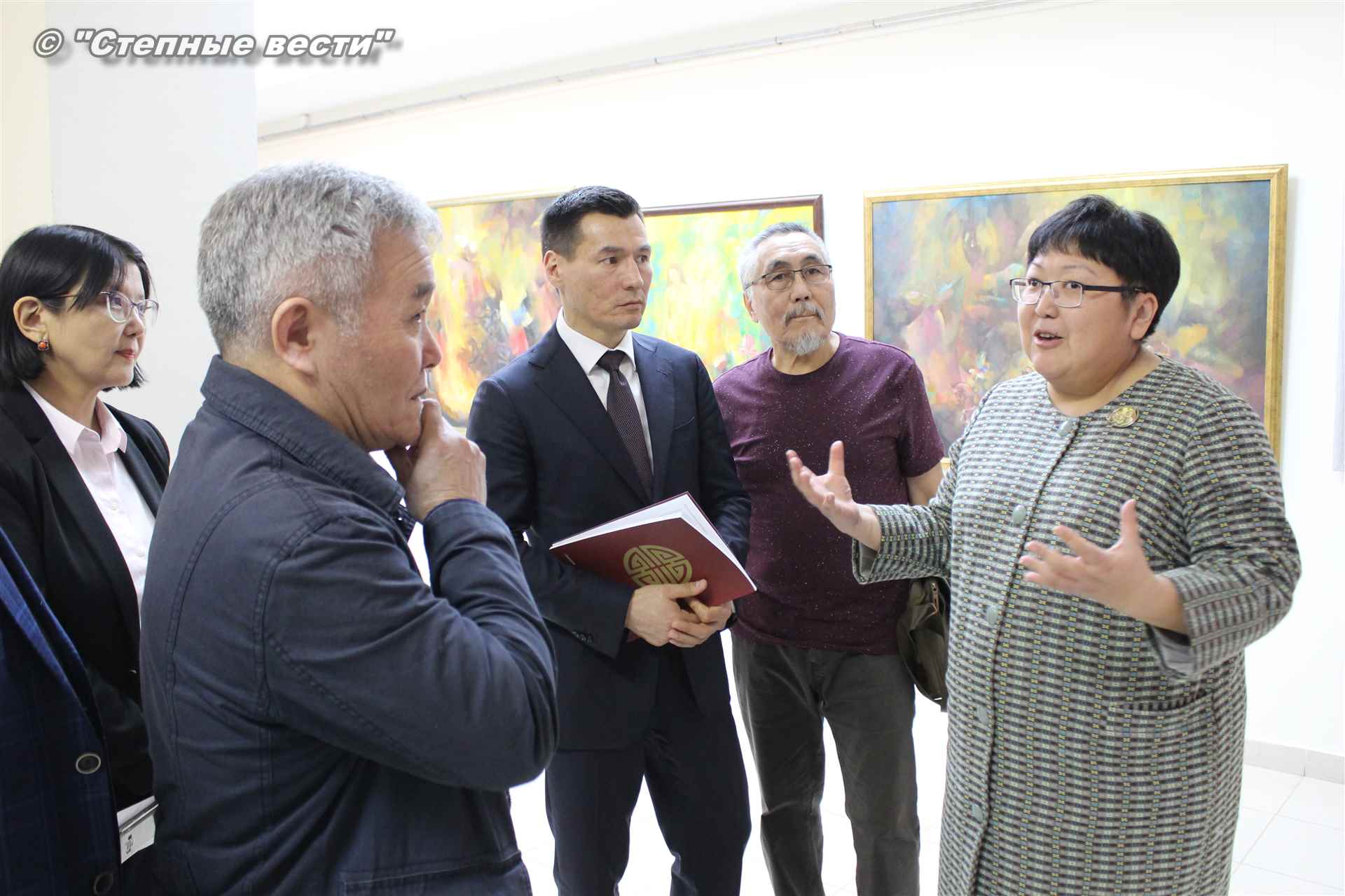 Далее  в сопровождении министра культуры и туризма РК Хонгора Эльбикова, директора музея Ирины Мучаевой и мастеров изобразительного искусства Бату Хасиков ознакомился с выставкой калмыцких художников творческой группы «Кочевники».