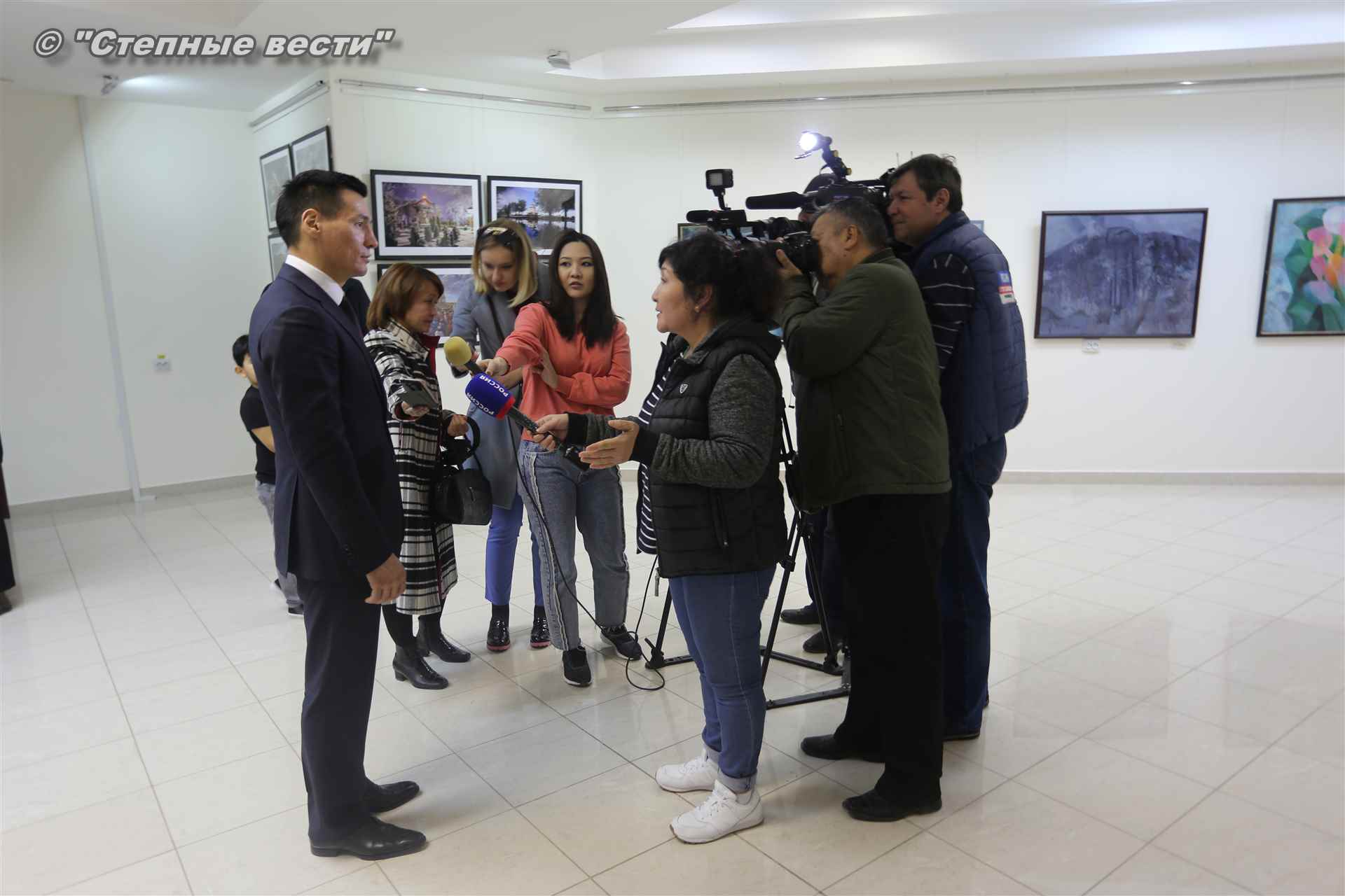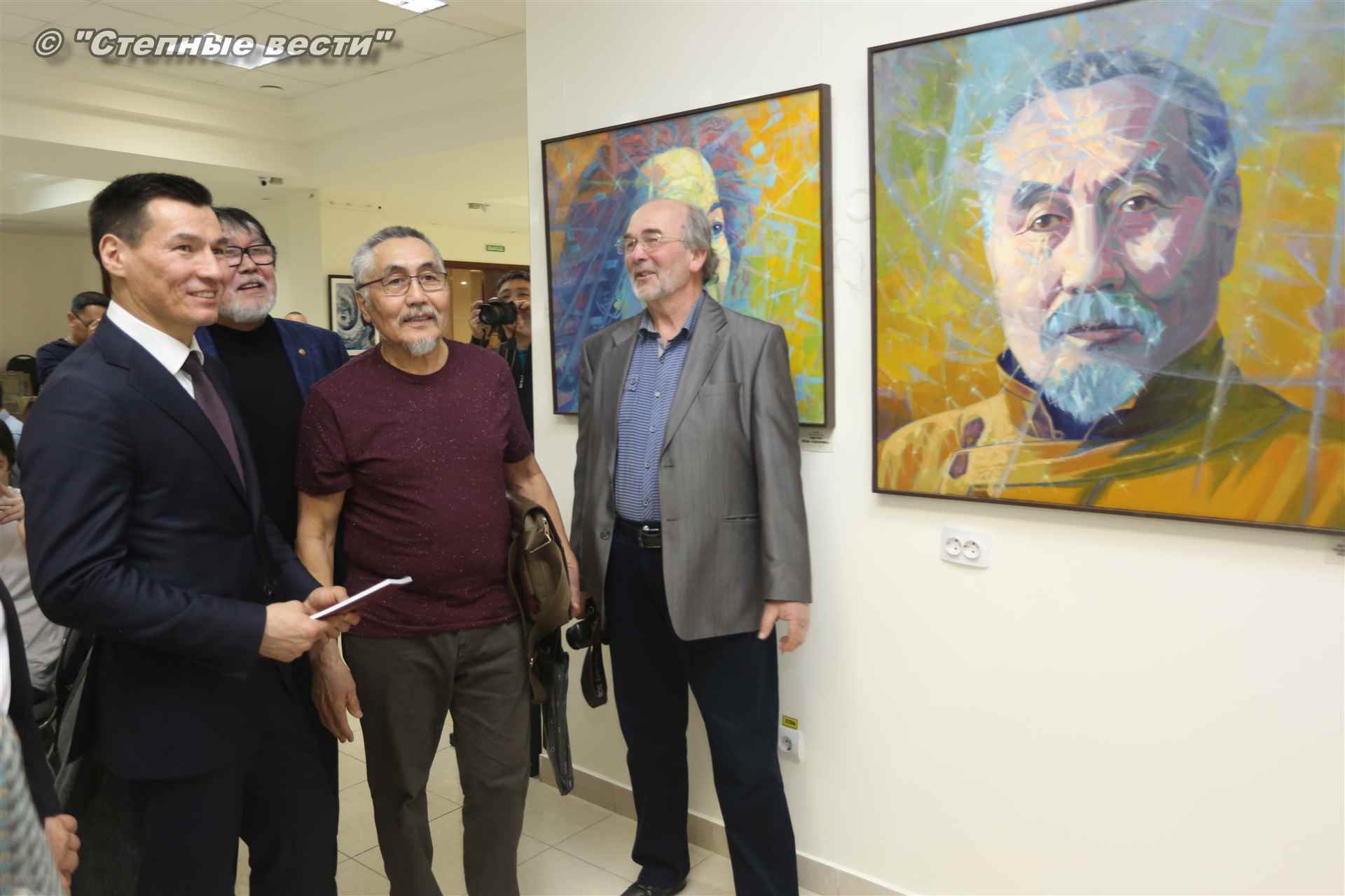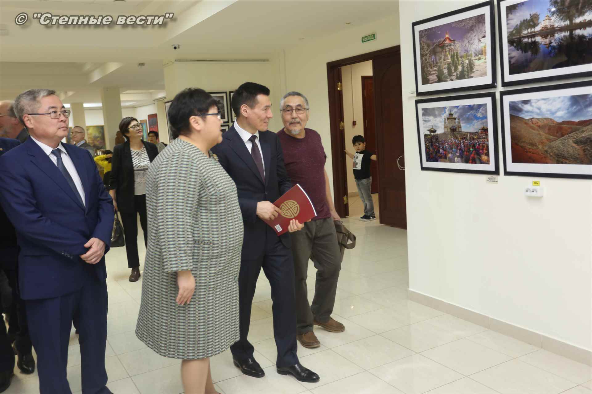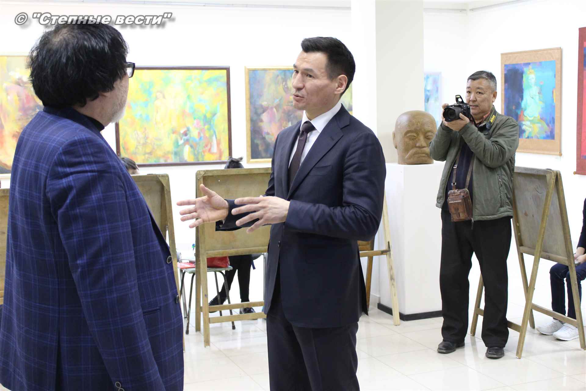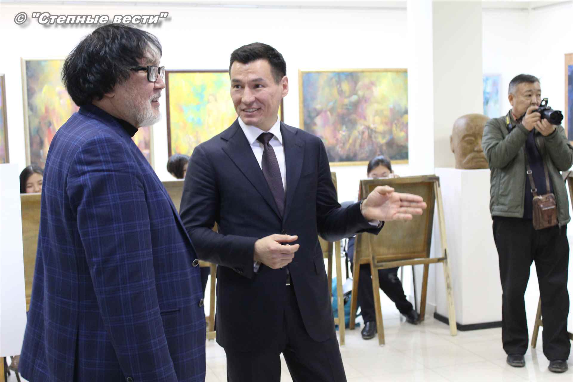 Далее  в сопровождении министра культуры и туризма РК Хонгора Эльбикова, директора музея Ирины Мучаевой и мастеров изобразительного искусства Бату Хасиков ознакомился с выставкой калмыцких художников творческой группы «Кочевники».