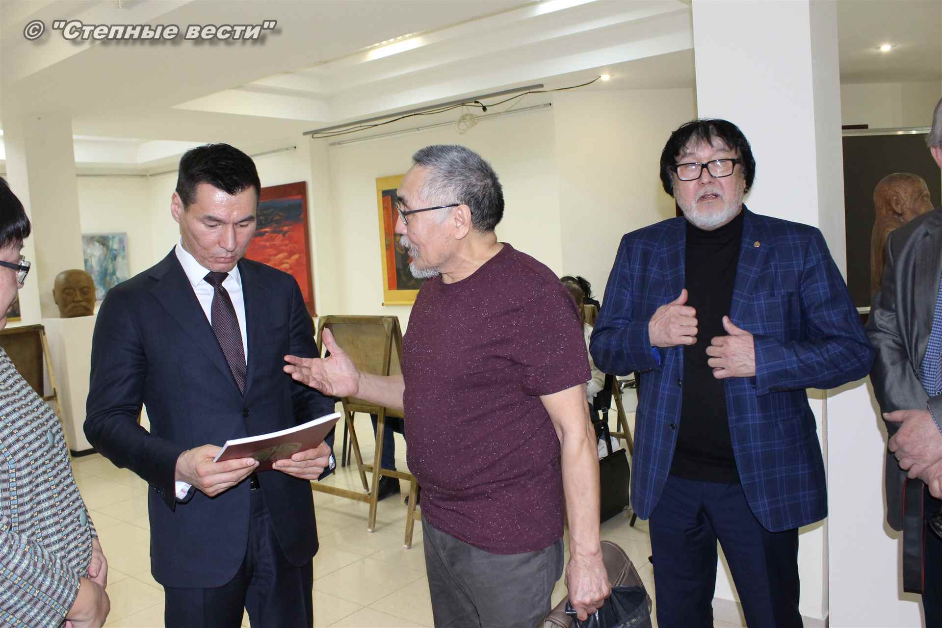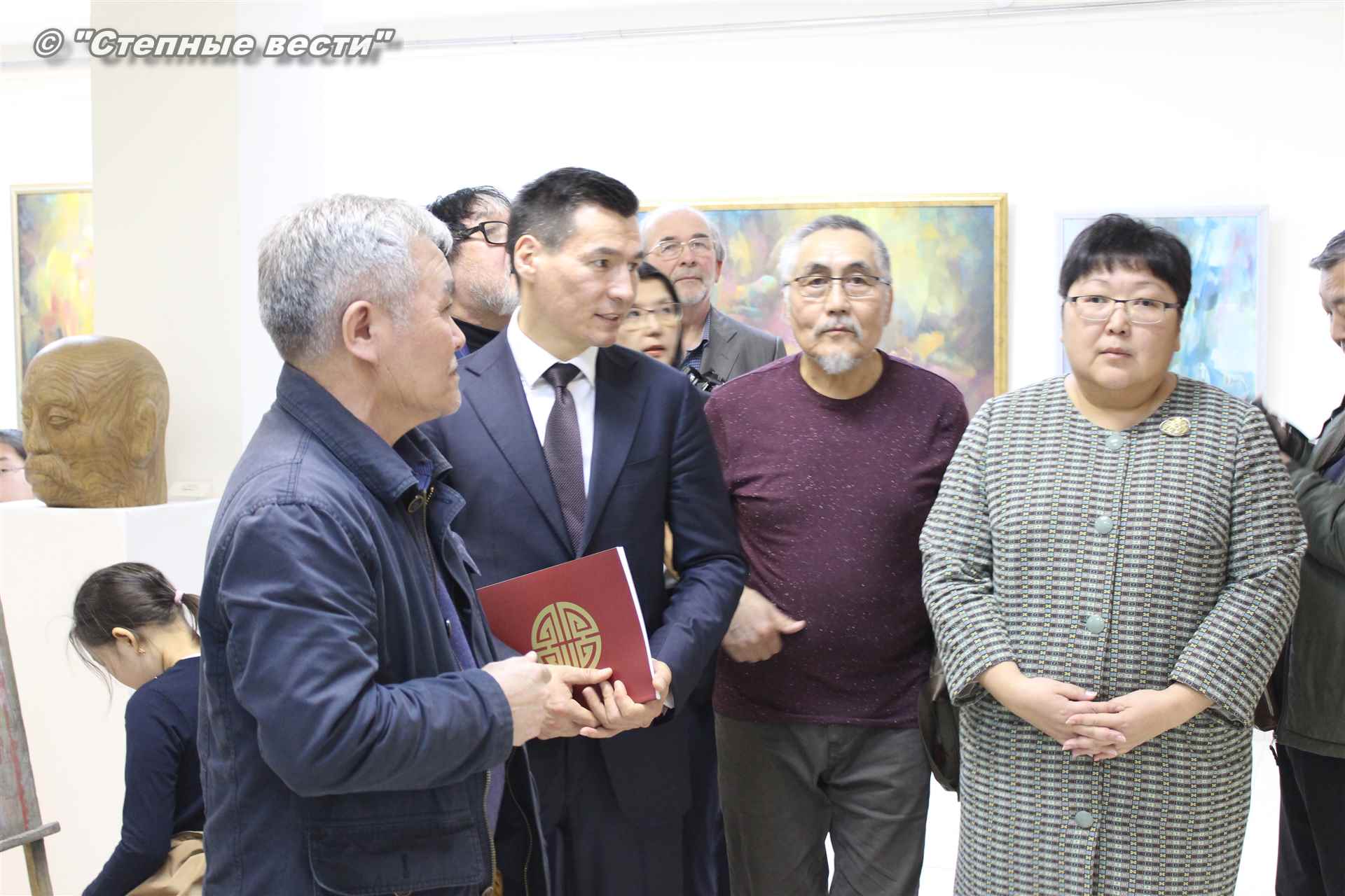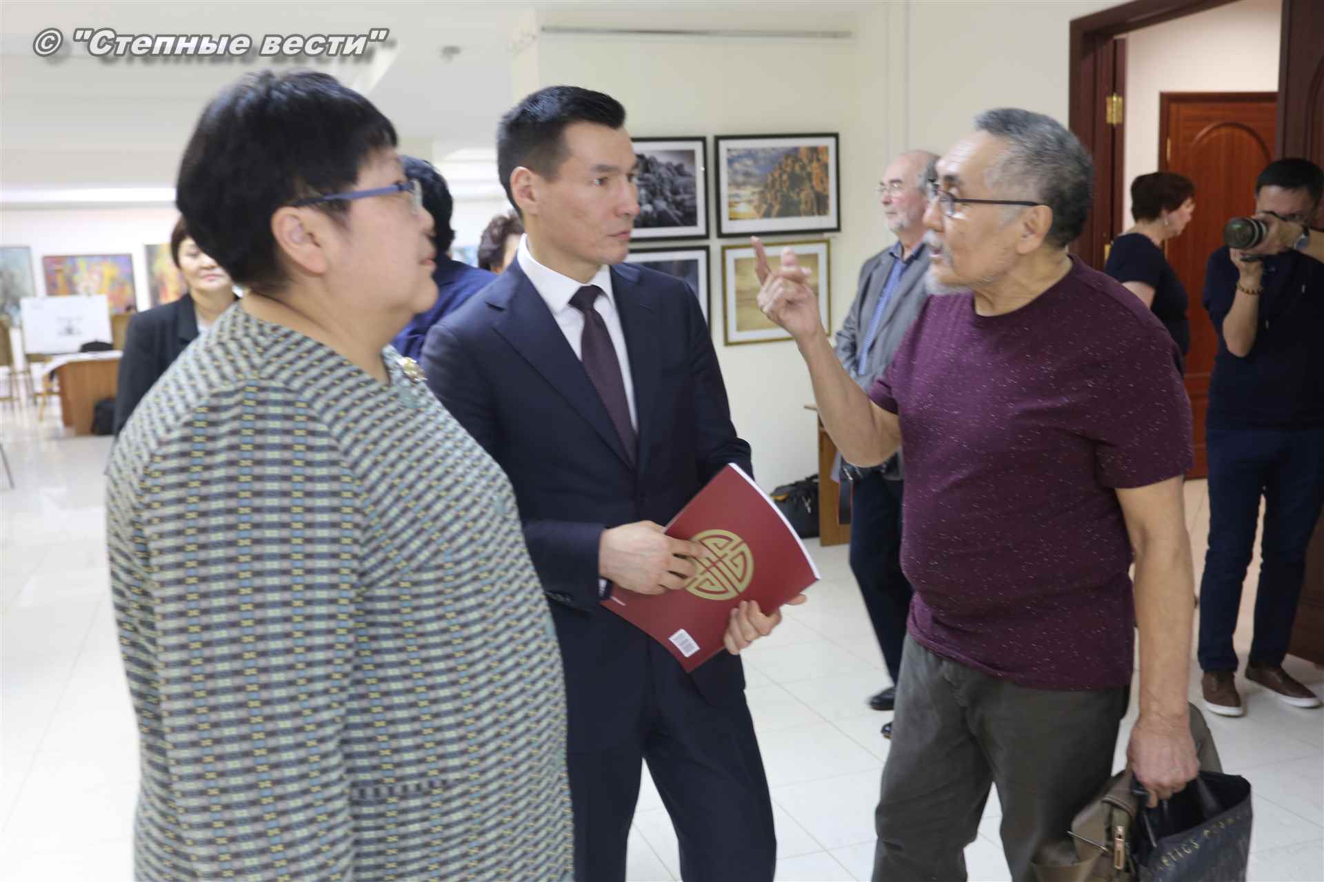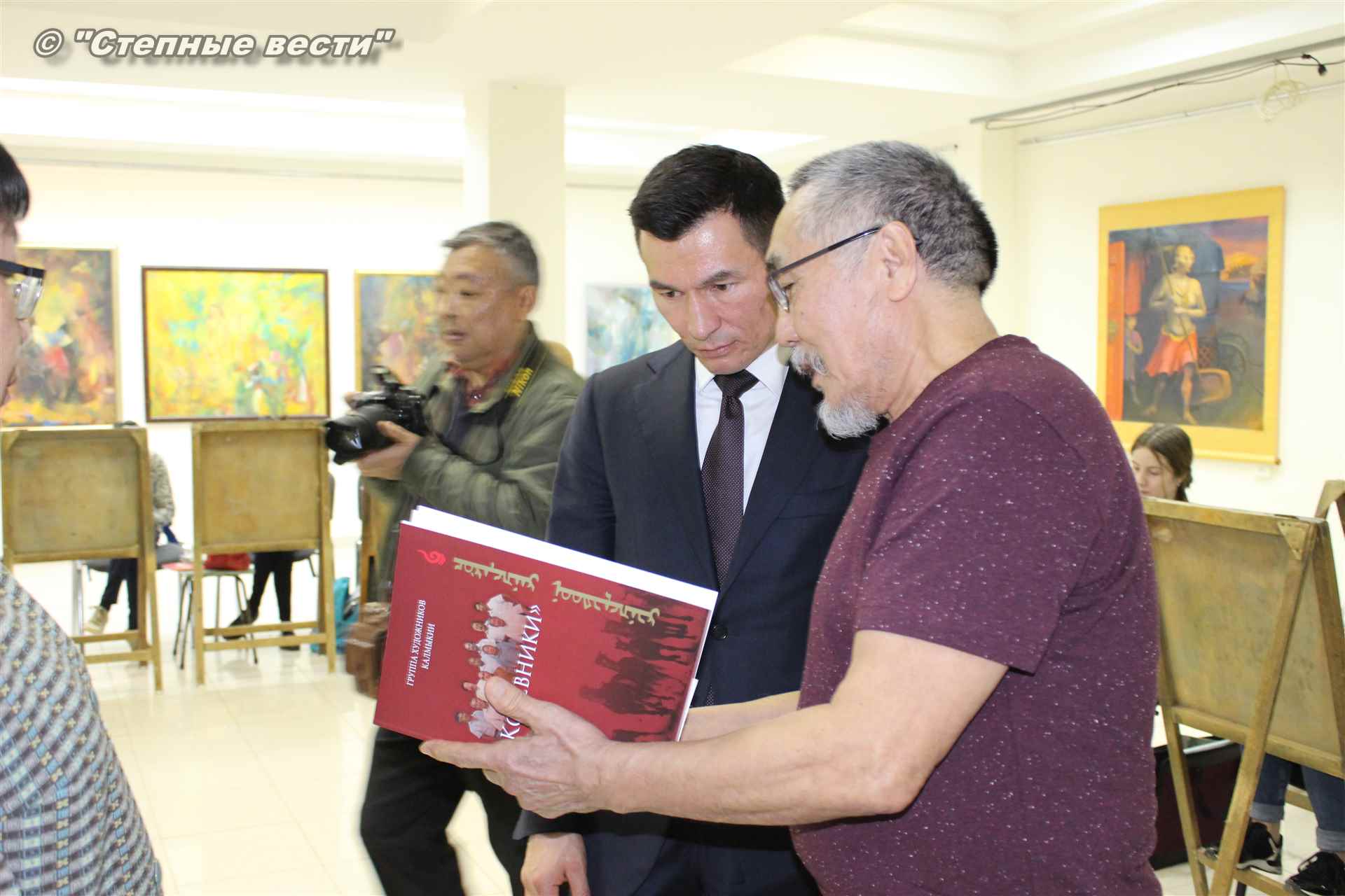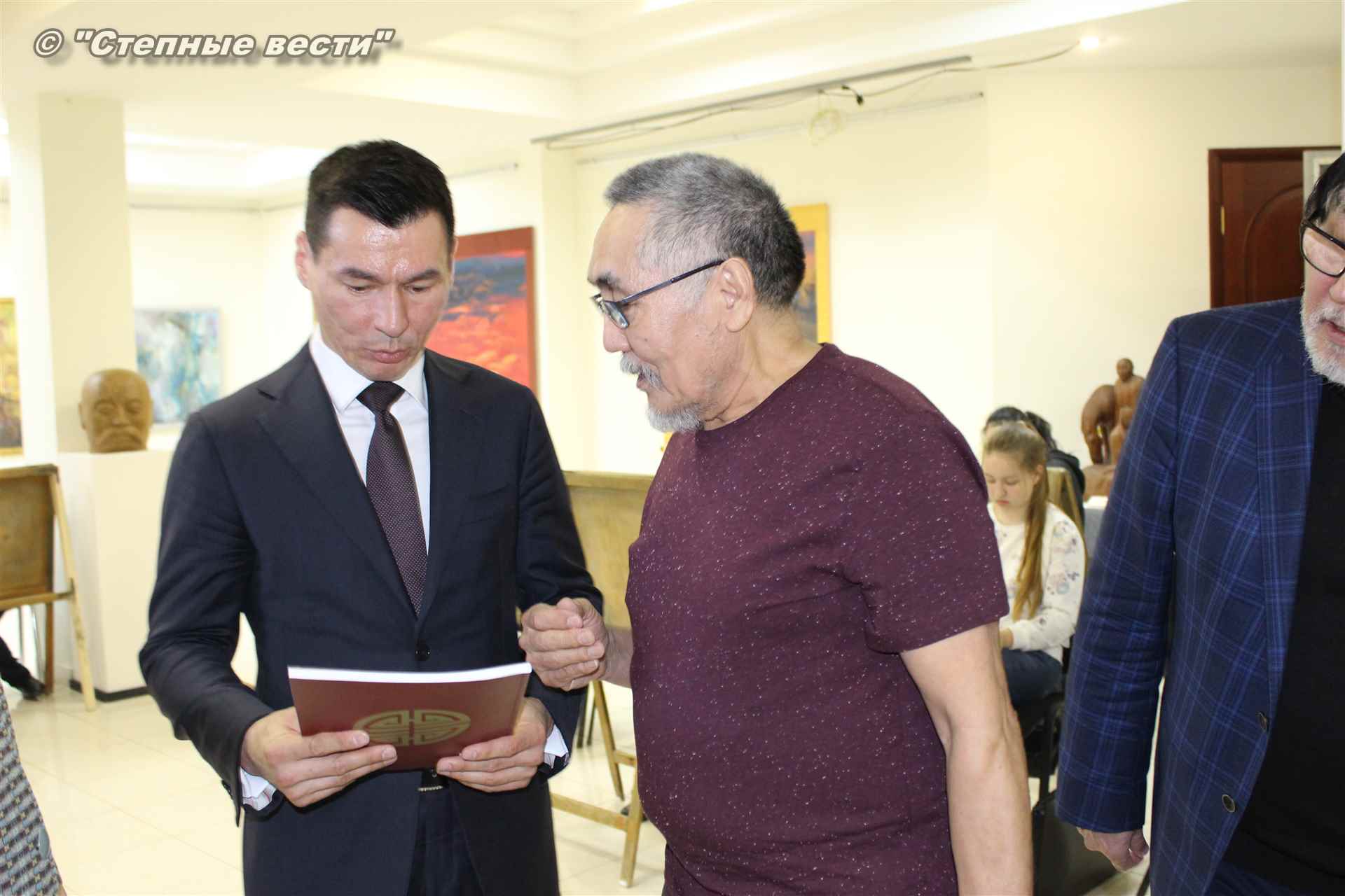 Во время мероприятия Бату Хасиков пообщался также с известным художником Николаем Шиняевым, который подарил гостю музея альбом группы «Кочевники», специально подготовленный к открытию выставки.
