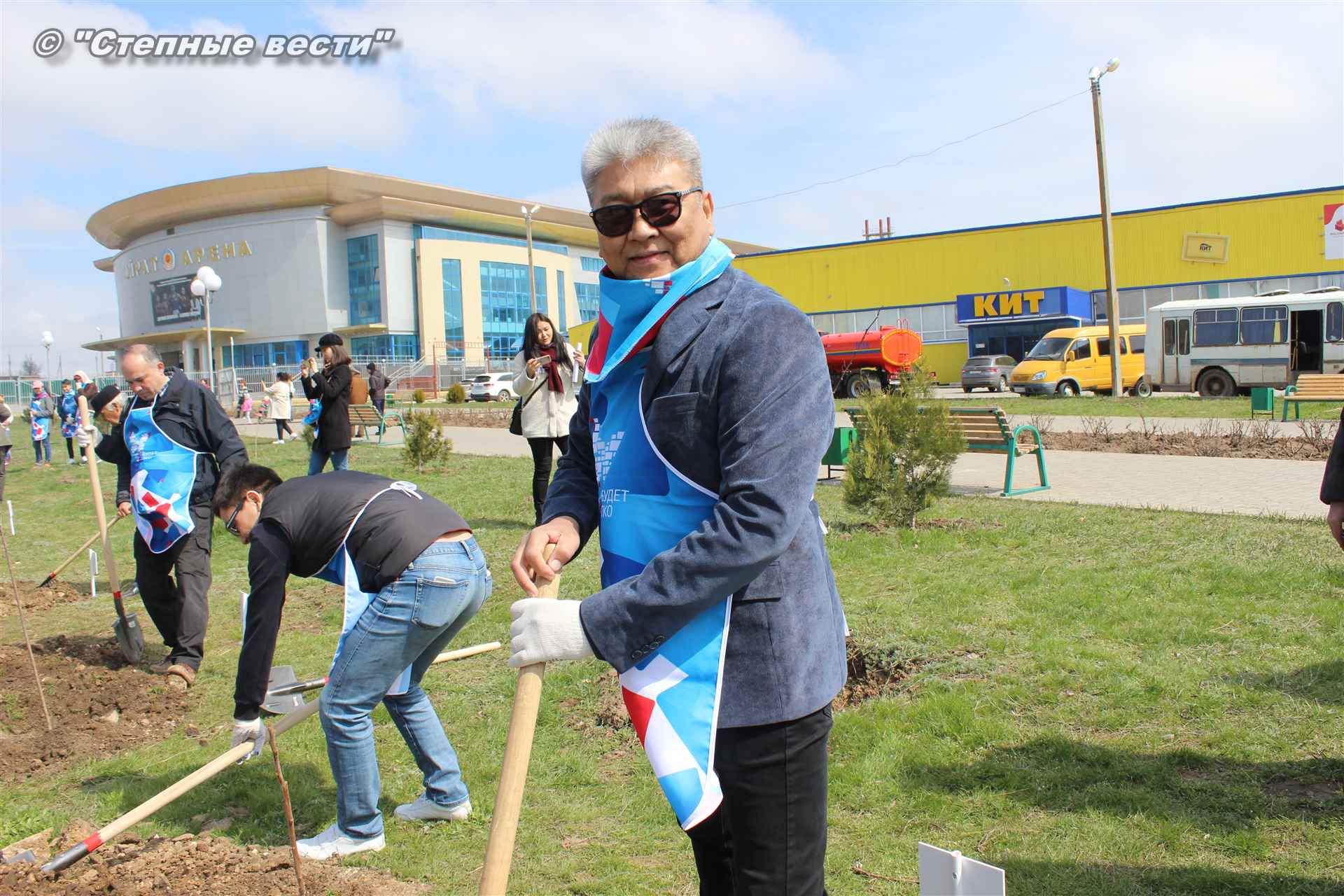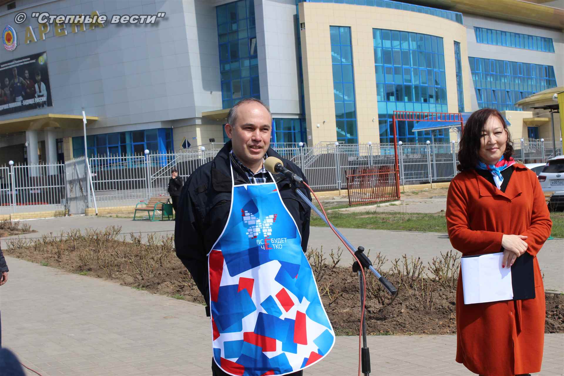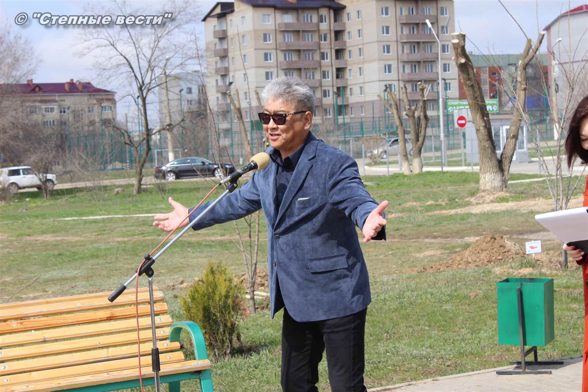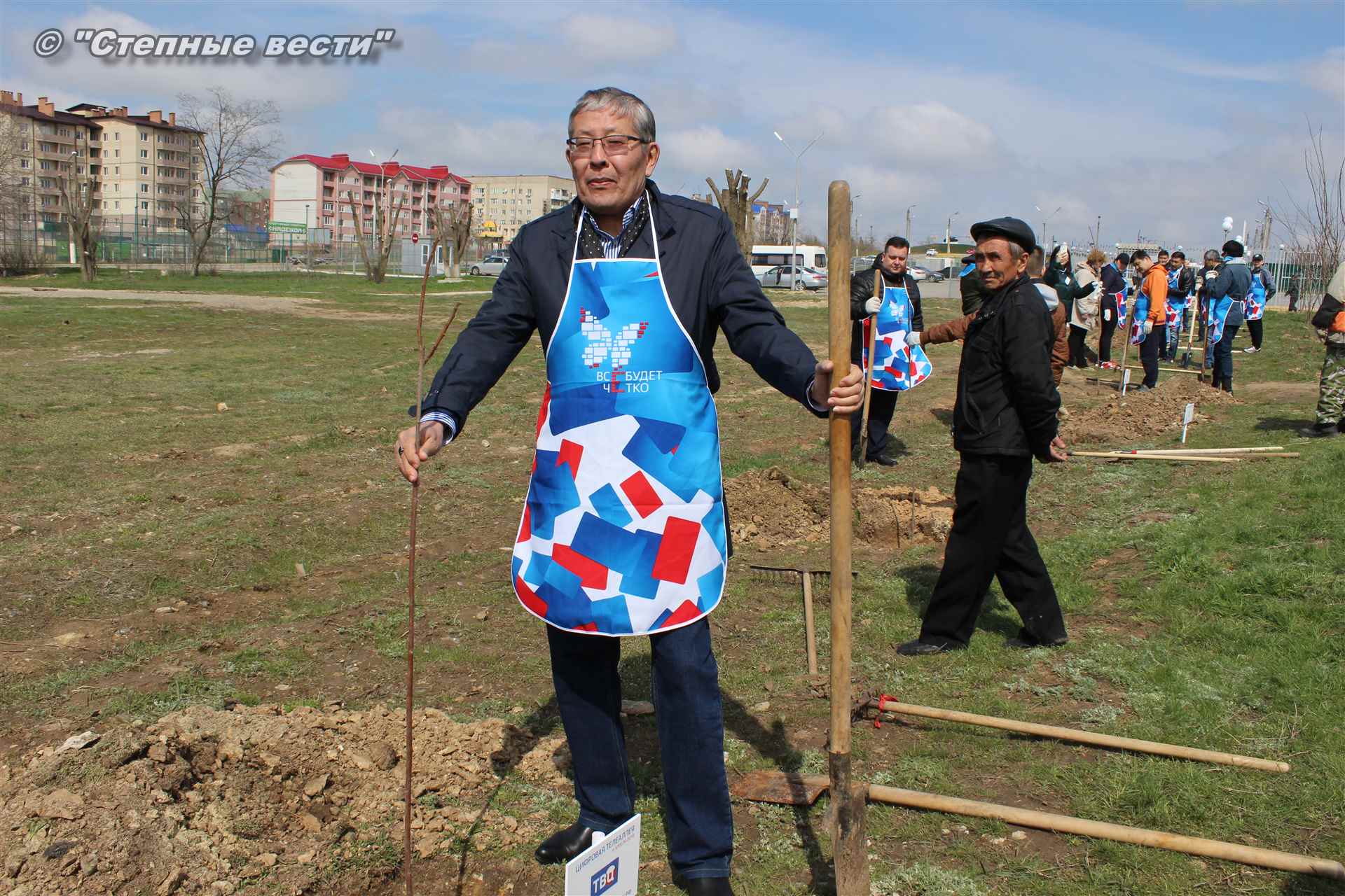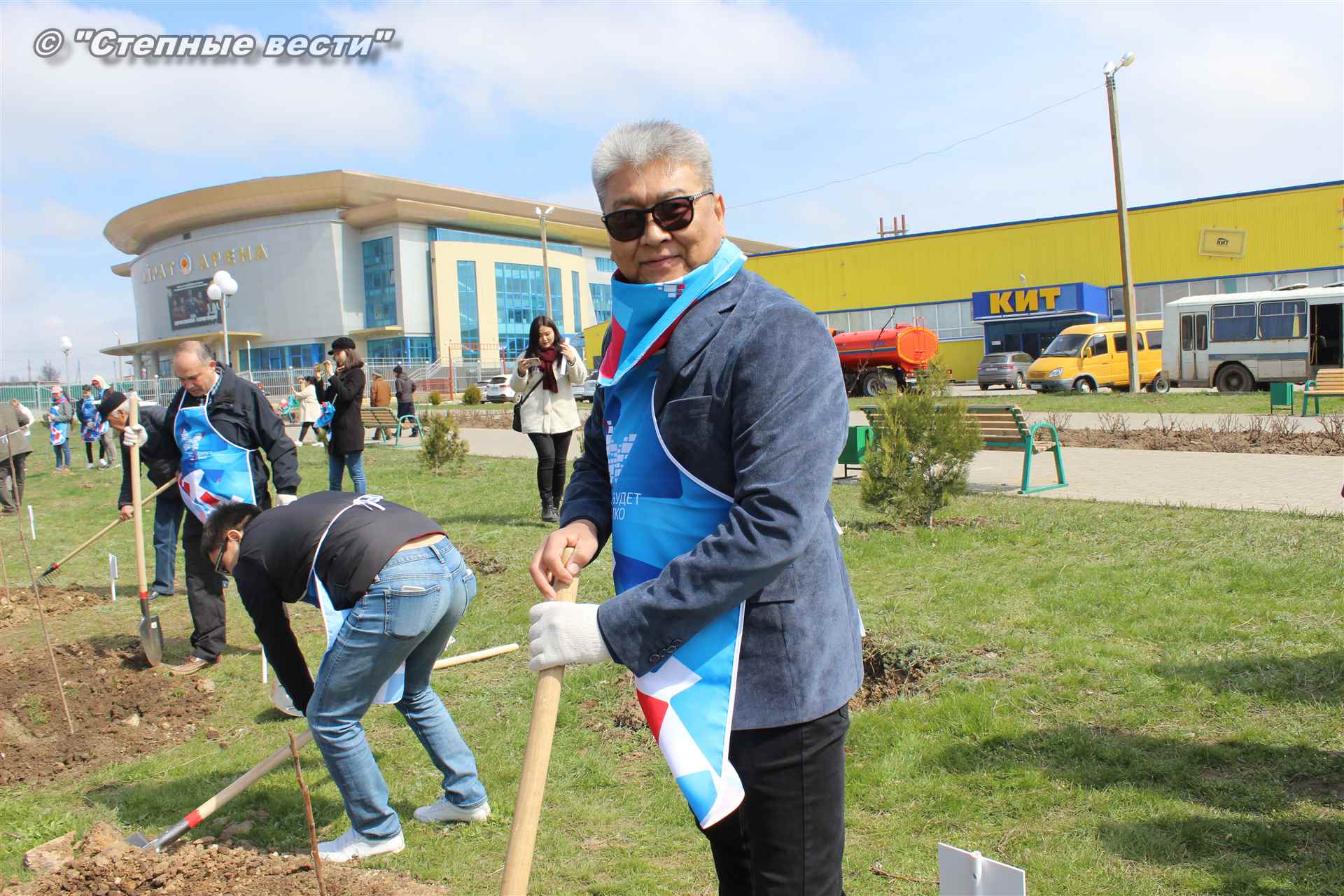 Вместе с остальными почетными гостями, сотрудниками министерства, волонтерами Аркадий Манджиев поучаствовал в озеленении Элисты.