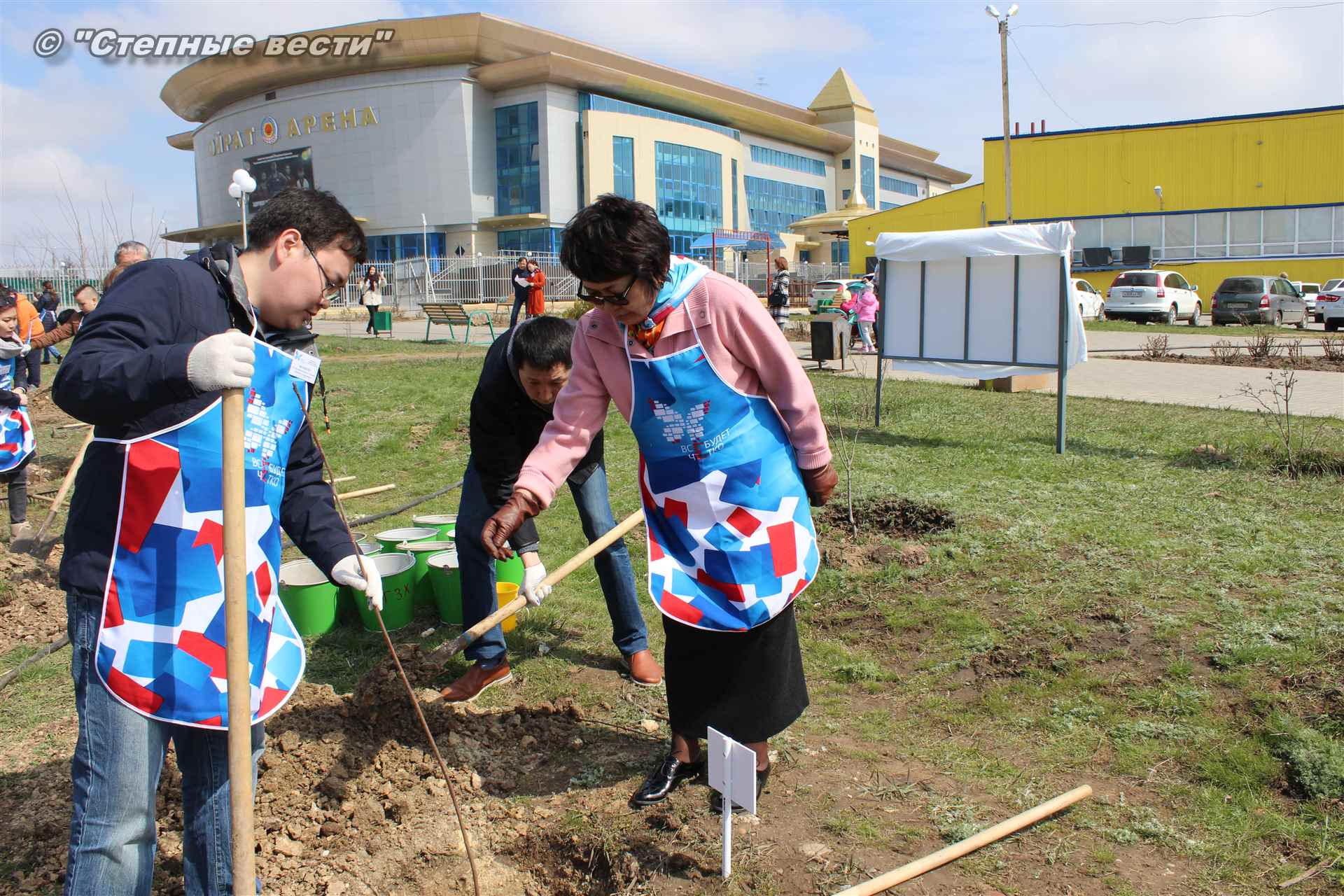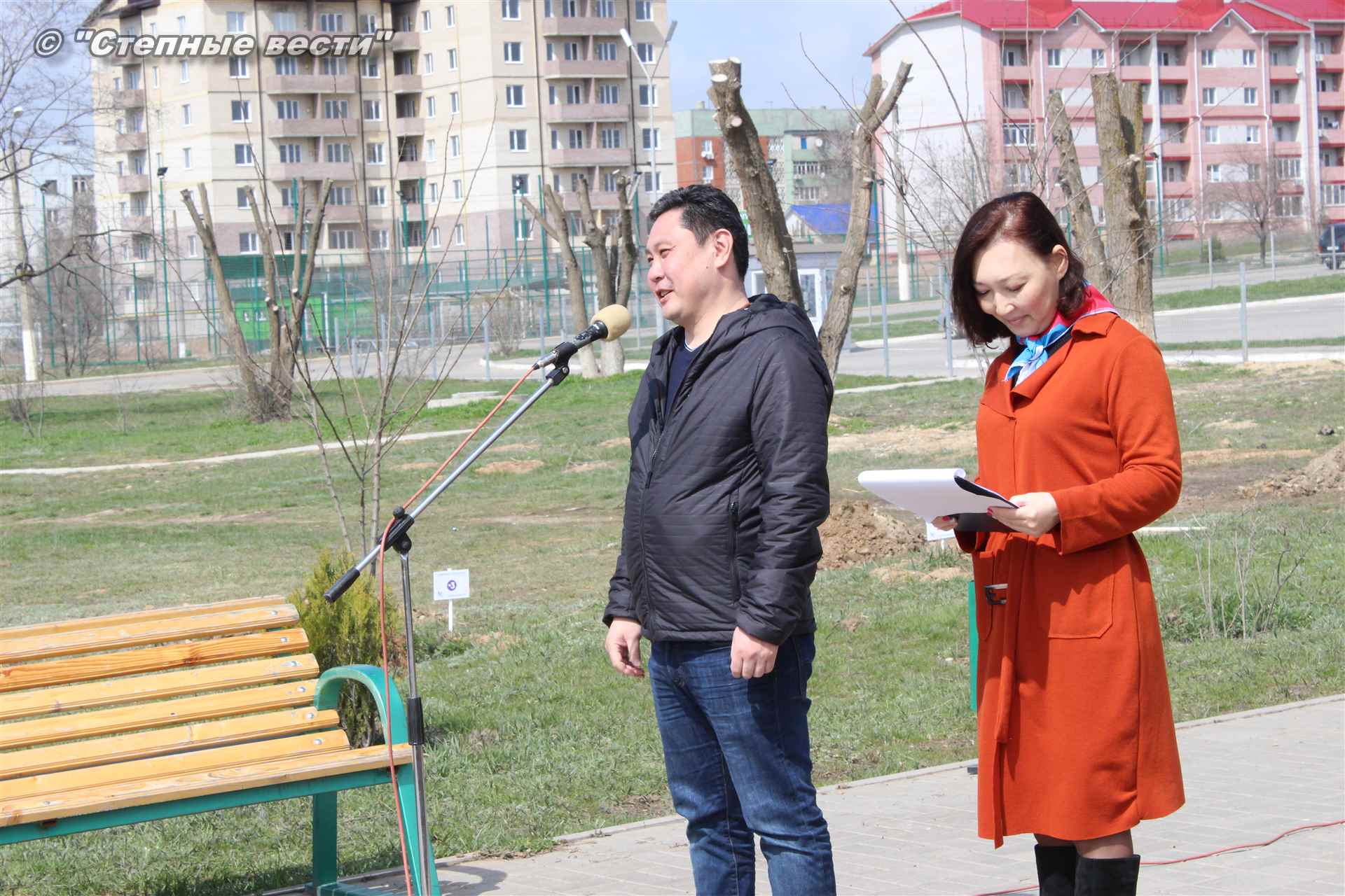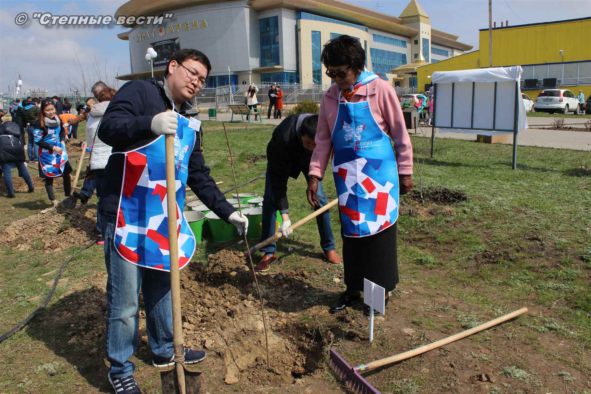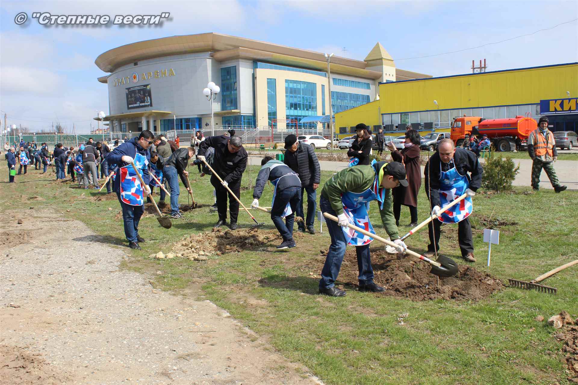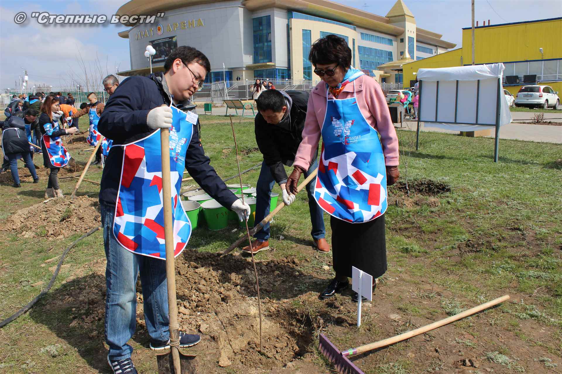 Вместе с остальными почетными гостями, сотрудниками министерства, волонтерами Аркадий Манджиев поучаствовал в озеленении Элисты.