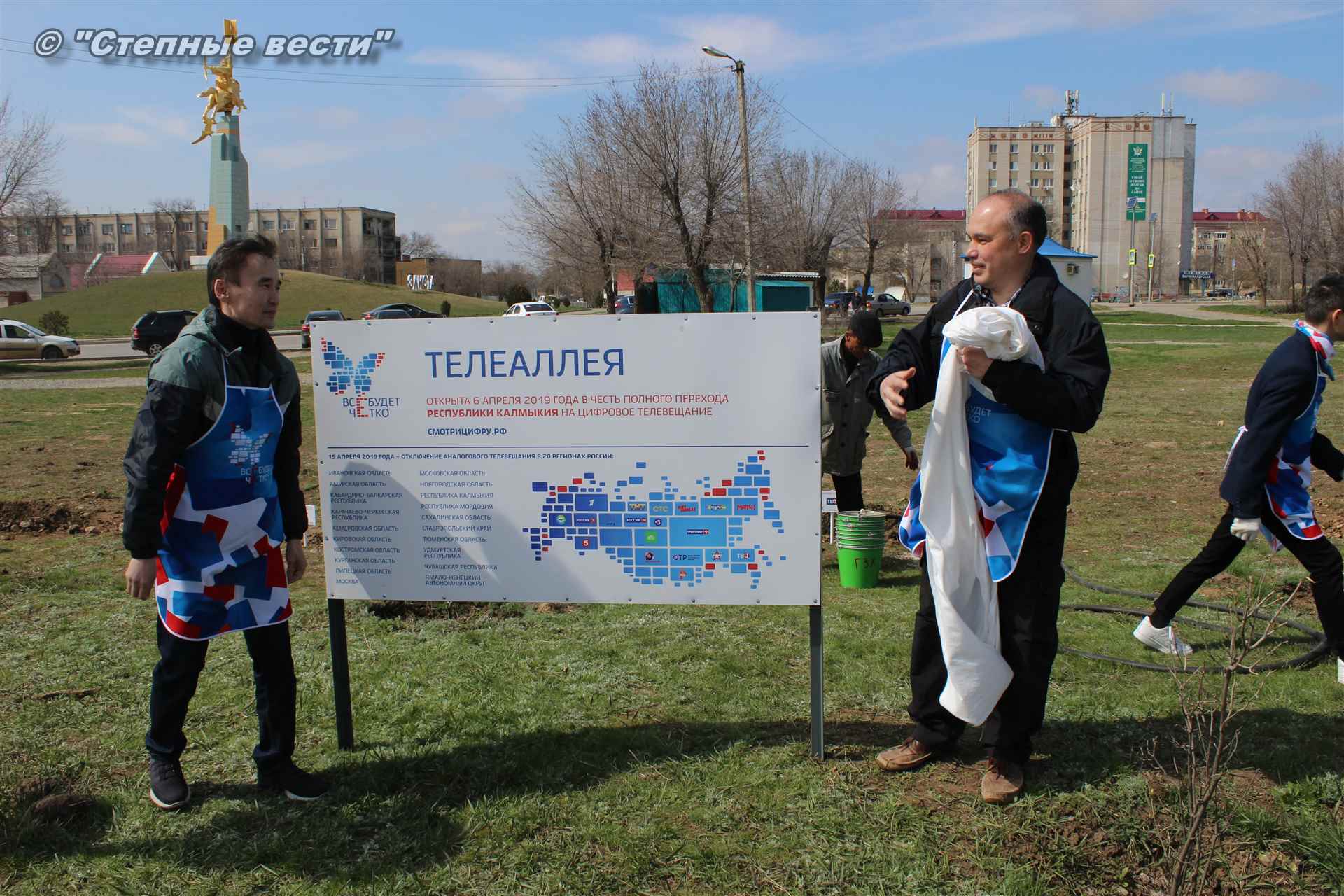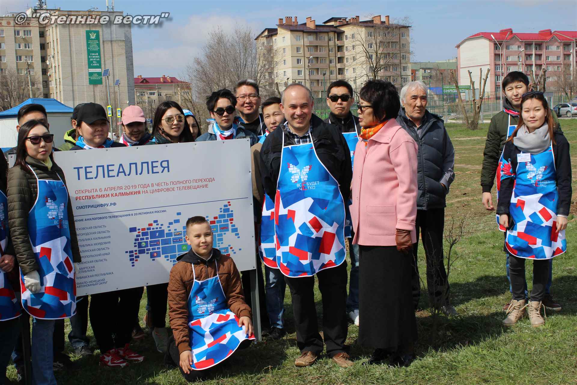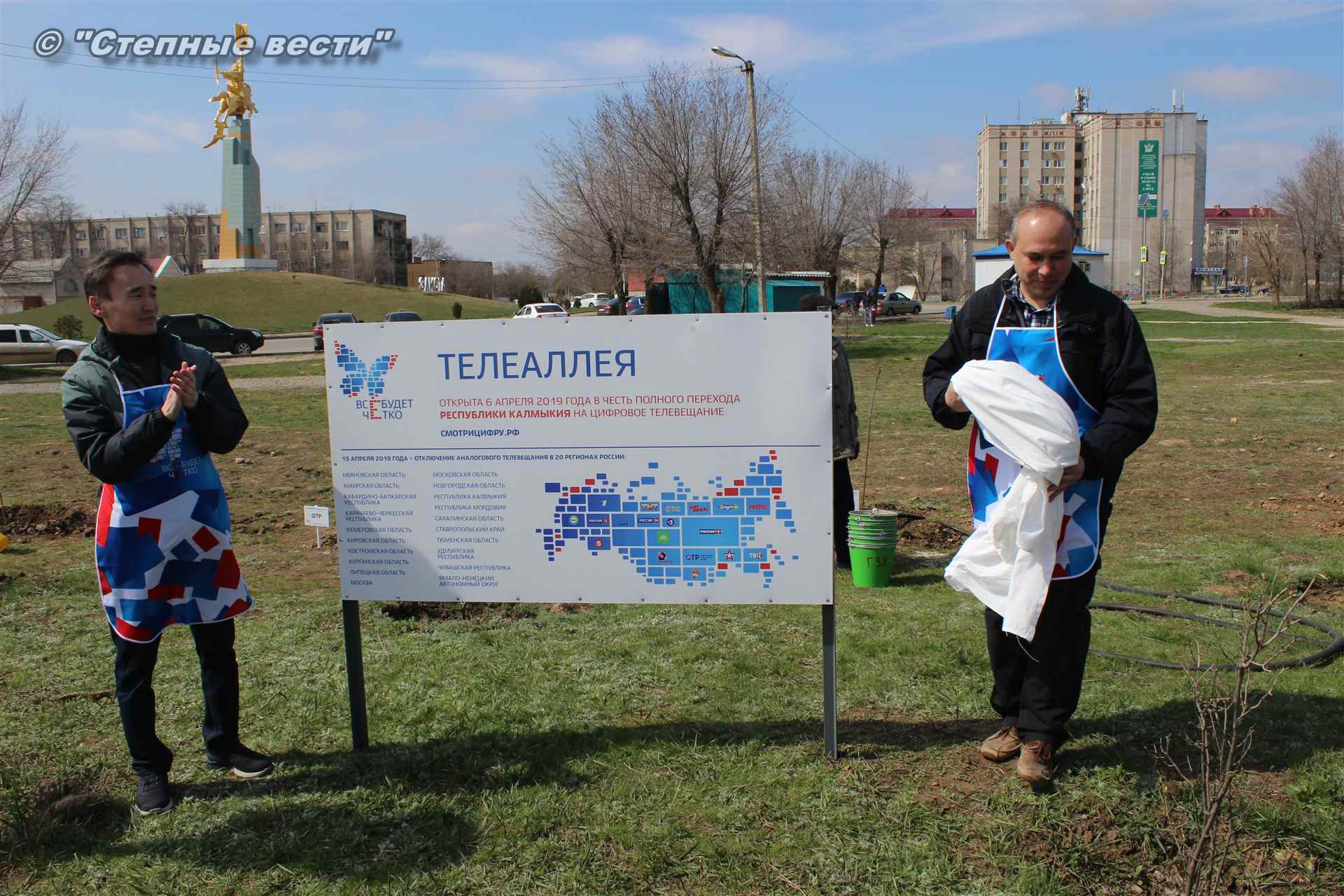 Сотрудники Министерства цифрового развития РК, волонтеры и почетные гости мероприятия высадили деревца в рамках всероссийской акции «Телеаллея». 20 деревьев символизируют 20 телеканалов двух мультиплексов, которые с 15 апреля жители Калмыкии смогут смотреть в цифровом качестве.