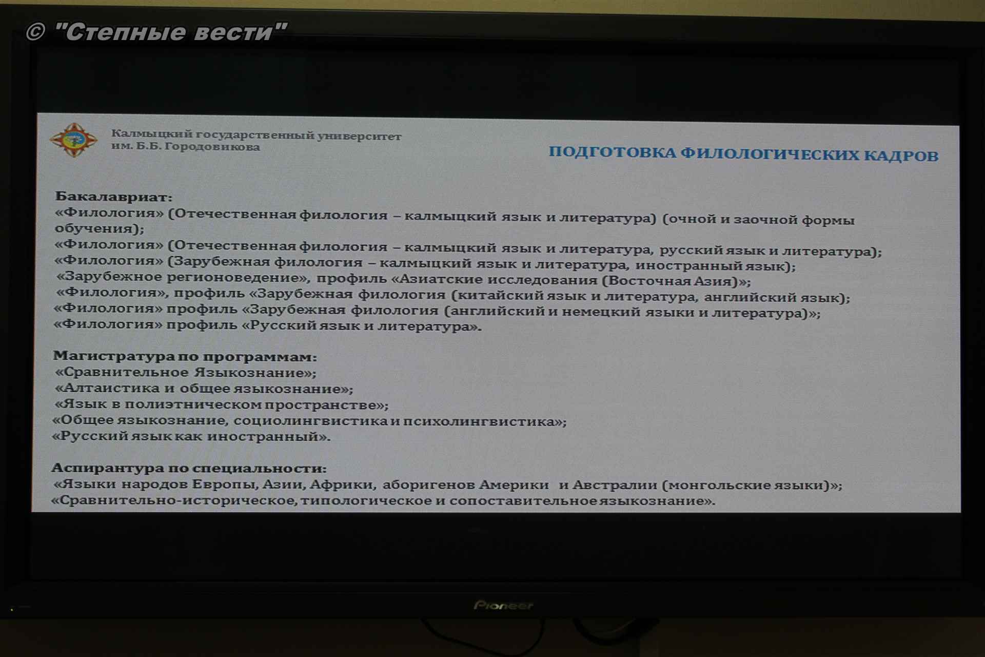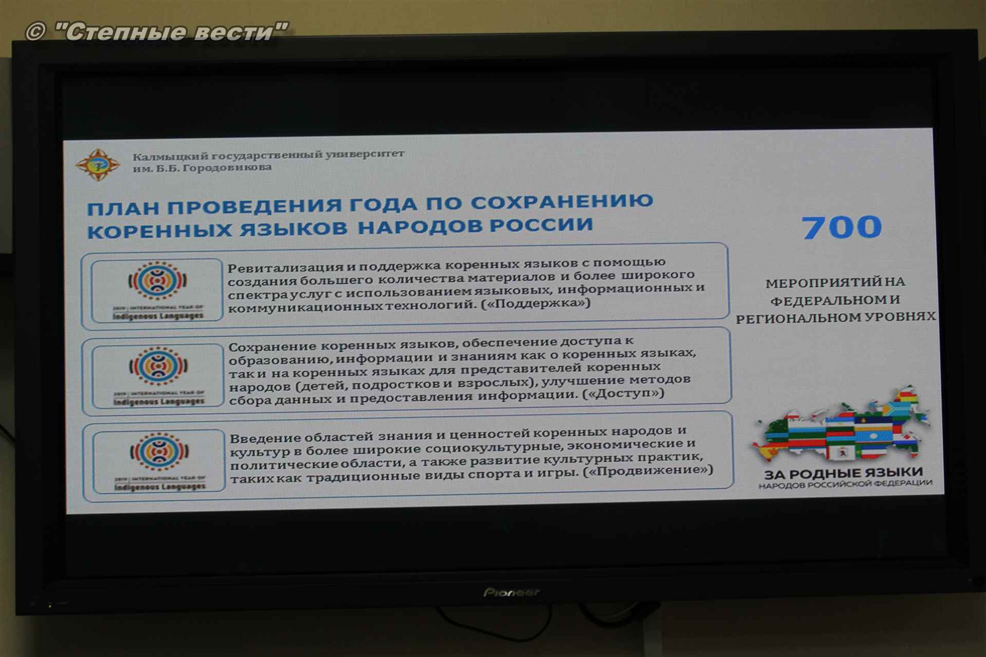Из докладов ректора КалмГУ Бадмы Салаева и министра образования и науки РК Николая Манцаева участники мероприятия узнали о комплексном подходе к решению проблем, связанных с преподаванием калмыцкого языка и подготовки учительских кадров, а также о различных мероприятиях, проводимых на протяжении ряда лет в Калмыкии в целях изучения родного языка и этнокультурного воспитания в школах республики.