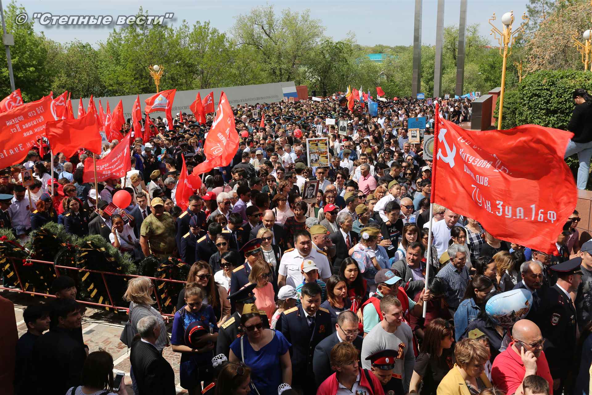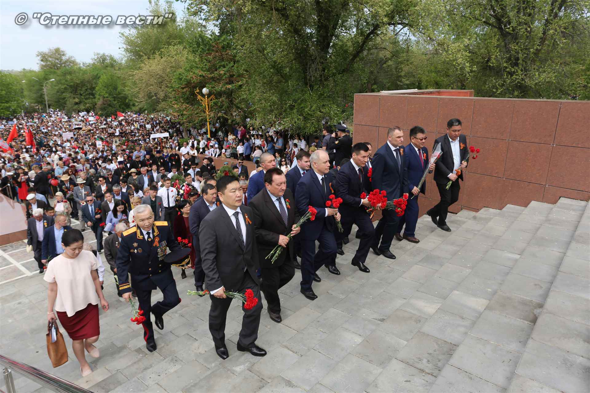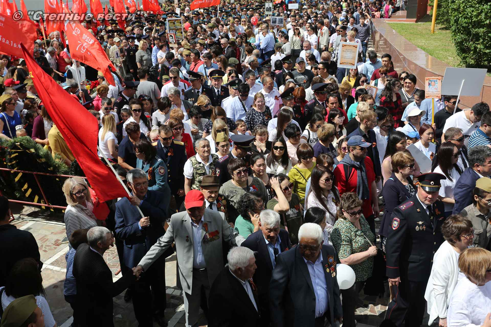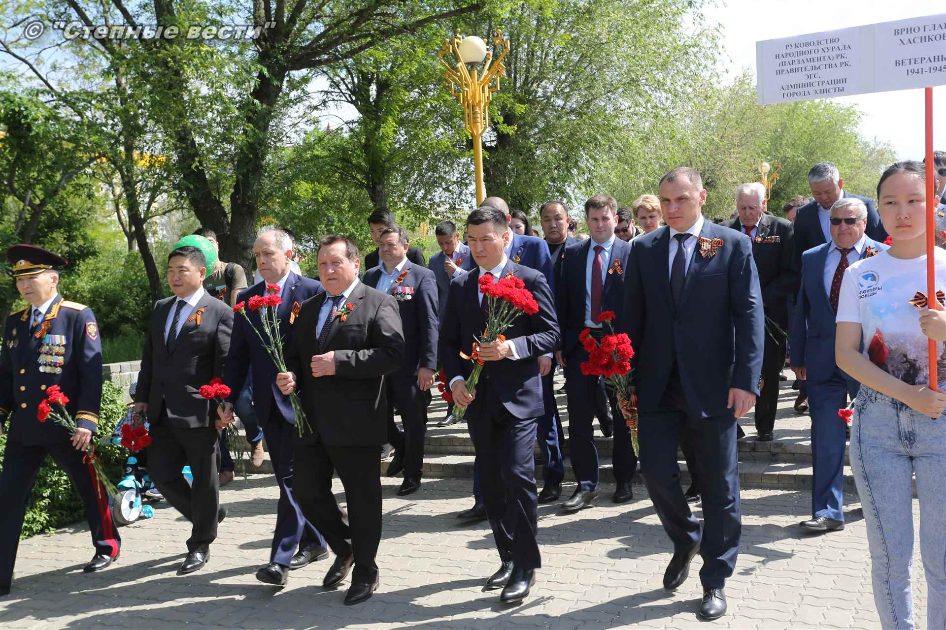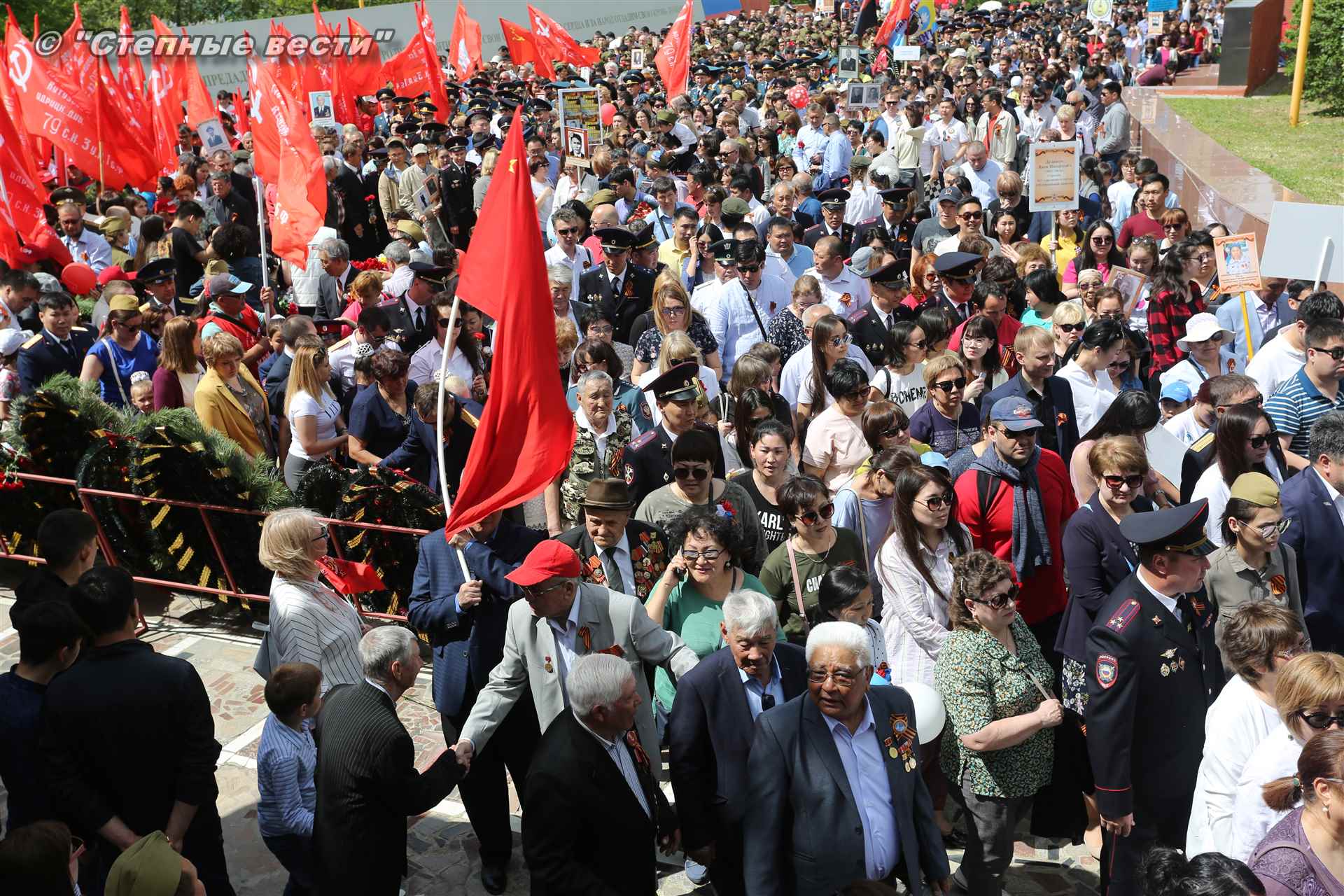 Шествие началось с построения колонн на центральной площади города вокруг Пагоды семи дней. Процессия, состоящая из нескольких сотен жителей Элисты, двинулась вдоль Аллеи Героев к памятнику Б. Городовикова и Героям Советского Союза, у подножия которых люди возложили венки и цветы землякам-героям войны. Далее у мемориального комплекса героев Гражданской и Великой Отечественной войн состоялся торжественный митинг. Открыл его песней «День победы» сводный хор учащихся школ Элисты под управлением заслуженной артистки РК Натальи Дукмановой.