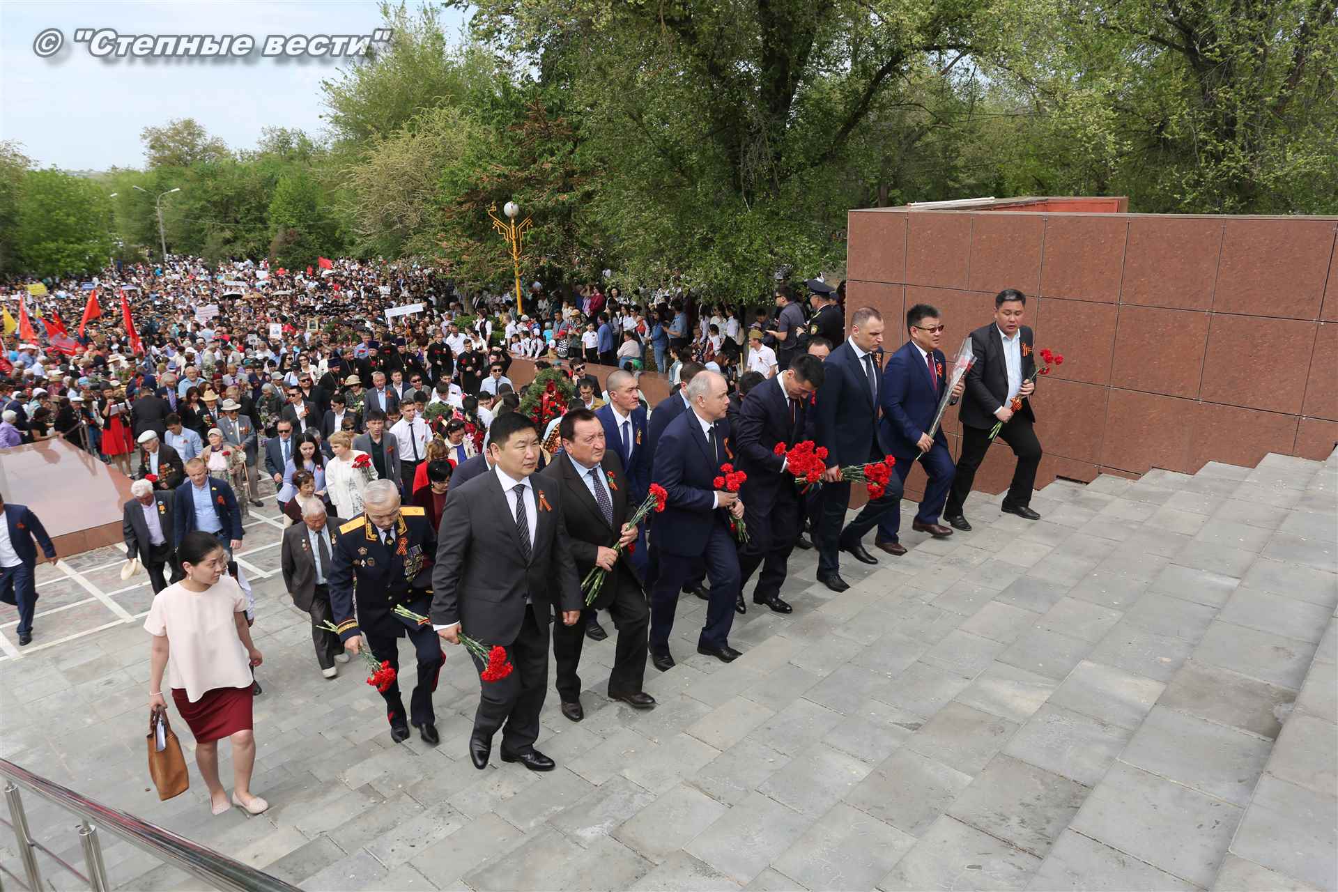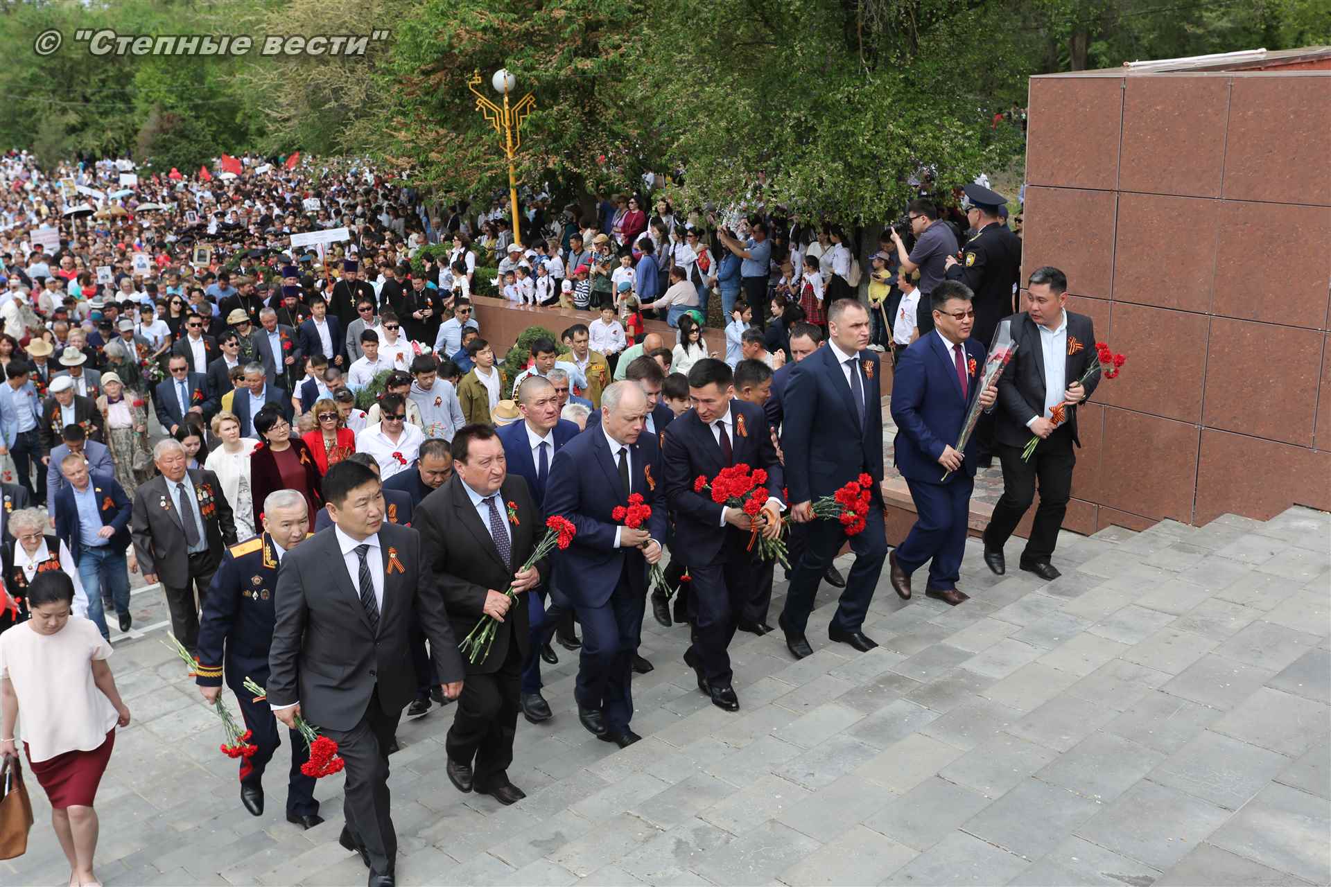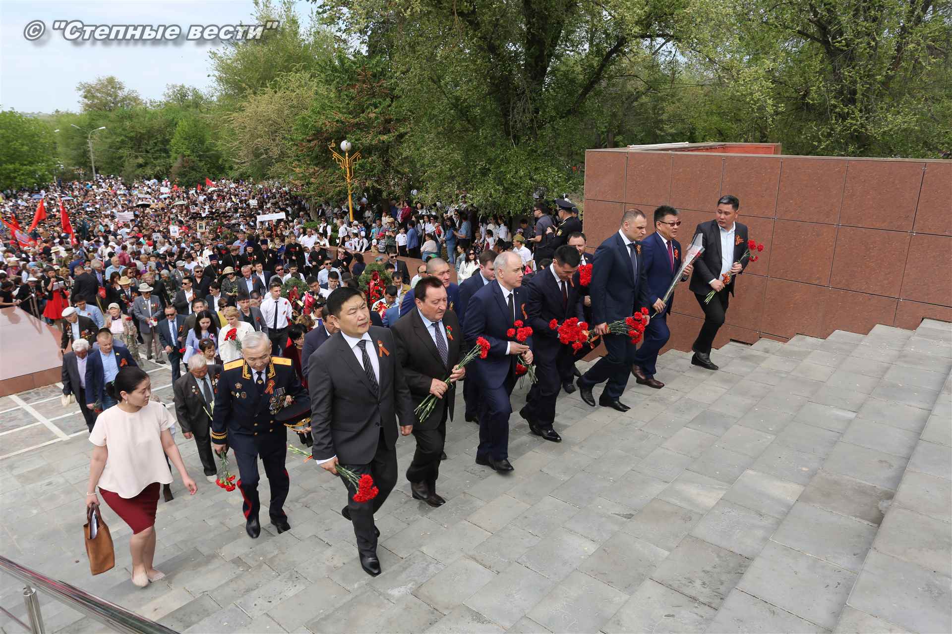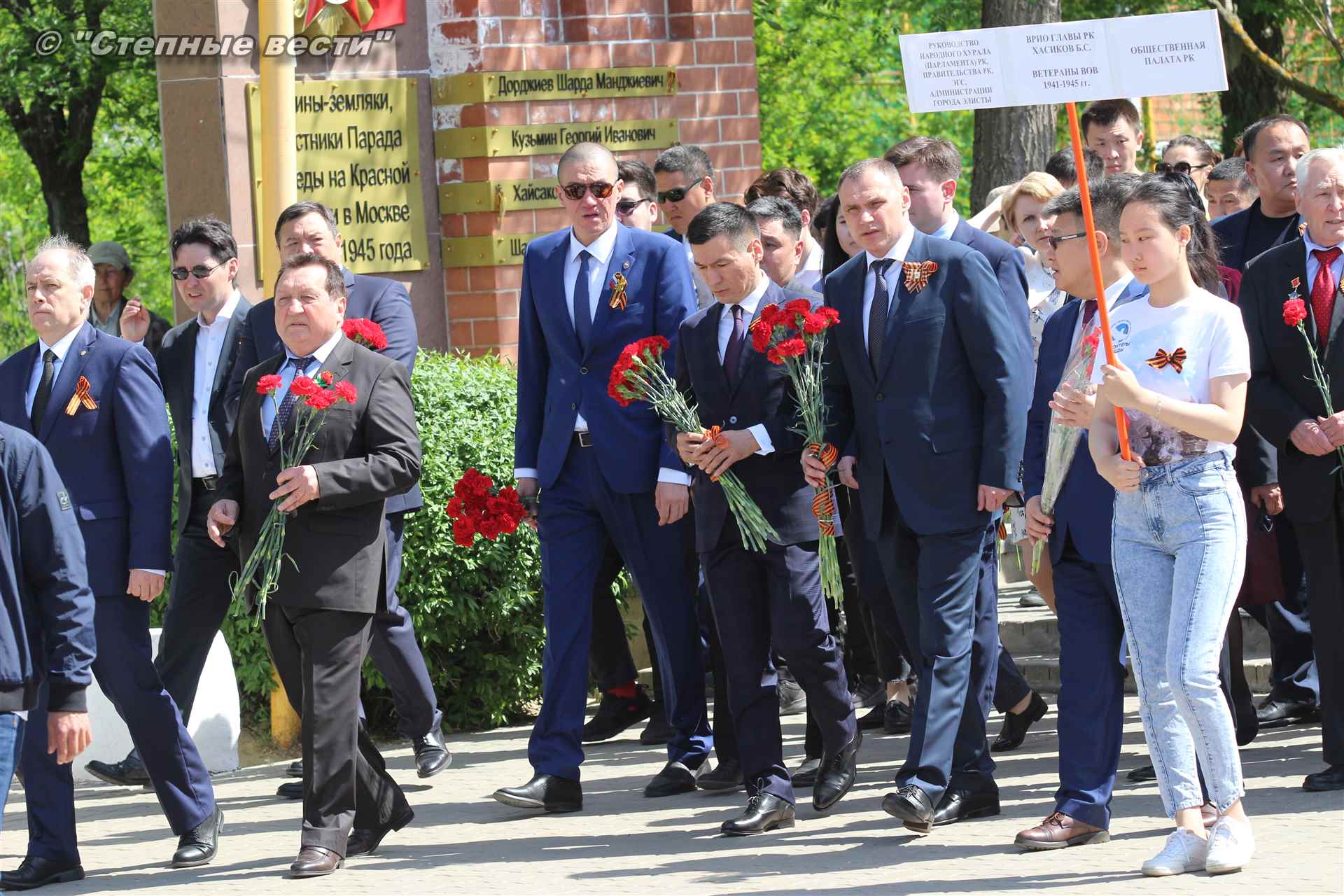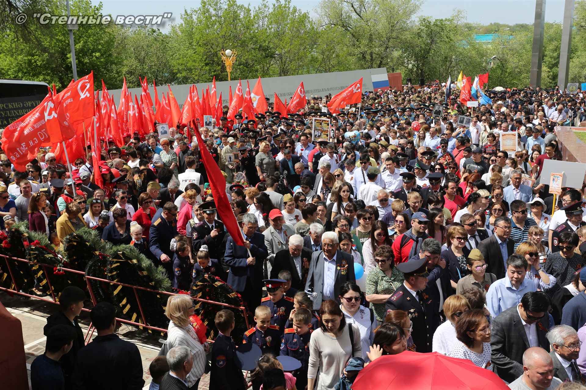 Шествие началось с построения колонн на центральной площади города вокруг Пагоды семи дней. Процессия, состоящая из нескольких сотен жителей Элисты, двинулась вдоль Аллеи Героев к памятнику Б. Городовикова и Героям Советского Союза, у подножия которых люди возложили венки и цветы землякам-героям войны. Далее у мемориального комплекса героев Гражданской и Великой Отечественной войн состоялся торжественный митинг. Открыл его песней «День победы» сводный хор учащихся школ Элисты под управлением заслуженной артистки РК Натальи Дукмановой.