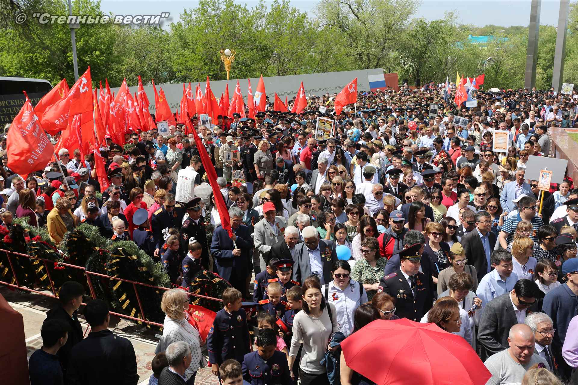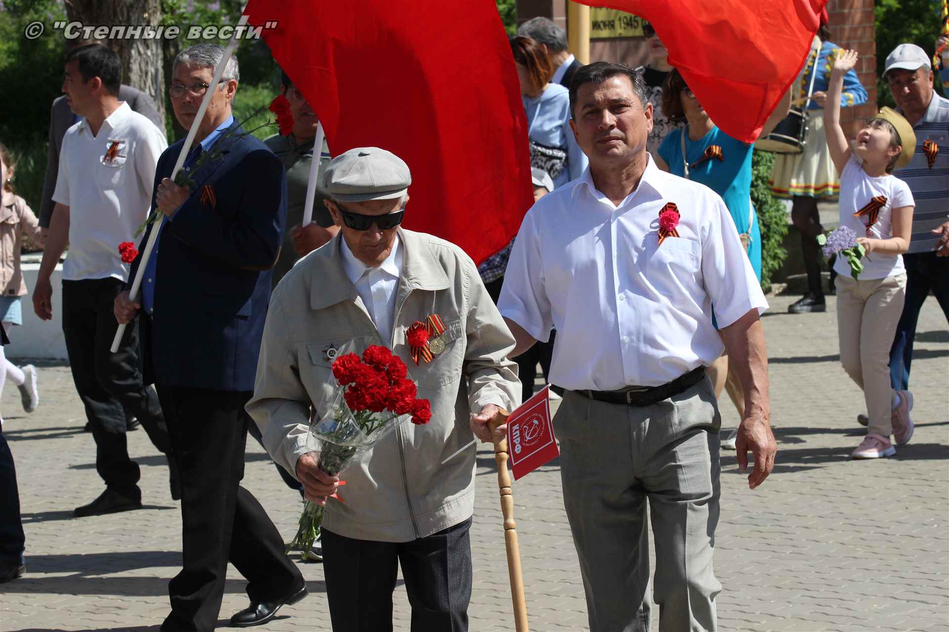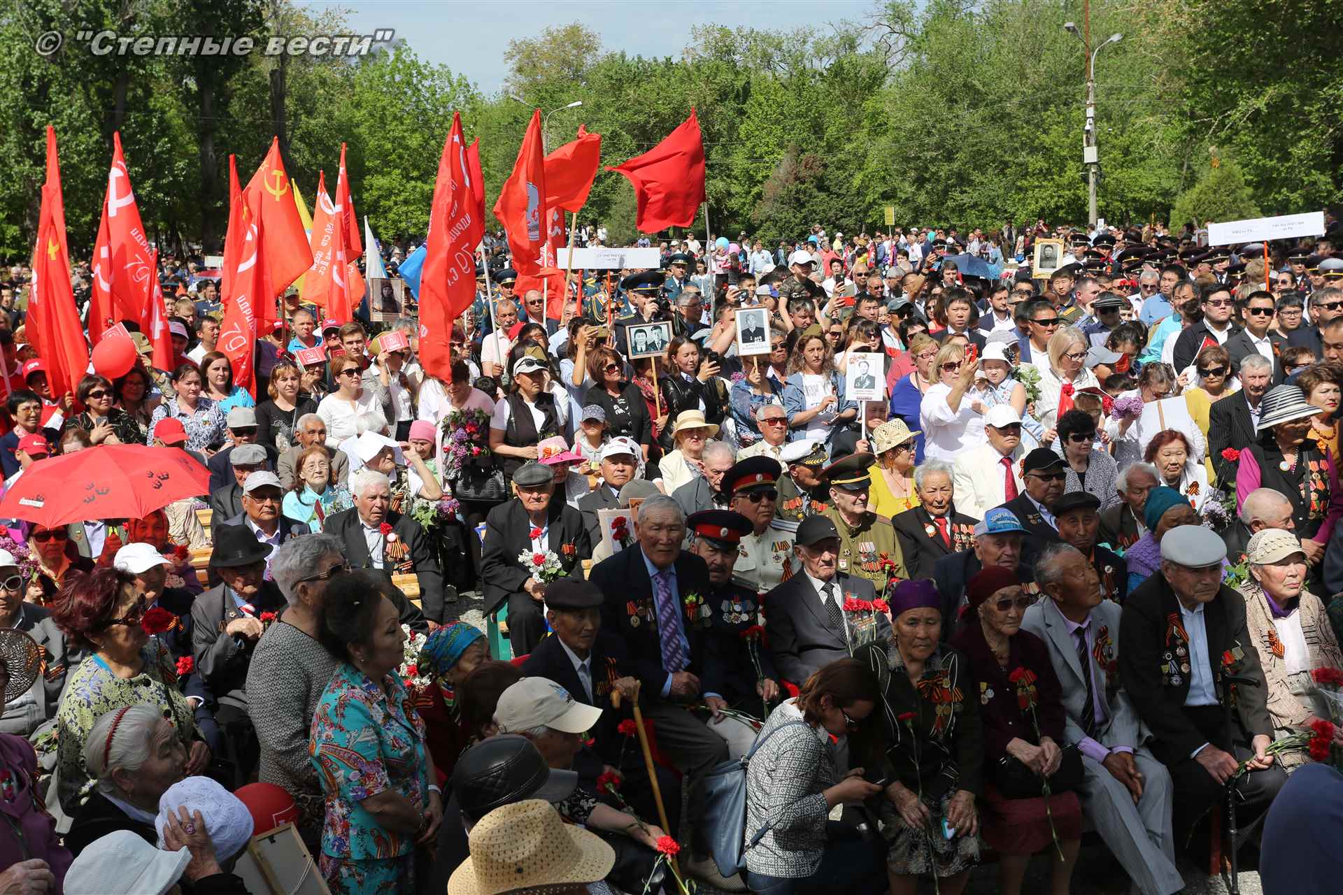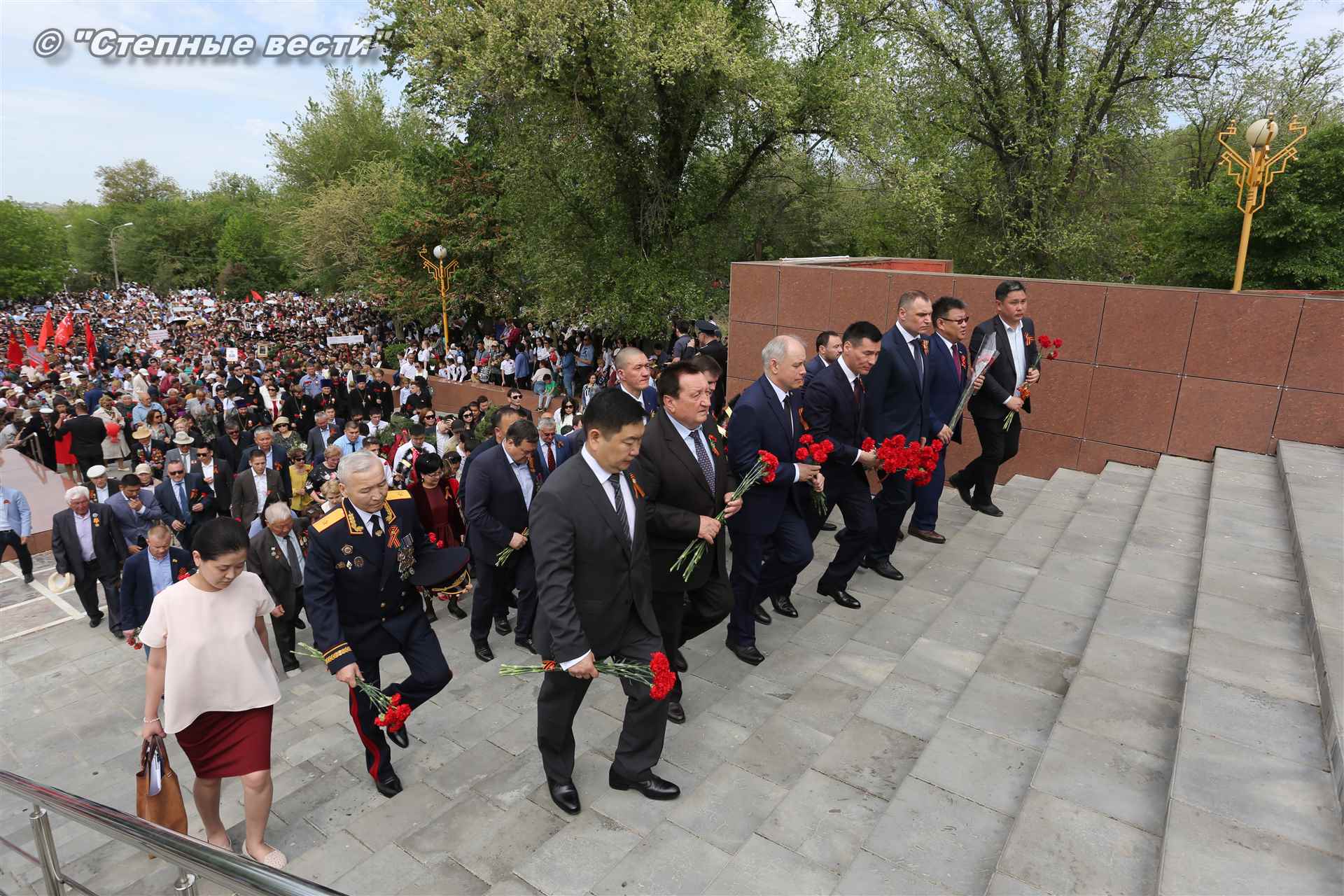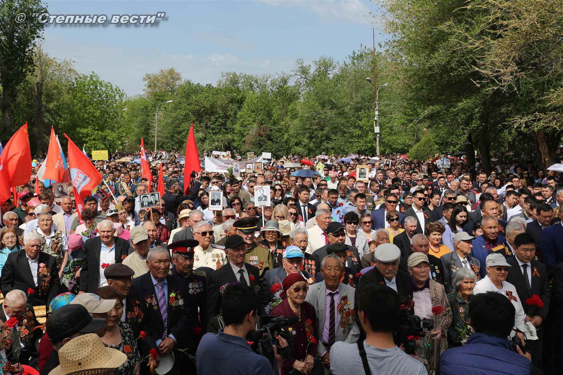 Шествие началось с построения колонн на центральной площади города вокруг Пагоды семи дней. Процессия, состоящая из нескольких сотен жителей Элисты, двинулась вдоль Аллеи Героев к памятнику Б. Городовикова и Героям Советского Союза, у подножия которых люди возложили венки и цветы землякам-героям войны. Далее у мемориального комплекса героев Гражданской и Великой Отечественной войн состоялся торжественный митинг. Открыл его песней «День победы» сводный хор учащихся школ Элисты под управлением заслуженной артистки РК Натальи Дукмановой.