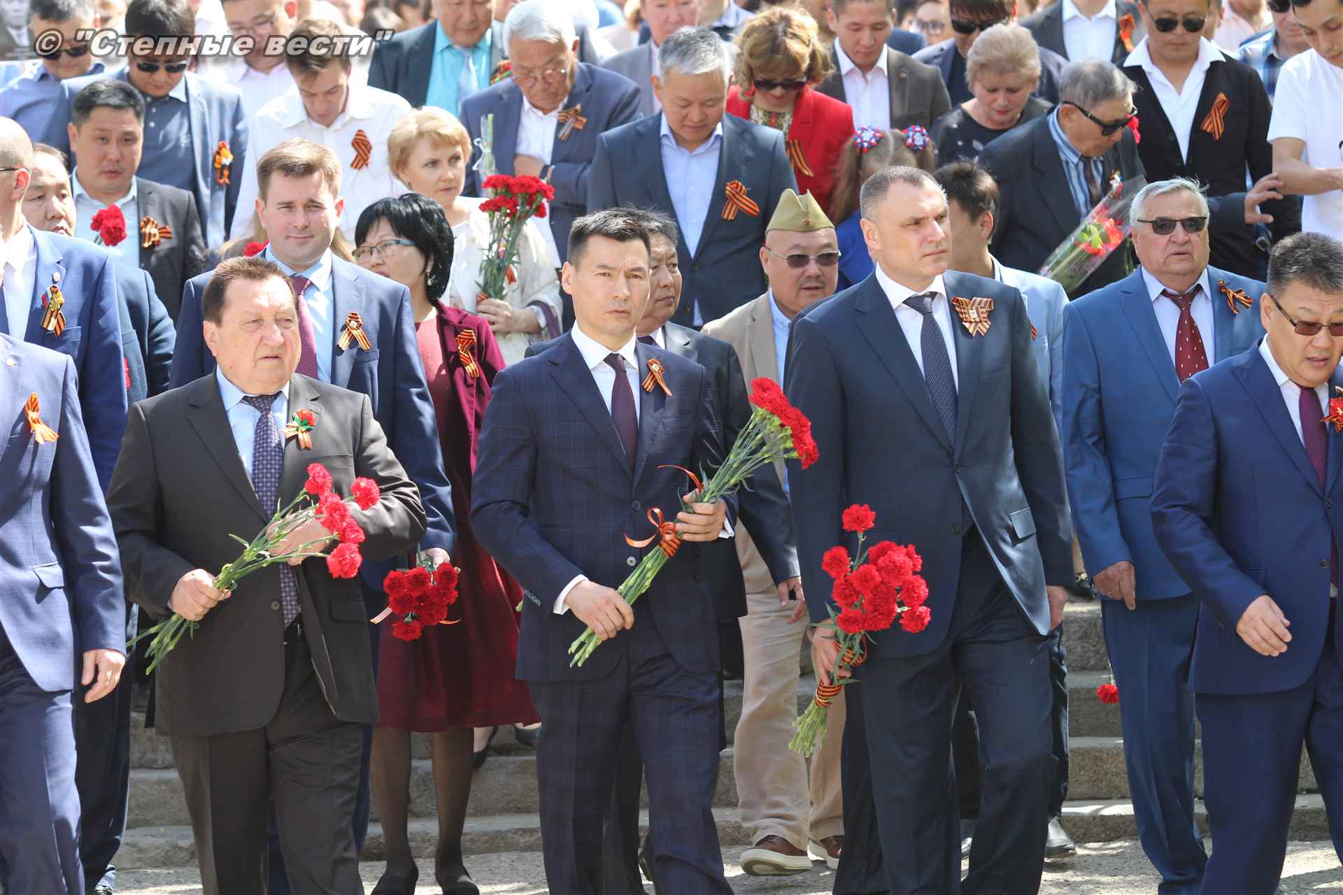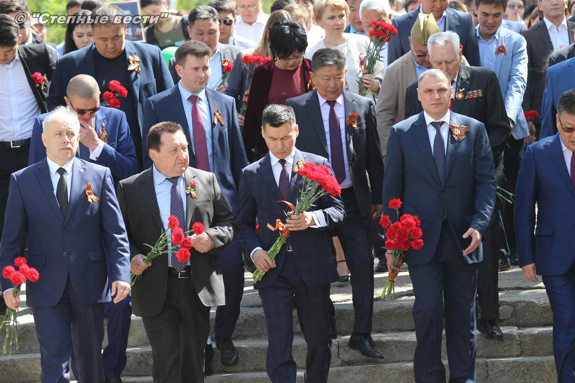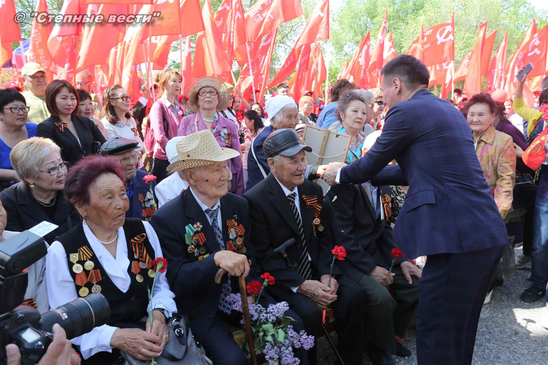 В Элисте состоялся торжественный митинг-шествие, посвященный 74-й годовщине Победы в Великой Отечественной войне 1941-1945 годов. В праздничном мероприятии приняли участие руководители органов власти Калмыкии во главе с временно исполняющим обязанности главы республики Бату Хасиковым, ветераны Великой Отечественной войны, делегации федеральных, республиканских министерств, ведомств и бюджетных учреждений, муниципальных организаций Элисты, а также представители общественных объединений.