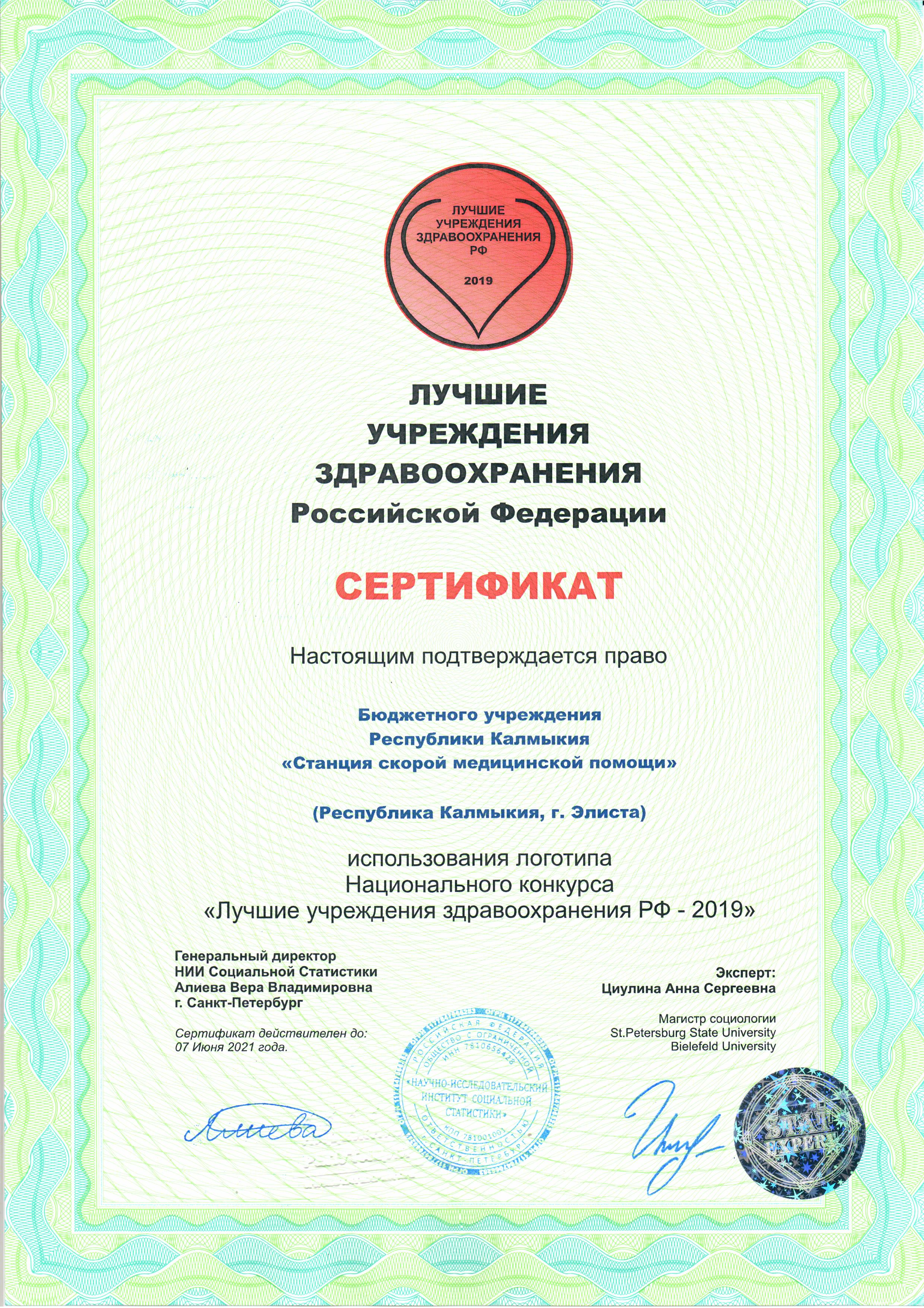 Станция скорой медицинской помощи Калмыкии стала лауреатом национального конкурса «Лучшие учреждения здравоохранения РФ-2019». Итоги подвели на основании ежегодного мониторинга Минздрава РФ НИИ Социальной статистики г. Санкт-Петербург.