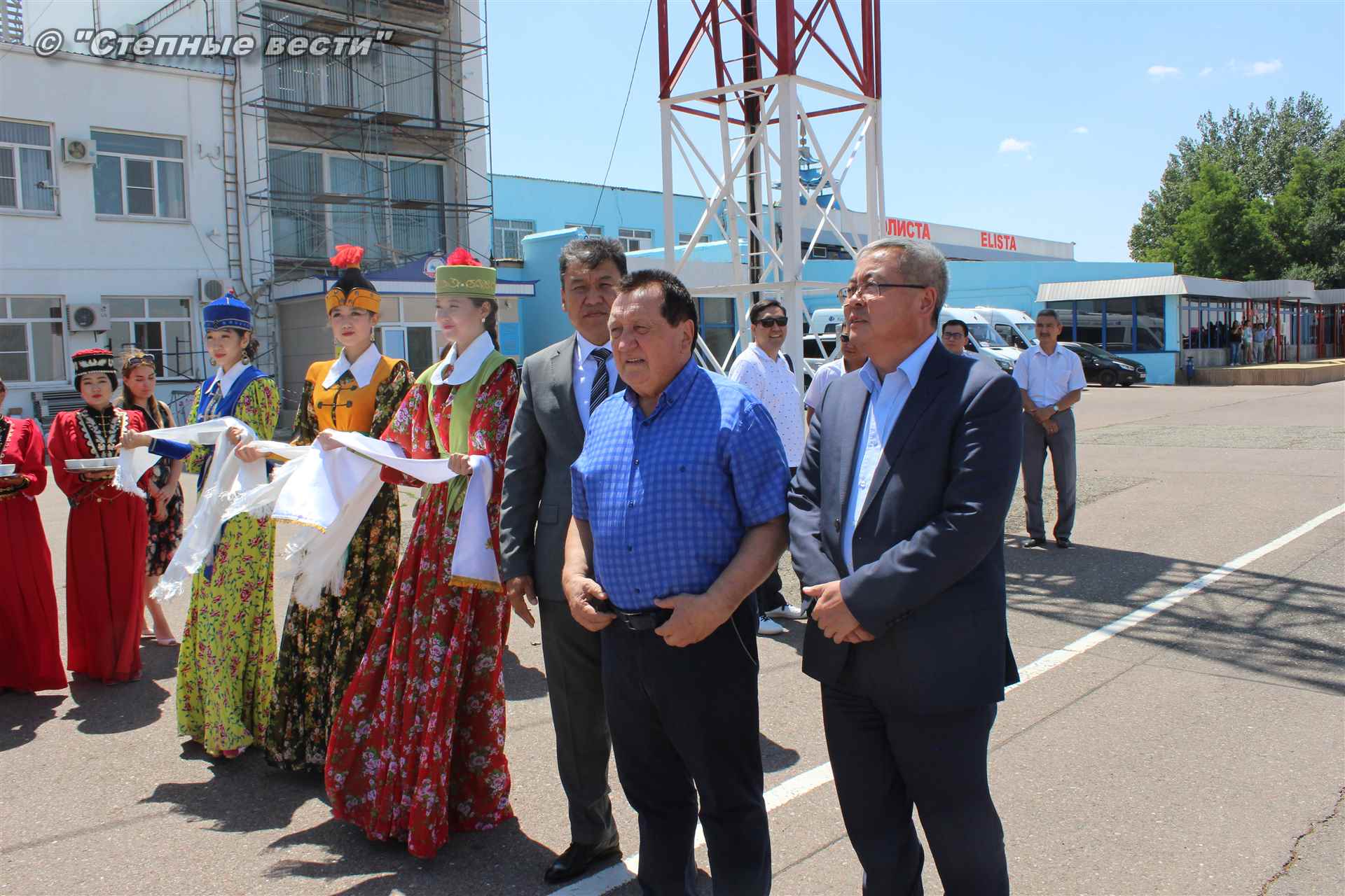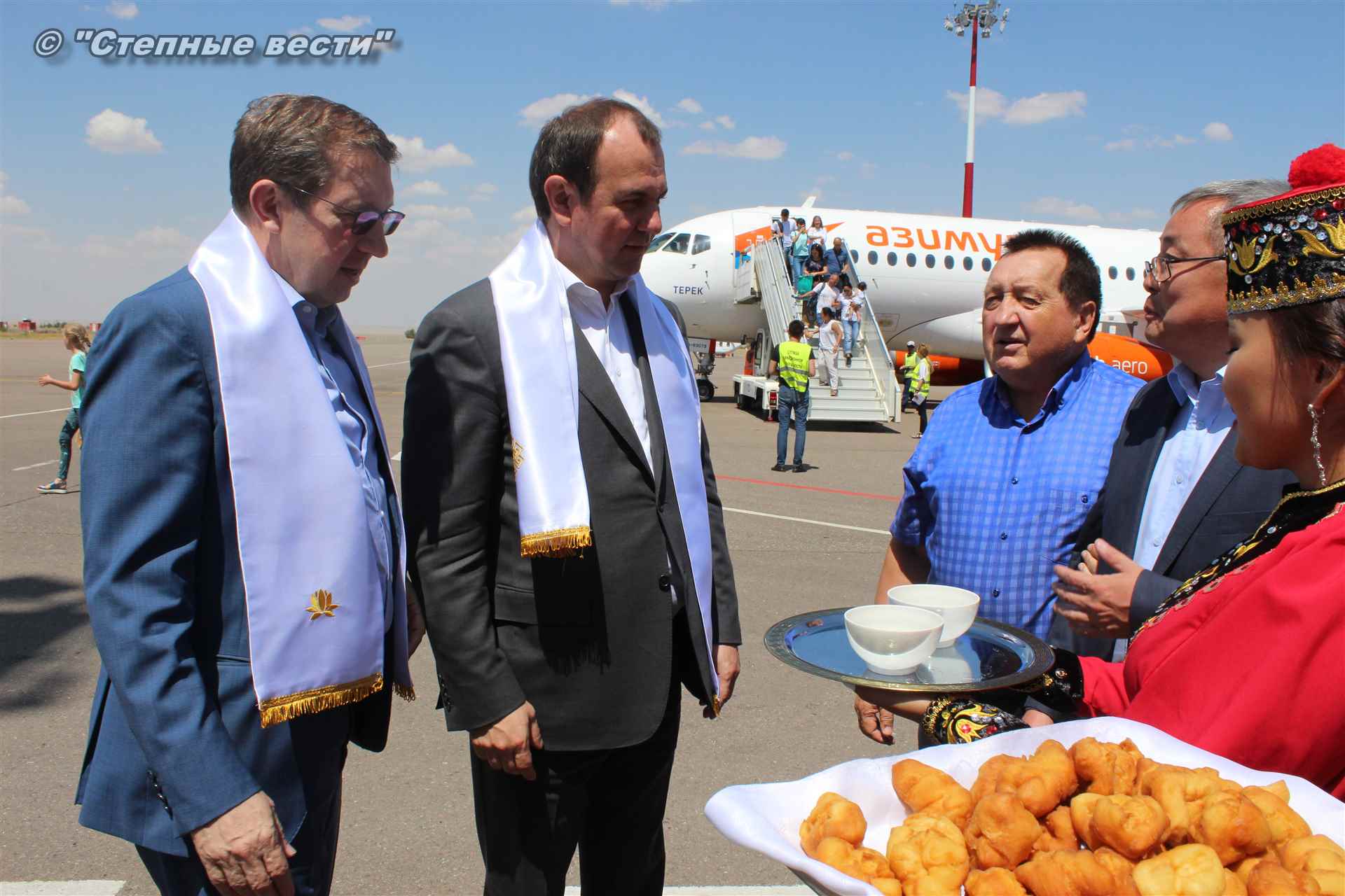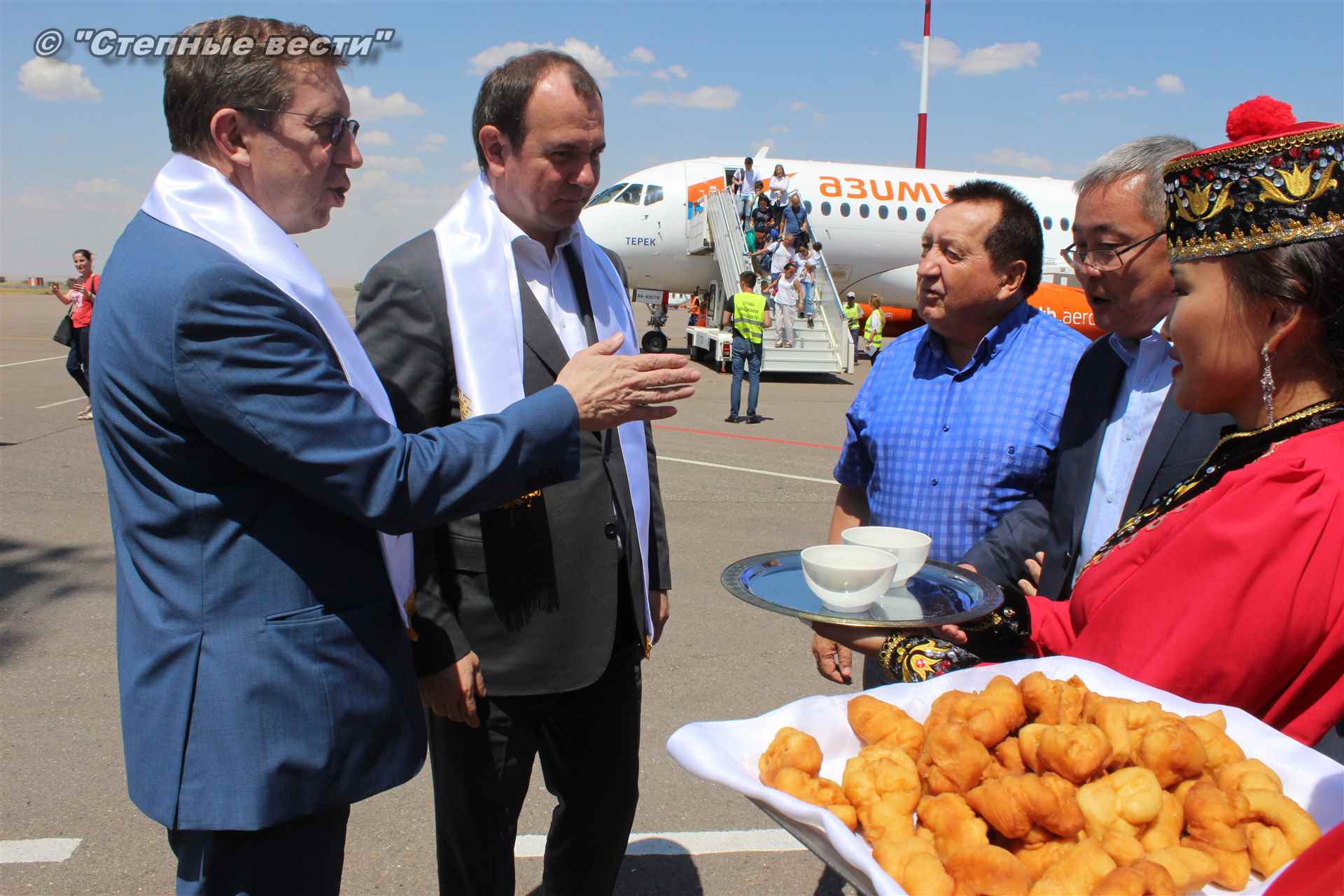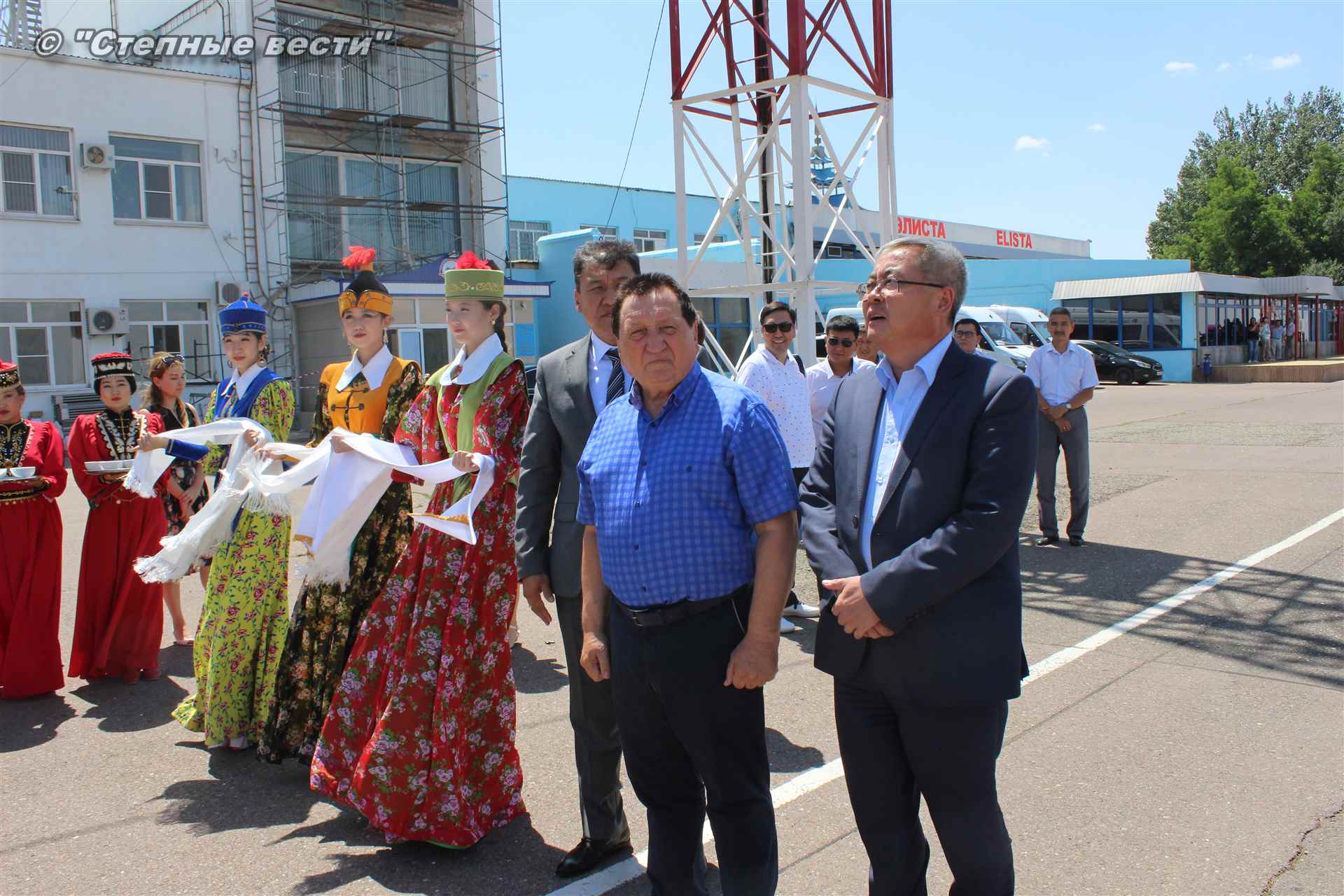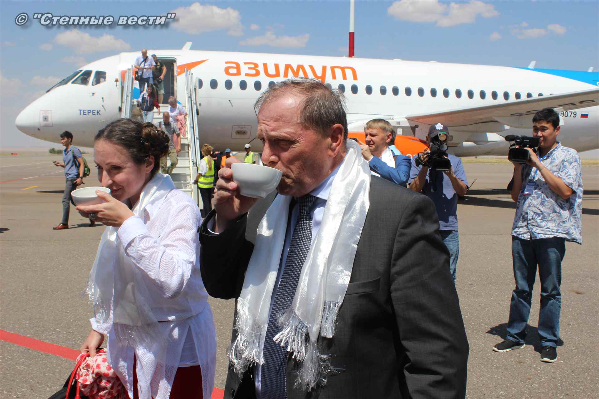 В элистинском аэропорту высоких гостей встретили председатель Народного Хурала (Парламента) РК Анатолий Козачко, представители регионального кабинета министров. По калмыцким обычаям девушки в национальных костюмах поднесли им пиалы с чаем и вручили хадаки.