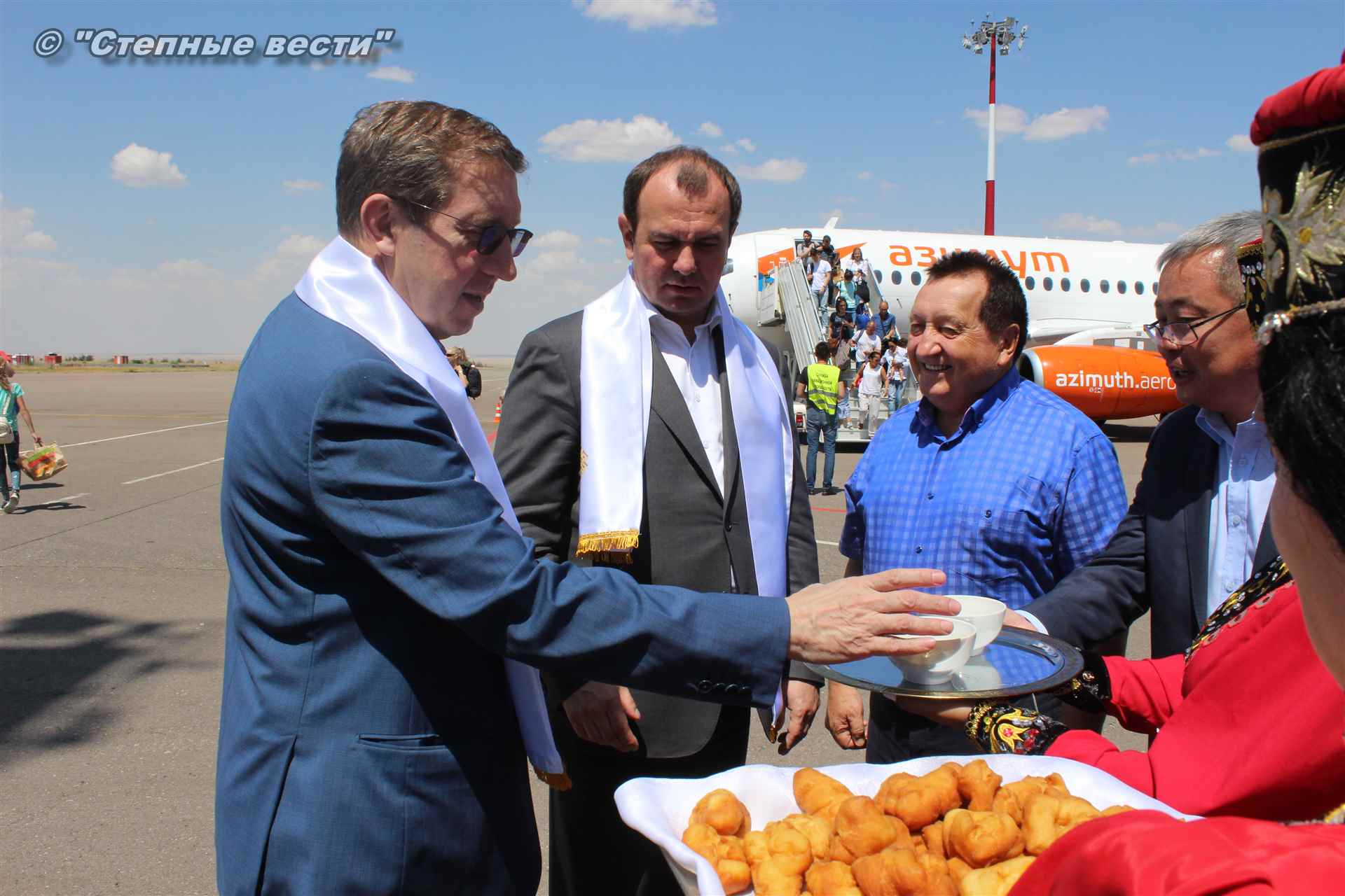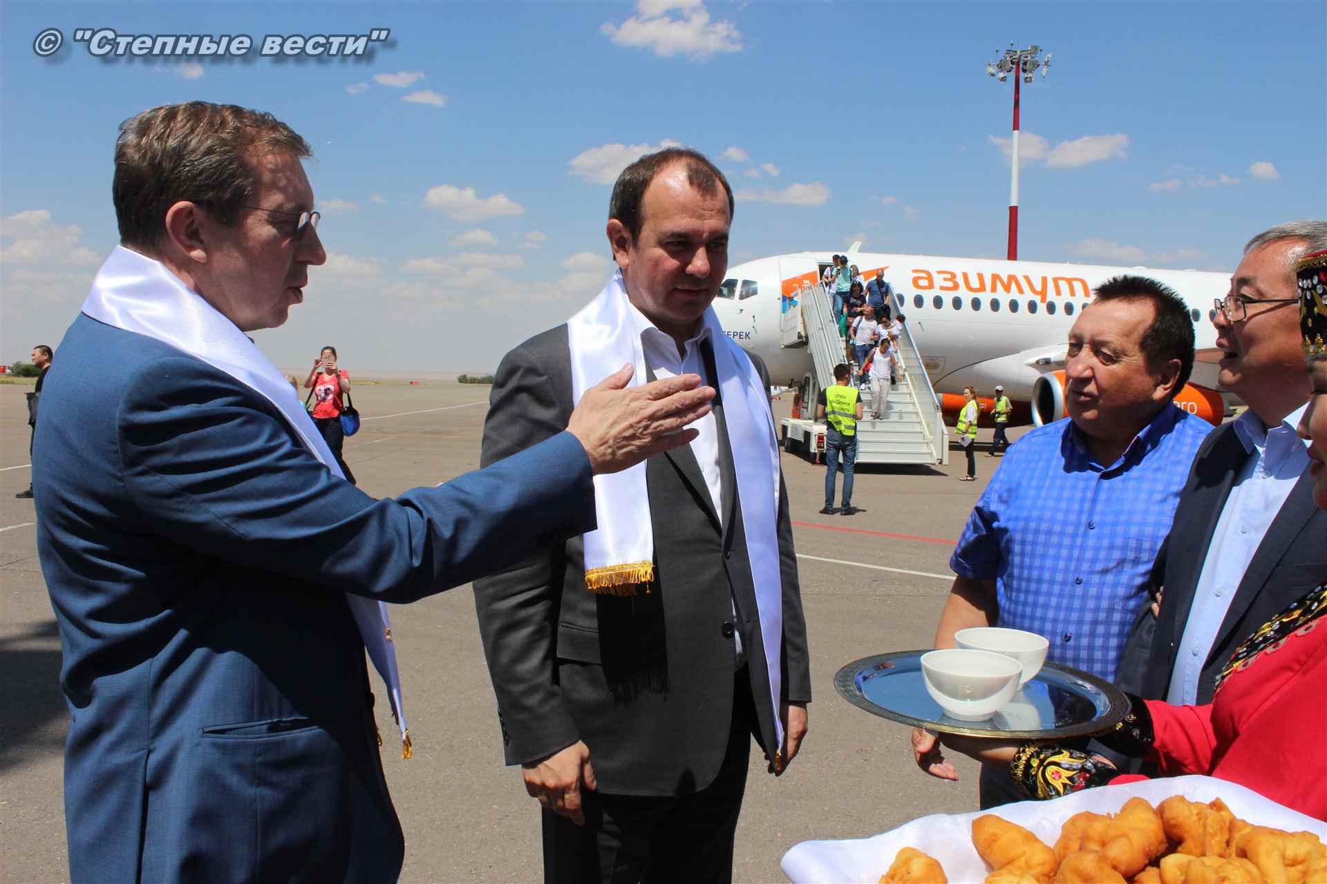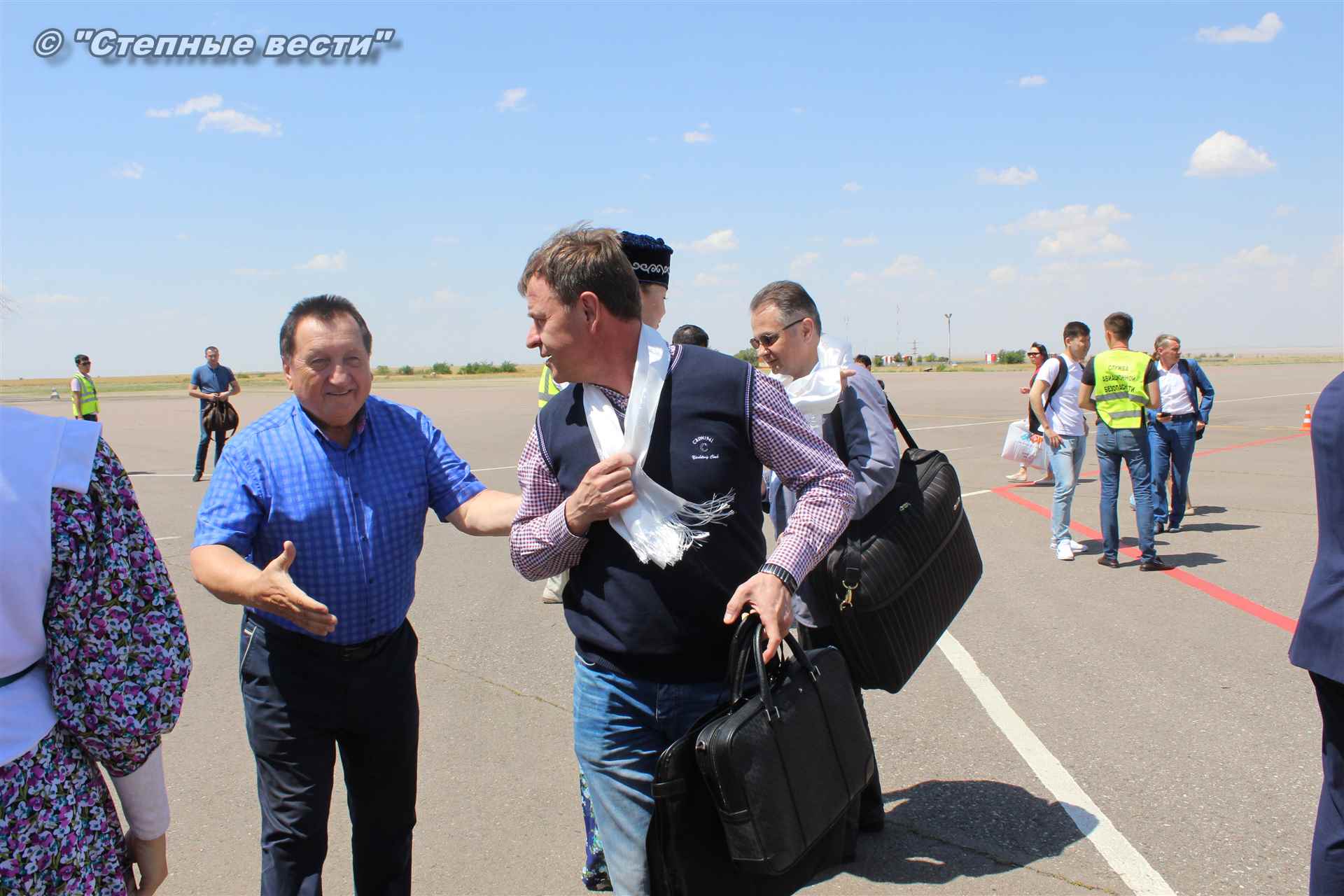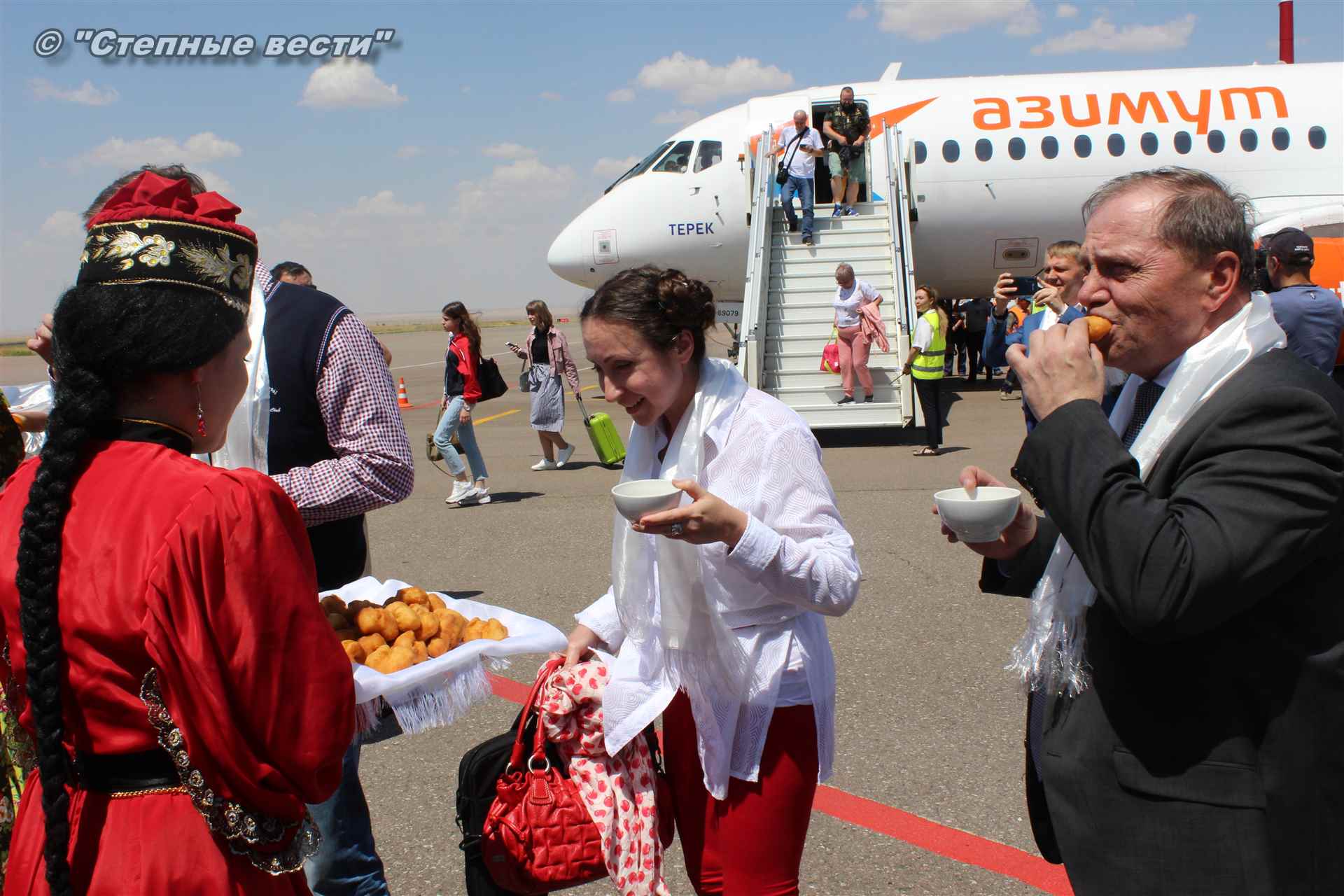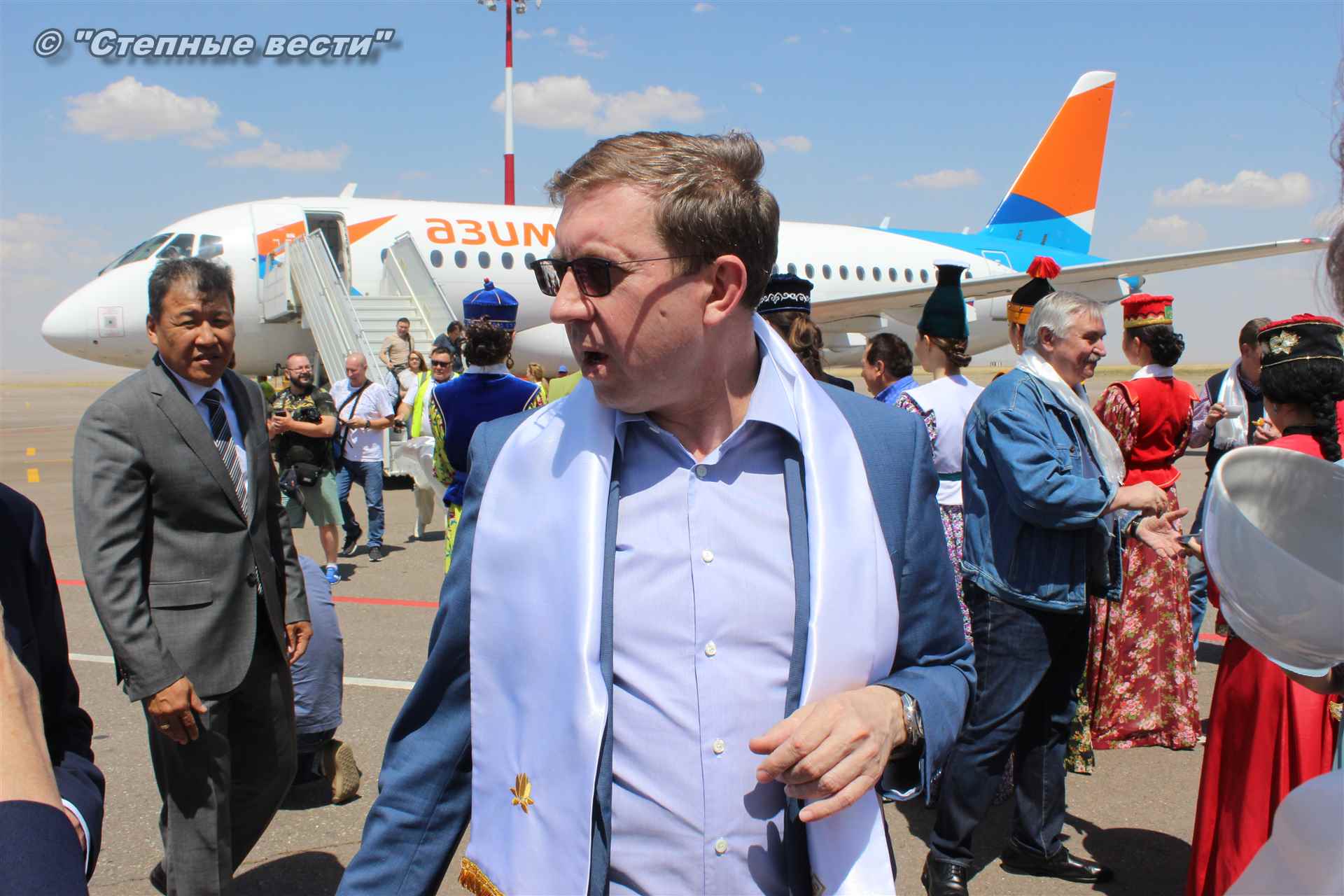 В элистинском аэропорту высоких гостей встретили председатель Народного Хурала (Парламента) РК Анатолий Козачко, представители регионального кабинета министров. По калмыцким обычаям девушки в национальных костюмах поднесли им пиалы с чаем и вручили хадаки.