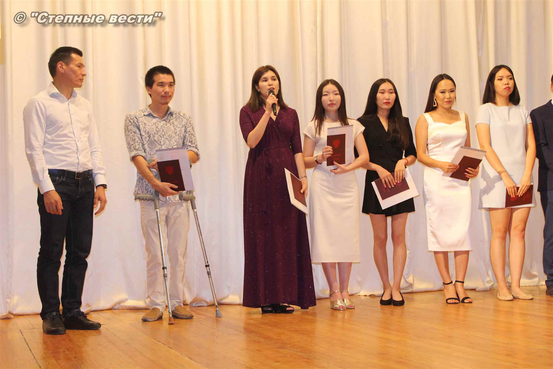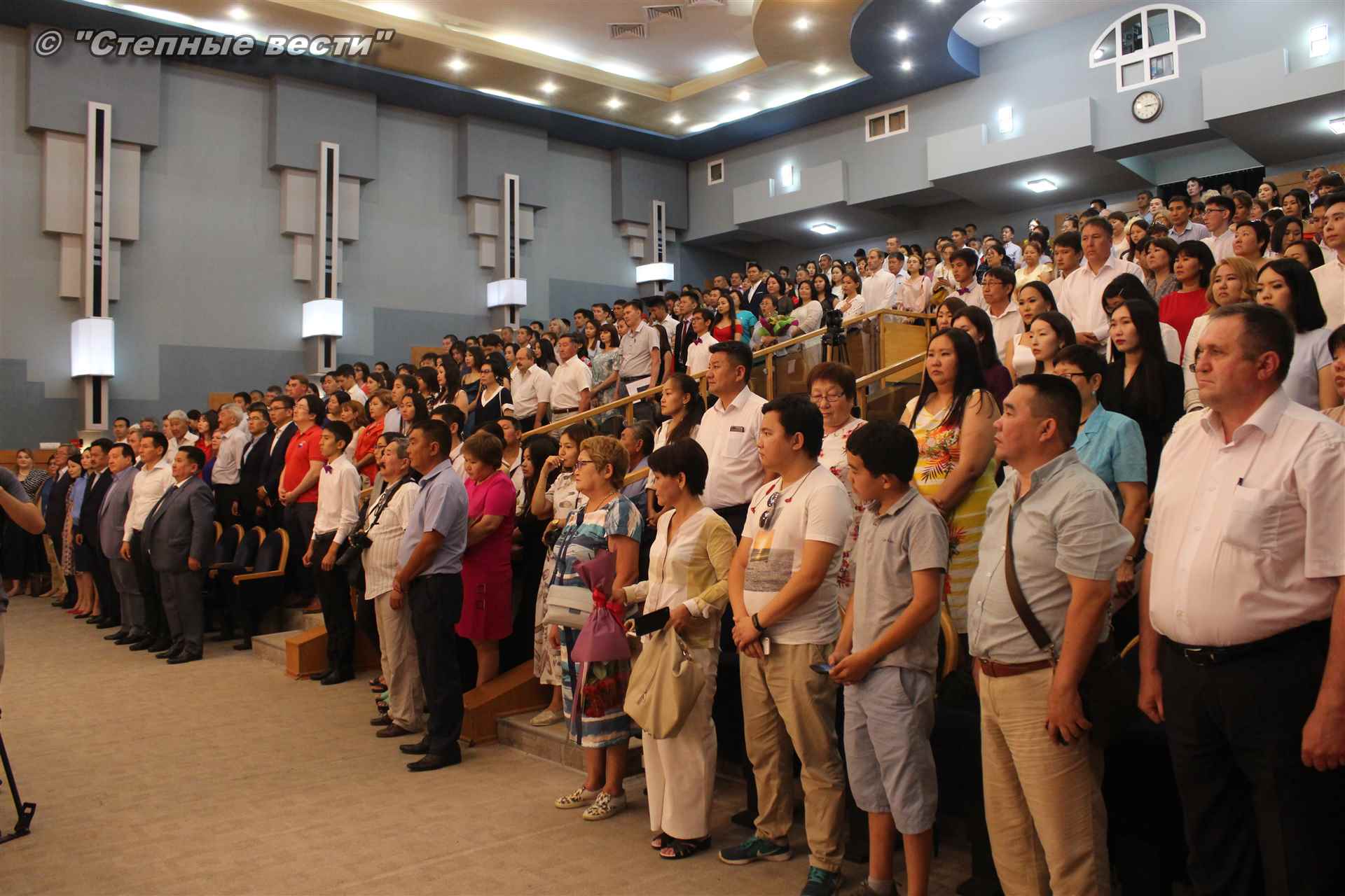 Завершивших обучение в магистратуре с «красным» дипломом пришли поздравить также спикер парламента РК Анатолий Козачко, председатель Верховного Суда РК Валерий Петренко, старший помощник прокурора Калмыкии по надзору за исполнением законов о несовершеннолетних Эльза Батырова, и.о. министра соцразвития, труда и занятости РК Марина Ользятиева, и.о. министра культуры и туризма РК Хонгор Эльбиков, министр цифрового развития РК Алексей Этеев, и.о. министра образования и науки РК Николай Манцаев, и.о. министра спорта и молодежной политики РК Дорджи Шикеев и другие. В самом начале мероприятия ведущие приветствовали ректора КалмГУ Бадму Салаева, проректорский корпус университета, деканов факультетов, руководителей магистерских программ, родителей, гостей, приглашенных. Церемония вручения дипломов началась после того, как прозвучали гимны России, Калмыкии и Калмыцкого госуниверситета, который, к слову, в следующем году отметит свое 50-летие.
