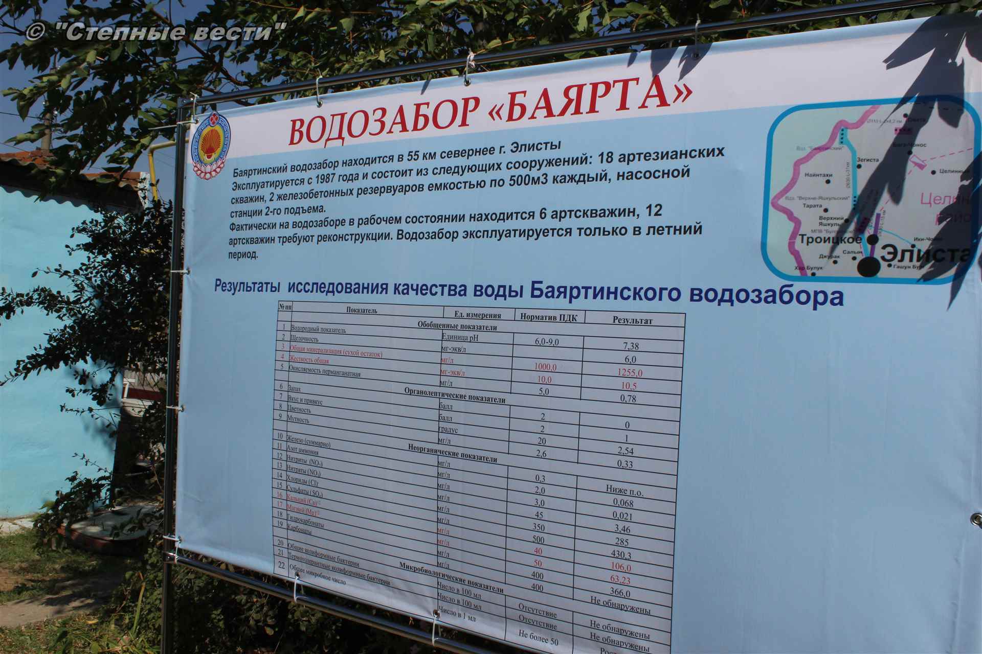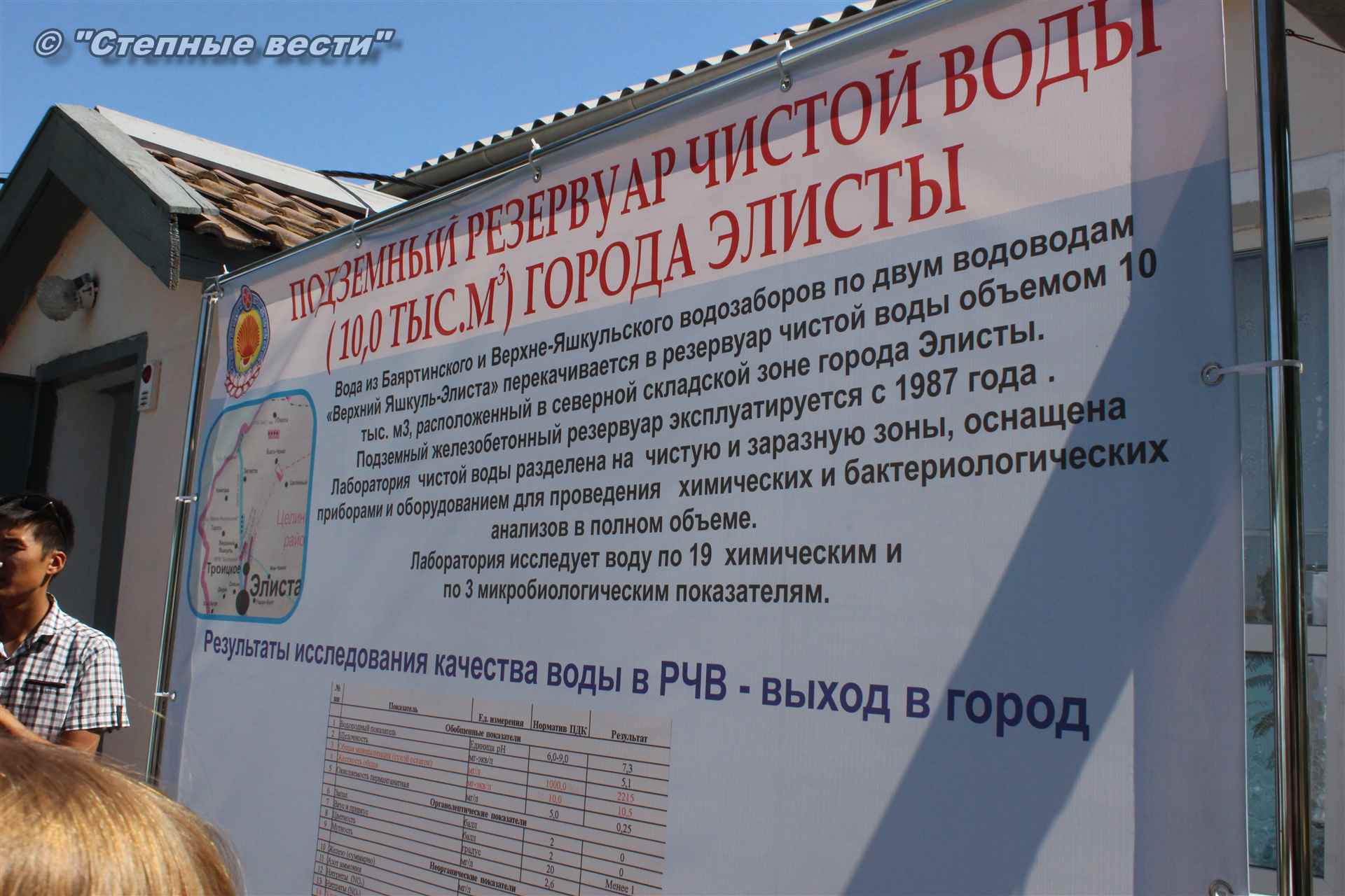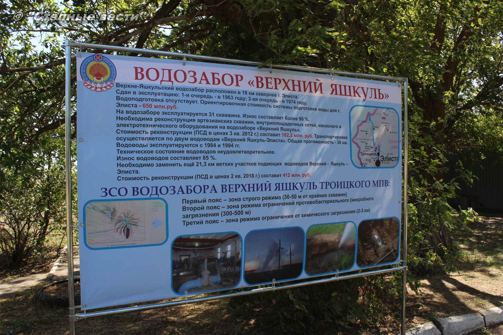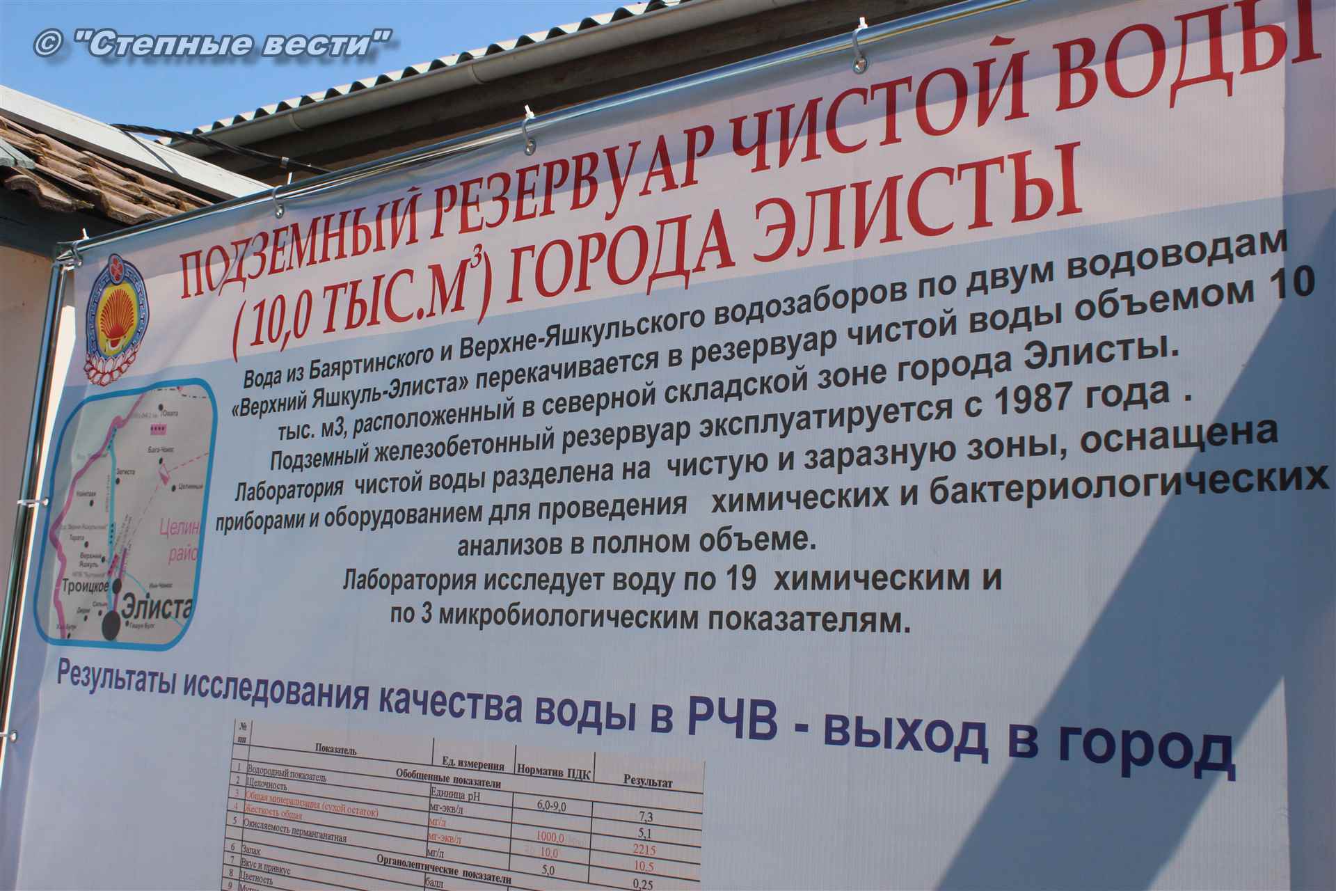 Первым местом посещения стала территория водозабора «Верхний Яшкуль» (Троицкое месторождение подземных вод) в одноименном поселке Целинного района. Директор МУП «Элиставодоканал» Владимир Лиджи-Горяев рассказал федеральному чиновнику о том, как устроена система водоснабжения города, что необходимо для бесперебойной работы данного объекта жизнеобеспечения. К сожалению, и водозабор с насосами, и магистральные водоводы, и городская водопроводная сеть практически до предела изношены, из-за чего часто случаются порывы и аварии. Разумеется, это не лучшим образом сказывается на качестве воды, потребляемой элистинцами.