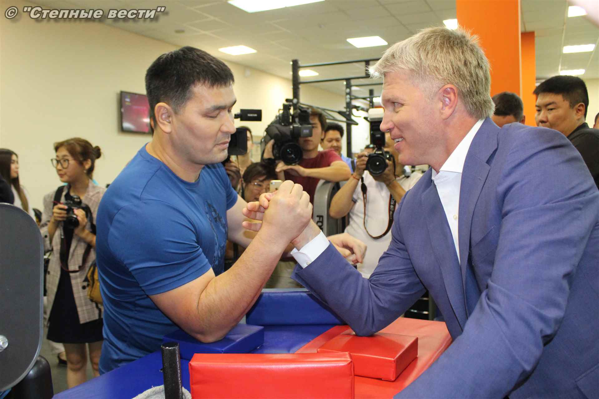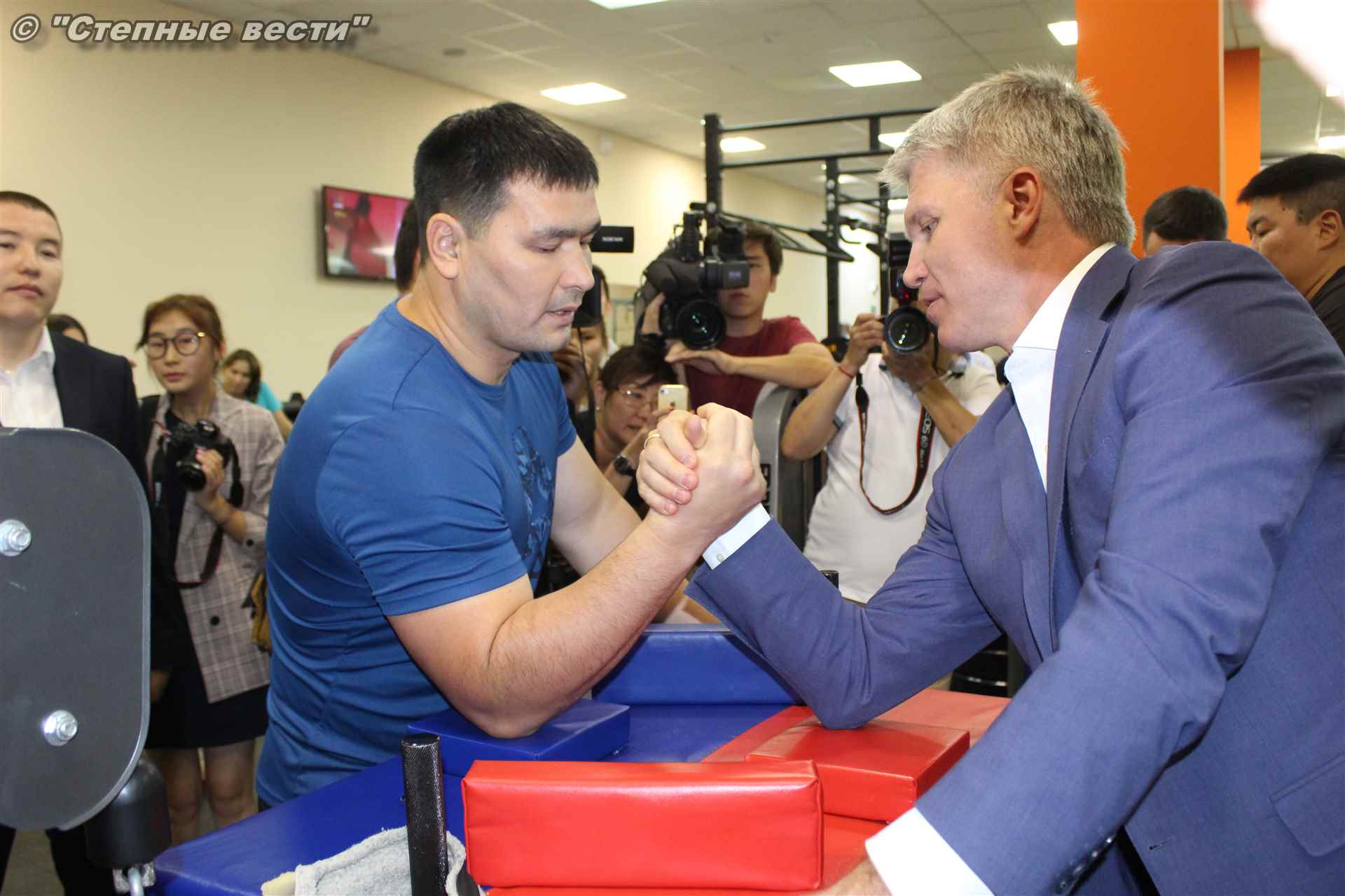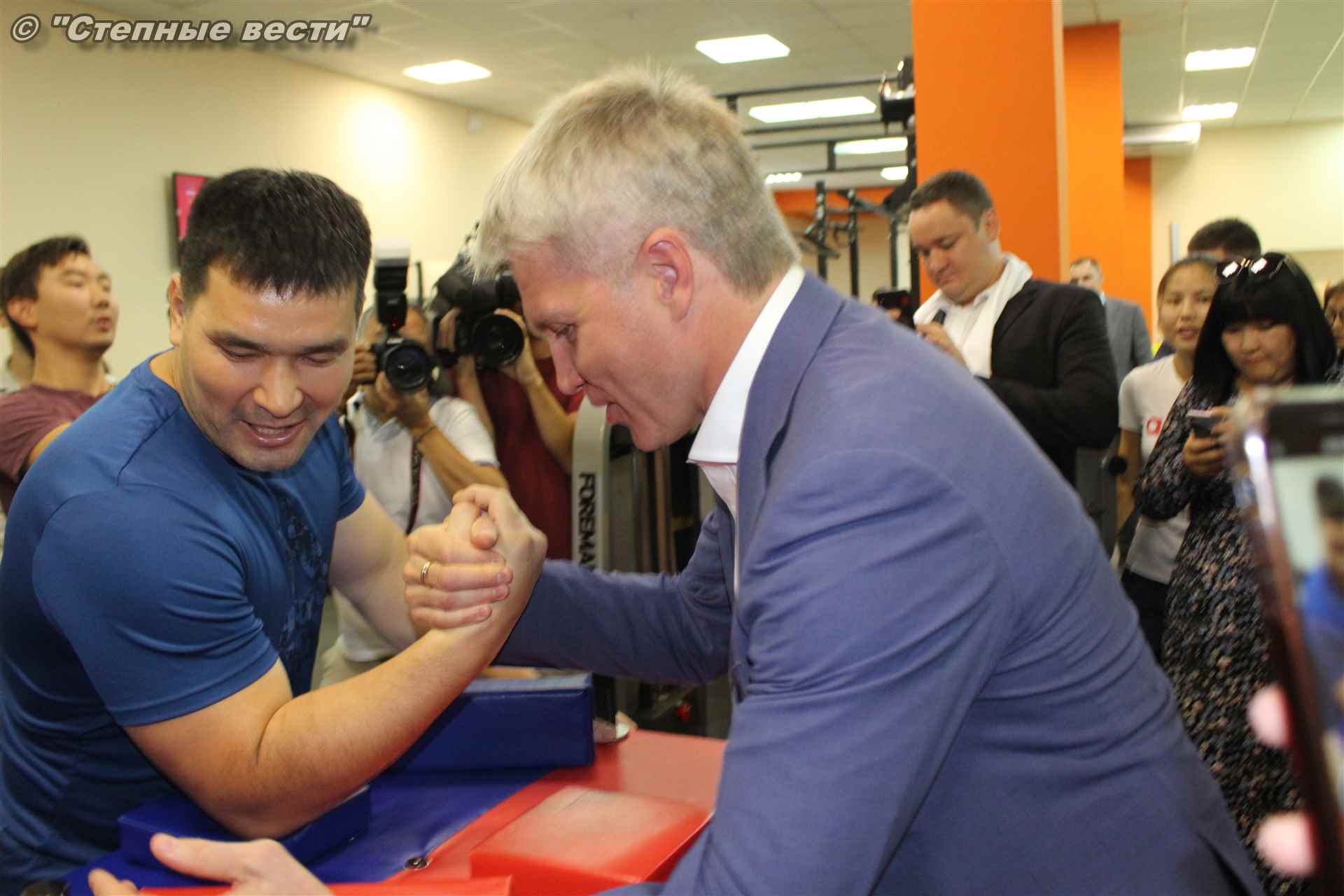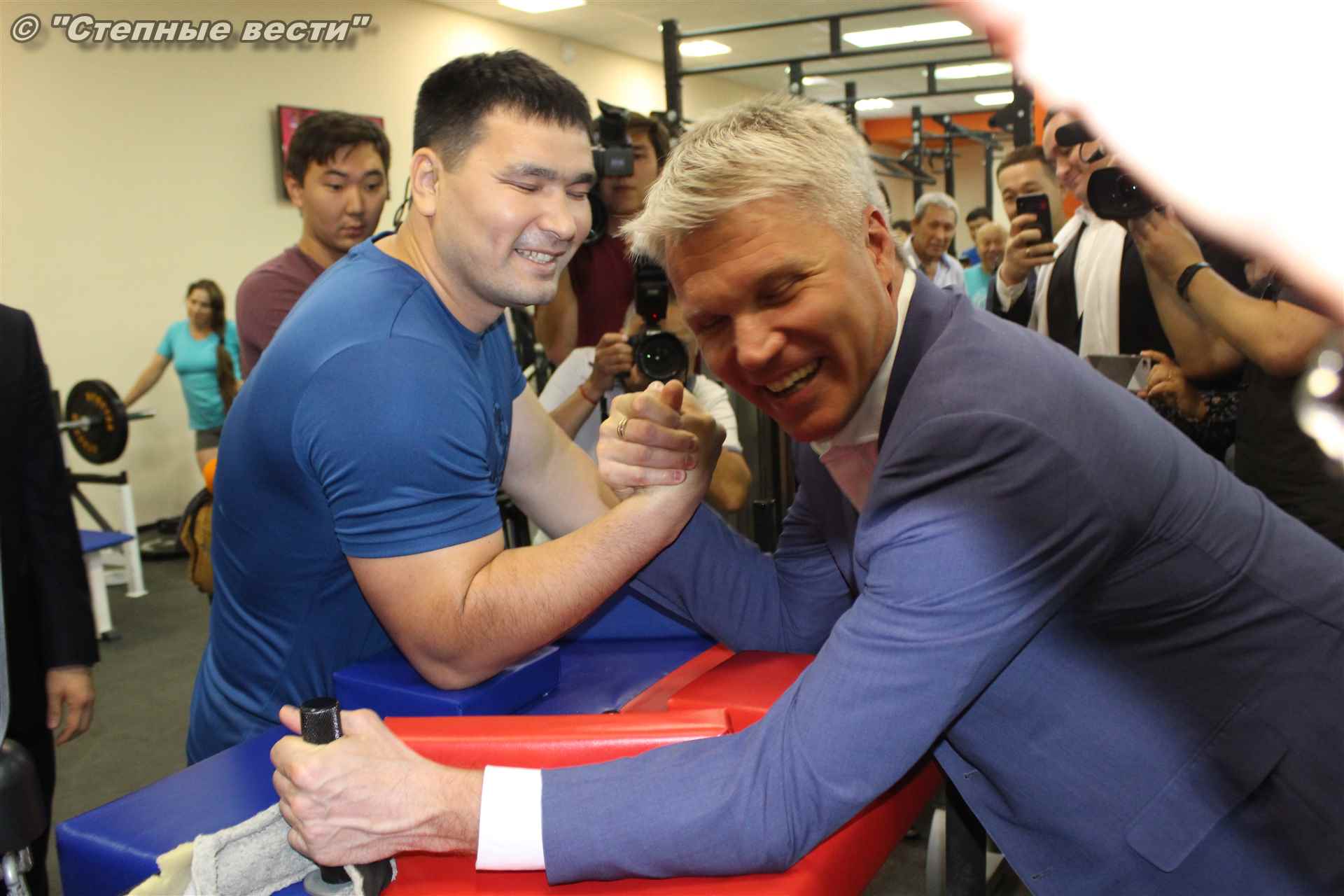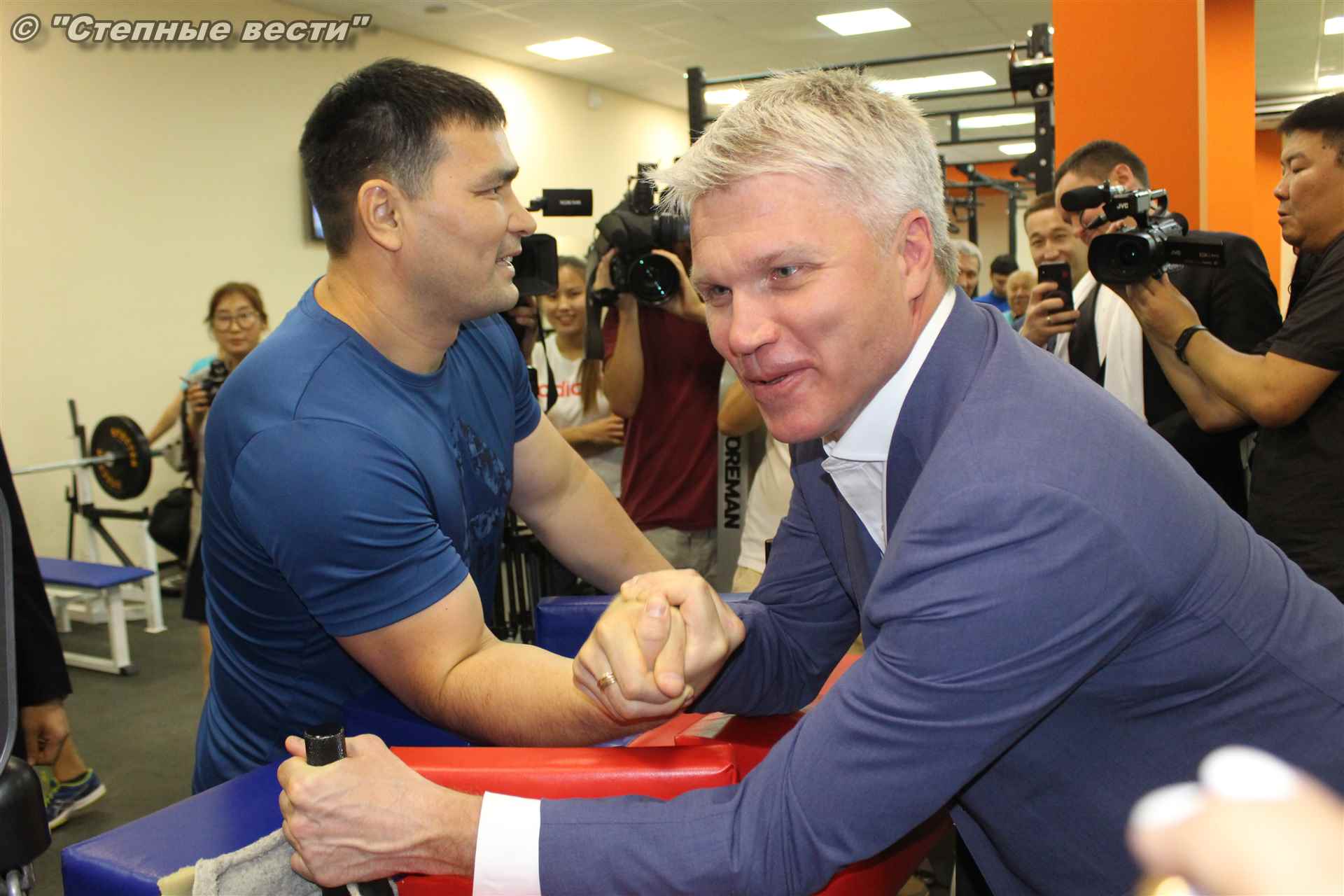 А в тренажерном зале занимались силачи под руководством мастера спорта международного класса, многократного  чемпиона и рекордсмена мира по пауэрлифтингу Игоря Настынова, и здесь тренер по армрестлингу Евгений Джекураев рискнул  сразиться с федеральным министром, между прочим,  олимпийским  чемпионом  по фехтованию.