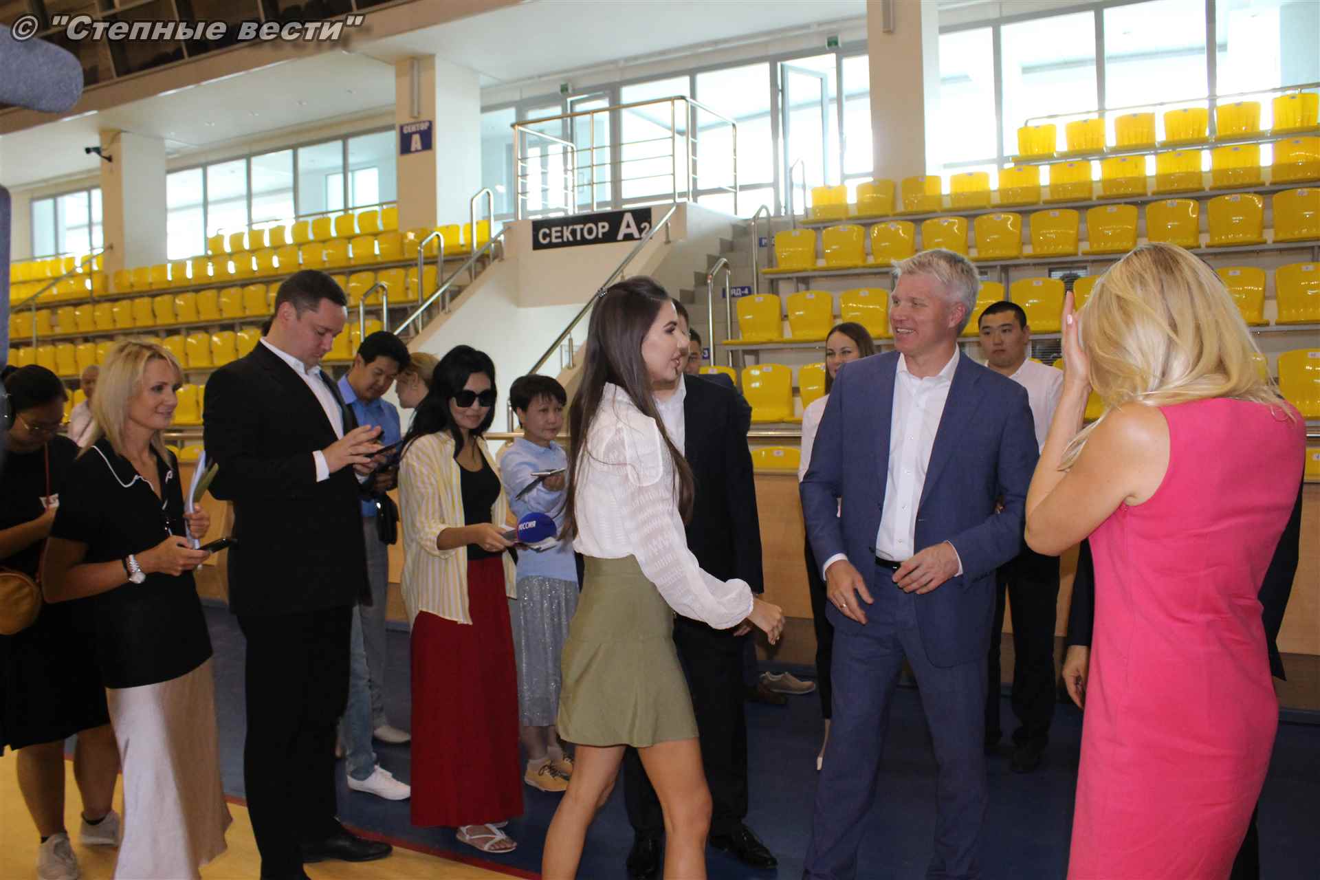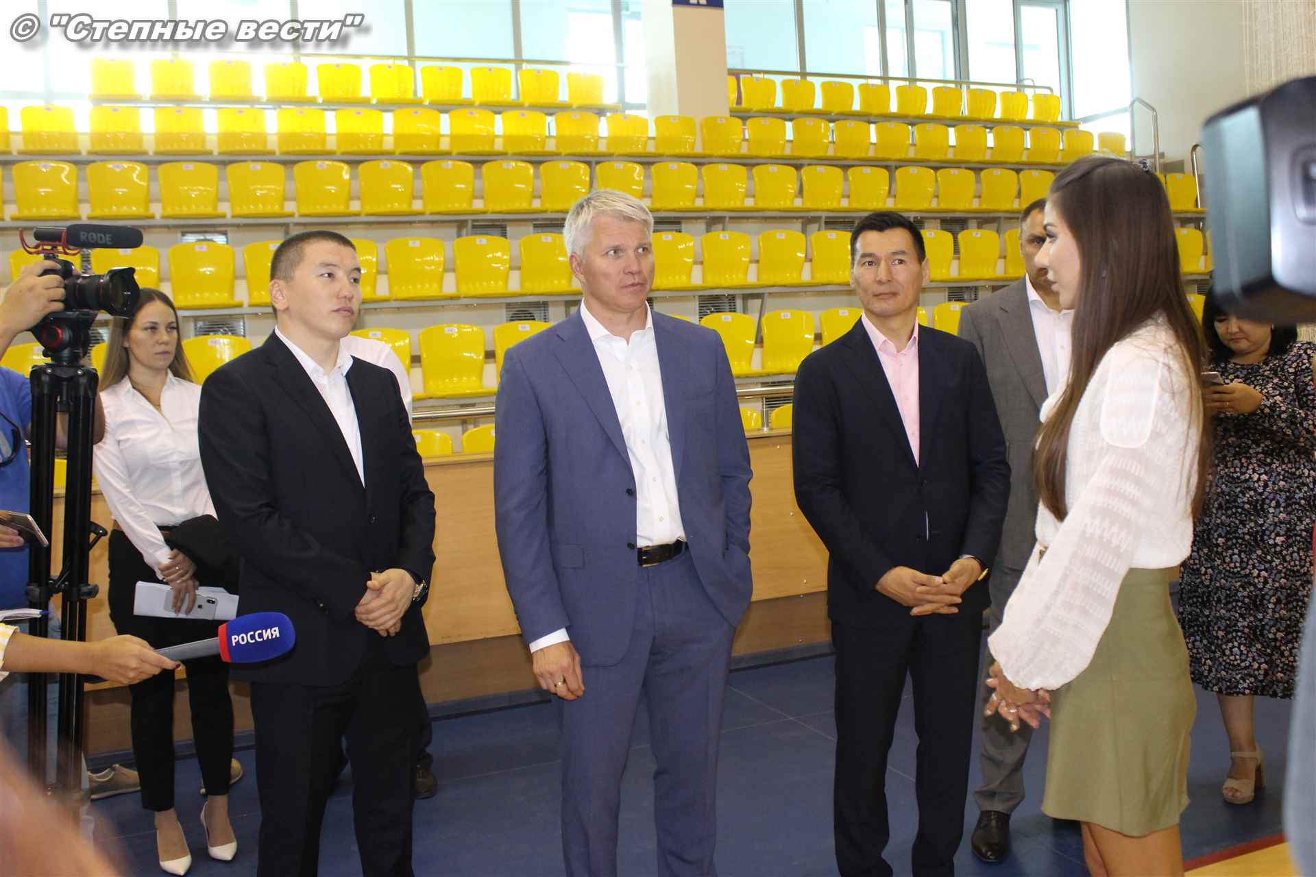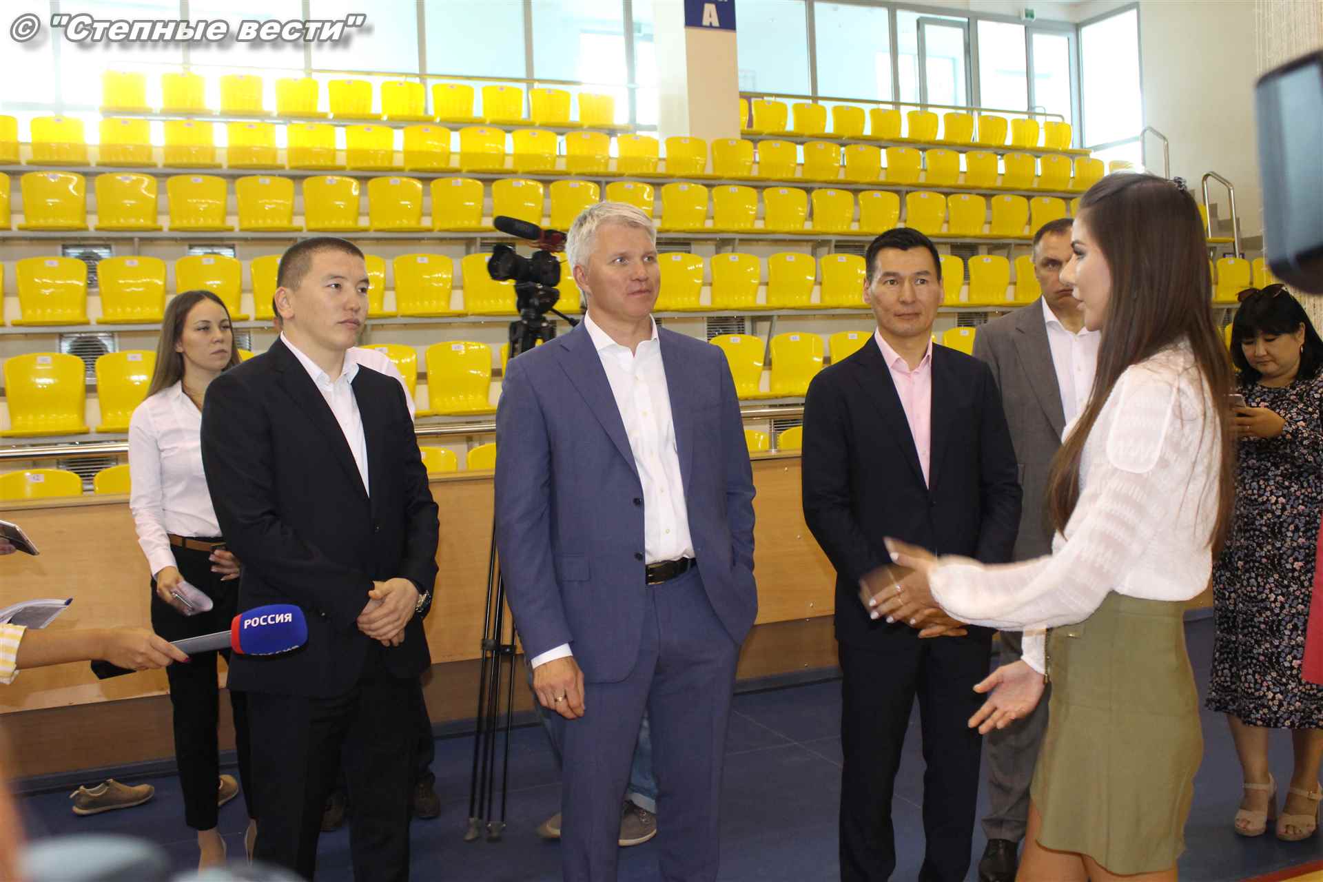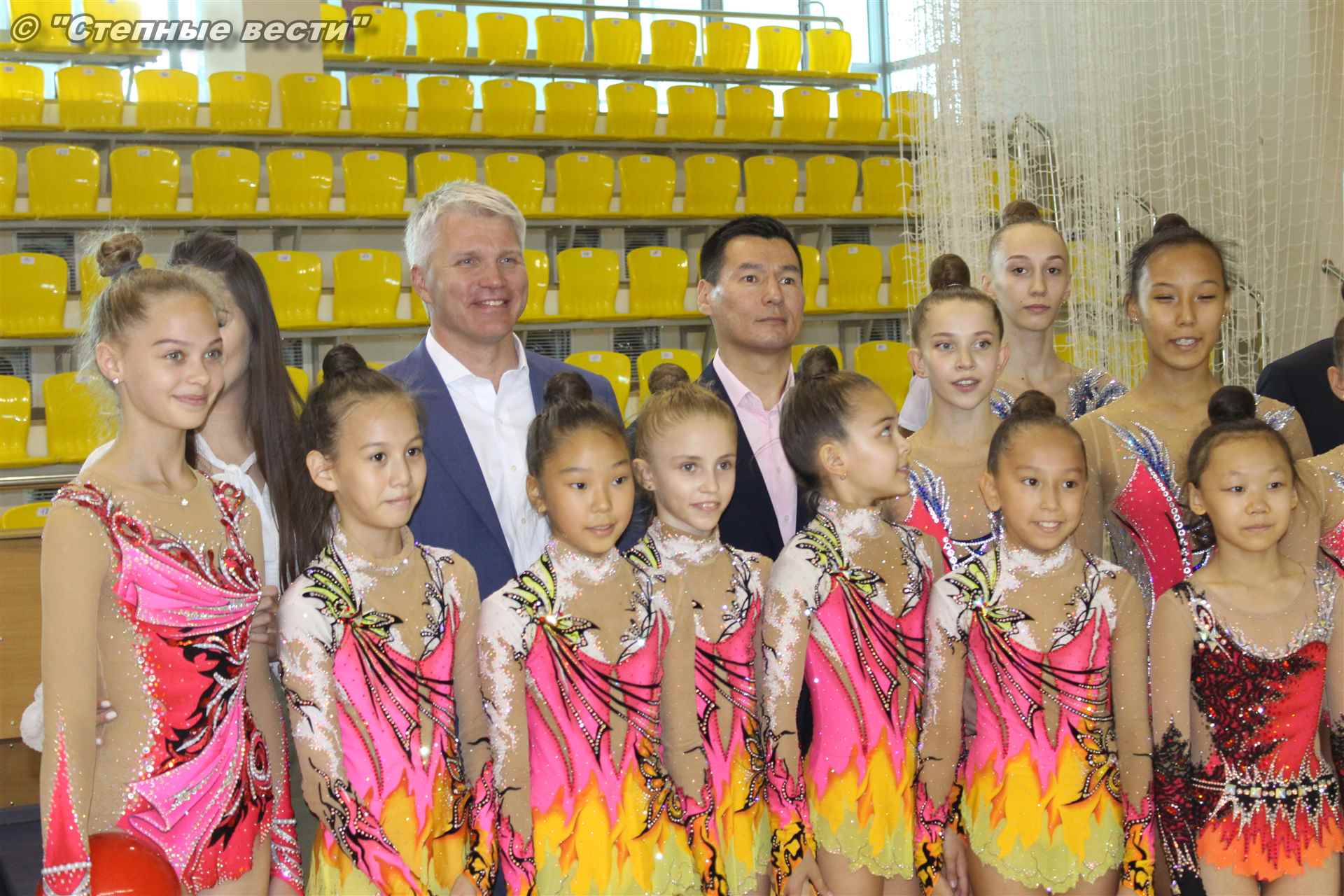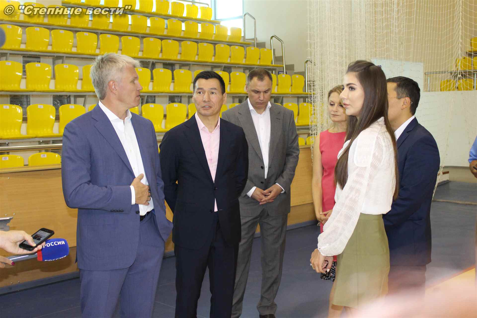 На универсальной арене, где сейчас занимаются юные гимнастки, с Павлом  Колобковым и Бату Хасиковым побеседовали  заслуженный тренер России Людмила Гальченко и олимпийская чемпионка по художественной гимнастике в Лондоне, Герой Калмыкии, президент Федерации художественной гимнастики РК Алина Макаренко.