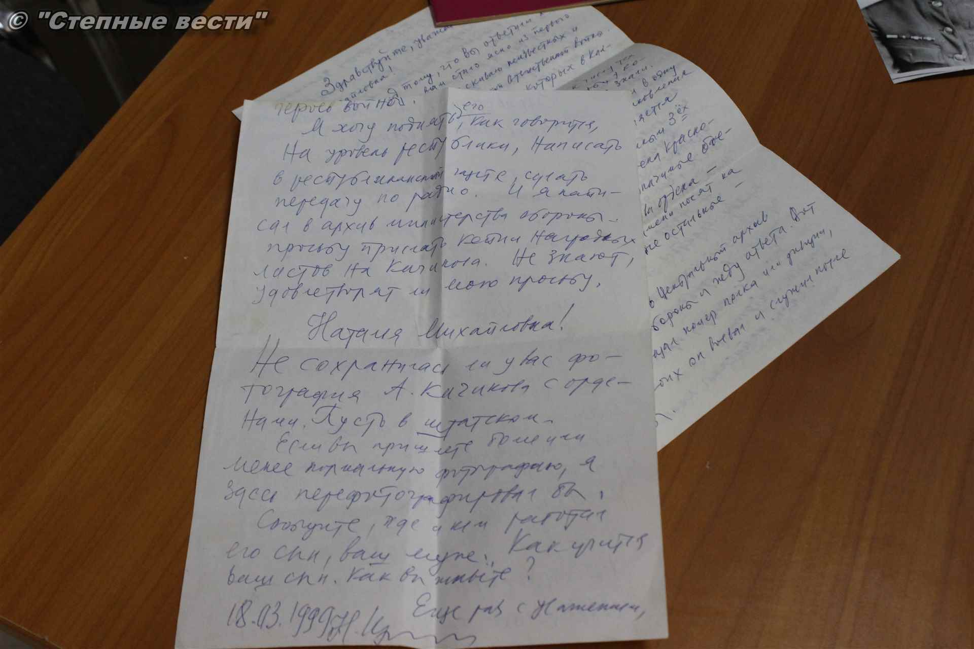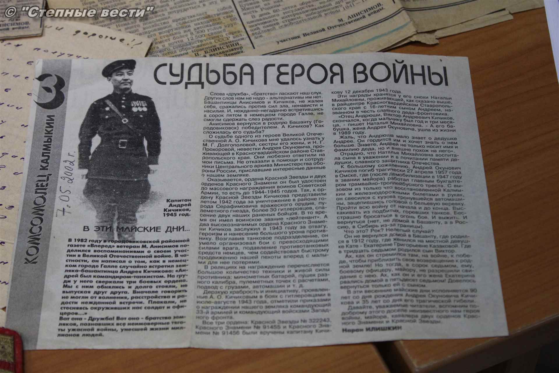 К сожалению, сообщила Наталья Прохорова, в живых свекра она не застала — в 1957 году Андрей Кичиков трагически погиб в ссылке, в городе Омске, после чего его жена с сыном перебрались на Ставрополье. Женщина обращалась к омским поисковикам с просьбой отыскать хоть какие-то сведения о нем в тот период, но они ничем значительным не увенчались. В итоге вместе с родственницей Светланой Дорошинской она привезла в Элисту все, что было: стопка писем, наградных документов с самими медалями и орденами поместились в небольшую деревянную коробку, оформленную эмблемой проекта «Бессмертный полк».