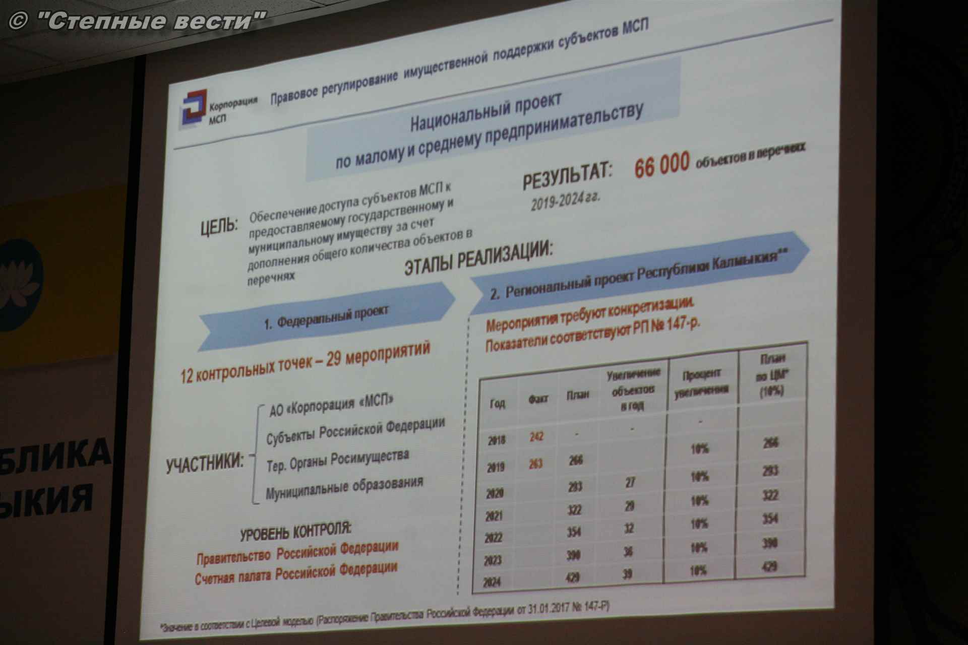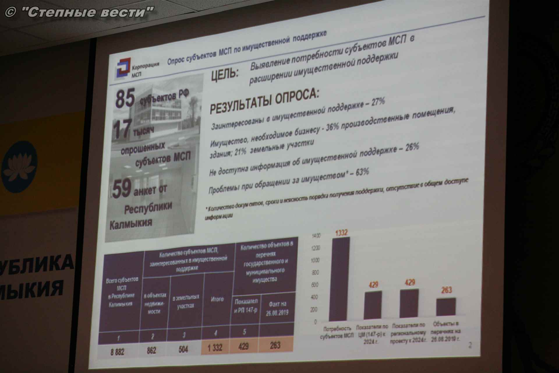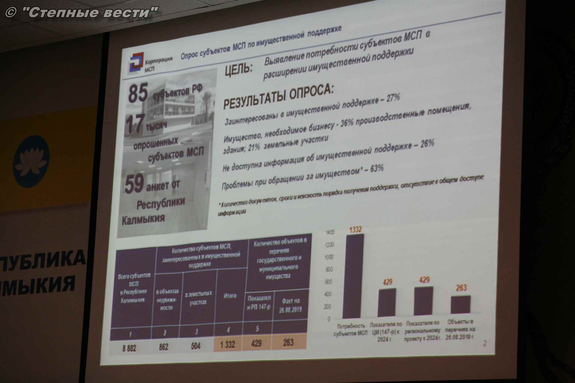 «В Калмыкии 1332 субъекта МСП заинтересованы в получении имущественной поддержки, между тем по факту 2019 года в реестре объектов недвижимости значится 263. Целевой показатель к концу 2024 года — 429 объектов, что не совсем удовлетворяет потребность бизнеса в регионе. Поэтому мы просим рассмотреть возможность наполнения перечней республиканского и муниципального имущества в количестве выше показателей целевой модели. Понимаем, что сложно их найти, выявить и учесть в реестре, но такую работу проводить нужно», — подчеркнул Городецкий.