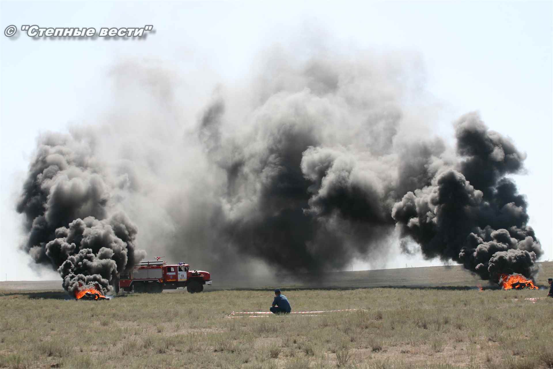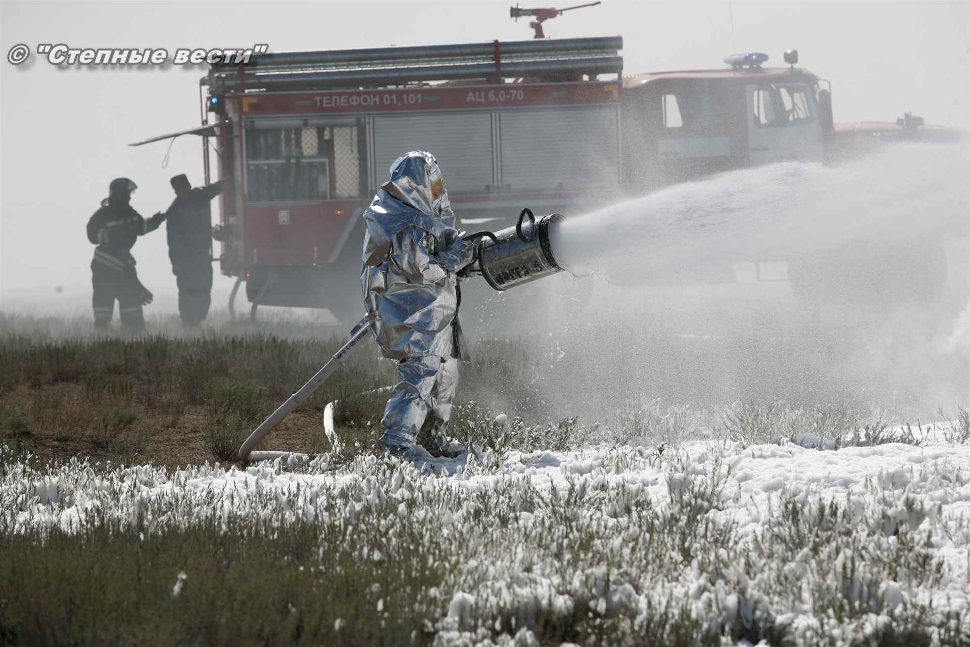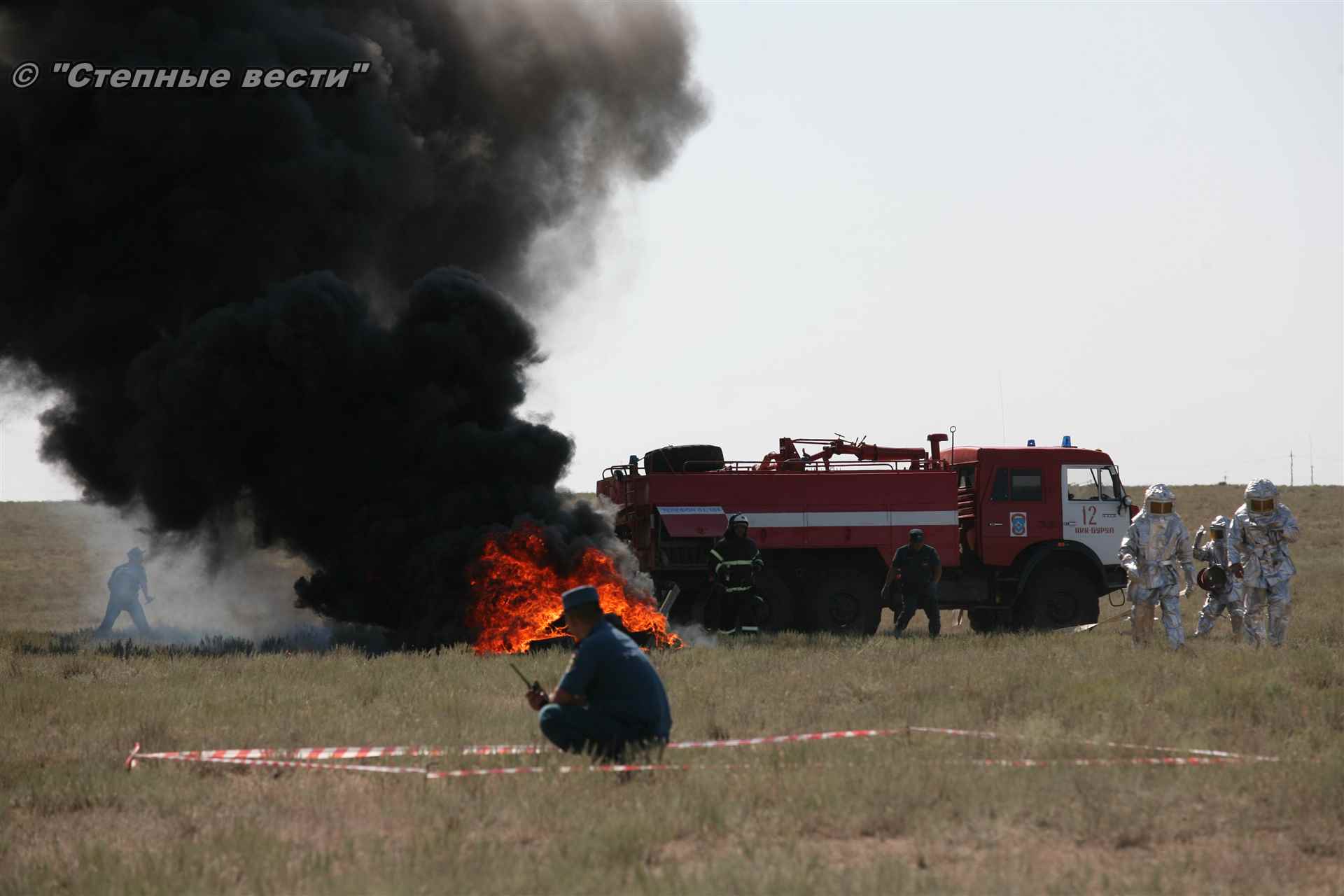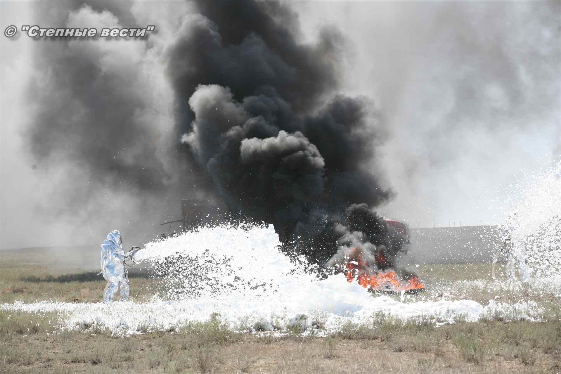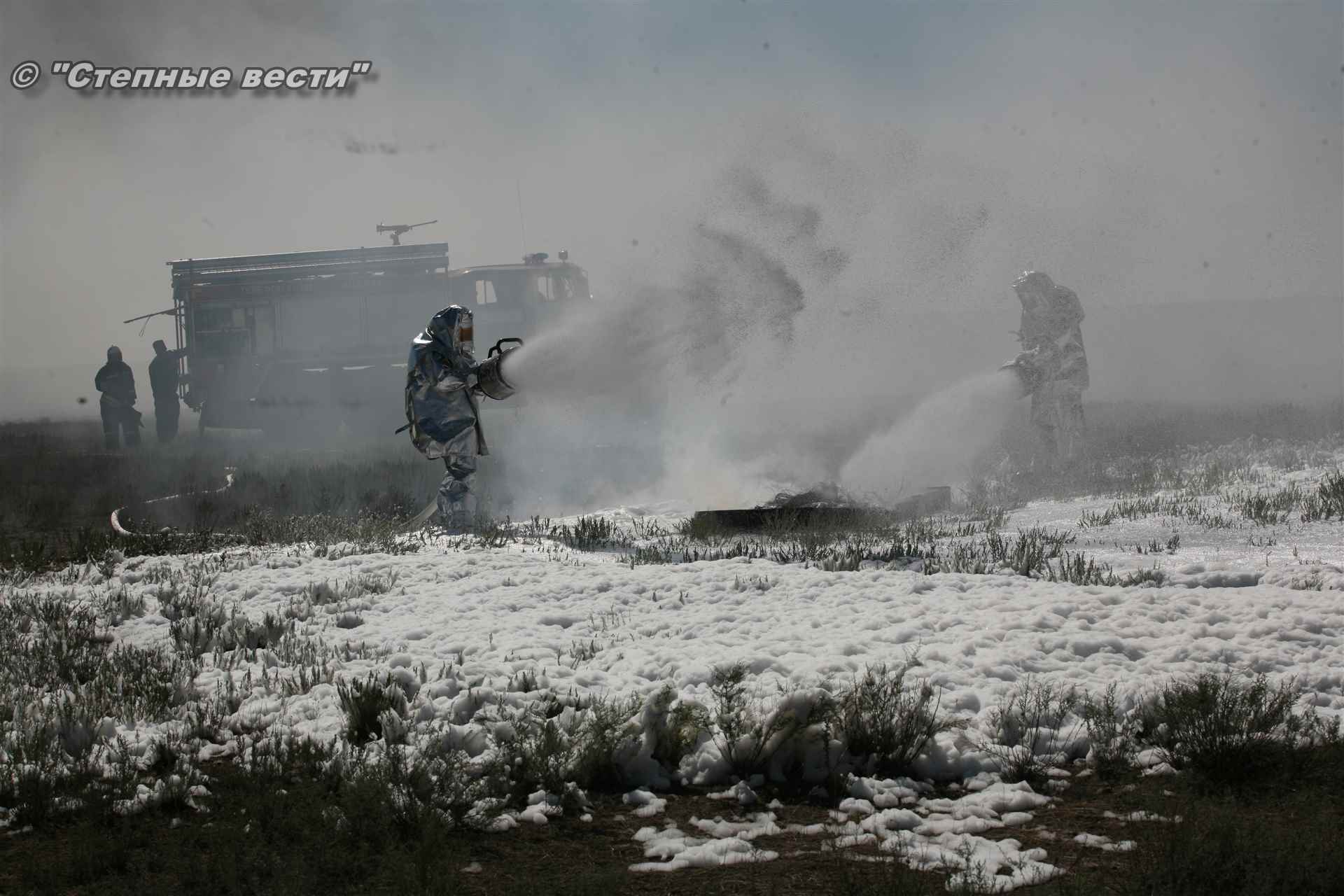 Ликвидация огня в степи — это один из этапов учений. Дело в том, что по замыслу в результате нарушения требований пожарной безопасности при проведении работ по откачке нефти из аварийного участка произошло возгорание нефти на площади около 500 квадратных метров. Создалась угроза распространения пожара на емкость для сбора нефтепродуктов, с которым сотрудники ГУ МЧС России по РК быстро справились.