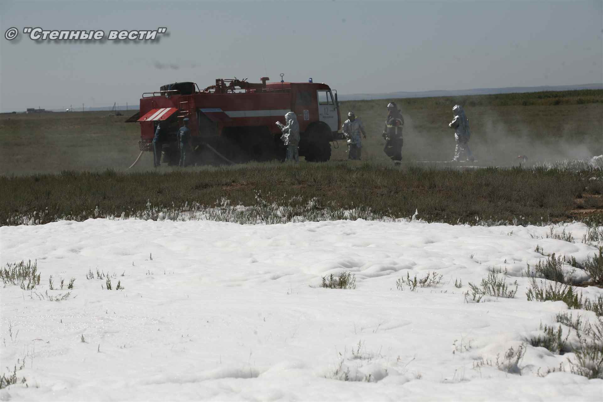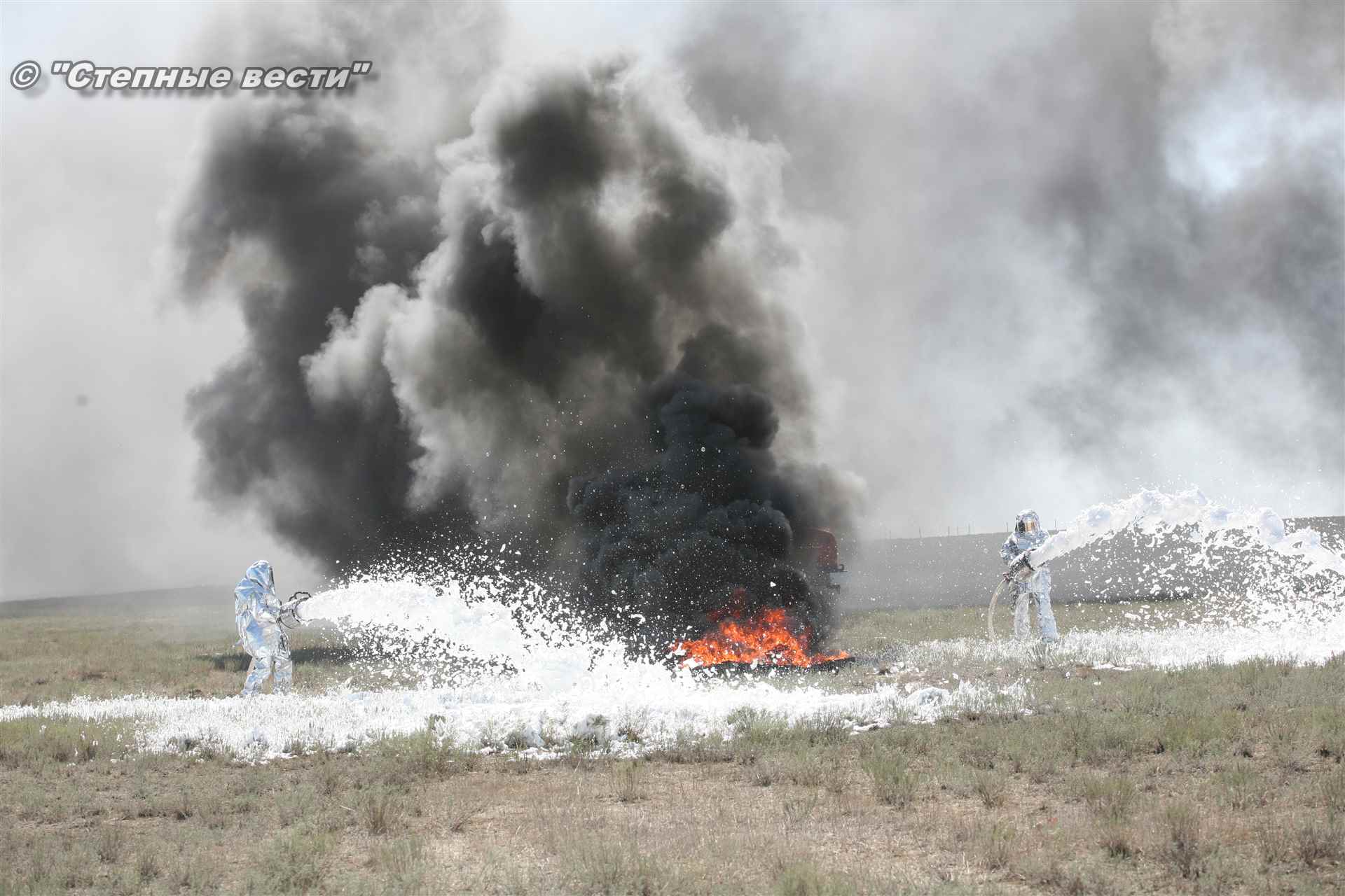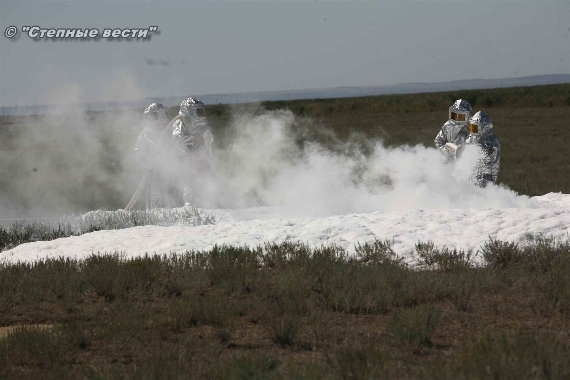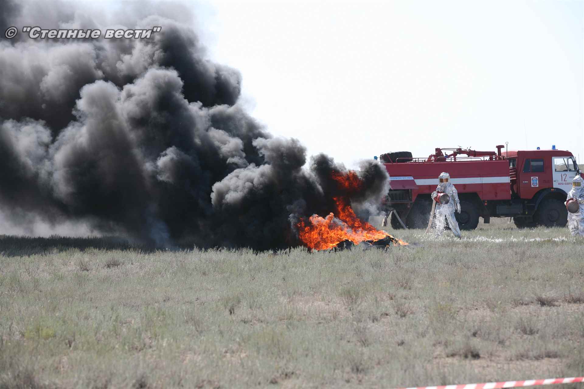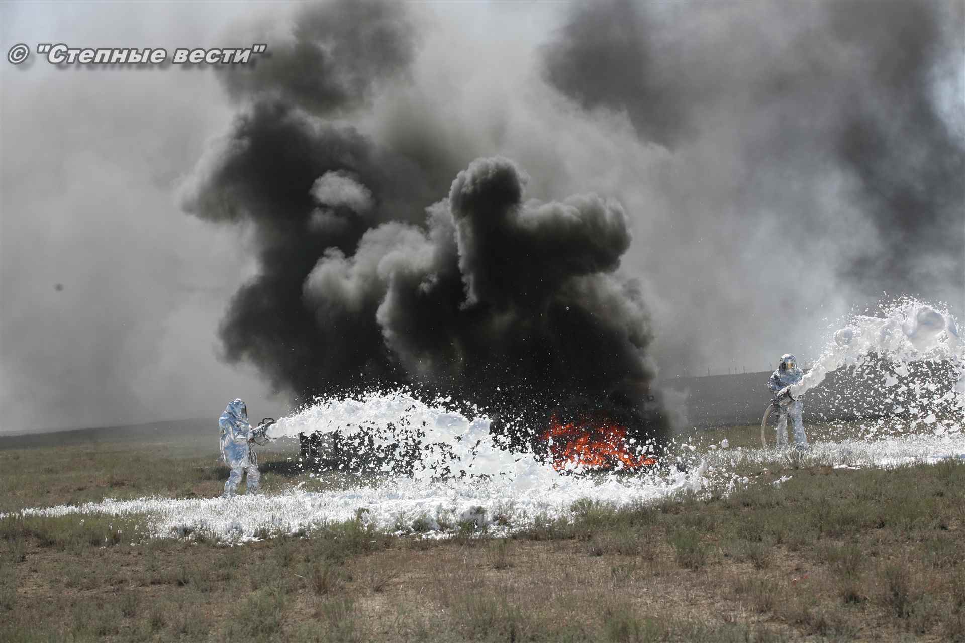 Ликвидация огня в степи — это один из этапов учений. Дело в том, что по замыслу в результате нарушения требований пожарной безопасности при проведении работ по откачке нефти из аварийного участка произошло возгорание нефти на площади около 500 квадратных метров. Создалась угроза распространения пожара на емкость для сбора нефтепродуктов, с которым сотрудники ГУ МЧС России по РК быстро справились.