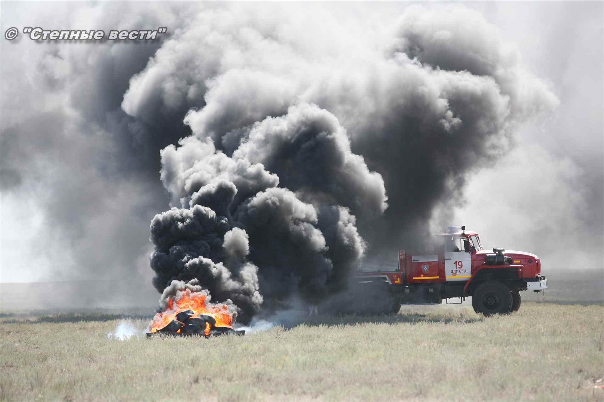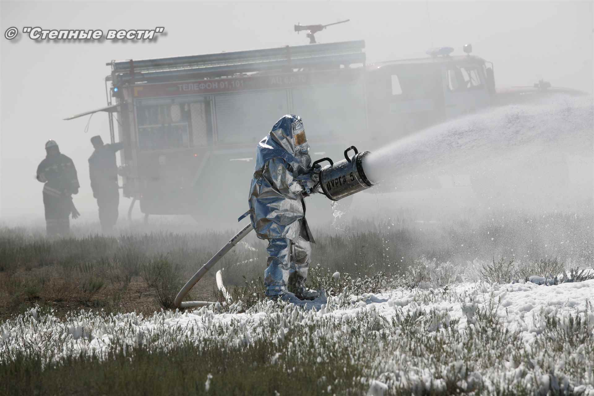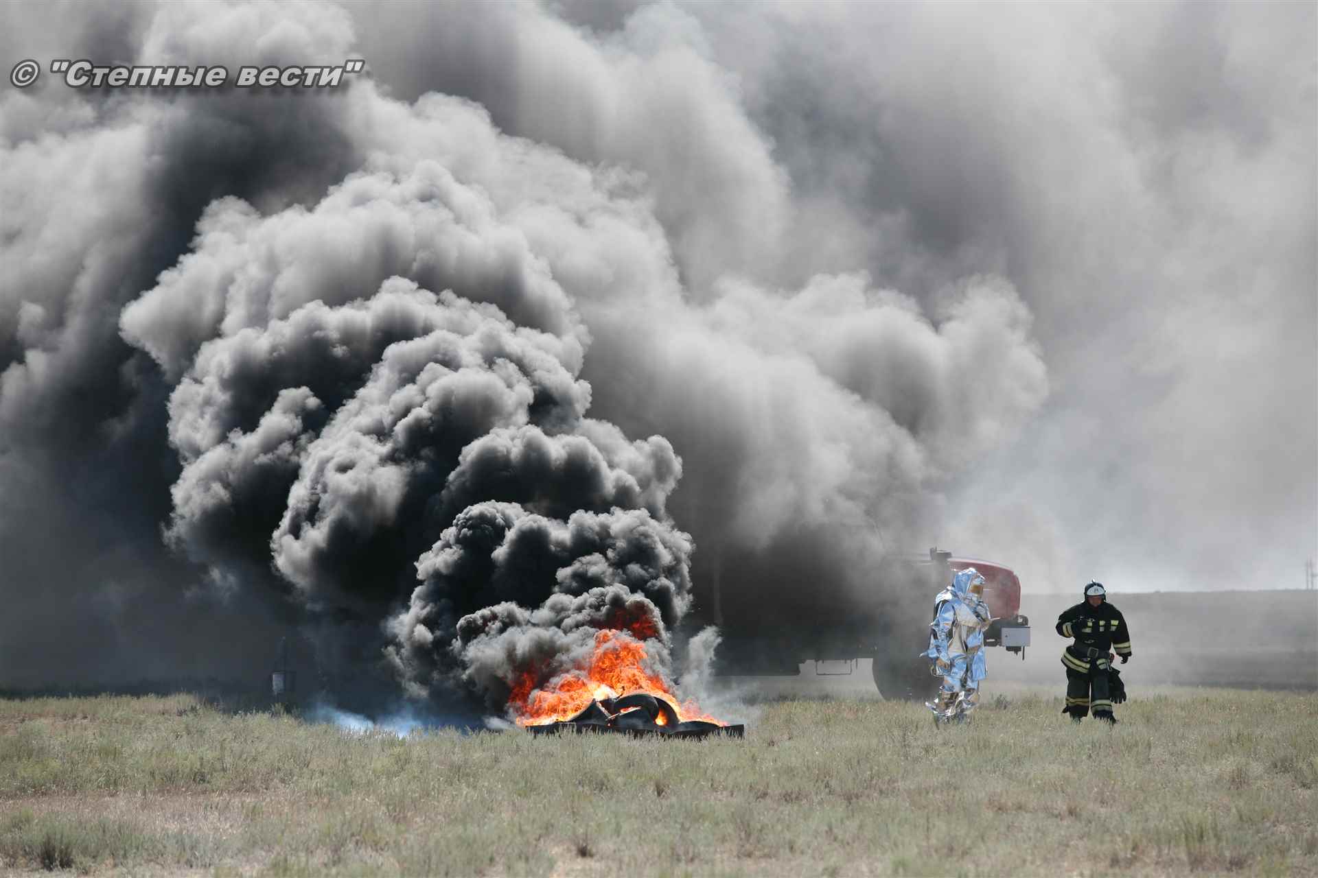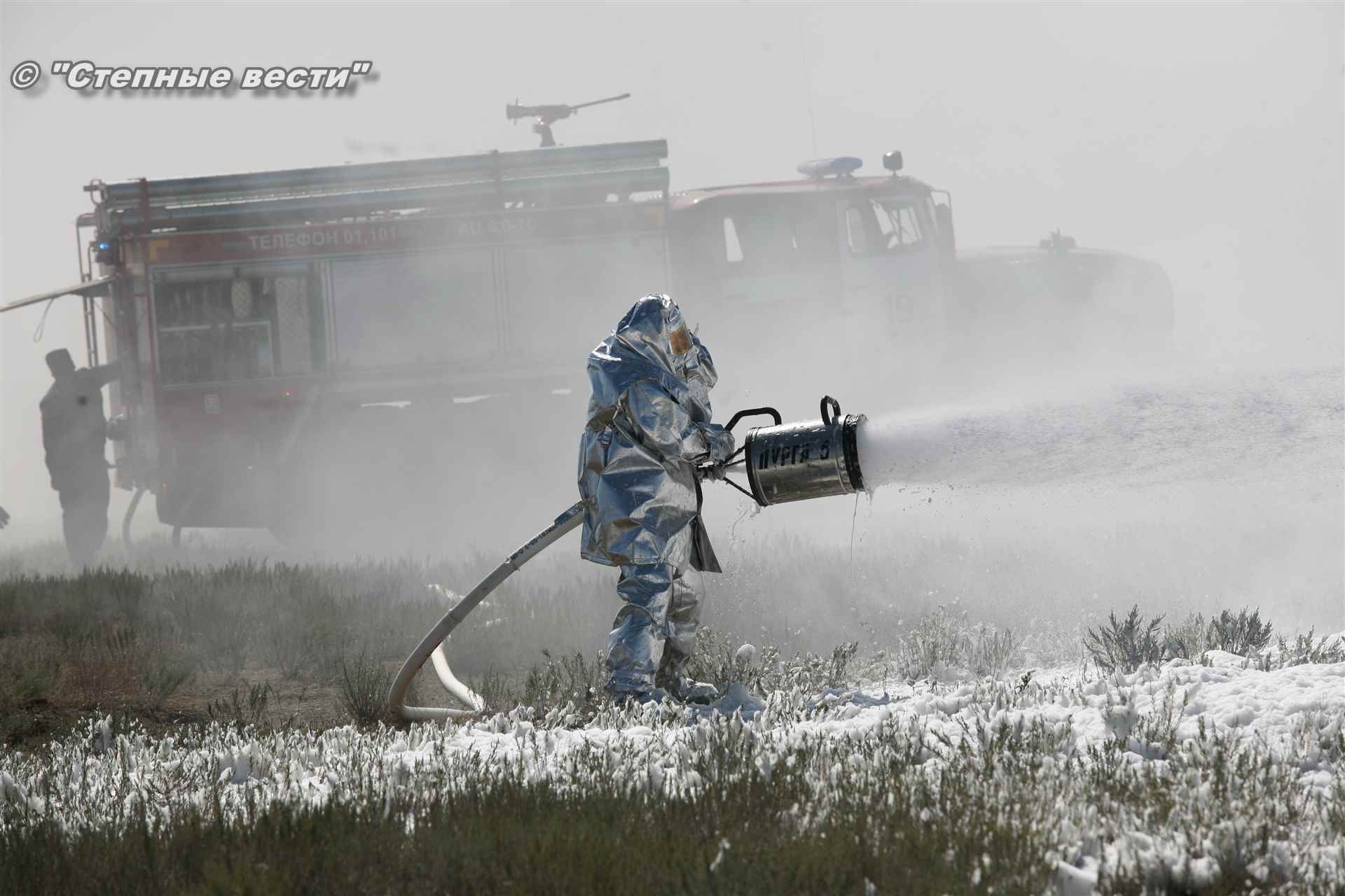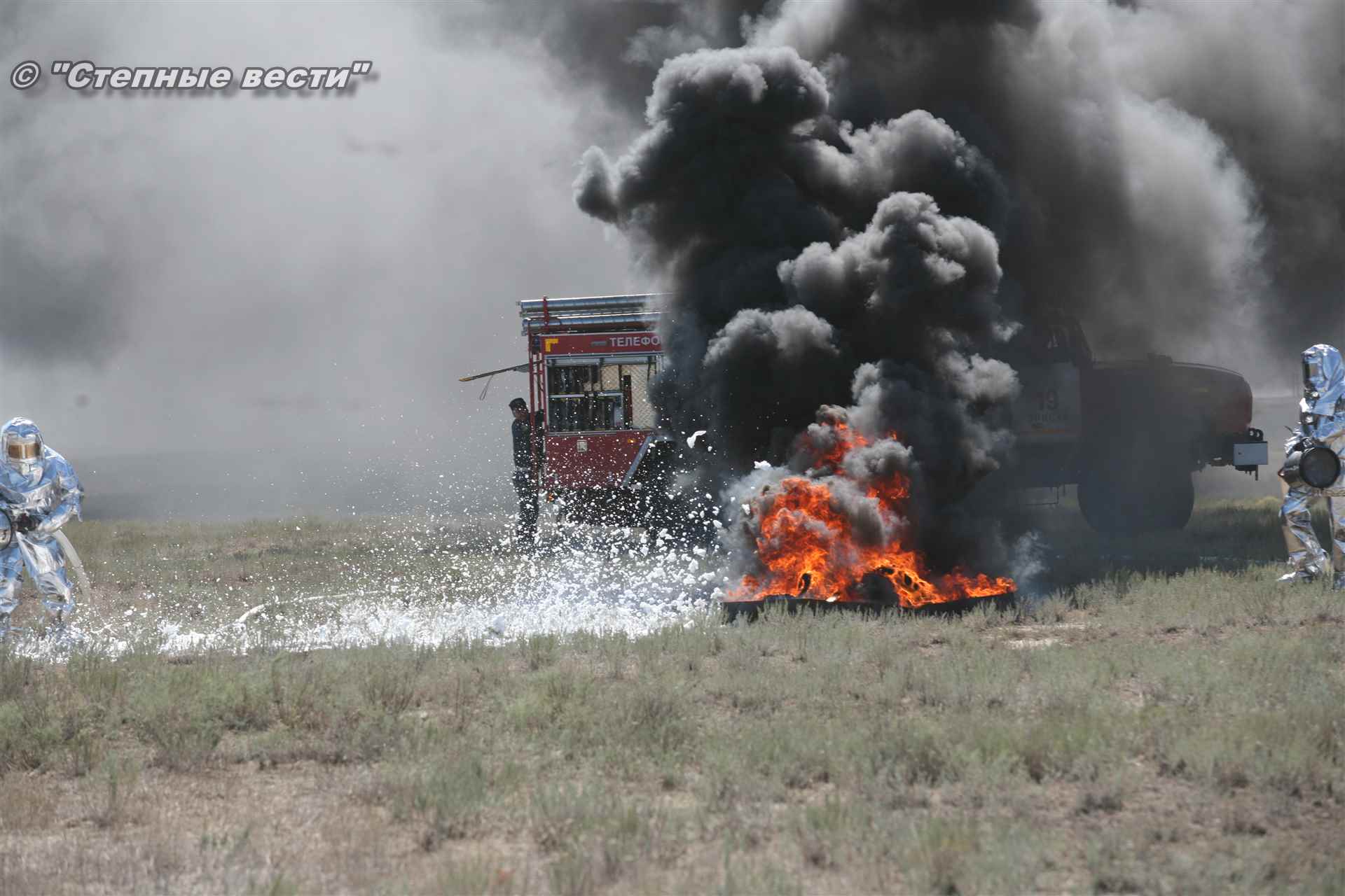 Ликвидация огня в степи — это один из этапов учений. Дело в том, что по замыслу в результате нарушения требований пожарной безопасности при проведении работ по откачке нефти из аварийного участка произошло возгорание нефти на площади около 500 квадратных метров. Создалась угроза распространения пожара на емкость для сбора нефтепродуктов, с которым сотрудники ГУ МЧС России по РК быстро справились.