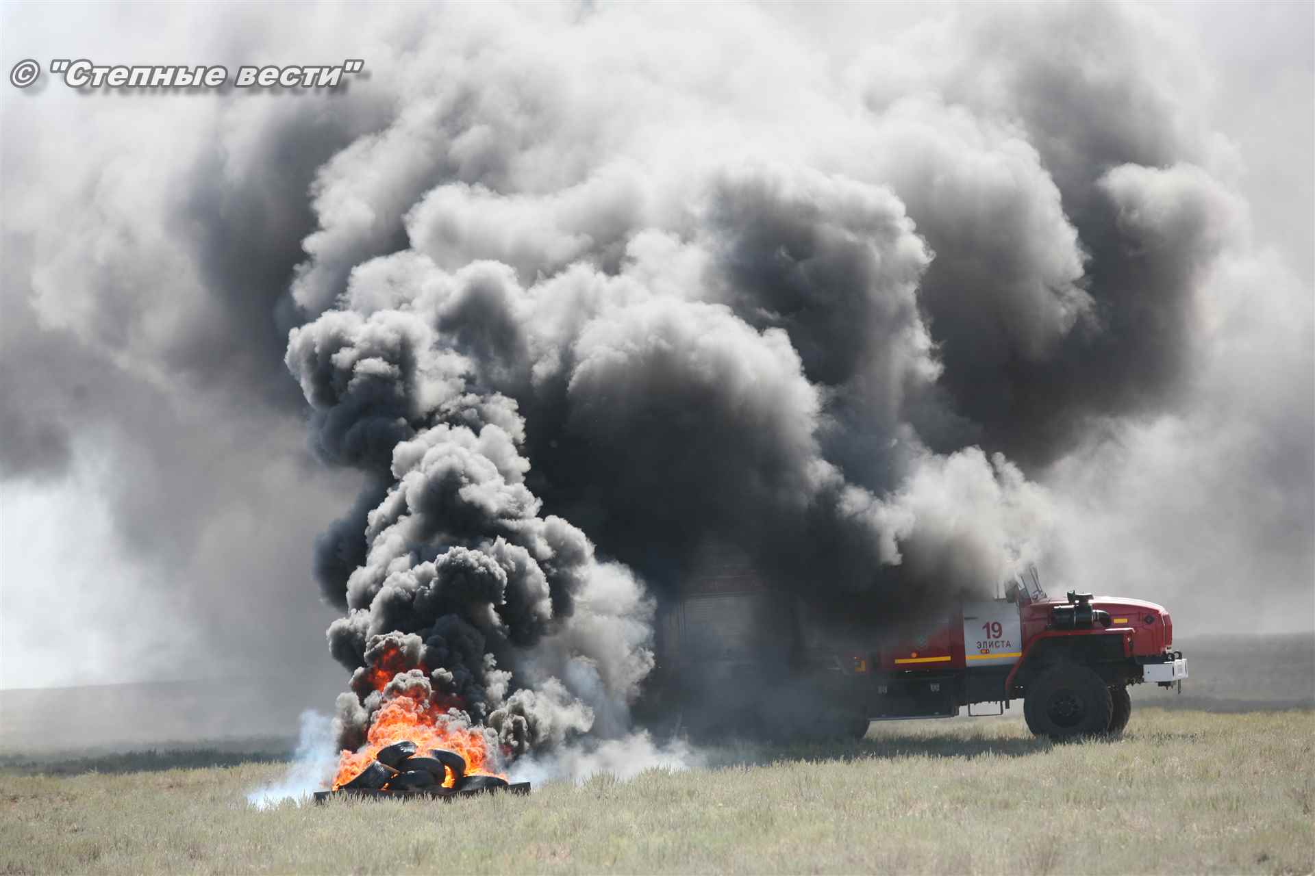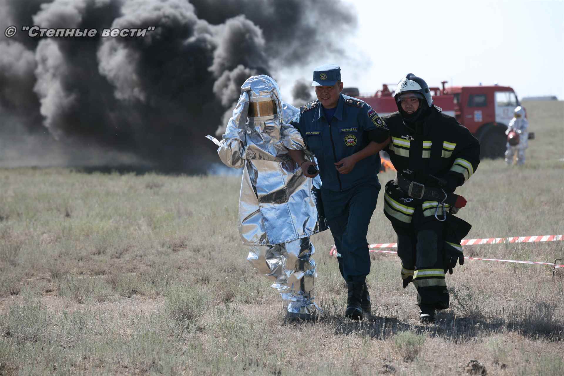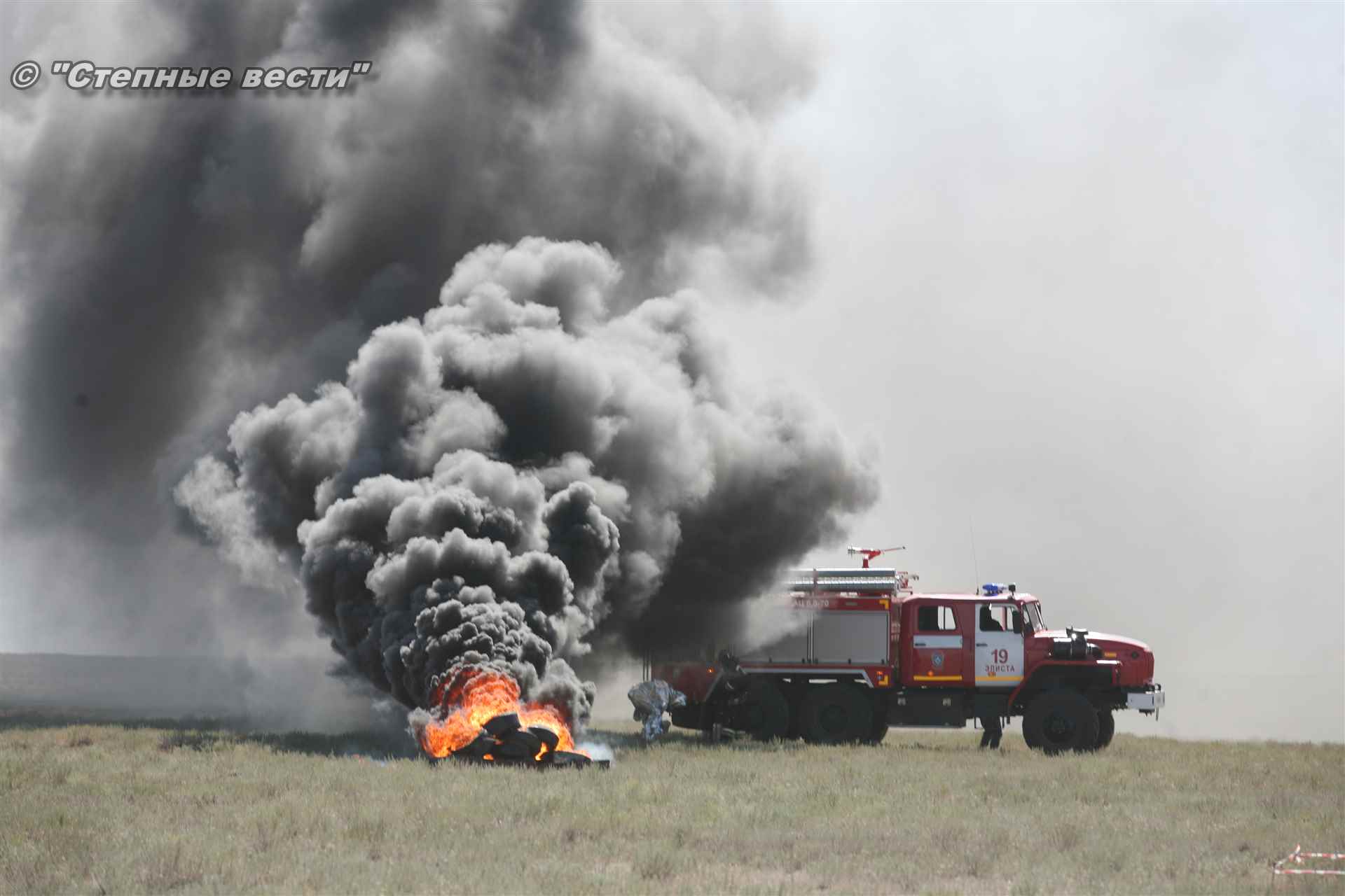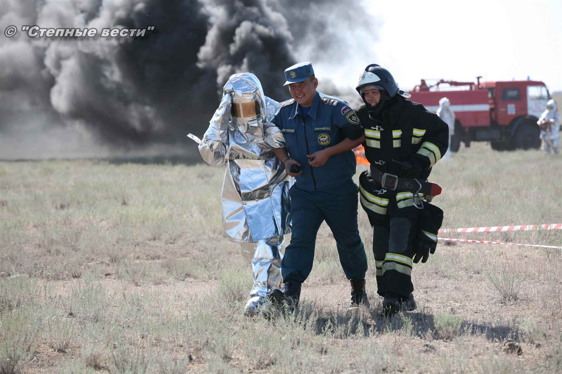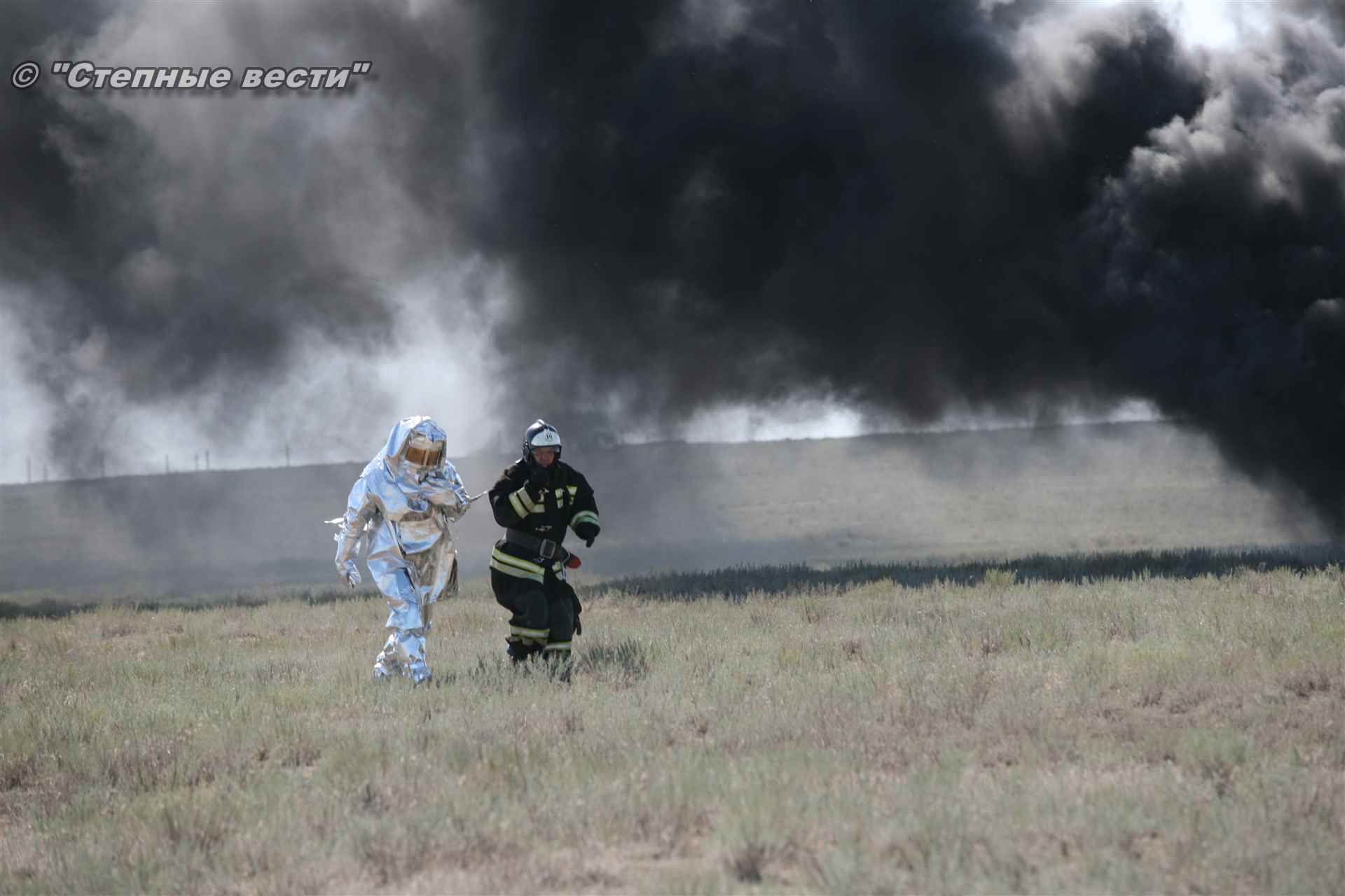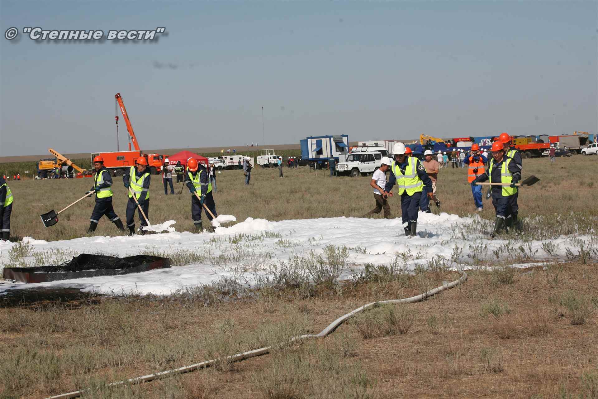 Ликвидация огня в степи — это один из этапов учений. Дело в том, что по замыслу в результате нарушения требований пожарной безопасности при проведении работ по откачке нефти из аварийного участка произошло возгорание нефти на площади около 500 квадратных метров. Создалась угроза распространения пожара на емкость для сбора нефтепродуктов, с которым сотрудники ГУ МЧС России по РК быстро справились.