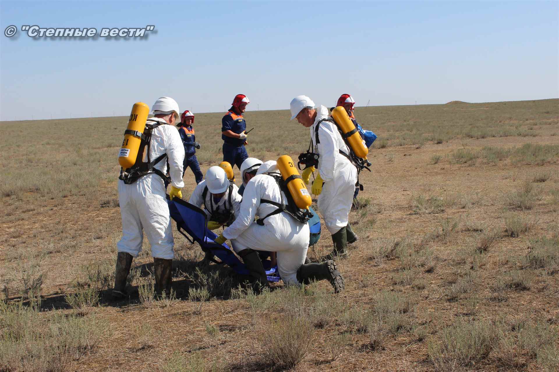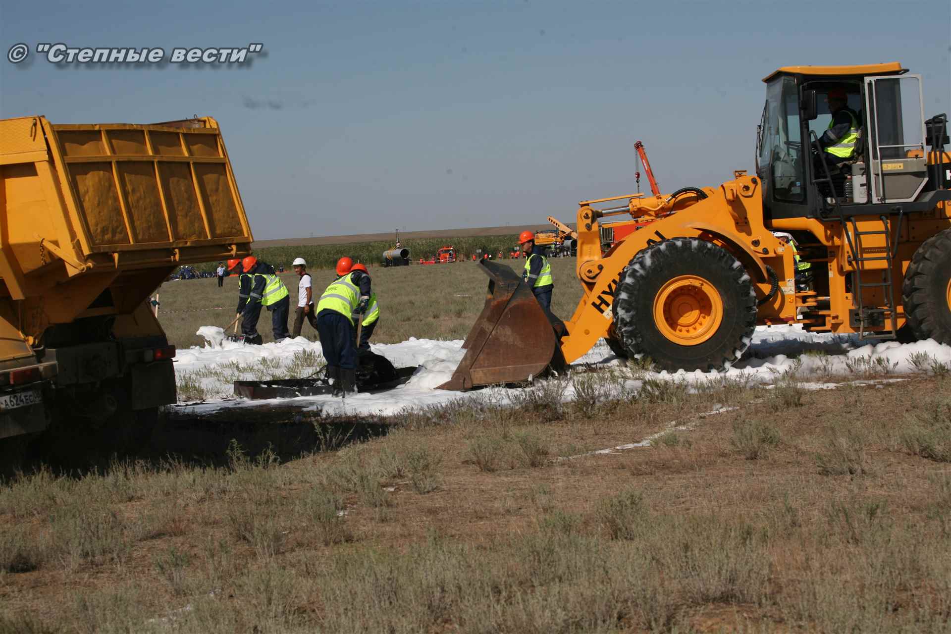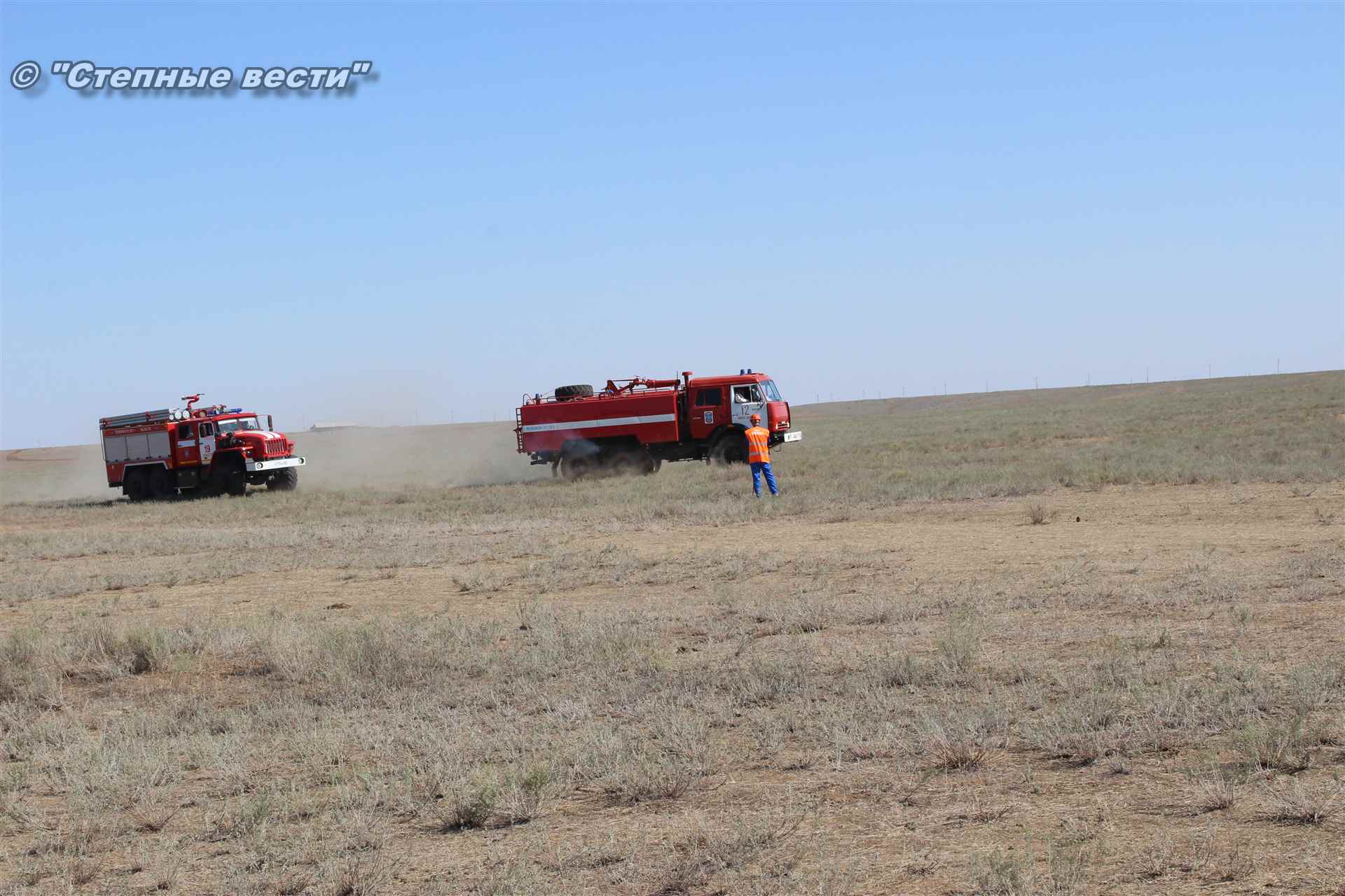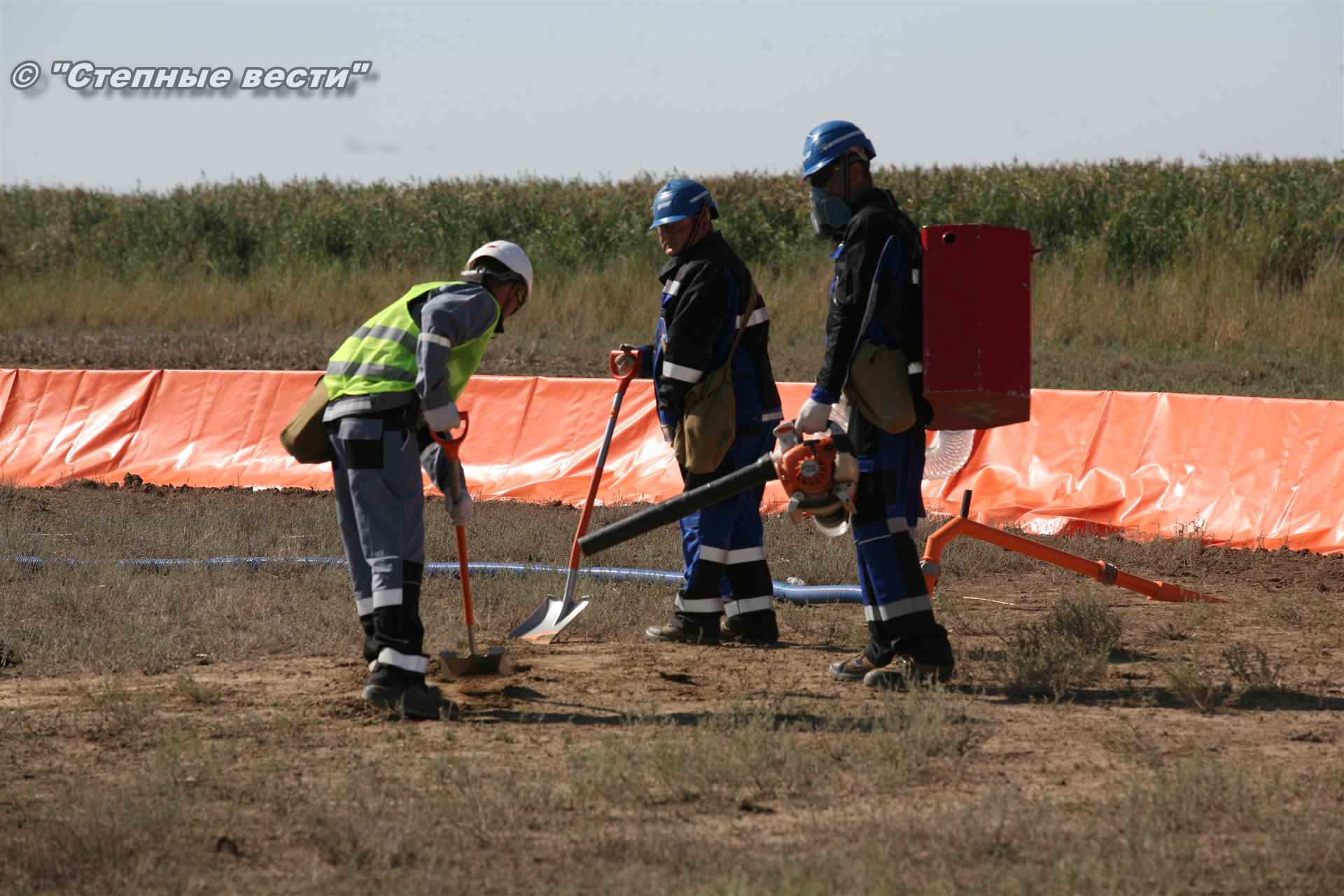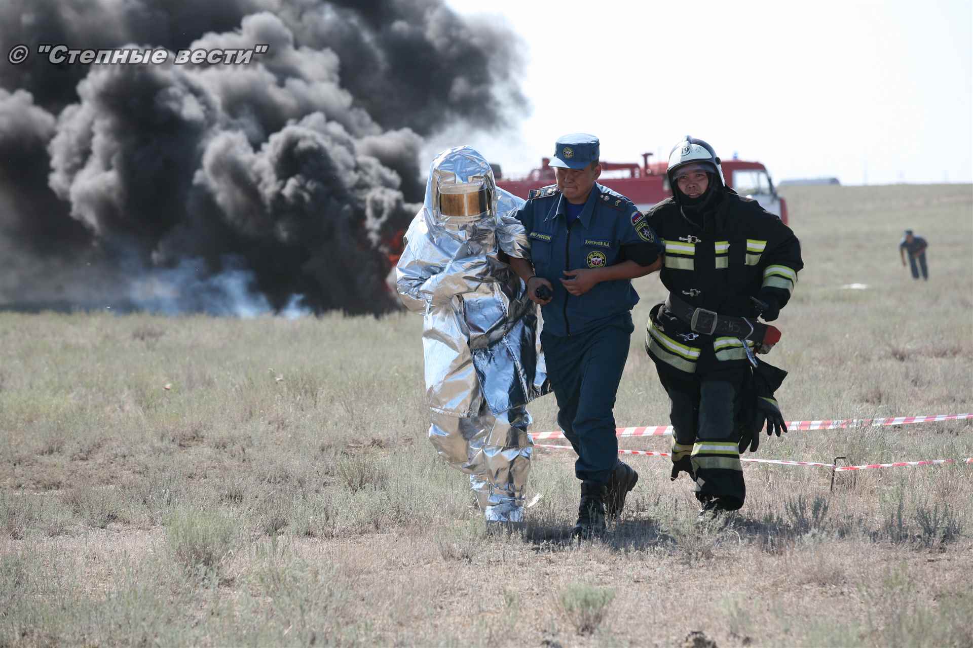 Ликвидация огня в степи — это один из этапов учений. Дело в том, что по замыслу в результате нарушения требований пожарной безопасности при проведении работ по откачке нефти из аварийного участка произошло возгорание нефти на площади около 500 квадратных метров. Создалась угроза распространения пожара на емкость для сбора нефтепродуктов, с которым сотрудники ГУ МЧС России по РК быстро справились.