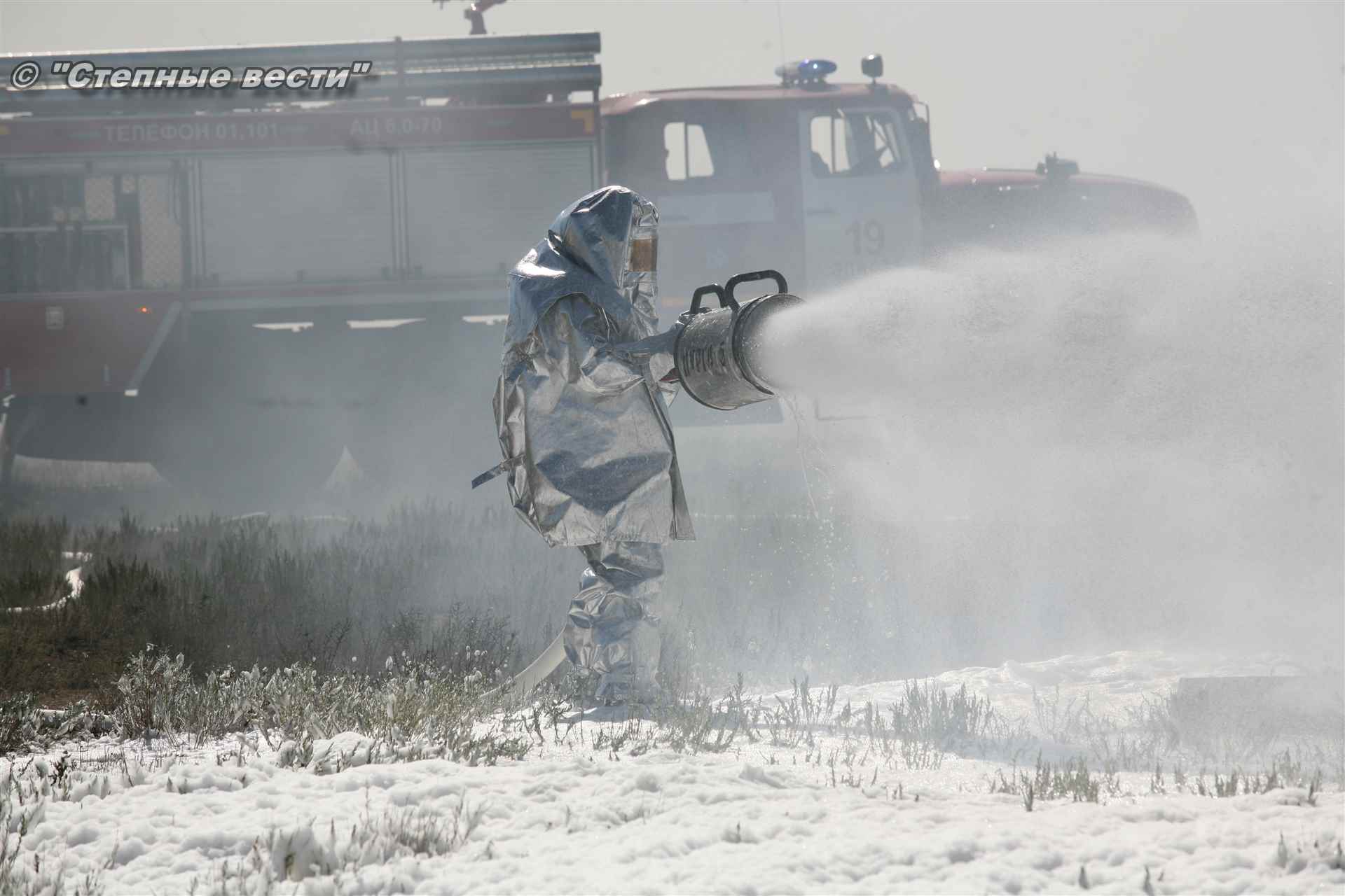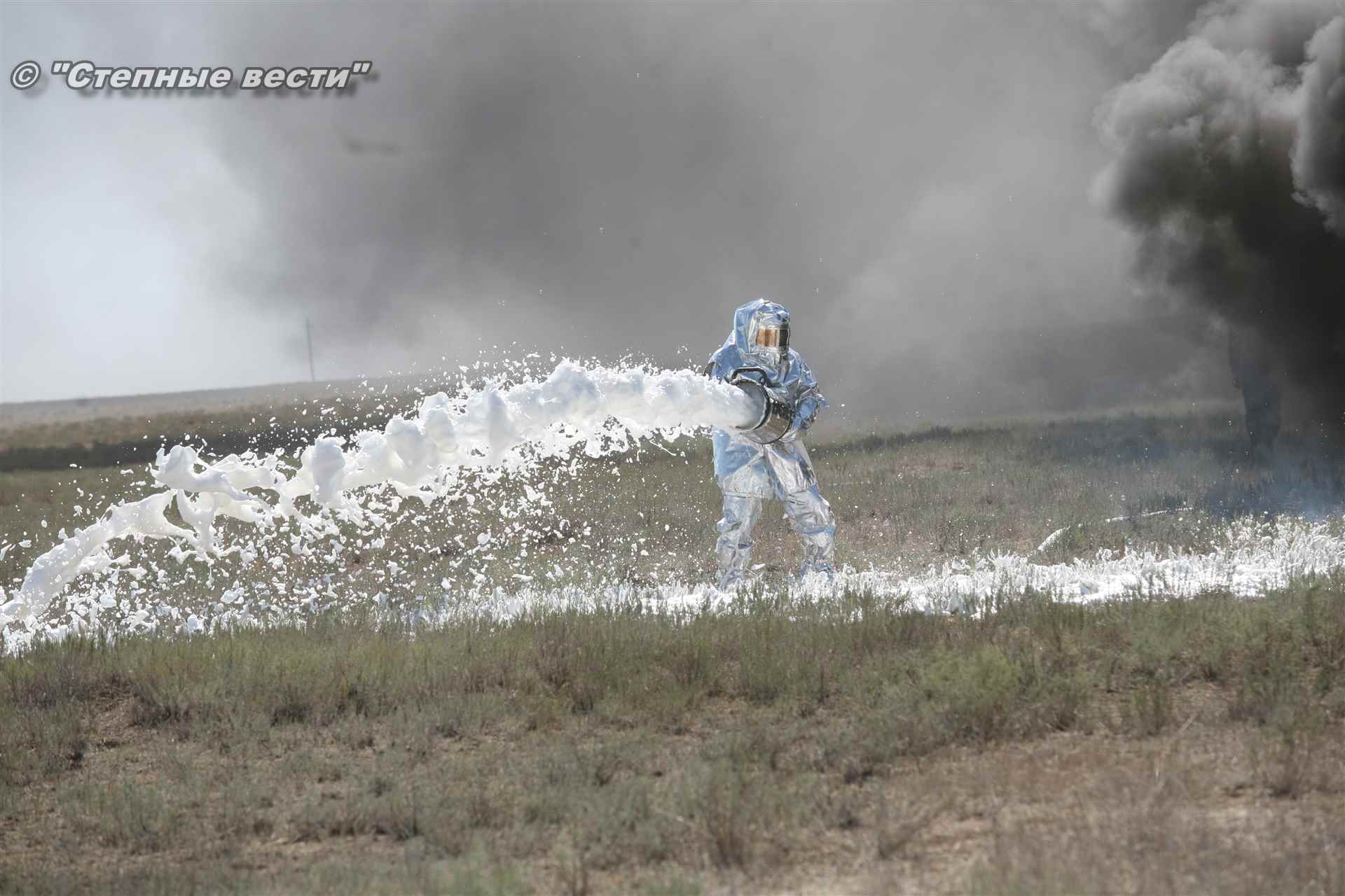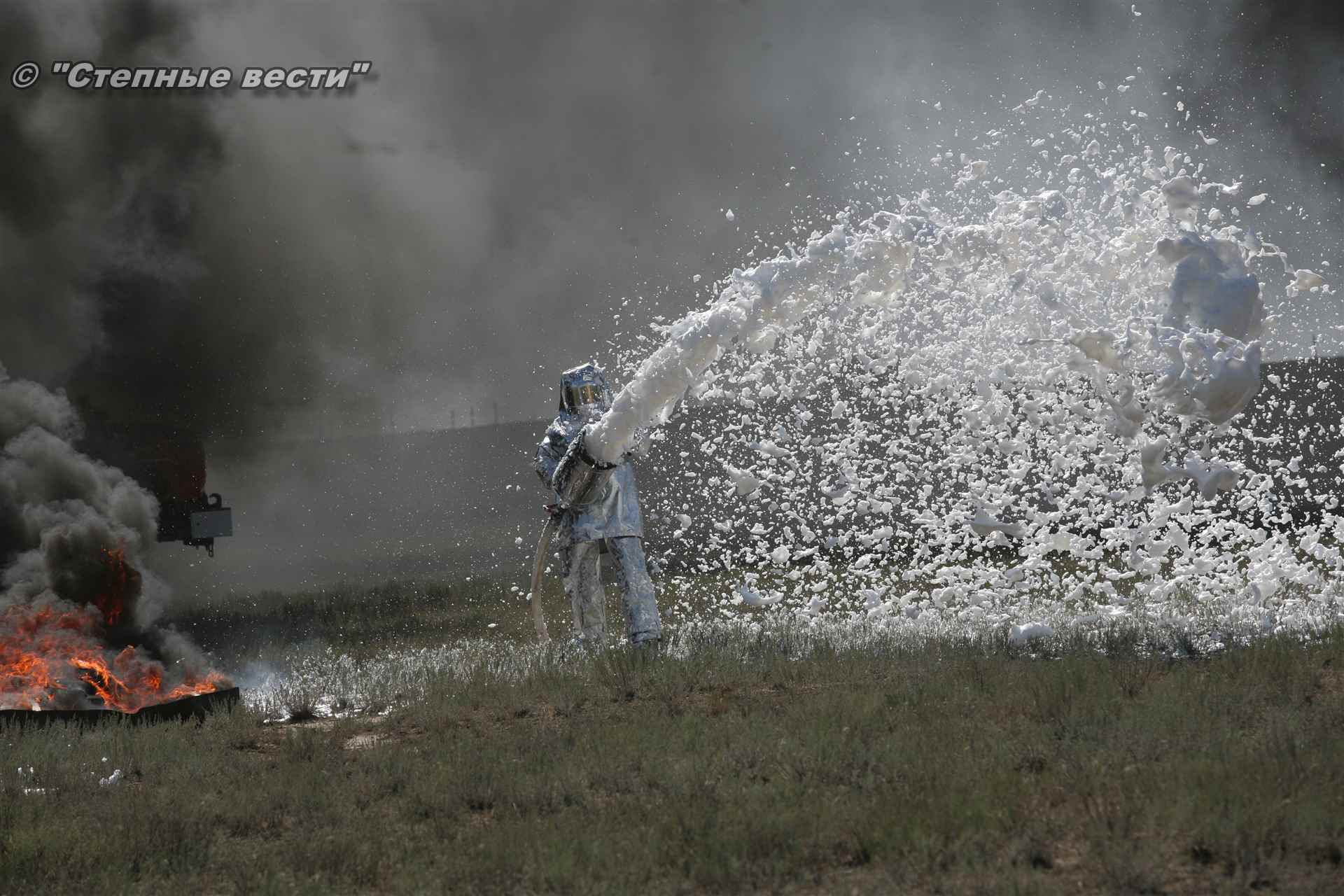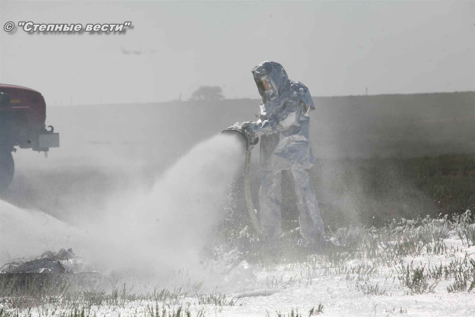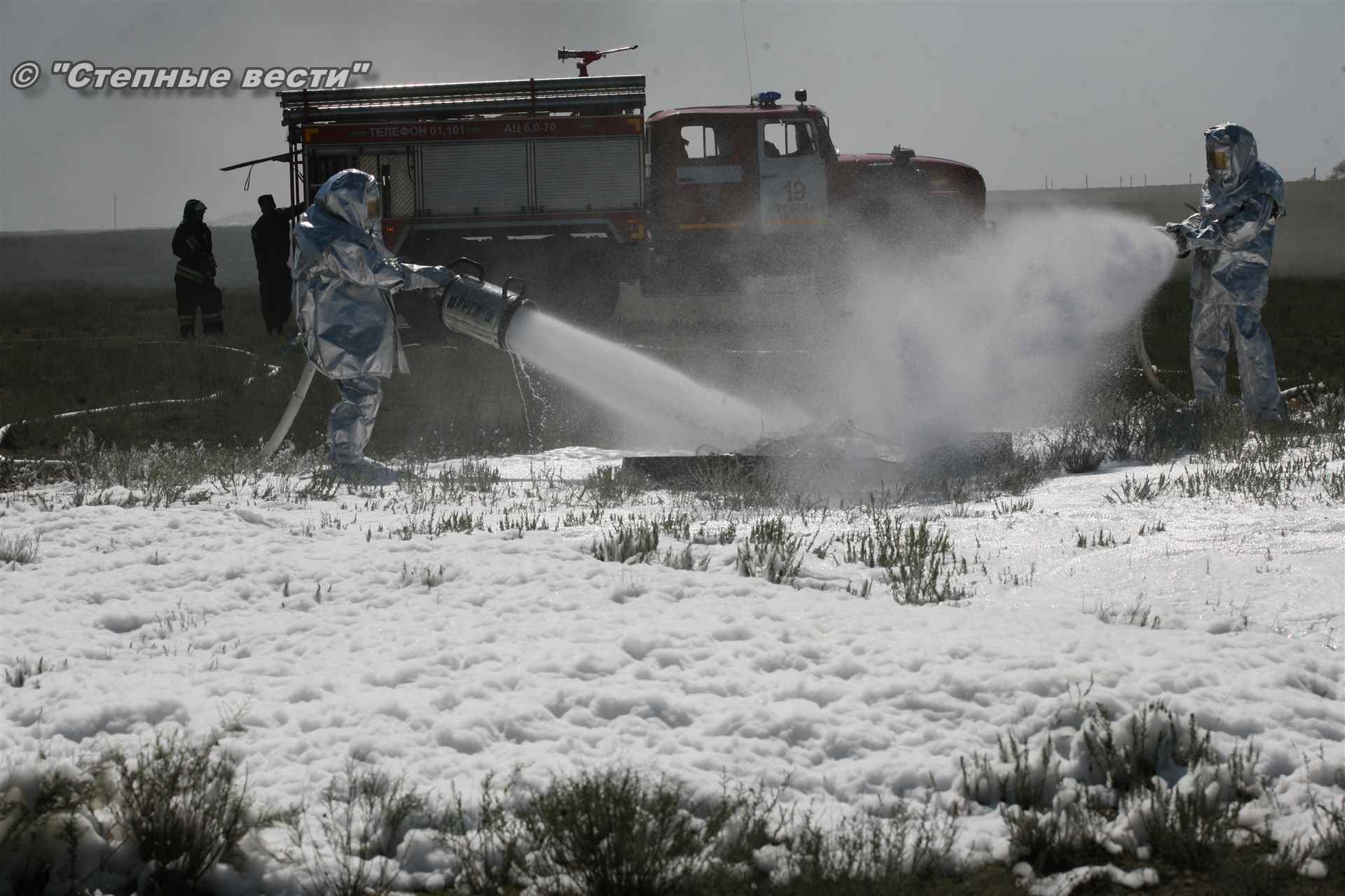 Учения развернулись в степи, близ реки Маныч. Здесь можно было насладиться ароматом полыни, посмотреть технику и оборудование, которые применяют во время подобных мероприятий, в том числе те же боновые заграждения, протянутые к водоему, и понаблюдать, как спасатели ловко тушат огонь с помощью пенной атаки. Зрелище получилось эффектное, в большей степени из-за контрастности: устрашающе-черный дым на фоне синего неба и белоснежная воздушно-механическая пена, полностью подавившая возгорание. Впечатлили и сами спасатели — в серебристой теплоотражательной одежде, предназначенной для защиты личного состава подразделений пожарной охраны от интенсивного теплового излучения, высоких температур окружающей среды и кратковременного контакта с открытым пламенем.