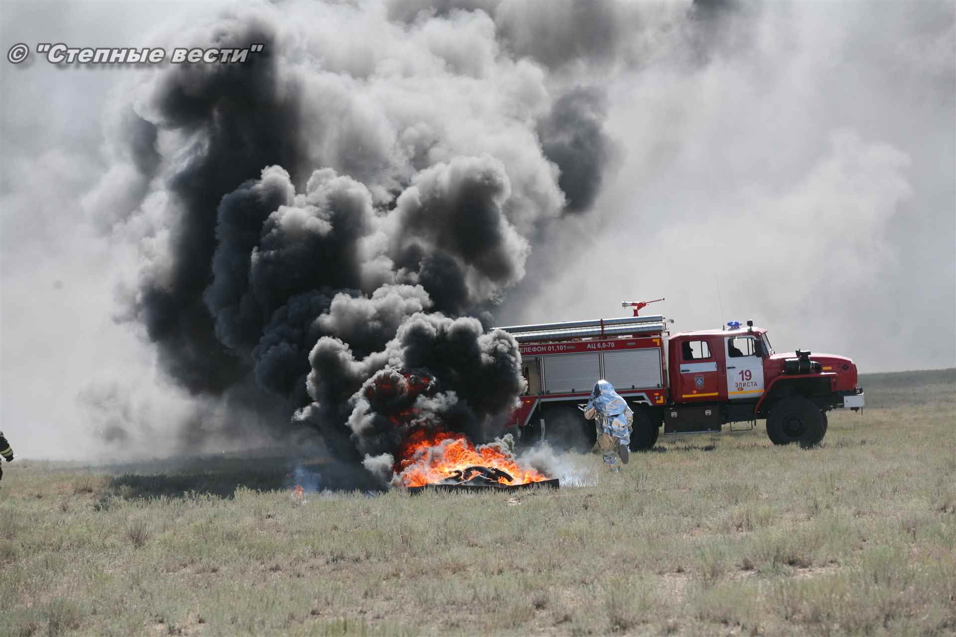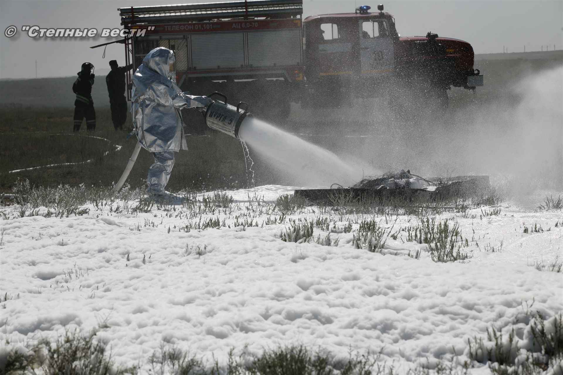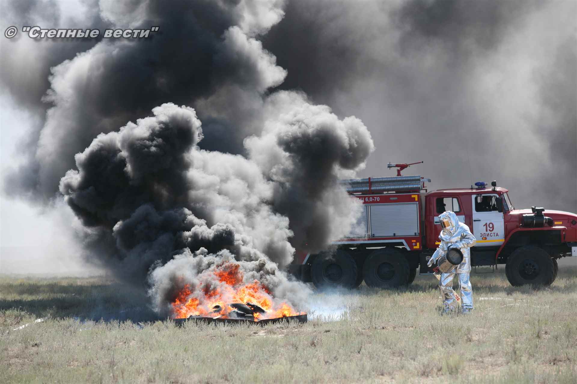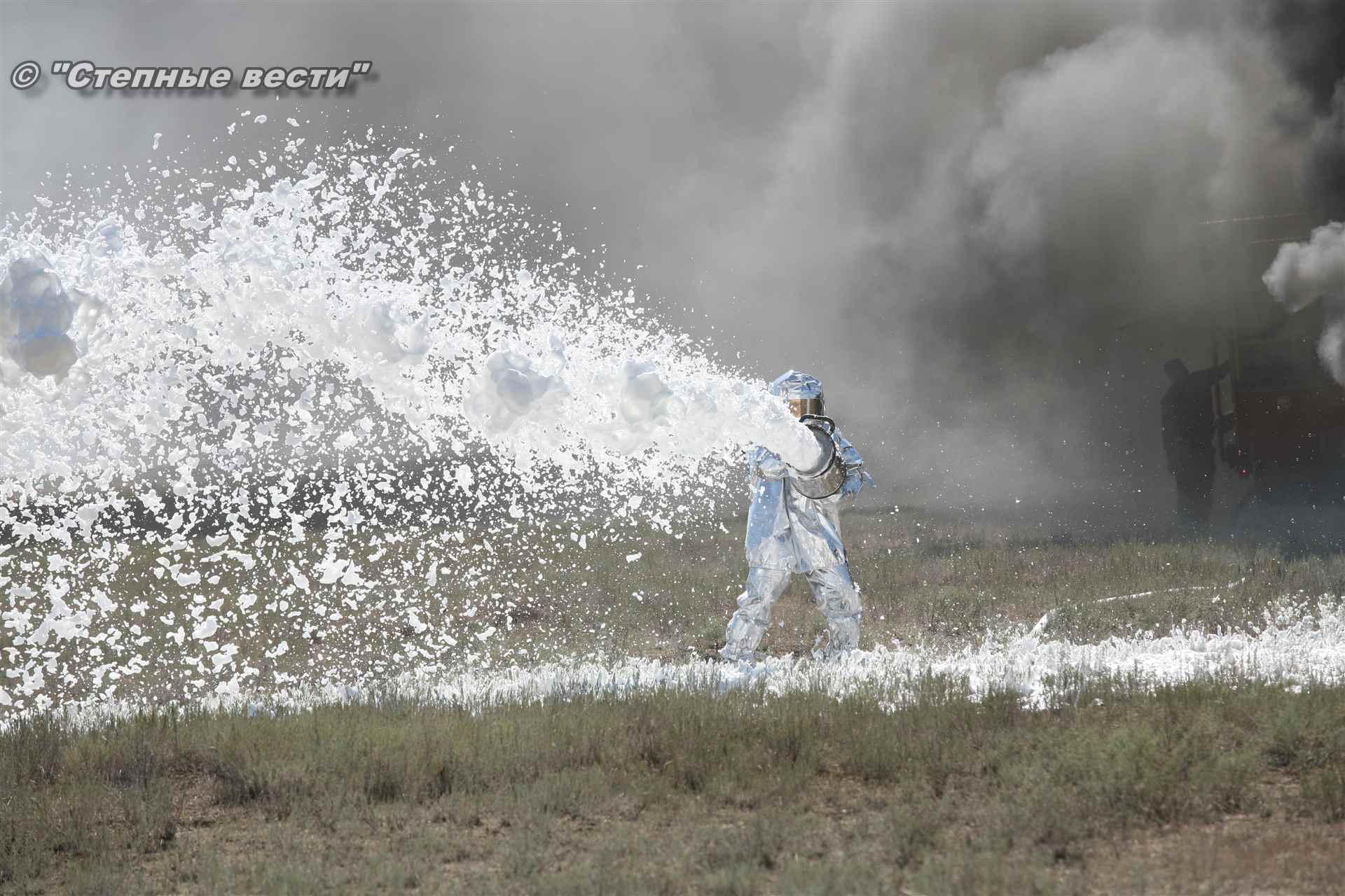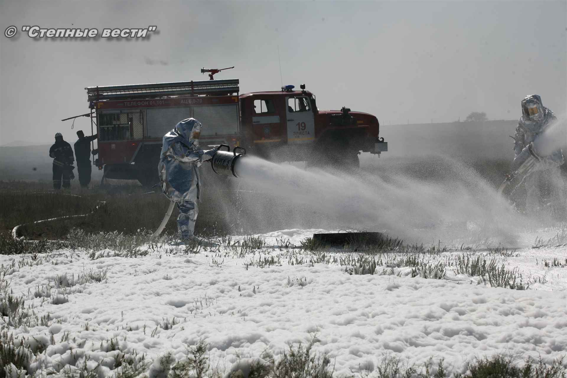 Учения развернулись в степи, близ реки Маныч. Здесь можно было насладиться ароматом полыни, посмотреть технику и оборудование, которые применяют во время подобных мероприятий, в том числе те же боновые заграждения, протянутые к водоему, и понаблюдать, как спасатели ловко тушат огонь с помощью пенной атаки. Зрелище получилось эффектное, в большей степени из-за контрастности: устрашающе-черный дым на фоне синего неба и белоснежная воздушно-механическая пена, полностью подавившая возгорание. Впечатлили и сами спасатели — в серебристой теплоотражательной одежде, предназначенной для защиты личного состава подразделений пожарной охраны от интенсивного теплового излучения, высоких температур окружающей среды и кратковременного контакта с открытым пламенем.